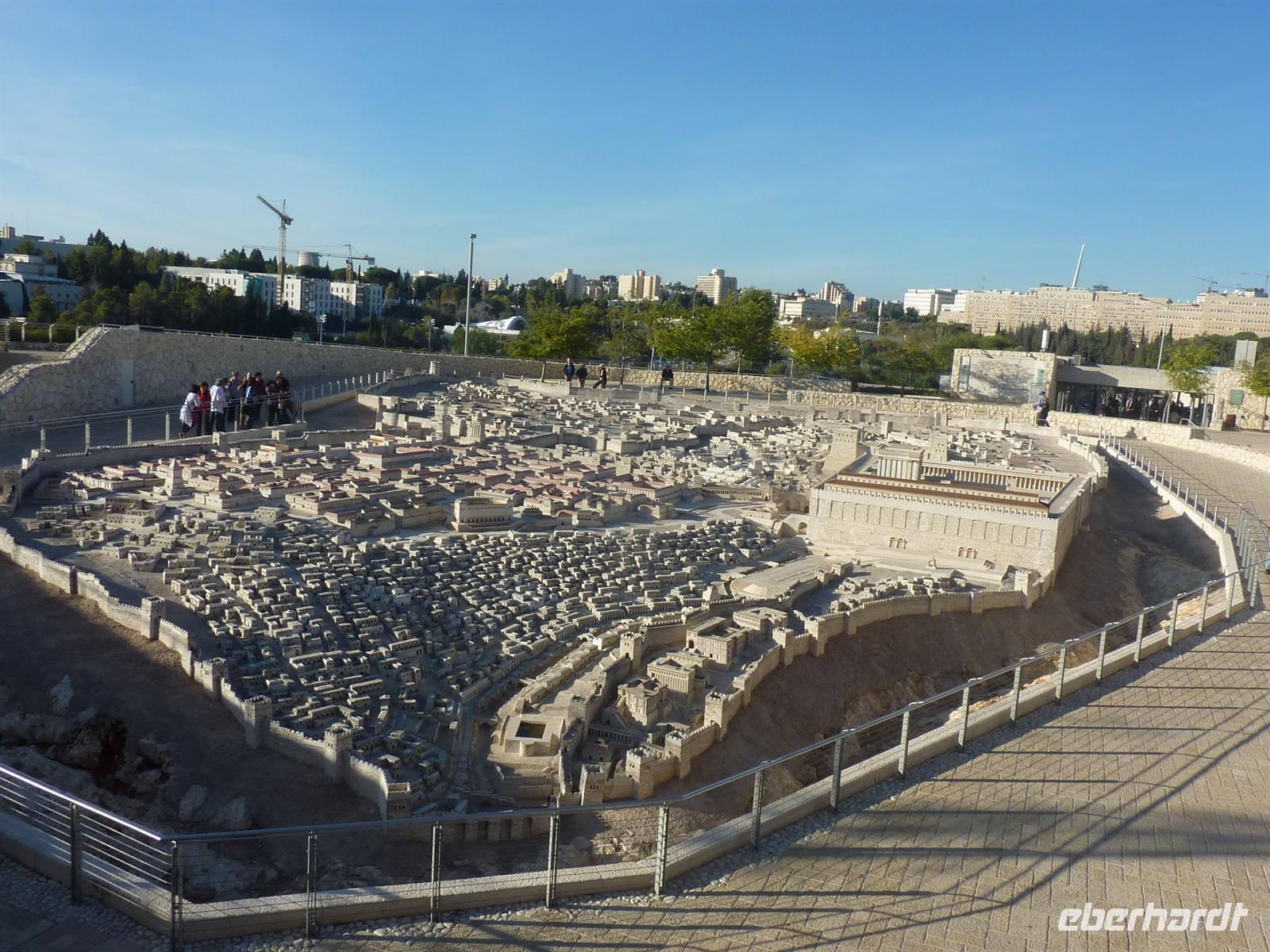 Nur noch wenige Kilometer entfernt, auf 800 Meter Höhe, erreichten wir endlich Jerusalem. Wir fuhren zuerst zum Ölberg, dort gab uns David die erste Einführung und einen Überblick über Jerusalem. Hungrig fuhren wir zu einem Selbstbedienungsrestaurant und aßen gemeinsam zu Mittag. Unsere erste Besichtigung in Jerusalem war das Israel-Museum.
