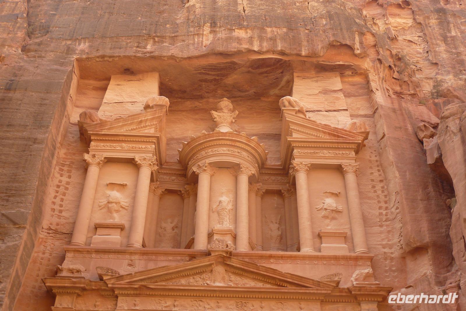 Heute hatten wir die Möglichkeit dem Tag am Roten Meer zu verbringen oder einen Ausflug nach zur Felsenstadt Petra in Jordanien zu machen. Die Felsenstadt Petra zählt zu einem der sieben Weltwunder. Darüber mussten wir gar nicht lange nachdenken und wir entschlossen uns nach Jordanien zu fahren. Die Grenze von zwischen Eilat und Jordanien ist nur 10 Minuten vom Hotel entfernt. Unser Tagesvisum wurde erstellt, wir wurden gründlich kontrolliert und dann wartete unser Reiseleiter Achmet schon auf uns. Mit dem jordanischen Reisebus fuhren wir 2 Stunden bis nach Petra. Um die Felsenstadt Petra zu betreten, muss man die enge, anderthalb Kilometer lange "Schlucht des Sik" im Gebirge von Edom überwinden. In über 1.000 Metern Höhe ragen die schroffen Felswände in den Himmel. Bis zu 20.000 Menschen lebten in der Metropole. Die Nabatäer errichteten ein ausgeklügeltes Bewässerungssystem mit riesigen Tunnelbauten und Wasserkammern. Man muss dieses Weltwunder einfach gesehen haben!