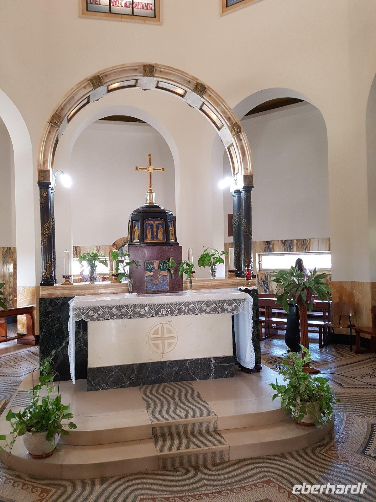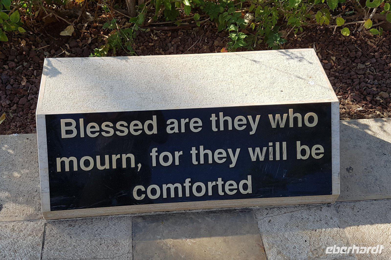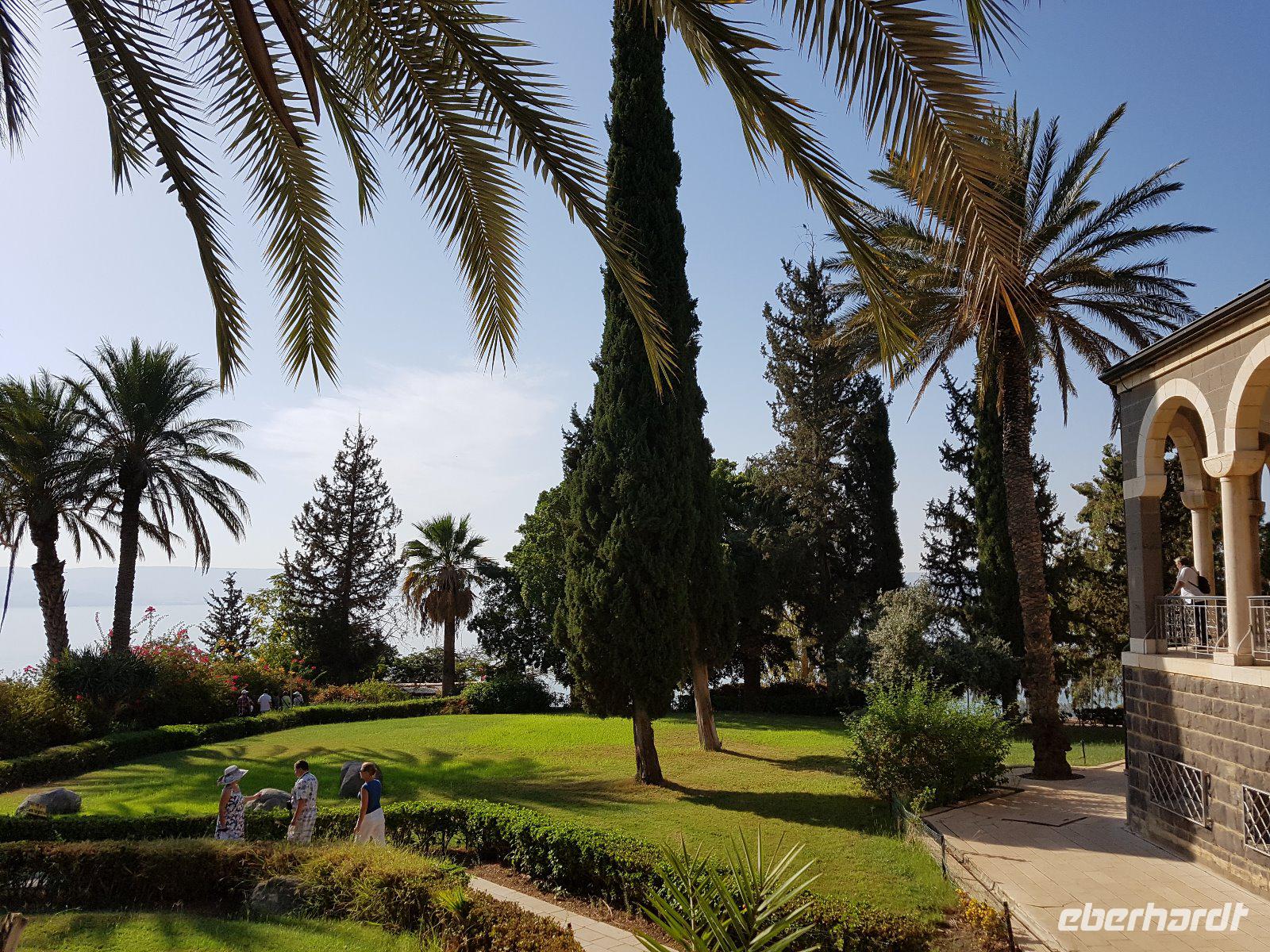 Der Berg der Seligpreisungen ist die erste Station unseres heutigen Ausfluges. Wir lesen hier erstmals gemeinsam die entsprechende Bibelpassage, die Bergpredigt. So erreichen wir einen besseren Bezug zum besuchten Ort. Wir werden dies für alle folgenden biblischen „Originalschauplätze" unserer Reise beibehalten. So dann auch wenige Minuten später wo wir in Tabgha die Brotvermehrungskirche besuchen.