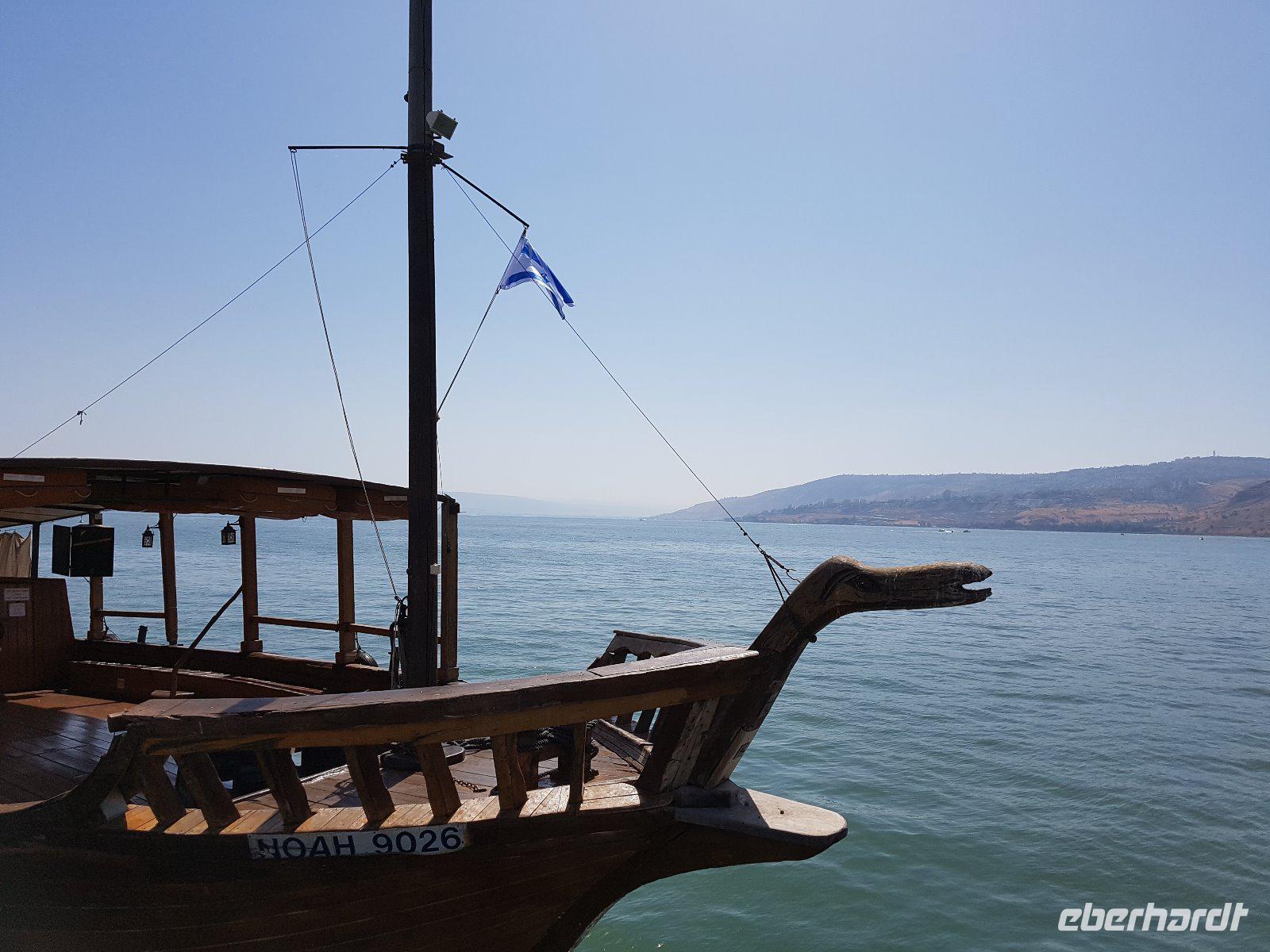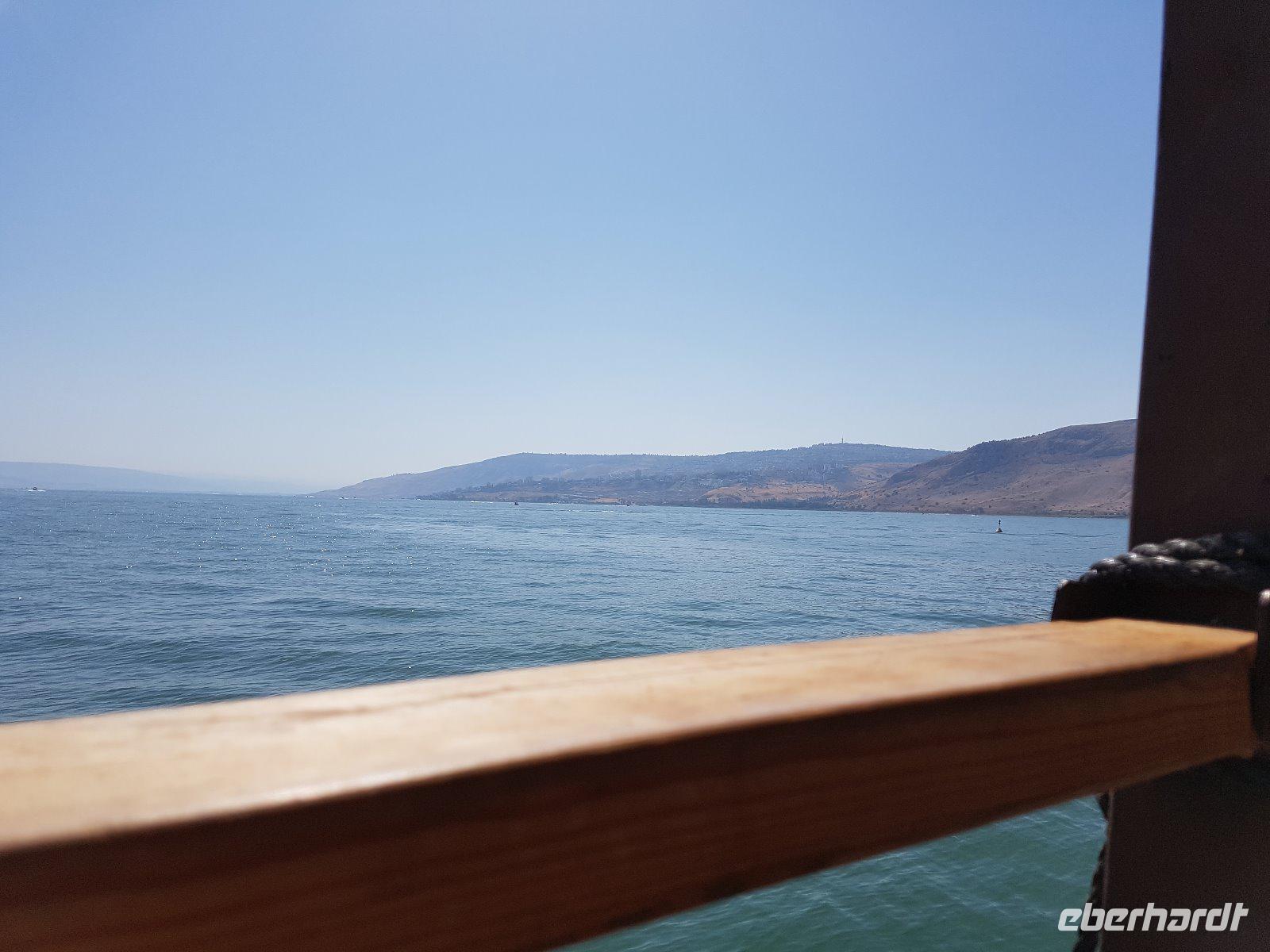 Vom Ygal Allon Center aus startend entspannen wir bei einer Bootsfahrt auf dem See Genezareth. Der Blick schweift dabei schon über die Golan Höhen, welche wir morgen besuchen werden.