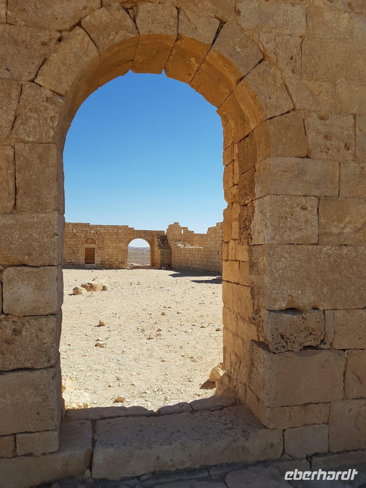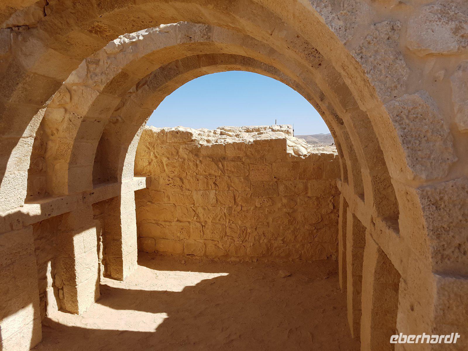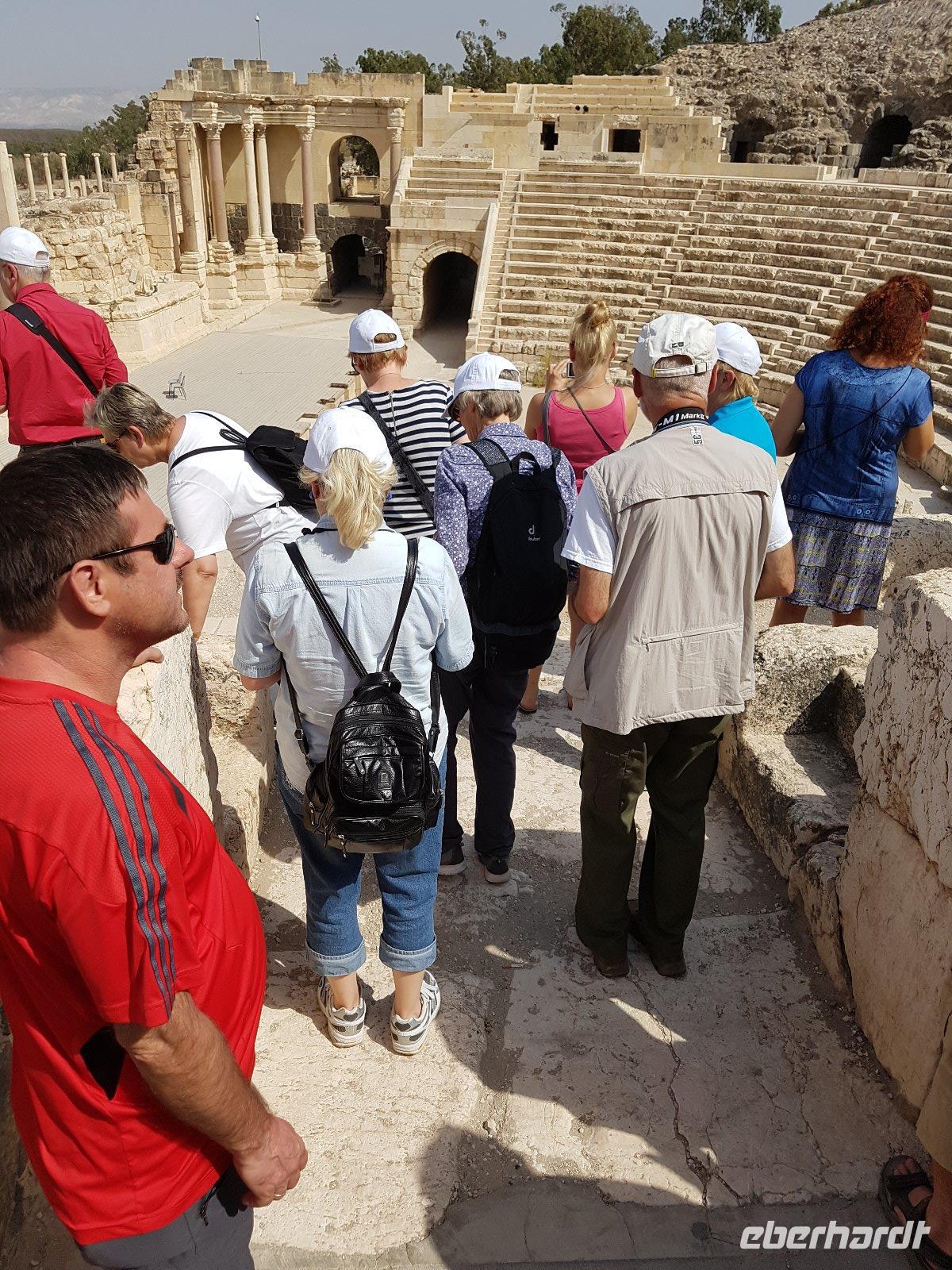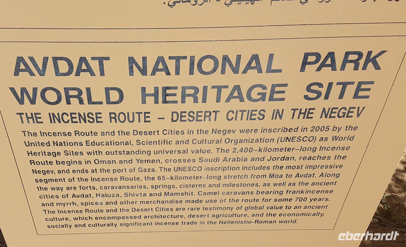 Filmpräsentation im Besucherzentrum in die Geschichte der Siedlung ein, ehe Gaby vor Ort tiefer gehende Informationen gibt. Die Nabatäer gründeten im 4. Jahrhundert v. Chr. die Stadt Avdat als Wegstation auf der Gewürzstraße, über welche neben Gewürzen auch Kosmetika und andere wertvolle Waren vom fernen Osten über die arabische Halbinsel, die Stadt Petra und die Wüste Negev zu den Hafenstädten des Mittelmeeres geliefert wurden.