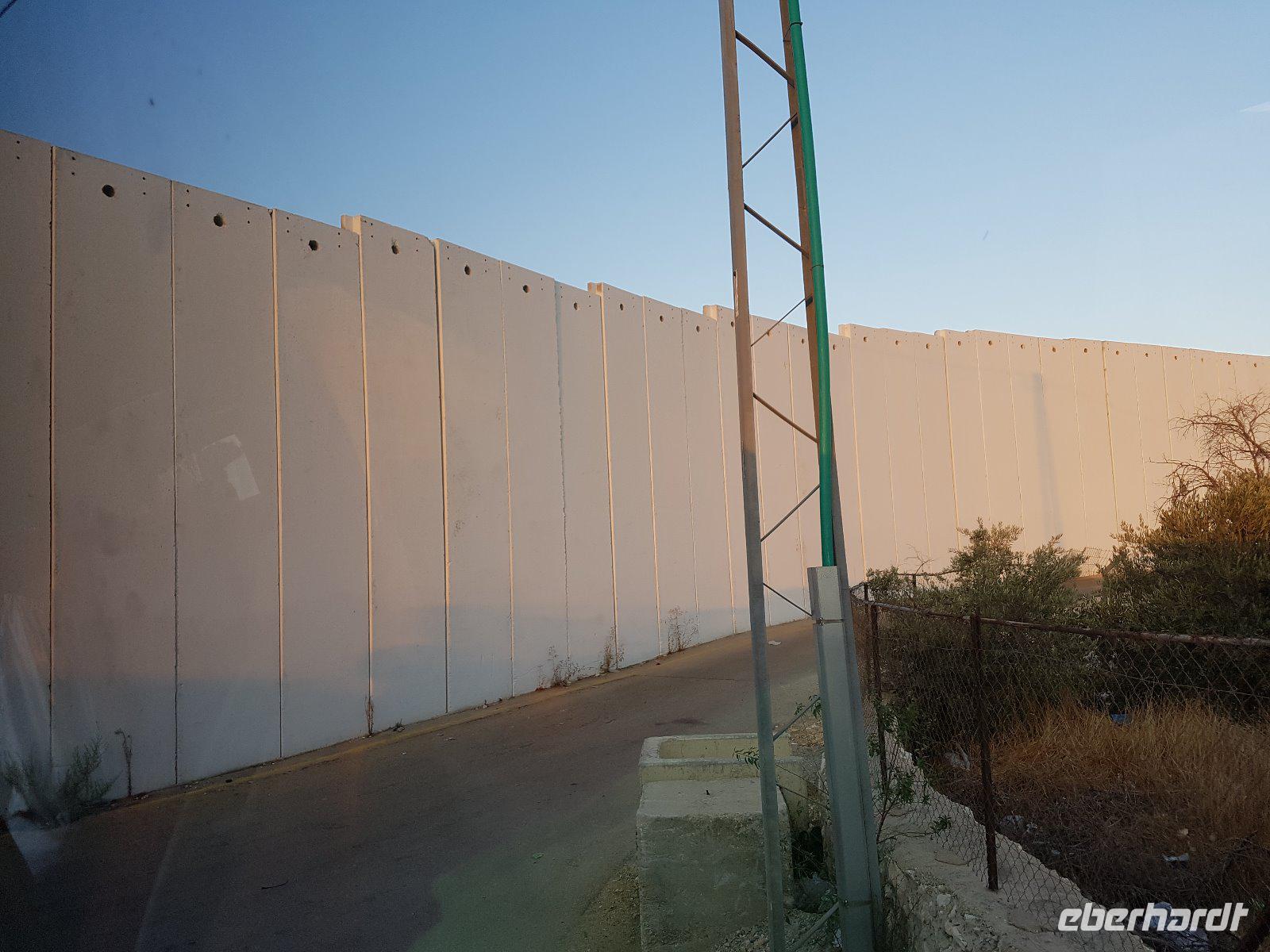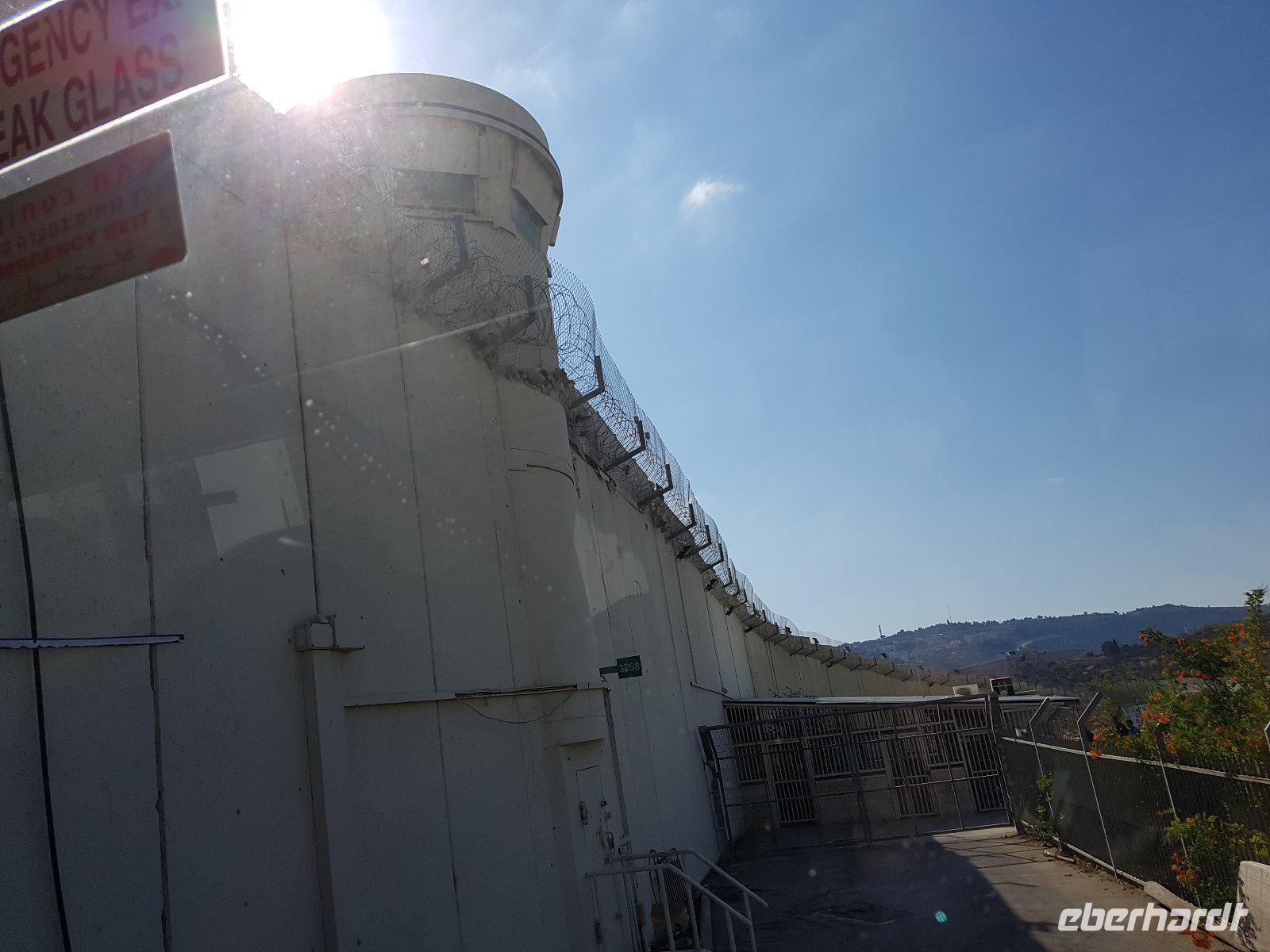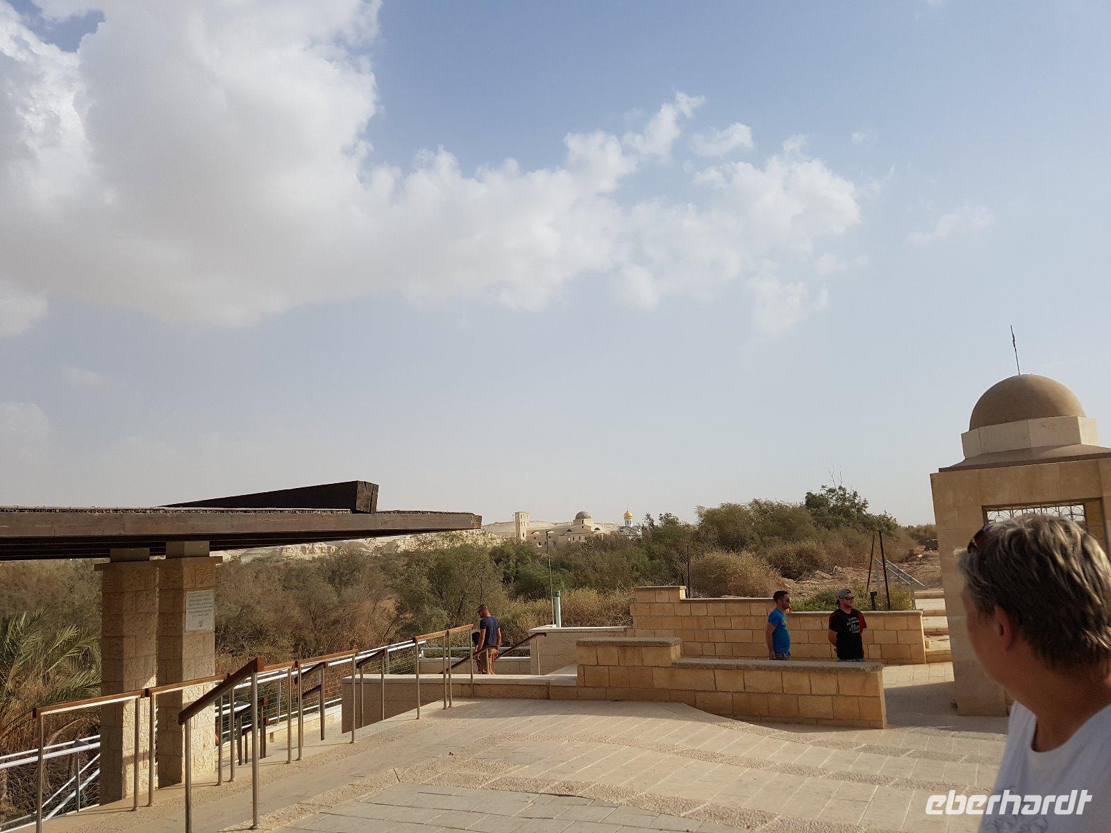 Die Fahrt zum Hotel führt ins palästinensische Gebiet, wir erreichen die sogenannte C-Zone. Bei Qasr el-Yahud passieren wir einen Checkpoint, fahren hinunter zum Jordan, welcher heute die Grenze zu Jordanien bildet und statten der Taufstelle Jesu einen Besuch ab.