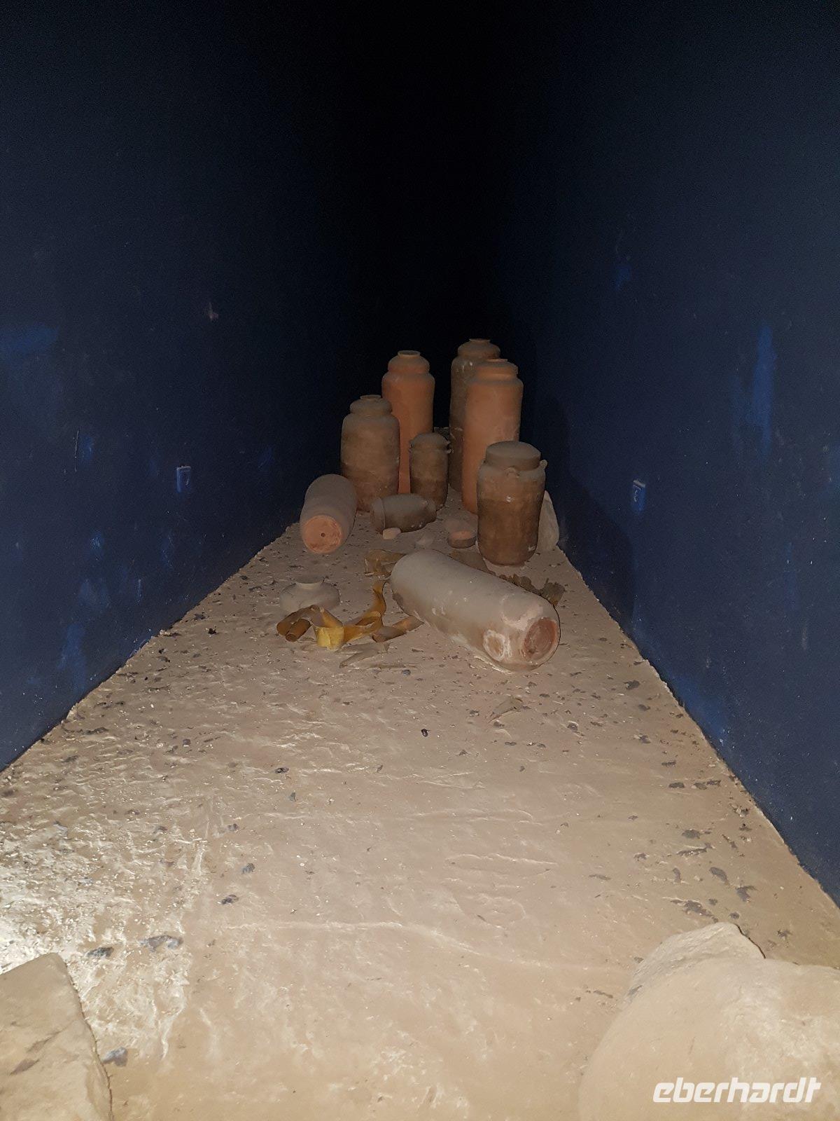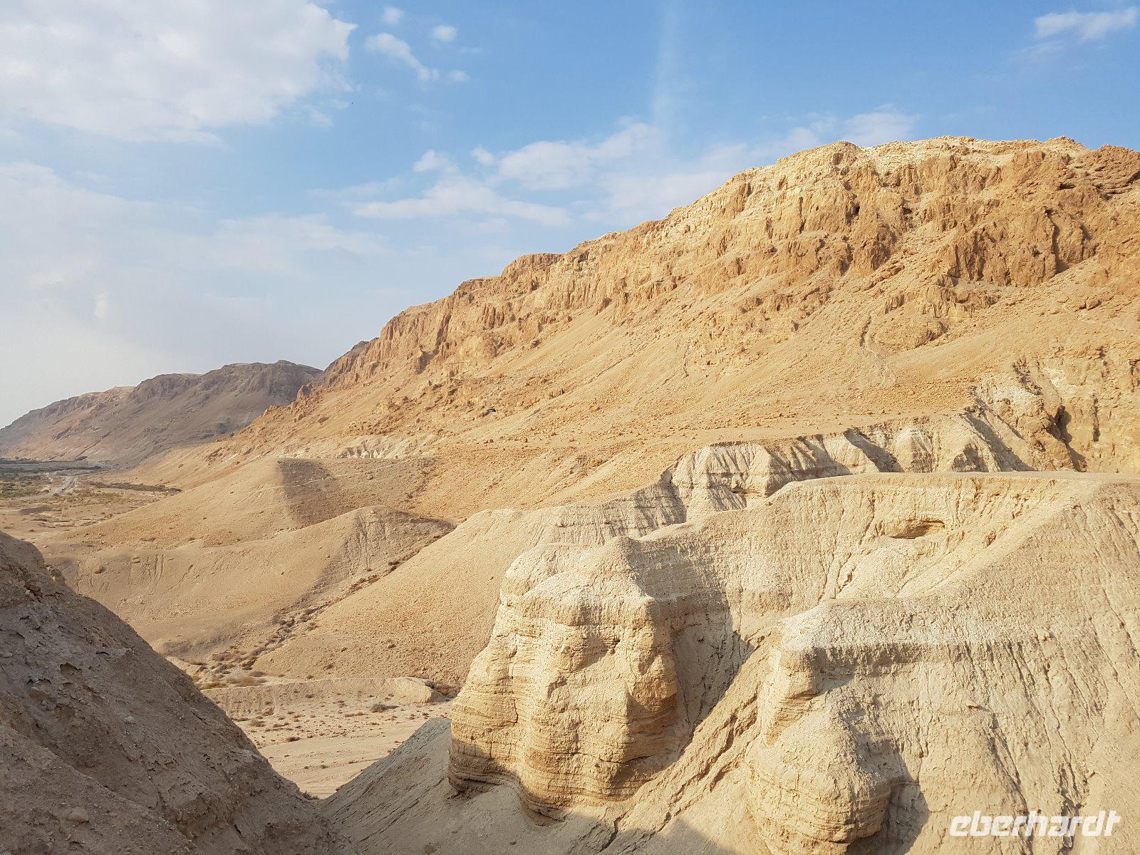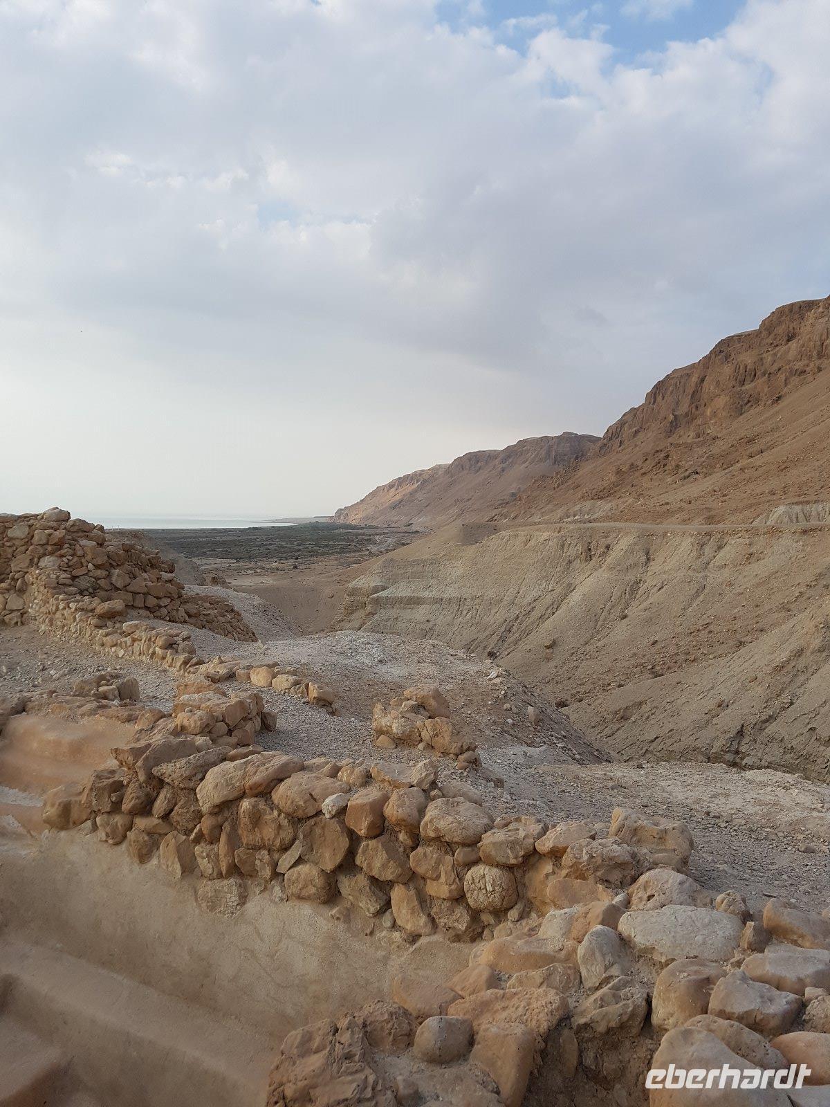 In Qumran führt uns heute Morgen ein Film in die Thematik ein; seit den Funden von Schriftrollen in elf Felshöhlen wurden die Ruinen von 1951 bis 1958 vollständig freigelegt. Dabei und danach wurden vor allem Münzen aus verschiedenen Epochen, Keramiken, verschiedene Werkzeuge und Alltagsgegenstände sowie überwiegend männliche, aber auch weibliche und kindliche Skelette gefunden. Die Deutung der Funde und ihr möglicher Zusammenhang mit den Schriften sind stark umstritten. Dennoch beantwortet die Führung durch die Ausgrabungsstätte zumindest die ein oder andere Frage.