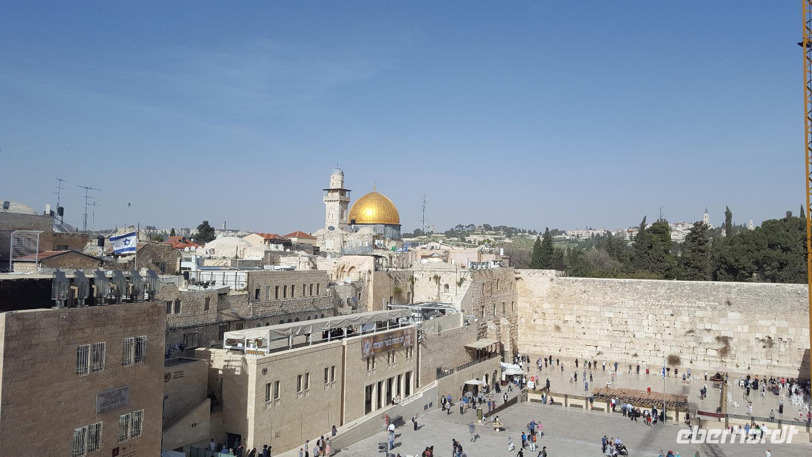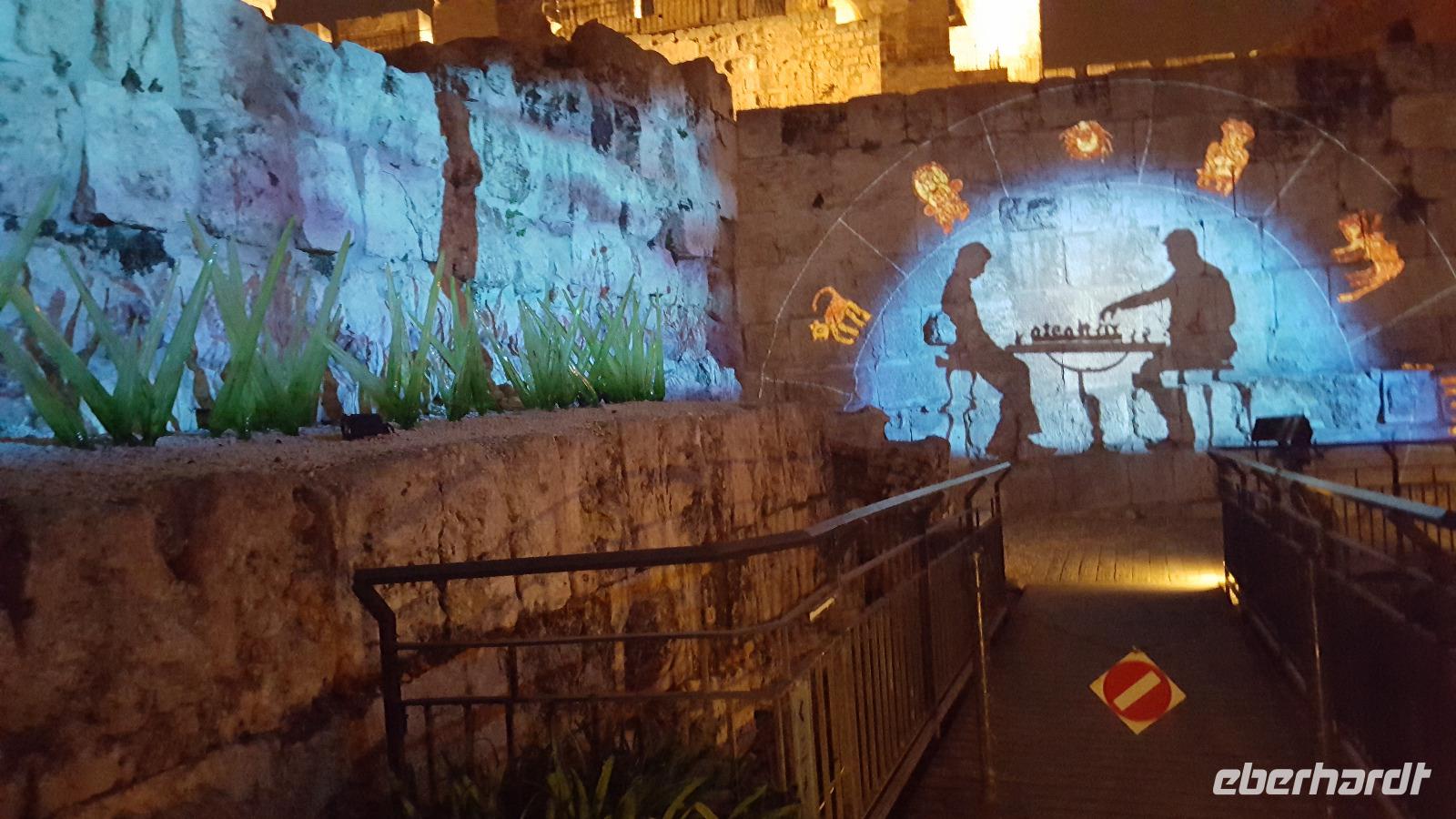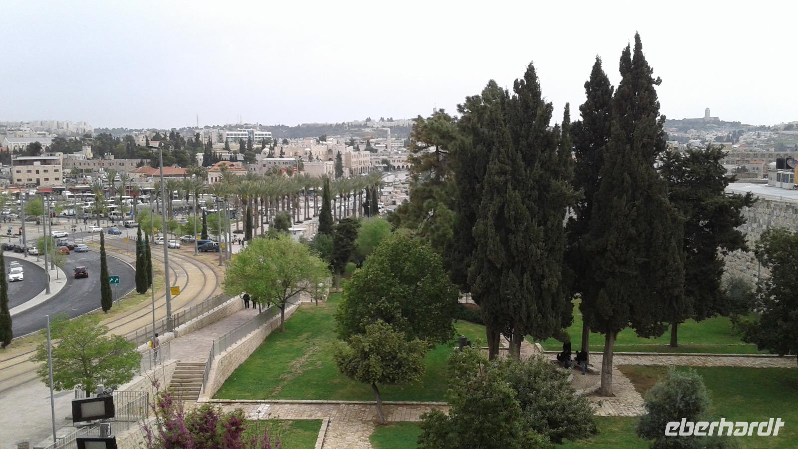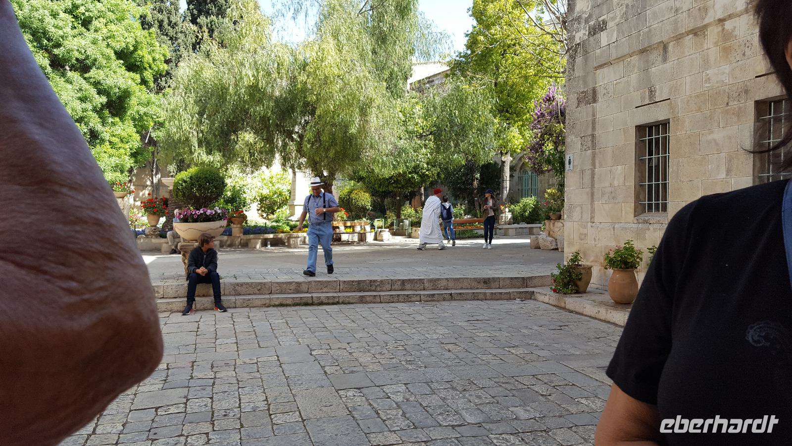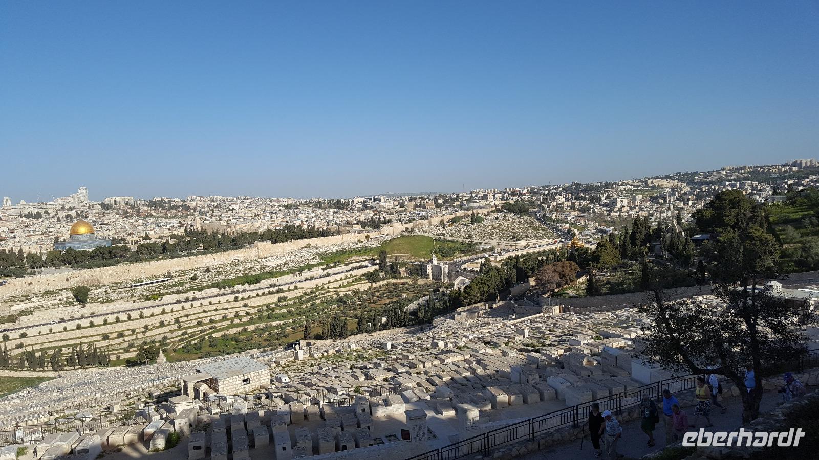 Der Tag heute gehört Jerusalem. Schon gestern haben wir viel gesehen und gehört, heute haben wir wieder Zeit für diese atemberaubende Stadt. Wir beginnen zeitig: 7:30 Uhr fahren wir los vom Hotel zum Ölberg. Von der Terrasse des Seven Arches Hotels haben wir einen phantastischen Panoramablick über die Stadt. Als zusätzliches Highlight besuchen wir die Dominus Flevit-Kirche. Wir halten inne mit einem Bibel-Zitat und genießen die Ausblicke. Gabi erläutert uns die Nekropolen bevor wir weiterspazieren zum Garten Gethsemane. Uralte Olivenbäume stehen hier, neue kommen hinzu. Natürlich besuchen wir die Kirche aller Nationen, den Namen erhielt sie, weil Kuppeln und prächtige Mosaiken von verschiedenen Nationen gestiftet wurden. Sie ist auch als „Todesangst-Basilika" bekannt, der „Felsen der Todesangst Jesu" befindet sich genau vor dem Altar der Kirche. Wir spazieren weiter und erreichen durch das Lions-Gate, das Löwentor, die St. Annen- Kirche unweit der Bethesda-Teiche. Sie ist eine der schönsten Kirchen der Stadt, ihr Bau erfolgte im 12. Jahrhundert. Es gibt eine Grotte, in der die Geburt der Maria verehrt wird. Hier verweilen wir einen Augenblick bevor wir weiterspazieren zur Via Dolorosa. An derem Eingang stehen heute das Terra Sancta Museum an dem Ort, wo einstmals Jesus zum Tode verurteilt worden war und die Geißelungskapelle. Letztere trägt in der Kuppel eine Dornenkrone, selbst die Leuchter zeigen Geißelungs-Gegenstände wie Peitschen und Nägel. In einem Haus der Wächter macht uns Gabi auf ein eingeritztes Spiel im Boden aufmerksam- man spielte damals um Menschen, um Menschenleben...Am Ecce Homo, bekannt als der Ausspruch von Pilatus: „Seht, es ist ein Mensch", da er aus den Geißelungswunden blutete, gehen wir durch den berühmten Torbogen und werfen durch die Glasscheibe einen Blick in das Kloster. Danach besuchen wir das österreichische Hospiz, Schwester Bernadette kredenzt in ihrem „Wiener Kaffeehaus" Kaffee und Kuchen und dann können wir- Eberhardt Travel machts möglich- auch die Dachterrasse besuchen. Was für ein Ausblick! Wir nutzen die Gelegenheit und schauen uns noch die Kapelle im Hospiz an, dann geht es schon weiter zur nächsten Station des Kreuzweges. Die dritte: Jesus fällt zum ersten Mal mit dem Kreuz. Eine kleine Kapelle erinnert daran. Wir folgen den weiteren bis zur 7. Station. Läden und Geschäfte säumen den Weg und unzählige Menschen sind bereits unterwegs, Gott sei Dank ebbt dieser Strom bald ab und wir haben Muße, alles zu betrachten. Dann stehen wir vor Deir es Sultan- den Klosterzellen der äthiopischen Mönche und der Zugang zu einer koptischen Kirche auf einer Plattform oberhalb der Grabeskirche. Alle weiteren Stationen des Kreuzweges befinden sich in der Grabeskirche. Am Salbungsstein beten und weinen Besucher, das Christusgrab befindet sich im Zentrum. Jeder verbringt seine Zeit hier wie er möchte. Wir gehen weiter zur deutsch-lutherischen Erlöserkirche in der Muristan Straße, halten kurz inne und dann ist individuell Zeit, die Auslagen und Läden zu bewundern. Wir treffen uns am heutigen Cardo und bestaunen im jüdischen Viertel die Ausgrabungen des Cardo, die freigelegten Straßen mit den Säulen beidseits liegen deutlich unter dem heutigen Niveau. Faszinierend die bildlichen Darstellungen und Mosaiken. Eine unserer letzten Stationen für heute ist der Zionsberg mit der Dormitio-Abtei. An dieser Stelle soll die Gottesmutter Maria entschlafen sein. In der Krypta wird ihre Grabstelle verehrt. Weiter geht es vorbei am Grab von König David hinauf zum berühmten Abendmahlsaal. Hier soll Jesus mit seinen Jüngern das berühmte letzte Abendmahl eingenommen haben. Hierher zogen sich die Jünger nach der Kreuzigung zurück und hier sollen sie auch mit Maria den heiligen Geist empfangen haben. Schlicht gehalten enthält der Raum heute auch eine muslimische Gebetsnische, da er im 16. Jahrhundert nach der Vertreibung der Franziskaner in eine Moschee umgewandelt wurde. Damit endet unser Jerusalem-Rundgang für heute, doch für den Abend steht noch ein Highlight an: die Jerusalem Sound & Licht Show. Also kehren wir ins Hotel zurück, genießen ein zeitiges Abendessen und fahren noch einmal zurück. Als kleine Überraschung hat Gabi Wein besorgt und wir stoßen vor der Stadtmauer auf einen tollen Abend an. Die Show ist überwältigend, Bauwerk, Licht und Musik verschmelzen zu einem wunderbaren Erlebnis der Geschichte Jerusalems. Unser Bus bringt uns sicher zurück zum Hotel und jeder läßt den Tag für sich ausklingen.