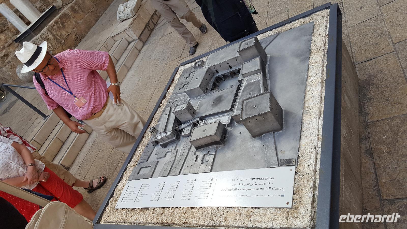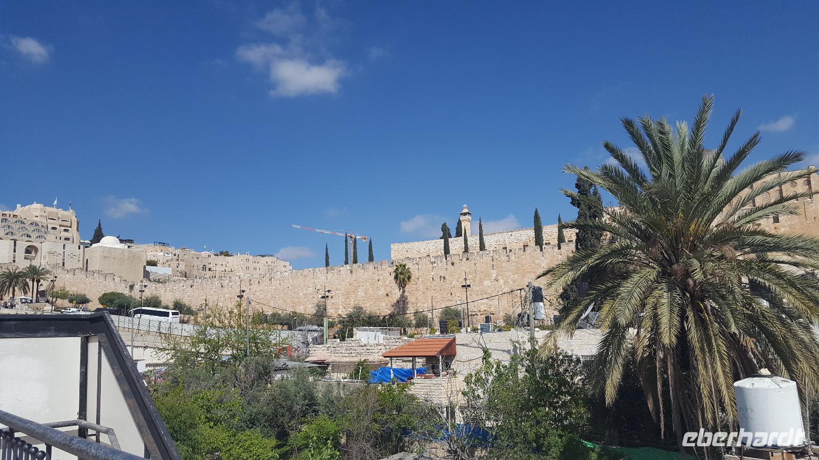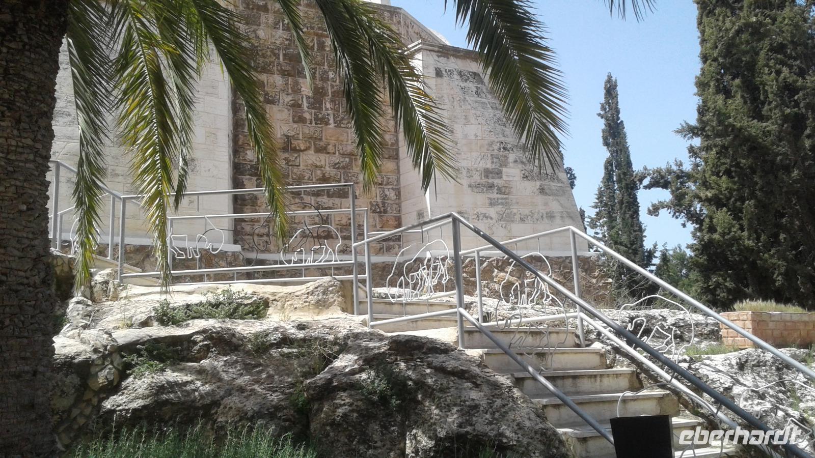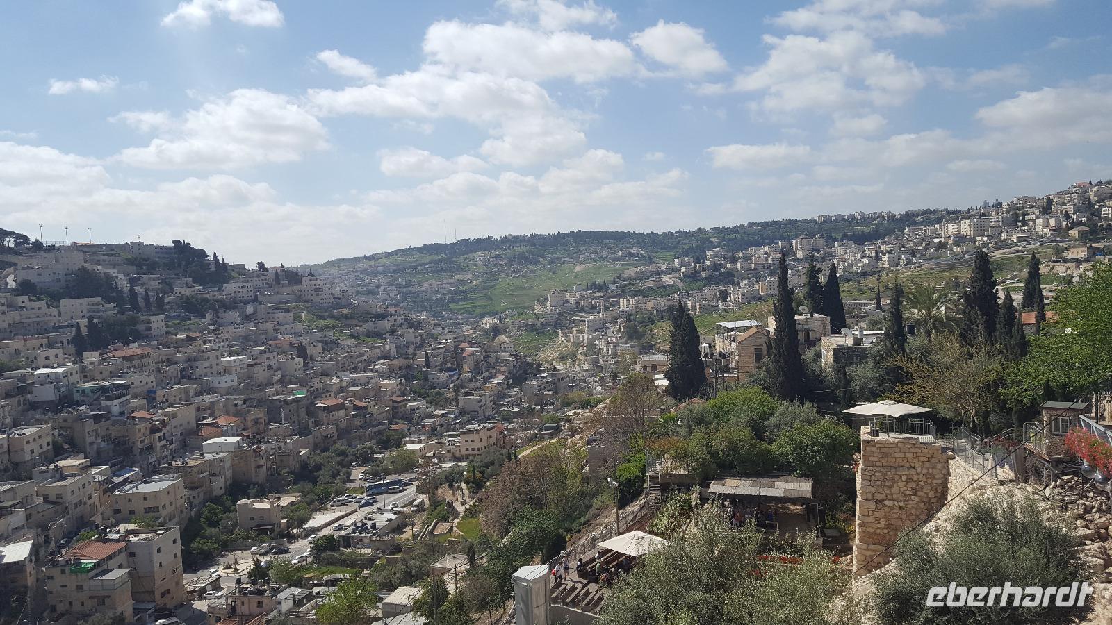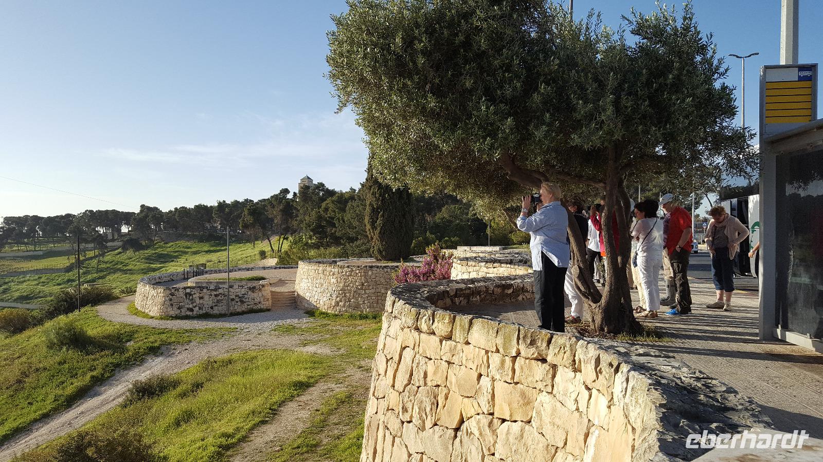 Der Tag heute gehört Jerusalem. Schon gestern haben wir viel gesehen und gehört, heute haben wir wieder Zeit für diese atemberaubende Stadt. Wir beginnen zeitig: 7:30 Uhr fahren wir los vom Hotel zum Ölberg. Von der Terrasse des Seven Arches Hotels haben wir einen phantastischen Panoramablick über die Stadt. Als zusätzliches Highlight besuchen wir die Dominus Flevit-Kirche. Wir halten inne mit einem Bibel-Zitat und genießen die Ausblicke. Gabi erläutert uns die Nekropolen bevor wir weiterspazieren zum Garten Gethsemane. Uralte Olivenbäume stehen hier, neue kommen hinzu. Natürlich besuchen wir die Kirche aller Nationen, den Namen erhielt sie, weil Kuppeln und prächtige Mosaiken von verschiedenen Nationen gestiftet wurden. Sie ist auch als „Todesangst-Basilika" bekannt, der „Felsen der Todesangst Jesu" befindet sich genau vor dem Altar der Kirche. Wir spazieren weiter und erreichen durch das Lions-Gate, das Löwentor, die St. Annen- Kirche unweit der Bethesda-Teiche. Sie ist eine der schönsten Kirchen der Stadt, ihr Bau erfolgte im 12. Jahrhundert. Es gibt eine Grotte, in der die Geburt der Maria verehrt wird. Hier verweilen wir einen Augenblick bevor wir weiterspazieren zur Via Dolorosa. An derem Eingang stehen heute das Terra Sancta Museum an dem Ort, wo einstmals Jesus zum Tode verurteilt worden war und die Geißelungskapelle. Letztere trägt in der Kuppel eine Dornenkrone, selbst die Leuchter zeigen Geißelungs-Gegenstände wie Peitschen und Nägel. In einem Haus der Wächter macht uns Gabi auf ein eingeritztes Spiel im Boden aufmerksam- man spielte damals um Menschen, um Menschenleben...Am Ecce Homo, bekannt als der Ausspruch von Pilatus: „Seht, es ist ein Mensch", da er aus den Geißelungswunden blutete, gehen wir durch den berühmten Torbogen und werfen durch die Glasscheibe einen Blick in das Kloster. Danach besuchen wir das österreichische Hospiz, Schwester Bernadette kredenzt in ihrem „Wiener Kaffeehaus" Kaffee und Kuchen und dann können wir- Eberhardt Travel machts möglich- auch die Dachterrasse besuchen. Was für ein Ausblick! Wir nutzen die Gelegenheit und schauen uns noch die Kapelle im Hospiz an, dann geht es schon weiter zur nächsten Station des Kreuzweges. Die dritte: Jesus fällt zum ersten Mal mit dem Kreuz. Eine kleine Kapelle erinnert daran. Wir folgen den weiteren bis zur 7. Station. Läden und Geschäfte säumen den Weg und unzählige Menschen sind bereits unterwegs, Gott sei Dank ebbt dieser Strom bald ab und wir haben Muße, alles zu betrachten. Dann stehen wir vor Deir es Sultan- den Klosterzellen der äthiopischen Mönche und der Zugang zu einer koptischen Kirche auf einer Plattform oberhalb der Grabeskirche. Alle weiteren Stationen des Kreuzweges befinden sich in der Grabeskirche. Am Salbungsstein beten und weinen Besucher, das Christusgrab befindet sich im Zentrum. Jeder verbringt seine Zeit hier wie er möchte. Wir gehen weiter zur deutsch-lutherischen Erlöserkirche in der Muristan Straße, halten kurz inne und dann ist individuell Zeit, die Auslagen und Läden zu bewundern. Wir treffen uns am heutigen Cardo und bestaunen im jüdischen Viertel die Ausgrabungen des Cardo, die freigelegten Straßen mit den Säulen beidseits liegen deutlich unter dem heutigen Niveau. Faszinierend die bildlichen Darstellungen und Mosaiken. Eine unserer letzten Stationen für heute ist der Zionsberg mit der Dormitio-Abtei. An dieser Stelle soll die Gottesmutter Maria entschlafen sein. In der Krypta wird ihre Grabstelle verehrt. Weiter geht es vorbei am Grab von König David hinauf zum berühmten Abendmahlsaal. Hier soll Jesus mit seinen Jüngern das berühmte letzte Abendmahl eingenommen haben. Hierher zogen sich die Jünger nach der Kreuzigung zurück und hier sollen sie auch mit Maria den heiligen Geist empfangen haben. Schlicht gehalten enthält der Raum heute auch eine muslimische Gebetsnische, da er im 16. Jahrhundert nach der Vertreibung der Franziskaner in eine Moschee umgewandelt wurde. Damit endet unser Jerusalem-Rundgang für heute, doch für den Abend steht noch ein Highlight an: die Jerusalem Sound & Licht Show. Also kehren wir ins Hotel zurück, genießen ein zeitiges Abendessen und fahren noch einmal zurück. Als kleine Überraschung hat Gabi Wein besorgt und wir stoßen vor der Stadtmauer auf einen tollen Abend an. Die Show ist überwältigend, Bauwerk, Licht und Musik verschmelzen zu einem wunderbaren Erlebnis der Geschichte Jerusalems. Unser Bus bringt uns sicher zurück zum Hotel und jeder läßt den Tag für sich ausklingen.