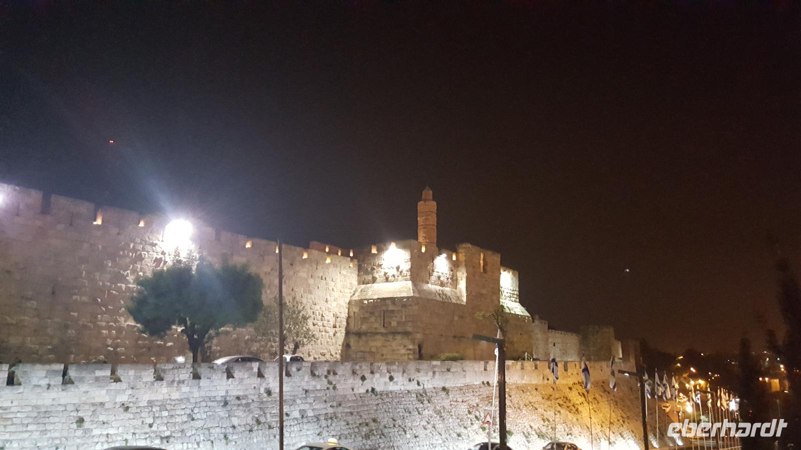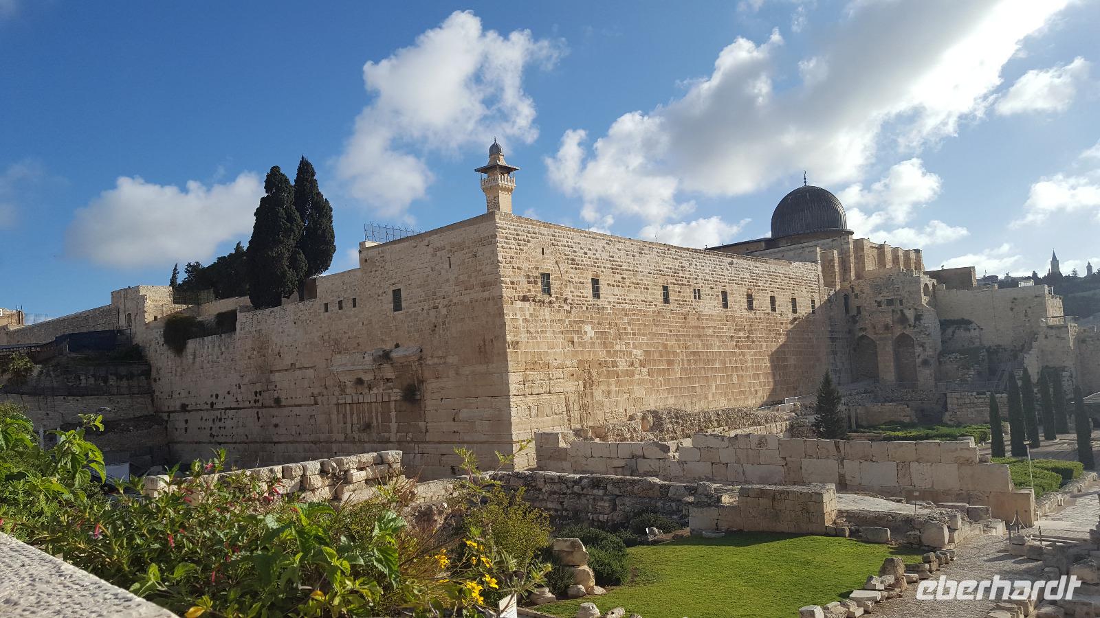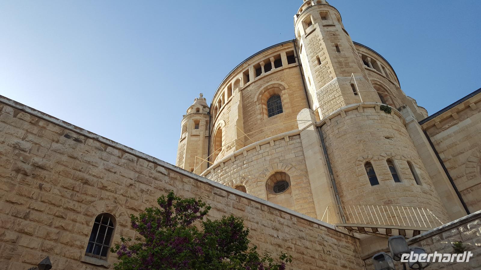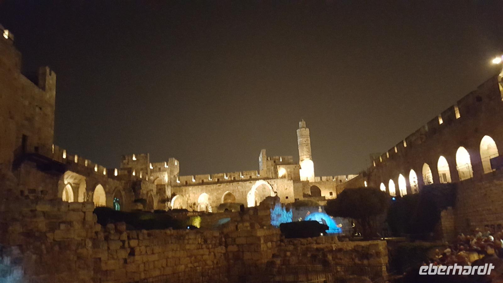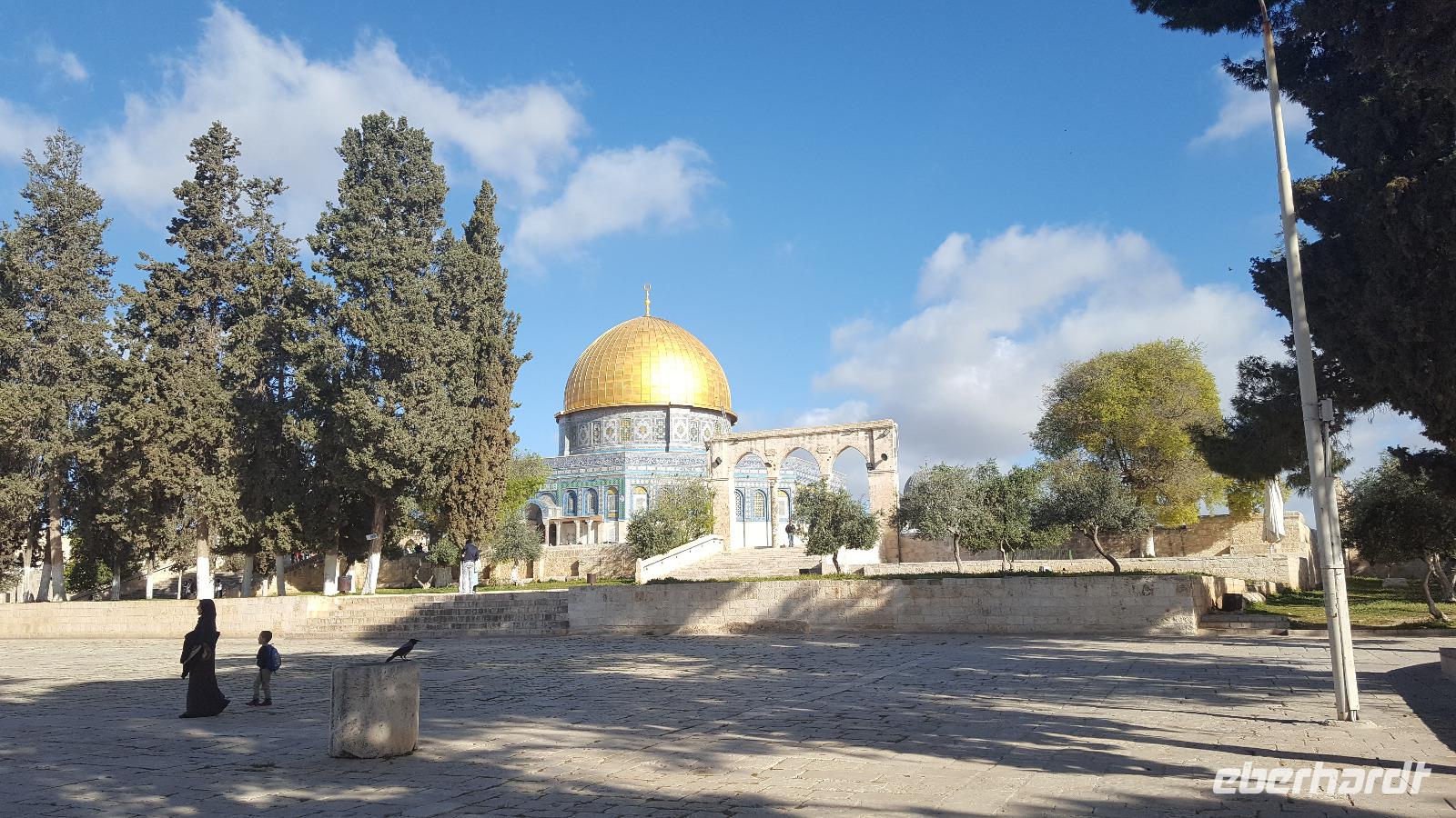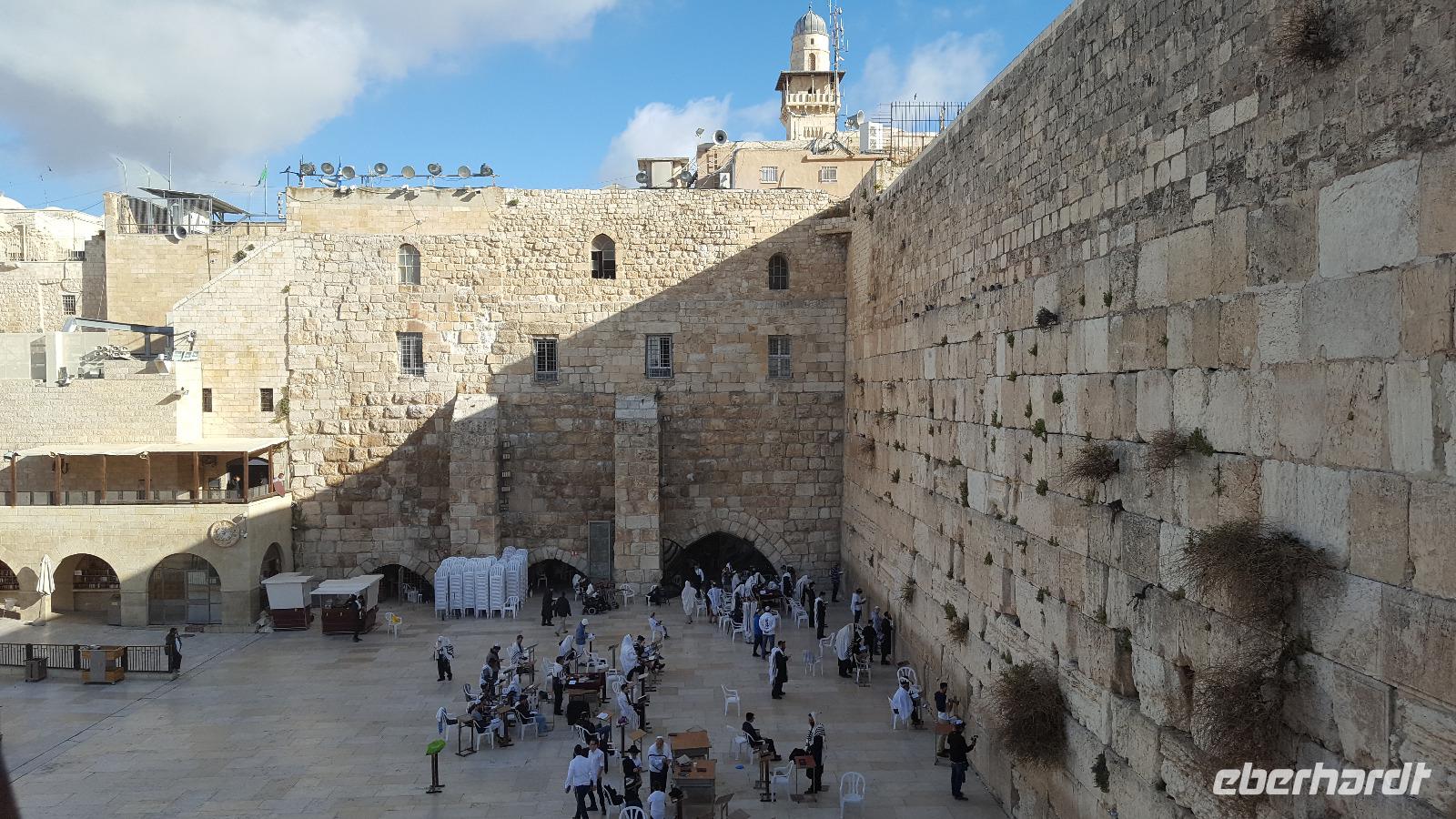 Der Tag heute gehört Jerusalem. Schon gestern haben wir viel gesehen und gehört, heute haben wir wieder Zeit für diese atemberaubende Stadt. Wir beginnen zeitig: 7:30 Uhr fahren wir los vom Hotel zum Ölberg. Von der Terrasse des Seven Arches Hotels haben wir einen phantastischen Panoramablick über die Stadt. Als zusätzliches Highlight besuchen wir die Dominus Flevit-Kirche. Wir halten inne mit einem Bibel-Zitat und genießen die Ausblicke. Gabi erläutert uns die Nekropolen bevor wir weiterspazieren zum Garten Gethsemane. Uralte Olivenbäume stehen hier, neue kommen hinzu. Natürlich besuchen wir die Kirche aller Nationen, den Namen erhielt sie, weil Kuppeln und prächtige Mosaiken von verschiedenen Nationen gestiftet wurden. Sie ist auch als „Todesangst-Basilika" bekannt, der „Felsen der Todesangst Jesu" befindet sich genau vor dem Altar der Kirche. Wir spazieren weiter und erreichen durch das Lions-Gate, das Löwentor, die St. Annen- Kirche unweit der Bethesda-Teiche. Sie ist eine der schönsten Kirchen der Stadt, ihr Bau erfolgte im 12. Jahrhundert. Es gibt eine Grotte, in der die Geburt der Maria verehrt wird. Hier verweilen wir einen Augenblick bevor wir weiterspazieren zur Via Dolorosa. An derem Eingang stehen heute das Terra Sancta Museum an dem Ort, wo einstmals Jesus zum Tode verurteilt worden war und die Geißelungskapelle. Letztere trägt in der Kuppel eine Dornenkrone, selbst die Leuchter zeigen Geißelungs-Gegenstände wie Peitschen und Nägel. In einem Haus der Wächter macht uns Gabi auf ein eingeritztes Spiel im Boden aufmerksam- man spielte damals um Menschen, um Menschenleben...Am Ecce Homo, bekannt als der Ausspruch von Pilatus: „Seht, es ist ein Mensch", da er aus den Geißelungswunden blutete, gehen wir durch den berühmten Torbogen und werfen durch die Glasscheibe einen Blick in das Kloster. Danach besuchen wir das österreichische Hospiz, Schwester Bernadette kredenzt in ihrem „Wiener Kaffeehaus" Kaffee und Kuchen und dann können wir- Eberhardt Travel machts möglich- auch die Dachterrasse besuchen. Was für ein Ausblick! Wir nutzen die Gelegenheit und schauen uns noch die Kapelle im Hospiz an, dann geht es schon weiter zur nächsten Station des Kreuzweges. Die dritte: Jesus fällt zum ersten Mal mit dem Kreuz. Eine kleine Kapelle erinnert daran. Wir folgen den weiteren bis zur 7. Station. Läden und Geschäfte säumen den Weg und unzählige Menschen sind bereits unterwegs, Gott sei Dank ebbt dieser Strom bald ab und wir haben Muße, alles zu betrachten. Dann stehen wir vor Deir es Sultan- den Klosterzellen der äthiopischen Mönche und der Zugang zu einer koptischen Kirche auf einer Plattform oberhalb der Grabeskirche. Alle weiteren Stationen des Kreuzweges befinden sich in der Grabeskirche. Am Salbungsstein beten und weinen Besucher, das Christusgrab befindet sich im Zentrum. Jeder verbringt seine Zeit hier wie er möchte. Wir gehen weiter zur deutsch-lutherischen Erlöserkirche in der Muristan Straße, halten kurz inne und dann ist individuell Zeit, die Auslagen und Läden zu bewundern. Wir treffen uns am heutigen Cardo und bestaunen im jüdischen Viertel die Ausgrabungen des Cardo, die freigelegten Straßen mit den Säulen beidseits liegen deutlich unter dem heutigen Niveau. Faszinierend die bildlichen Darstellungen und Mosaiken. Eine unserer letzten Stationen für heute ist der Zionsberg mit der Dormitio-Abtei. An dieser Stelle soll die Gottesmutter Maria entschlafen sein. In der Krypta wird ihre Grabstelle verehrt. Weiter geht es vorbei am Grab von König David hinauf zum berühmten Abendmahlsaal. Hier soll Jesus mit seinen Jüngern das berühmte letzte Abendmahl eingenommen haben. Hierher zogen sich die Jünger nach der Kreuzigung zurück und hier sollen sie auch mit Maria den heiligen Geist empfangen haben. Schlicht gehalten enthält der Raum heute auch eine muslimische Gebetsnische, da er im 16. Jahrhundert nach der Vertreibung der Franziskaner in eine Moschee umgewandelt wurde. Damit endet unser Jerusalem-Rundgang für heute, doch für den Abend steht noch ein Highlight an: die Jerusalem Sound & Licht Show. Also kehren wir ins Hotel zurück, genießen ein zeitiges Abendessen und fahren noch einmal zurück. Als kleine Überraschung hat Gabi Wein besorgt und wir stoßen vor der Stadtmauer auf einen tollen Abend an. Die Show ist überwältigend, Bauwerk, Licht und Musik verschmelzen zu einem wunderbaren Erlebnis der Geschichte Jerusalems. Unser Bus bringt uns sicher zurück zum Hotel und jeder läßt den Tag für sich ausklingen.