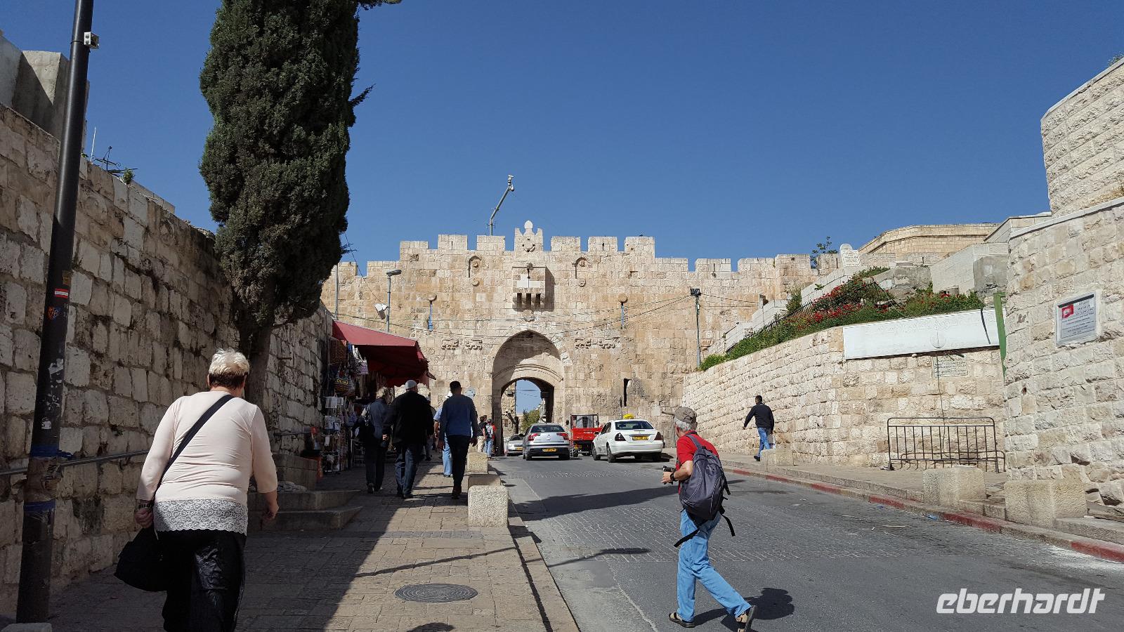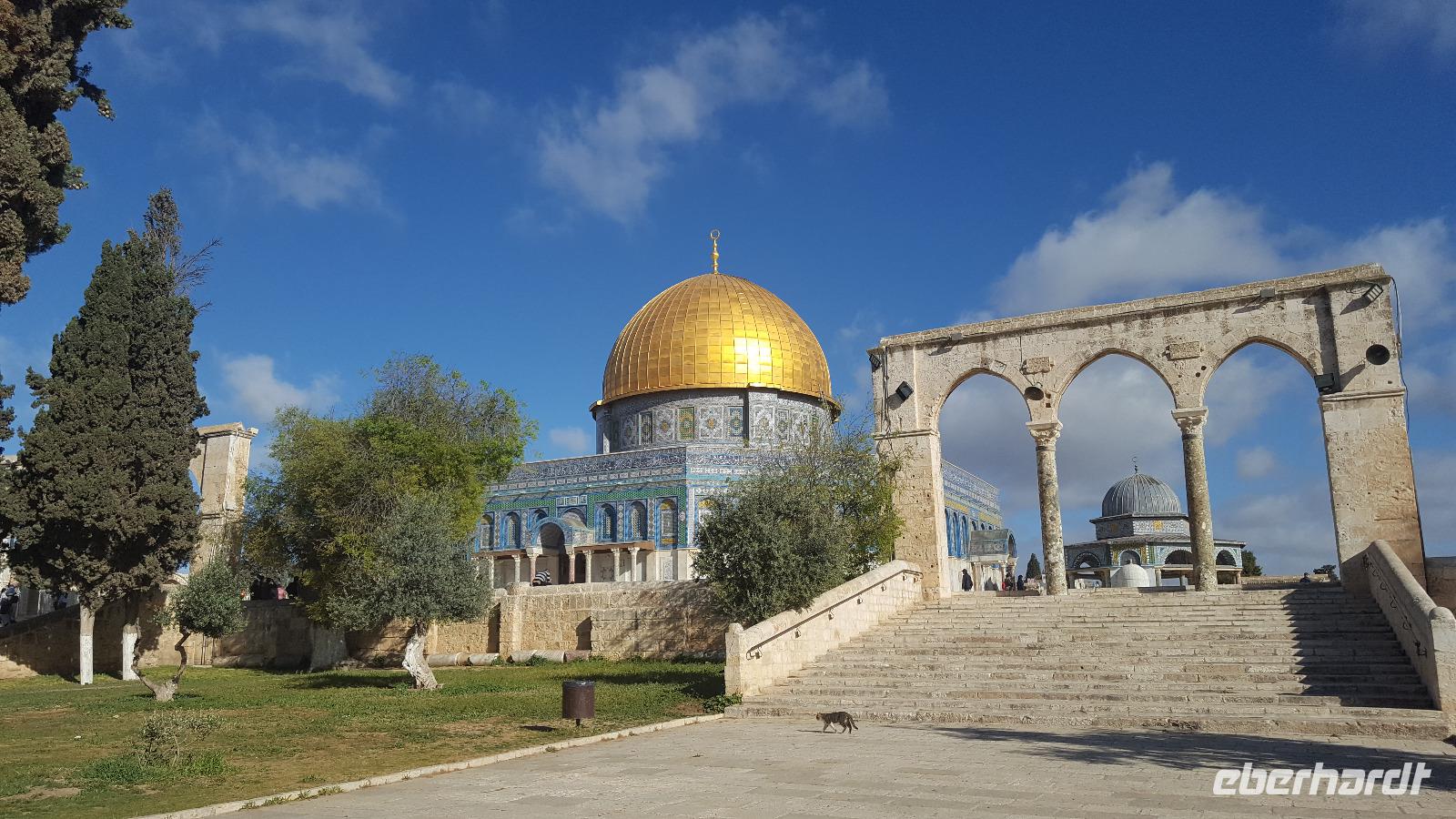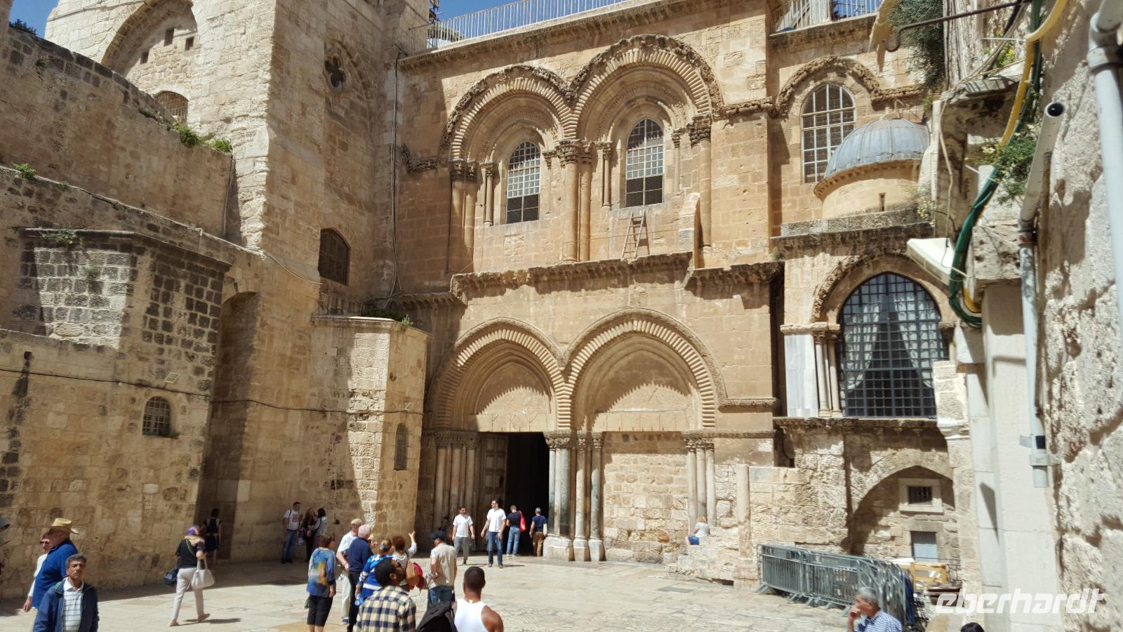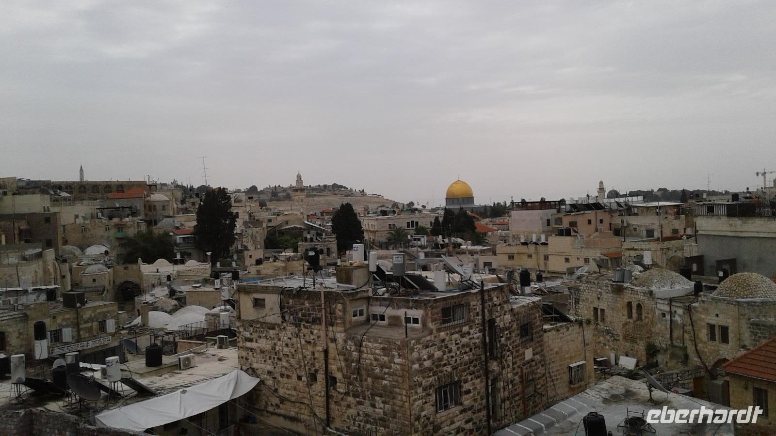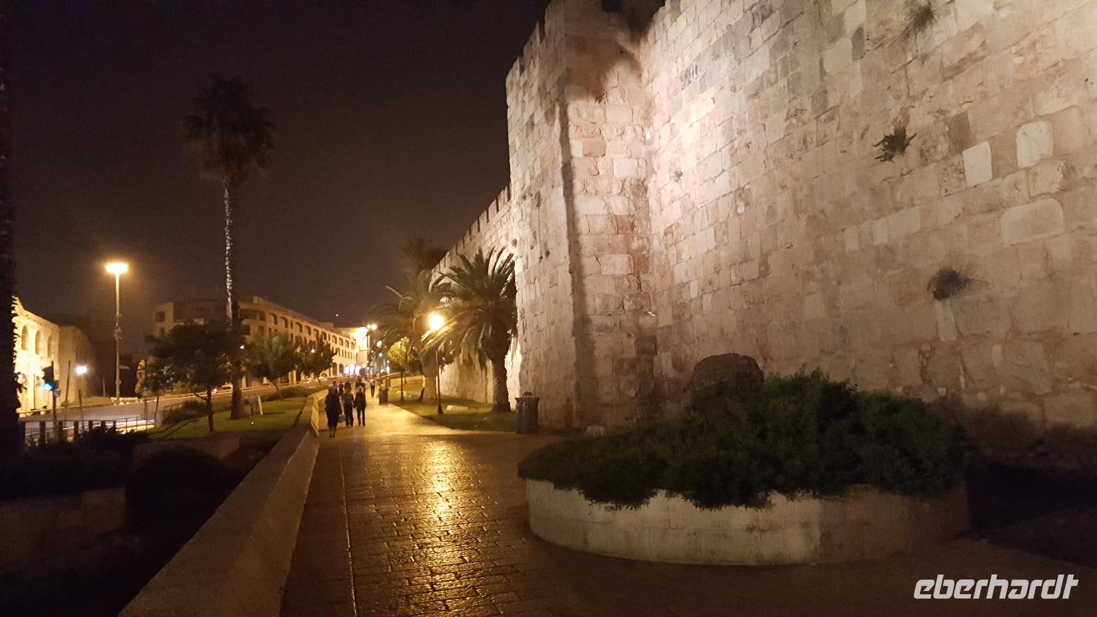 Der Tag heute gehört Jerusalem. Schon gestern haben wir viel gesehen und gehört, heute haben wir wieder Zeit für diese atemberaubende Stadt. Wir beginnen zeitig: 7:30 Uhr fahren wir los vom Hotel zum Ölberg. Von der Terrasse des Seven Arches Hotels haben wir einen phantastischen Panoramablick über die Stadt. Als zusätzliches Highlight besuchen wir die Dominus Flevit-Kirche. Wir halten inne mit einem Bibel-Zitat und genießen die Ausblicke. Gabi erläutert uns die Nekropolen bevor wir weiterspazieren zum Garten Gethsemane. Uralte Olivenbäume stehen hier, neue kommen hinzu. Natürlich besuchen wir die Kirche aller Nationen, den Namen erhielt sie, weil Kuppeln und prächtige Mosaiken von verschiedenen Nationen gestiftet wurden. Sie ist auch als „Todesangst-Basilika" bekannt, der „Felsen der Todesangst Jesu" befindet sich genau vor dem Altar der Kirche. Wir spazieren weiter und erreichen durch das Lions-Gate, das Löwentor, die St. Annen- Kirche unweit der Bethesda-Teiche. Sie ist eine der schönsten Kirchen der Stadt, ihr Bau erfolgte im 12. Jahrhundert. Es gibt eine Grotte, in der die Geburt der Maria verehrt wird. Hier verweilen wir einen Augenblick bevor wir weiterspazieren zur Via Dolorosa. An derem Eingang stehen heute das Terra Sancta Museum an dem Ort, wo einstmals Jesus zum Tode verurteilt worden war und die Geißelungskapelle. Letztere trägt in der Kuppel eine Dornenkrone, selbst die Leuchter zeigen Geißelungs-Gegenstände wie Peitschen und Nägel. In einem Haus der Wächter macht uns Gabi auf ein eingeritztes Spiel im Boden aufmerksam- man spielte damals um Menschen, um Menschenleben...Am Ecce Homo, bekannt als der Ausspruch von Pilatus: „Seht, es ist ein Mensch", da er aus den Geißelungswunden blutete, gehen wir durch den berühmten Torbogen und werfen durch die Glasscheibe einen Blick in das Kloster. Danach besuchen wir das österreichische Hospiz, Schwester Bernadette kredenzt in ihrem „Wiener Kaffeehaus" Kaffee und Kuchen und dann können wir- Eberhardt Travel machts möglich- auch die Dachterrasse besuchen. Was für ein Ausblick! Wir nutzen die Gelegenheit und schauen uns noch die Kapelle im Hospiz an, dann geht es schon weiter zur nächsten Station des Kreuzweges. Die dritte: Jesus fällt zum ersten Mal mit dem Kreuz. Eine kleine Kapelle erinnert daran. Wir folgen den weiteren bis zur 7. Station. Läden und Geschäfte säumen den Weg und unzählige Menschen sind bereits unterwegs, Gott sei Dank ebbt dieser Strom bald ab und wir haben Muße, alles zu betrachten. Dann stehen wir vor Deir es Sultan- den Klosterzellen der äthiopischen Mönche und der Zugang zu einer koptischen Kirche auf einer Plattform oberhalb der Grabeskirche. Alle weiteren Stationen des Kreuzweges befinden sich in der Grabeskirche. Am Salbungsstein beten und weinen Besucher, das Christusgrab befindet sich im Zentrum. Jeder verbringt seine Zeit hier wie er möchte. Wir gehen weiter zur deutsch-lutherischen Erlöserkirche in der Muristan Straße, halten kurz inne und dann ist individuell Zeit, die Auslagen und Läden zu bewundern. Wir treffen uns am heutigen Cardo und bestaunen im jüdischen Viertel die Ausgrabungen des Cardo, die freigelegten Straßen mit den Säulen beidseits liegen deutlich unter dem heutigen Niveau. Faszinierend die bildlichen Darstellungen und Mosaiken. Eine unserer letzten Stationen für heute ist der Zionsberg mit der Dormitio-Abtei. An dieser Stelle soll die Gottesmutter Maria entschlafen sein. In der Krypta wird ihre Grabstelle verehrt. Weiter geht es vorbei am Grab von König David hinauf zum berühmten Abendmahlsaal. Hier soll Jesus mit seinen Jüngern das berühmte letzte Abendmahl eingenommen haben. Hierher zogen sich die Jünger nach der Kreuzigung zurück und hier sollen sie auch mit Maria den heiligen Geist empfangen haben. Schlicht gehalten enthält der Raum heute auch eine muslimische Gebetsnische, da er im 16. Jahrhundert nach der Vertreibung der Franziskaner in eine Moschee umgewandelt wurde. Damit endet unser Jerusalem-Rundgang für heute, doch für den Abend steht noch ein Highlight an: die Jerusalem Sound & Licht Show. Also kehren wir ins Hotel zurück, genießen ein zeitiges Abendessen und fahren noch einmal zurück. Als kleine Überraschung hat Gabi Wein besorgt und wir stoßen vor der Stadtmauer auf einen tollen Abend an. Die Show ist überwältigend, Bauwerk, Licht und Musik verschmelzen zu einem wunderbaren Erlebnis der Geschichte Jerusalems. Unser Bus bringt uns sicher zurück zum Hotel und jeder läßt den Tag für sich ausklingen.