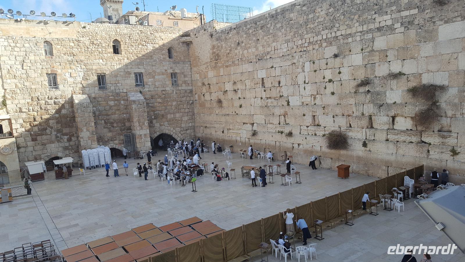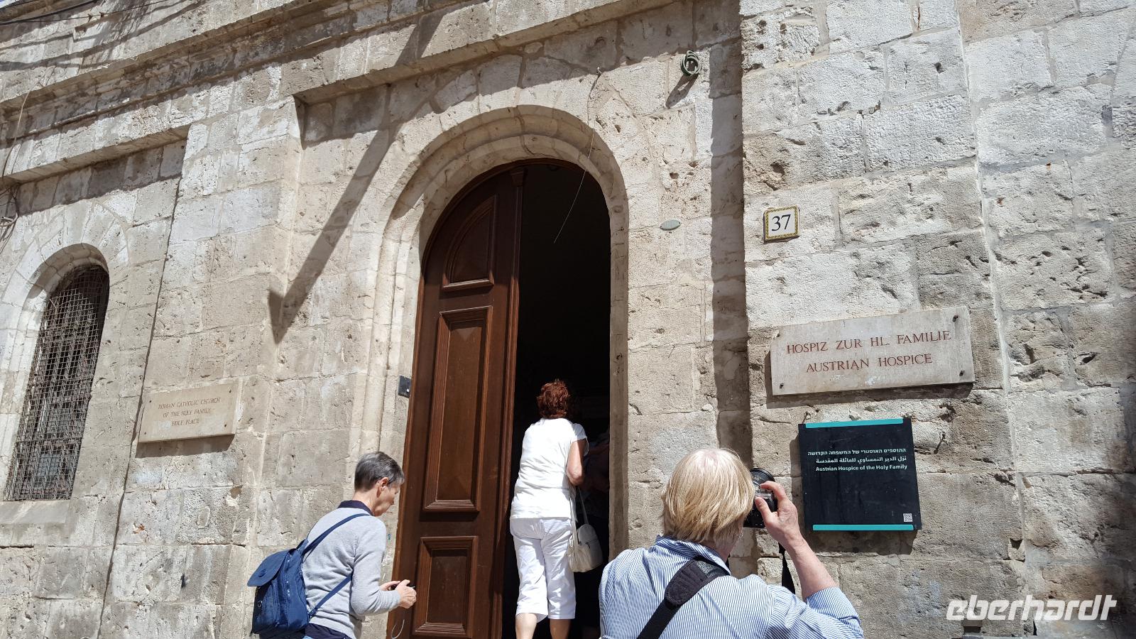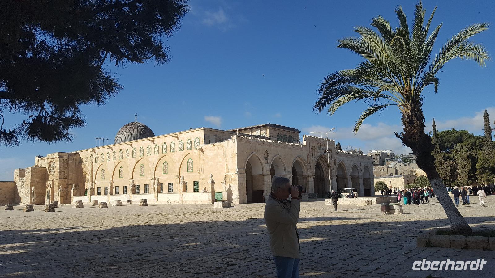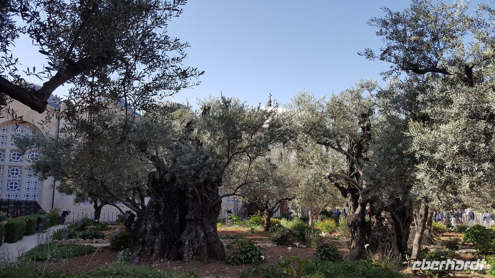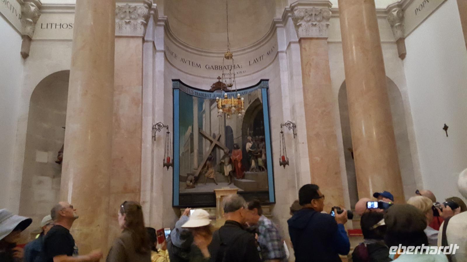 Der Tag heute gehört Jerusalem. Schon gestern haben wir viel gesehen und gehört, heute haben wir wieder Zeit für diese atemberaubende Stadt. Wir beginnen zeitig: 7:30 Uhr fahren wir los vom Hotel zum Ölberg. Von der Terrasse des Seven Arches Hotels haben wir einen phantastischen Panoramablick über die Stadt. Als zusätzliches Highlight besuchen wir die Dominus Flevit-Kirche. Wir halten inne mit einem Bibel-Zitat und genießen die Ausblicke. Gabi erläutert uns die Nekropolen bevor wir weiterspazieren zum Garten Gethsemane. Uralte Olivenbäume stehen hier, neue kommen hinzu. Natürlich besuchen wir die Kirche aller Nationen, den Namen erhielt sie, weil Kuppeln und prächtige Mosaiken von verschiedenen Nationen gestiftet wurden. Sie ist auch als „Todesangst-Basilika" bekannt, der „Felsen der Todesangst Jesu" befindet sich genau vor dem Altar der Kirche. Wir spazieren weiter und erreichen durch das Lions-Gate, das Löwentor, die St. Annen- Kirche unweit der Bethesda-Teiche. Sie ist eine der schönsten Kirchen der Stadt, ihr Bau erfolgte im 12. Jahrhundert. Es gibt eine Grotte, in der die Geburt der Maria verehrt wird. Hier verweilen wir einen Augenblick bevor wir weiterspazieren zur Via Dolorosa. An derem Eingang stehen heute das Terra Sancta Museum an dem Ort, wo einstmals Jesus zum Tode verurteilt worden war und die Geißelungskapelle. Letztere trägt in der Kuppel eine Dornenkrone, selbst die Leuchter zeigen Geißelungs-Gegenstände wie Peitschen und Nägel. In einem Haus der Wächter macht uns Gabi auf ein eingeritztes Spiel im Boden aufmerksam- man spielte damals um Menschen, um Menschenleben...Am Ecce Homo, bekannt als der Ausspruch von Pilatus: „Seht, es ist ein Mensch", da er aus den Geißelungswunden blutete, gehen wir durch den berühmten Torbogen und werfen durch die Glasscheibe einen Blick in das Kloster. Danach besuchen wir das österreichische Hospiz, Schwester Bernadette kredenzt in ihrem „Wiener Kaffeehaus" Kaffee und Kuchen und dann können wir- Eberhardt Travel machts möglich- auch die Dachterrasse besuchen. Was für ein Ausblick! Wir nutzen die Gelegenheit und schauen uns noch die Kapelle im Hospiz an, dann geht es schon weiter zur nächsten Station des Kreuzweges. Die dritte: Jesus fällt zum ersten Mal mit dem Kreuz. Eine kleine Kapelle erinnert daran. Wir folgen den weiteren bis zur 7. Station. Läden und Geschäfte säumen den Weg und unzählige Menschen sind bereits unterwegs, Gott sei Dank ebbt dieser Strom bald ab und wir haben Muße, alles zu betrachten. Dann stehen wir vor Deir es Sultan- den Klosterzellen der äthiopischen Mönche und der Zugang zu einer koptischen Kirche auf einer Plattform oberhalb der Grabeskirche. Alle weiteren Stationen des Kreuzweges befinden sich in der Grabeskirche. Am Salbungsstein beten und weinen Besucher, das Christusgrab befindet sich im Zentrum. Jeder verbringt seine Zeit hier wie er möchte. Wir gehen weiter zur deutsch-lutherischen Erlöserkirche in der Muristan Straße, halten kurz inne und dann ist individuell Zeit, die Auslagen und Läden zu bewundern. Wir treffen uns am heutigen Cardo und bestaunen im jüdischen Viertel die Ausgrabungen des Cardo, die freigelegten Straßen mit den Säulen beidseits liegen deutlich unter dem heutigen Niveau. Faszinierend die bildlichen Darstellungen und Mosaiken. Eine unserer letzten Stationen für heute ist der Zionsberg mit der Dormitio-Abtei. An dieser Stelle soll die Gottesmutter Maria entschlafen sein. In der Krypta wird ihre Grabstelle verehrt. Weiter geht es vorbei am Grab von König David hinauf zum berühmten Abendmahlsaal. Hier soll Jesus mit seinen Jüngern das berühmte letzte Abendmahl eingenommen haben. Hierher zogen sich die Jünger nach der Kreuzigung zurück und hier sollen sie auch mit Maria den heiligen Geist empfangen haben. Schlicht gehalten enthält der Raum heute auch eine muslimische Gebetsnische, da er im 16. Jahrhundert nach der Vertreibung der Franziskaner in eine Moschee umgewandelt wurde. Damit endet unser Jerusalem-Rundgang für heute, doch für den Abend steht noch ein Highlight an: die Jerusalem Sound & Licht Show. Also kehren wir ins Hotel zurück, genießen ein zeitiges Abendessen und fahren noch einmal zurück. Als kleine Überraschung hat Gabi Wein besorgt und wir stoßen vor der Stadtmauer auf einen tollen Abend an. Die Show ist überwältigend, Bauwerk, Licht und Musik verschmelzen zu einem wunderbaren Erlebnis der Geschichte Jerusalems. Unser Bus bringt uns sicher zurück zum Hotel und jeder läßt den Tag für sich ausklingen.