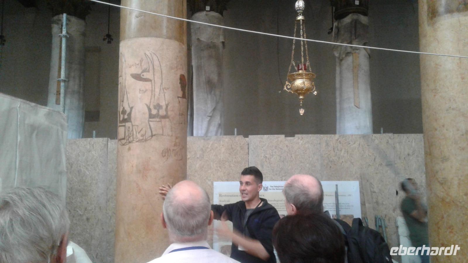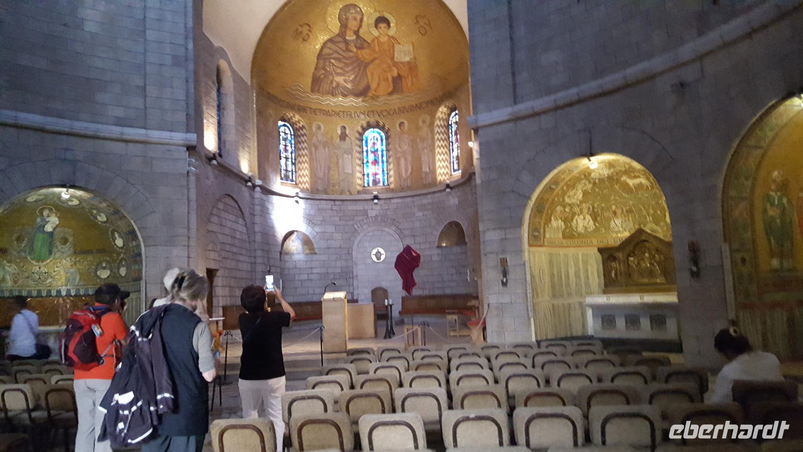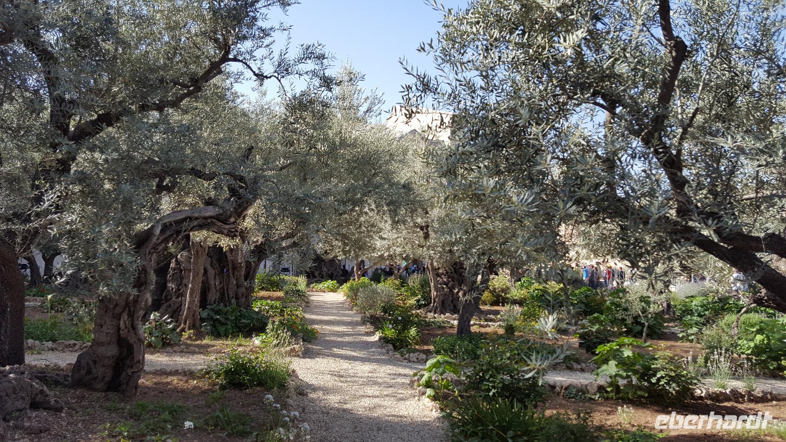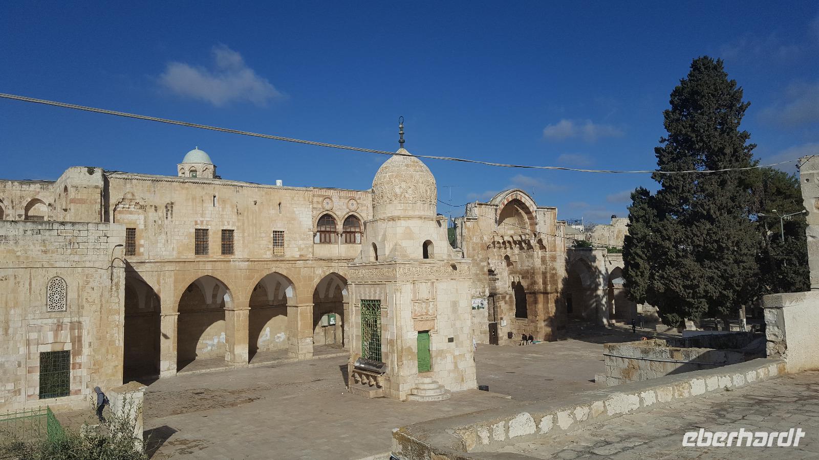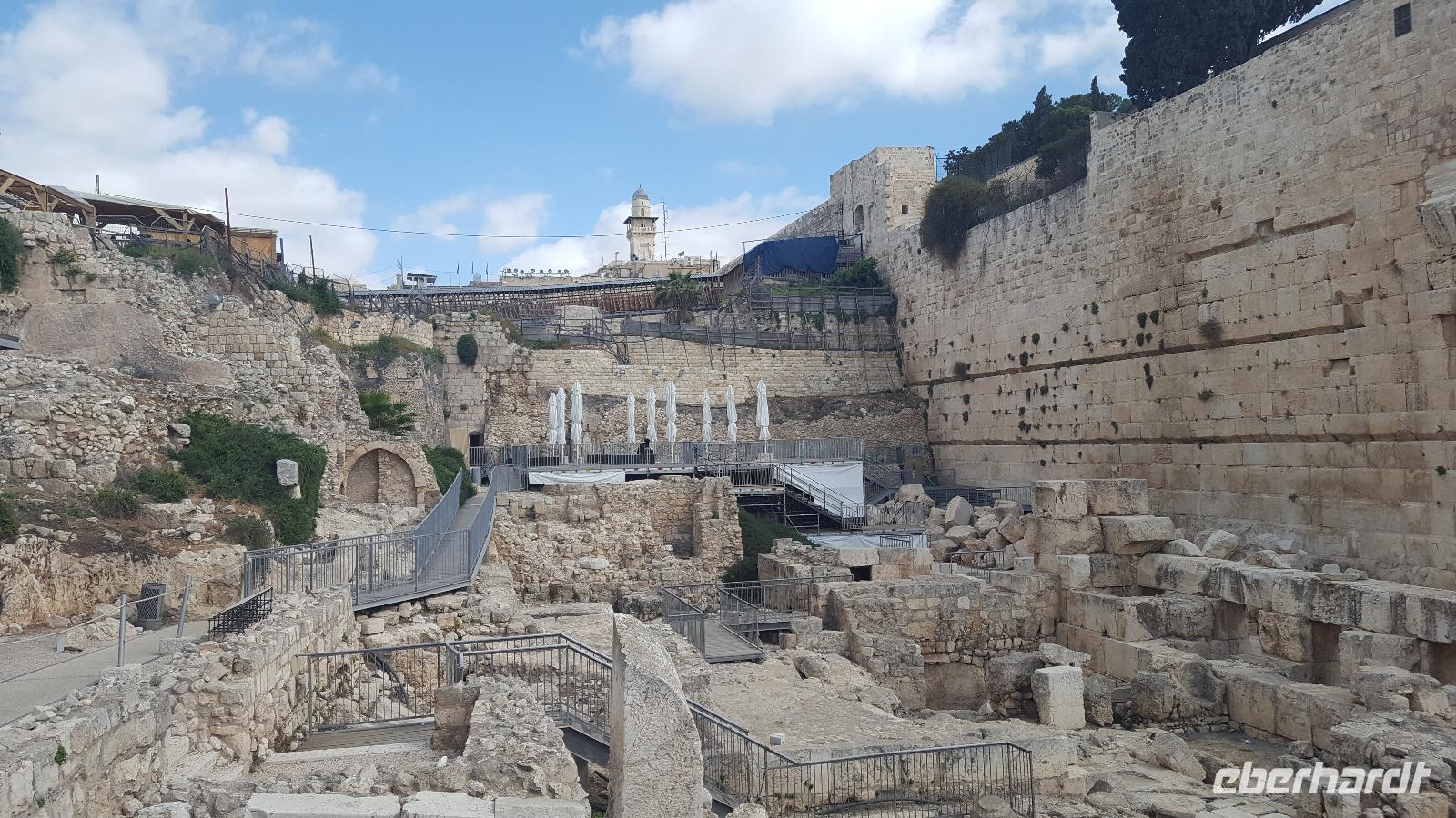 Der Tag heute gehört Jerusalem. Schon gestern haben wir viel gesehen und gehört, heute haben wir wieder Zeit für diese atemberaubende Stadt. Wir beginnen zeitig: 7:30 Uhr fahren wir los vom Hotel zum Ölberg. Von der Terrasse des Seven Arches Hotels haben wir einen phantastischen Panoramablick über die Stadt. Als zusätzliches Highlight besuchen wir die Dominus Flevit-Kirche. Wir halten inne mit einem Bibel-Zitat und genießen die Ausblicke. Gabi erläutert uns die Nekropolen bevor wir weiterspazieren zum Garten Gethsemane. Uralte Olivenbäume stehen hier, neue kommen hinzu. Natürlich besuchen wir die Kirche aller Nationen, den Namen erhielt sie, weil Kuppeln und prächtige Mosaiken von verschiedenen Nationen gestiftet wurden. Sie ist auch als „Todesangst-Basilika" bekannt, der „Felsen der Todesangst Jesu" befindet sich genau vor dem Altar der Kirche. Wir spazieren weiter und erreichen durch das Lions-Gate, das Löwentor, die St. Annen- Kirche unweit der Bethesda-Teiche. Sie ist eine der schönsten Kirchen der Stadt, ihr Bau erfolgte im 12. Jahrhundert. Es gibt eine Grotte, in der die Geburt der Maria verehrt wird. Hier verweilen wir einen Augenblick bevor wir weiterspazieren zur Via Dolorosa. An derem Eingang stehen heute das Terra Sancta Museum an dem Ort, wo einstmals Jesus zum Tode verurteilt worden war und die Geißelungskapelle. Letztere trägt in der Kuppel eine Dornenkrone, selbst die Leuchter zeigen Geißelungs-Gegenstände wie Peitschen und Nägel. In einem Haus der Wächter macht uns Gabi auf ein eingeritztes Spiel im Boden aufmerksam- man spielte damals um Menschen, um Menschenleben...Am Ecce Homo, bekannt als der Ausspruch von Pilatus: „Seht, es ist ein Mensch", da er aus den Geißelungswunden blutete, gehen wir durch den berühmten Torbogen und werfen durch die Glasscheibe einen Blick in das Kloster. Danach besuchen wir das österreichische Hospiz, Schwester Bernadette kredenzt in ihrem „Wiener Kaffeehaus" Kaffee und Kuchen und dann können wir- Eberhardt Travel machts möglich- auch die Dachterrasse besuchen. Was für ein Ausblick! Wir nutzen die Gelegenheit und schauen uns noch die Kapelle im Hospiz an, dann geht es schon weiter zur nächsten Station des Kreuzweges. Die dritte: Jesus fällt zum ersten Mal mit dem Kreuz. Eine kleine Kapelle erinnert daran. Wir folgen den weiteren bis zur 7. Station. Läden und Geschäfte säumen den Weg und unzählige Menschen sind bereits unterwegs, Gott sei Dank ebbt dieser Strom bald ab und wir haben Muße, alles zu betrachten. Dann stehen wir vor Deir es Sultan- den Klosterzellen der äthiopischen Mönche und der Zugang zu einer koptischen Kirche auf einer Plattform oberhalb der Grabeskirche. Alle weiteren Stationen des Kreuzweges befinden sich in der Grabeskirche. Am Salbungsstein beten und weinen Besucher, das Christusgrab befindet sich im Zentrum. Jeder verbringt seine Zeit hier wie er möchte. Wir gehen weiter zur deutsch-lutherischen Erlöserkirche in der Muristan Straße, halten kurz inne und dann ist individuell Zeit, die Auslagen und Läden zu bewundern. Wir treffen uns am heutigen Cardo und bestaunen im jüdischen Viertel die Ausgrabungen des Cardo, die freigelegten Straßen mit den Säulen beidseits liegen deutlich unter dem heutigen Niveau. Faszinierend die bildlichen Darstellungen und Mosaiken. Eine unserer letzten Stationen für heute ist der Zionsberg mit der Dormitio-Abtei. An dieser Stelle soll die Gottesmutter Maria entschlafen sein. In der Krypta wird ihre Grabstelle verehrt. Weiter geht es vorbei am Grab von König David hinauf zum berühmten Abendmahlsaal. Hier soll Jesus mit seinen Jüngern das berühmte letzte Abendmahl eingenommen haben. Hierher zogen sich die Jünger nach der Kreuzigung zurück und hier sollen sie auch mit Maria den heiligen Geist empfangen haben. Schlicht gehalten enthält der Raum heute auch eine muslimische Gebetsnische, da er im 16. Jahrhundert nach der Vertreibung der Franziskaner in eine Moschee umgewandelt wurde. Damit endet unser Jerusalem-Rundgang für heute, doch für den Abend steht noch ein Highlight an: die Jerusalem Sound & Licht Show. Also kehren wir ins Hotel zurück, genießen ein zeitiges Abendessen und fahren noch einmal zurück. Als kleine Überraschung hat Gabi Wein besorgt und wir stoßen vor der Stadtmauer auf einen tollen Abend an. Die Show ist überwältigend, Bauwerk, Licht und Musik verschmelzen zu einem wunderbaren Erlebnis der Geschichte Jerusalems. Unser Bus bringt uns sicher zurück zum Hotel und jeder läßt den Tag für sich ausklingen.