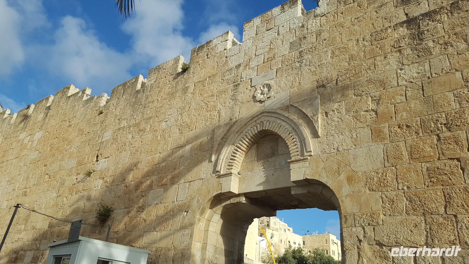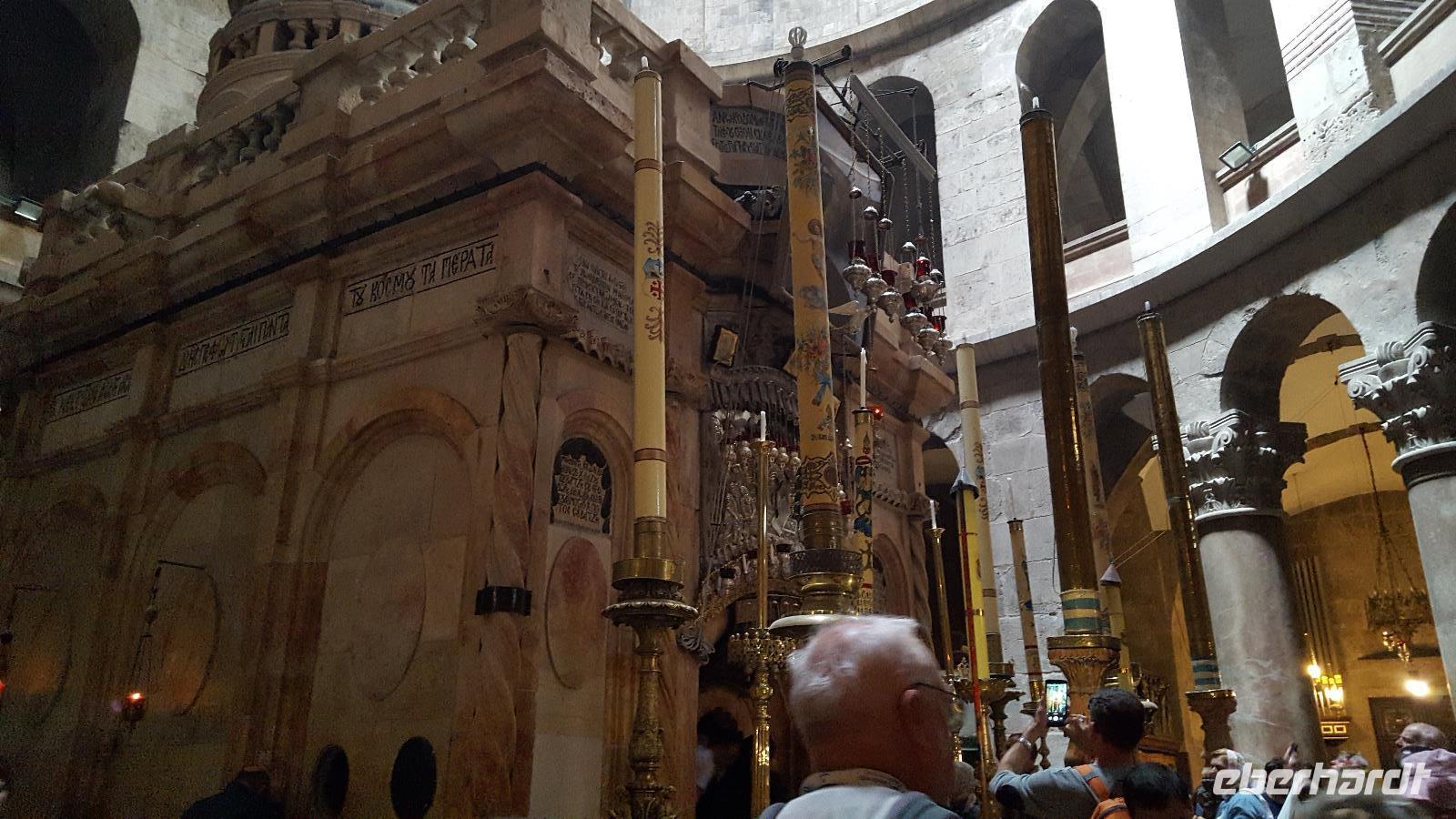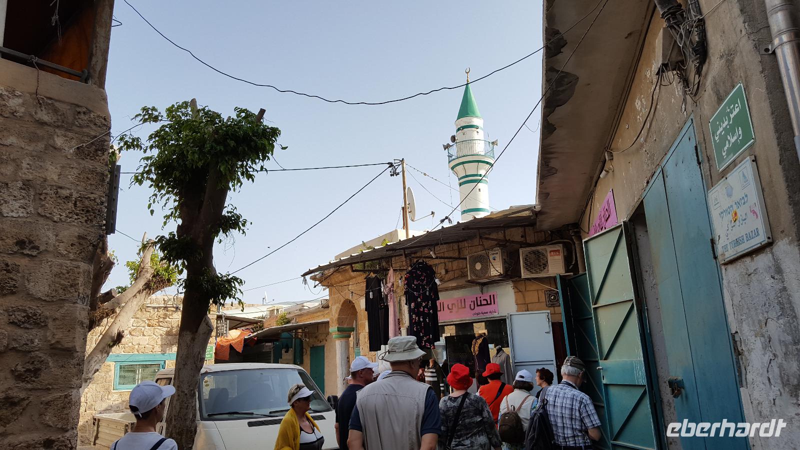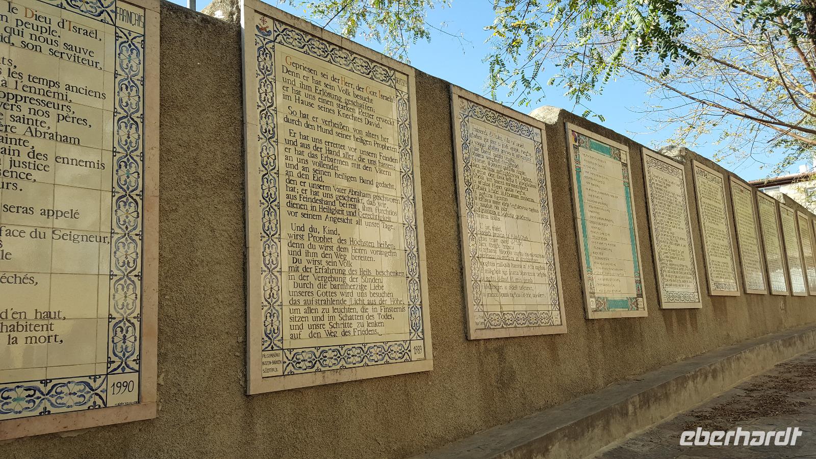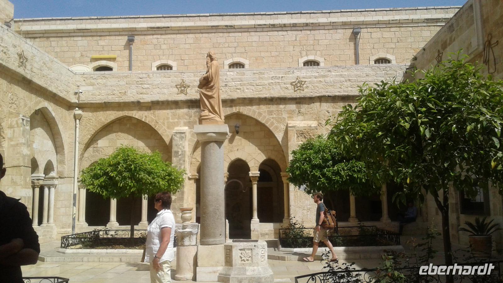 Der Tag heute gehört Jerusalem. Schon gestern haben wir viel gesehen und gehört, heute haben wir wieder Zeit für diese atemberaubende Stadt. Wir beginnen zeitig: 7:30 Uhr fahren wir los vom Hotel zum Ölberg. Von der Terrasse des Seven Arches Hotels haben wir einen phantastischen Panoramablick über die Stadt. Als zusätzliches Highlight besuchen wir die Dominus Flevit-Kirche. Wir halten inne mit einem Bibel-Zitat und genießen die Ausblicke. Gabi erläutert uns die Nekropolen bevor wir weiterspazieren zum Garten Gethsemane. Uralte Olivenbäume stehen hier, neue kommen hinzu. Natürlich besuchen wir die Kirche aller Nationen, den Namen erhielt sie, weil Kuppeln und prächtige Mosaiken von verschiedenen Nationen gestiftet wurden. Sie ist auch als „Todesangst-Basilika" bekannt, der „Felsen der Todesangst Jesu" befindet sich genau vor dem Altar der Kirche. Wir spazieren weiter und erreichen durch das Lions-Gate, das Löwentor, die St. Annen- Kirche unweit der Bethesda-Teiche. Sie ist eine der schönsten Kirchen der Stadt, ihr Bau erfolgte im 12. Jahrhundert. Es gibt eine Grotte, in der die Geburt der Maria verehrt wird. Hier verweilen wir einen Augenblick bevor wir weiterspazieren zur Via Dolorosa. An derem Eingang stehen heute das Terra Sancta Museum an dem Ort, wo einstmals Jesus zum Tode verurteilt worden war und die Geißelungskapelle. Letztere trägt in der Kuppel eine Dornenkrone, selbst die Leuchter zeigen Geißelungs-Gegenstände wie Peitschen und Nägel. In einem Haus der Wächter macht uns Gabi auf ein eingeritztes Spiel im Boden aufmerksam- man spielte damals um Menschen, um Menschenleben...Am Ecce Homo, bekannt als der Ausspruch von Pilatus: „Seht, es ist ein Mensch", da er aus den Geißelungswunden blutete, gehen wir durch den berühmten Torbogen und werfen durch die Glasscheibe einen Blick in das Kloster. Danach besuchen wir das österreichische Hospiz, Schwester Bernadette kredenzt in ihrem „Wiener Kaffeehaus" Kaffee und Kuchen und dann können wir- Eberhardt Travel machts möglich- auch die Dachterrasse besuchen. Was für ein Ausblick! Wir nutzen die Gelegenheit und schauen uns noch die Kapelle im Hospiz an, dann geht es schon weiter zur nächsten Station des Kreuzweges. Die dritte: Jesus fällt zum ersten Mal mit dem Kreuz. Eine kleine Kapelle erinnert daran. Wir folgen den weiteren bis zur 7. Station. Läden und Geschäfte säumen den Weg und unzählige Menschen sind bereits unterwegs, Gott sei Dank ebbt dieser Strom bald ab und wir haben Muße, alles zu betrachten. Dann stehen wir vor Deir es Sultan- den Klosterzellen der äthiopischen Mönche und der Zugang zu einer koptischen Kirche auf einer Plattform oberhalb der Grabeskirche. Alle weiteren Stationen des Kreuzweges befinden sich in der Grabeskirche. Am Salbungsstein beten und weinen Besucher, das Christusgrab befindet sich im Zentrum. Jeder verbringt seine Zeit hier wie er möchte. Wir gehen weiter zur deutsch-lutherischen Erlöserkirche in der Muristan Straße, halten kurz inne und dann ist individuell Zeit, die Auslagen und Läden zu bewundern. Wir treffen uns am heutigen Cardo und bestaunen im jüdischen Viertel die Ausgrabungen des Cardo, die freigelegten Straßen mit den Säulen beidseits liegen deutlich unter dem heutigen Niveau. Faszinierend die bildlichen Darstellungen und Mosaiken. Eine unserer letzten Stationen für heute ist der Zionsberg mit der Dormitio-Abtei. An dieser Stelle soll die Gottesmutter Maria entschlafen sein. In der Krypta wird ihre Grabstelle verehrt. Weiter geht es vorbei am Grab von König David hinauf zum berühmten Abendmahlsaal. Hier soll Jesus mit seinen Jüngern das berühmte letzte Abendmahl eingenommen haben. Hierher zogen sich die Jünger nach der Kreuzigung zurück und hier sollen sie auch mit Maria den heiligen Geist empfangen haben. Schlicht gehalten enthält der Raum heute auch eine muslimische Gebetsnische, da er im 16. Jahrhundert nach der Vertreibung der Franziskaner in eine Moschee umgewandelt wurde. Damit endet unser Jerusalem-Rundgang für heute, doch für den Abend steht noch ein Highlight an: die Jerusalem Sound & Licht Show. Also kehren wir ins Hotel zurück, genießen ein zeitiges Abendessen und fahren noch einmal zurück. Als kleine Überraschung hat Gabi Wein besorgt und wir stoßen vor der Stadtmauer auf einen tollen Abend an. Die Show ist überwältigend, Bauwerk, Licht und Musik verschmelzen zu einem wunderbaren Erlebnis der Geschichte Jerusalems. Unser Bus bringt uns sicher zurück zum Hotel und jeder läßt den Tag für sich ausklingen.