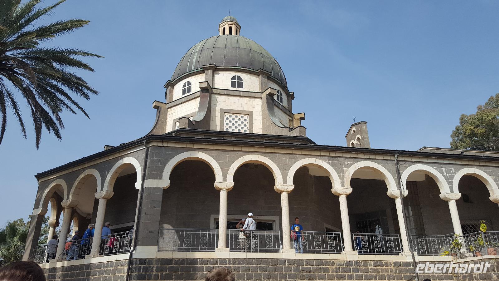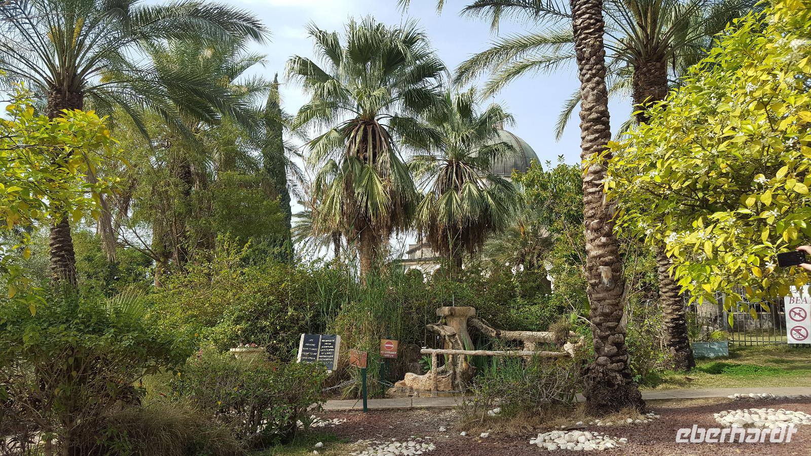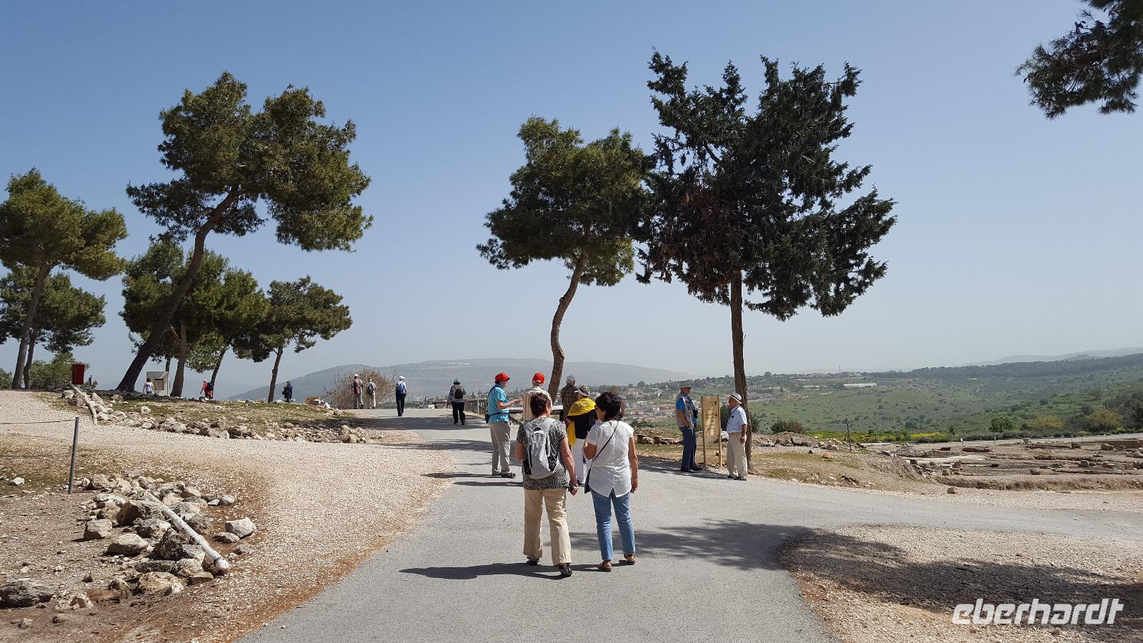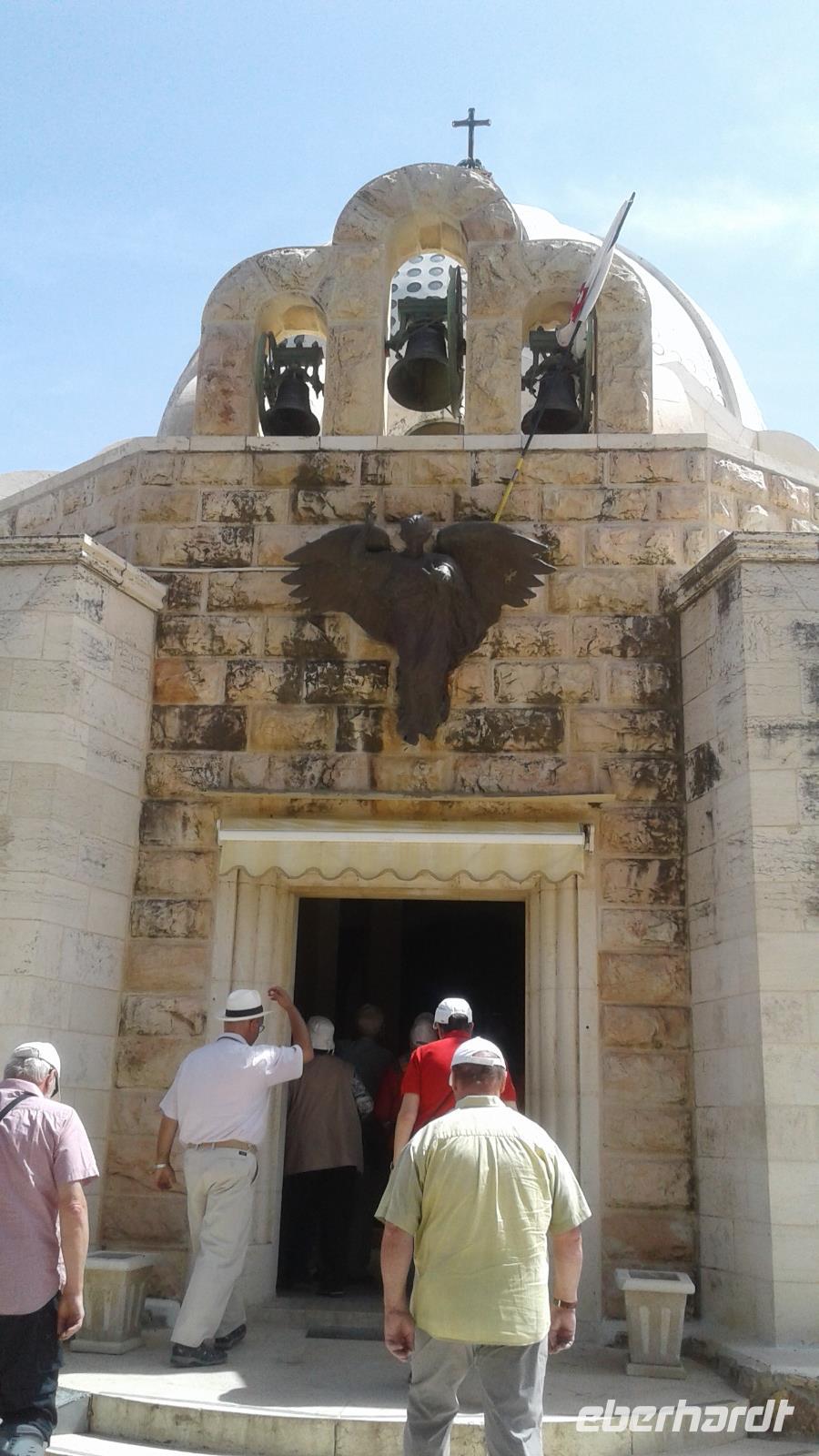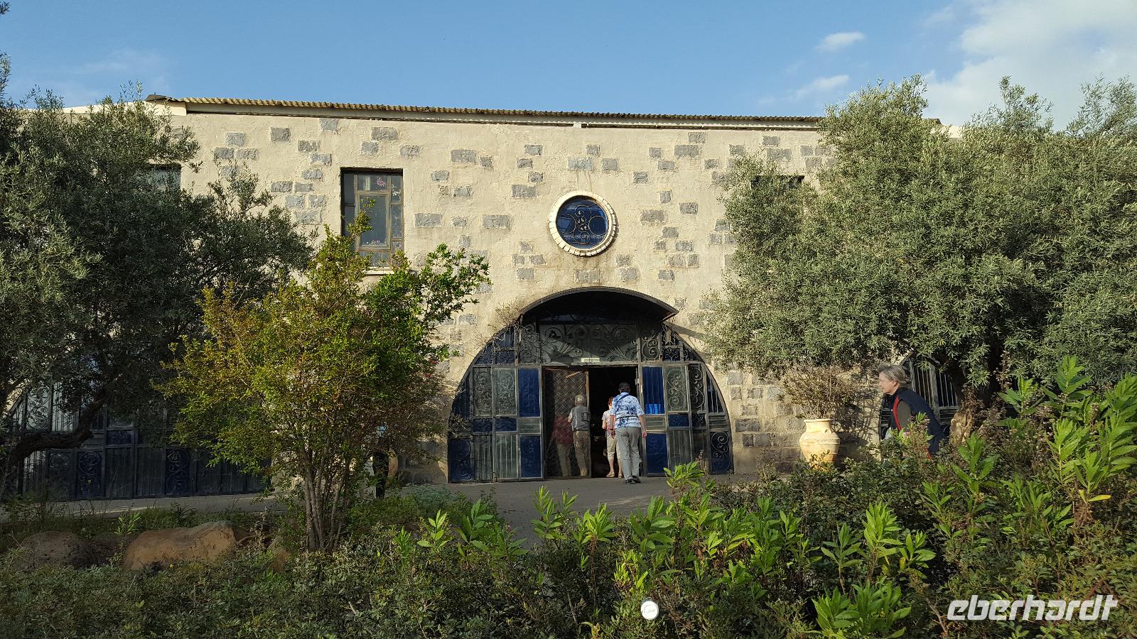 Auch heute heißt es wieder: zeitig los, 8 Uhr geht es los, an Mango- und Bananenfeldern, Dattelpalmen und Olivenhainen vorbei zum Berg der Seligpreisungen. Wir lauschen den Seligpreisungen der Bergpredigt und besuchen die Kirche der Seligpreisungen. Diese wurde 1937 aus schwarzem Basalt und weißem Kalkstein fertiggestellt und ist von Antonio Barluzzi, einem Mönch und Architekten, entworfen worden. Er hat einen achteckigen Grundriss gewählt- für die 8 Seligpreisungen. Der üppige Garten wird vom angegliederten Kloster betreut. Immer wieder trifft man auf Mosaike und Gestaltungen, die an die biblische Geschichte erinnern, die Speisung der 5000 mit 5 Broten und 2 Fischen zum Beispiel. Dem widmet sich auch die Deutsche Brotvermehrungskirche vom deutschen Verein vom heiligen Lande, die wir im Anschluss besuchen. Dann wartet ein echtes Highlight auf uns: eine Bootsfahrt auf dem See Genezareth. Mit dem sogenannten Jesus-Boot fahren wir hinaus auf den See, der mit mehr als 200 Metern unter dem Meeresspiegel der tiefstgelegene Süßwassersee der Welt ist. Er wird auch Harfensee genannt, weil seine Form an eine Harfe erinnert. Jeder Gast erhält am Ende der Reise ein Zertifikat für diesen Ausflug mit dem Jesus-Boot und Gabi singt mit uns eines seiner Lieblingslieder: „Hevenu Schalom Alejchem"- Frieden für die ganze Welt. In Tabgha besuchen wir dann die Primatskapelle, auch Mensa Christi (Tisch Christi) genannt. Nicht nur die üppig geschnitzte Eingangstür beeindruckt uns. Es ist wieder Zeit für eine innere Einkehr im Garten und dann geht es weiter nach Kapernaum- auch Kafarnaum genannt. Die Stadt Jesu wird sie genannt und die Ausgrabungen zeugen vom damaligen Leben. Unter der Kirche, die 2007 erbaut wurde und von Gabi liebevoll „Ufo" tituliert wird, befindet sich das Haus von Petrus. Ein Glasboden läßt den Blick darauf frei. Beim Spaziergang findet man auch Überreste einer antiken Synagoge. Zahlreiche jüdische Symbole vom Davidstern bis zur Menora sind hier eingearbeitet. Im St.-Peter-Restaurant schließlich lassen wir uns den St.-Peter-Fisch schmecken. Wahlweise im Ganzen oder als Filet kommt dieser Tilapia, ein Buntbarsch, auf den Teller. Er soll nur hier im See Genezareth vorkommen. Angesichts der vielen Gäste hier machen wir uns schon ein wenig Sorgen um den Bestand ;-)) Seinen Namen verdankt der Fisch einer Bibelgeschichte: Um die Tempelsteuer zahlen zu können sagte Jesus zu Petrus, er solle seine Angel hier auswerfen. Tatsächlich hatte der Fisch dann ein Vier-Drachmen-Stück im Maul- genau den Betrag, den beide für die Tempelsteuer benötigten. So gestärkt fahren wir hinauf Richtung Golan-Höhen. Banyas ist unser Ziel- ein Quellfluss des Jordan. Israel hat dieses Gebiet im sogenannten Sechs-Tage-Krieg 1967 erobert, das ist bis heute nicht unumstritten. Wir sind trotzdem tief beeindruckt von der Schönheit dieses Gebietes. Kein kleines Rinnsal sondern eine mächtige Quelle entspringt hier am Fuße der Felswand. Ein obligatorisches Gruppenfoto entsteht und dann fahren wir wieder zurück nach Süden. Ein letzter Stopp für heute führt uns nach Qazrin oder auch Katzrin. Diese Stadt wurde erst 1977 gegründet und ist der israelische Verwaltungssitz des Golanbezirkes. Unser Ziel aber ist das Besucher-Zentrum der Golan Olive Oil Mill, einer Oliven- Ölmühle, die weit mehr bietet. Sie hat ein Verfahren entwickelt, wie der anfallende und umweltschädliche Treber bei der Ölgewinnung umgewandelt und für Kosmetik verwendet werden kann. Wir folgen der interessanten Führung und probieren alles gleich selber aus. Neben der ansässigen Weinkellerei entdecken wir auch eine Brauerei, die können wir heute zwar nicht mehr besichtigen, aber der Showroom ist noch offen und wir bekommen Infos zu den regionalen Bieren, ihrer Brauart und natürlich auch einige Exemplare zu kaufen. Dann können wir auf der Rückfahrt zum Kibbutz entspannen, Das gemeinsame Abendessen ist lecker und wie immer üppig und dann kämpft jeder wie gehabt mit den Einsätzen der Geschirrspülmaschine...