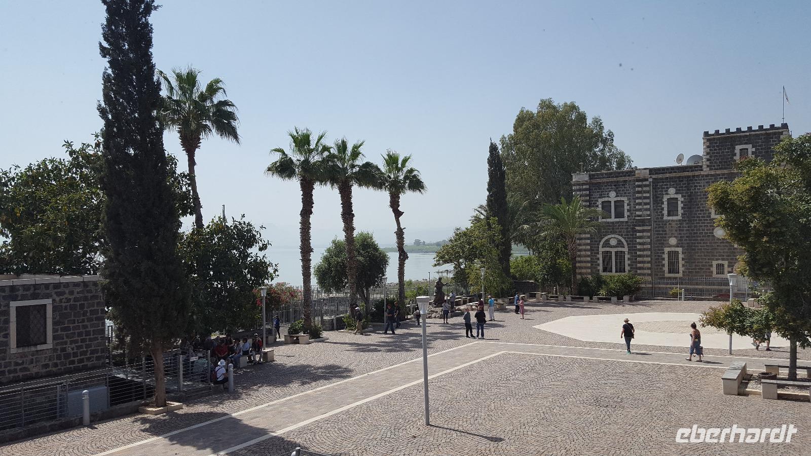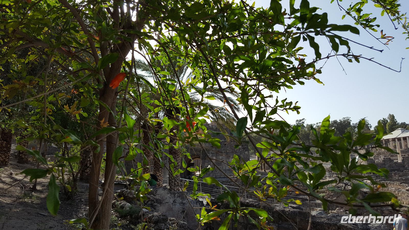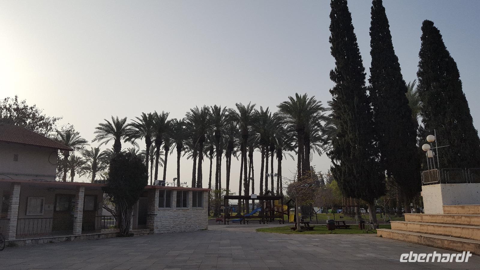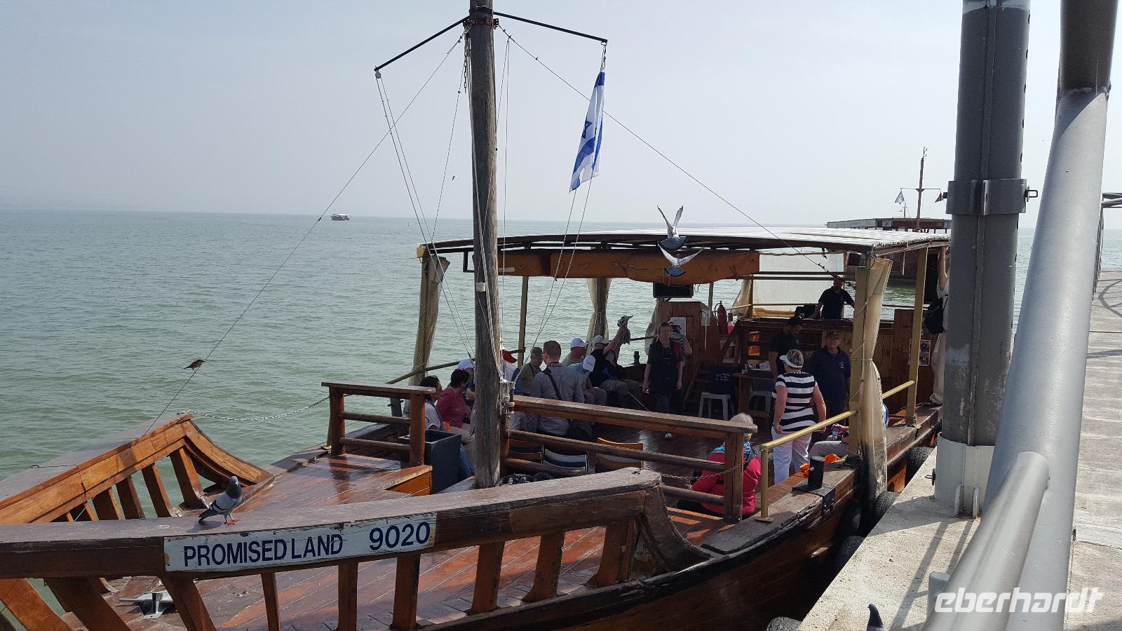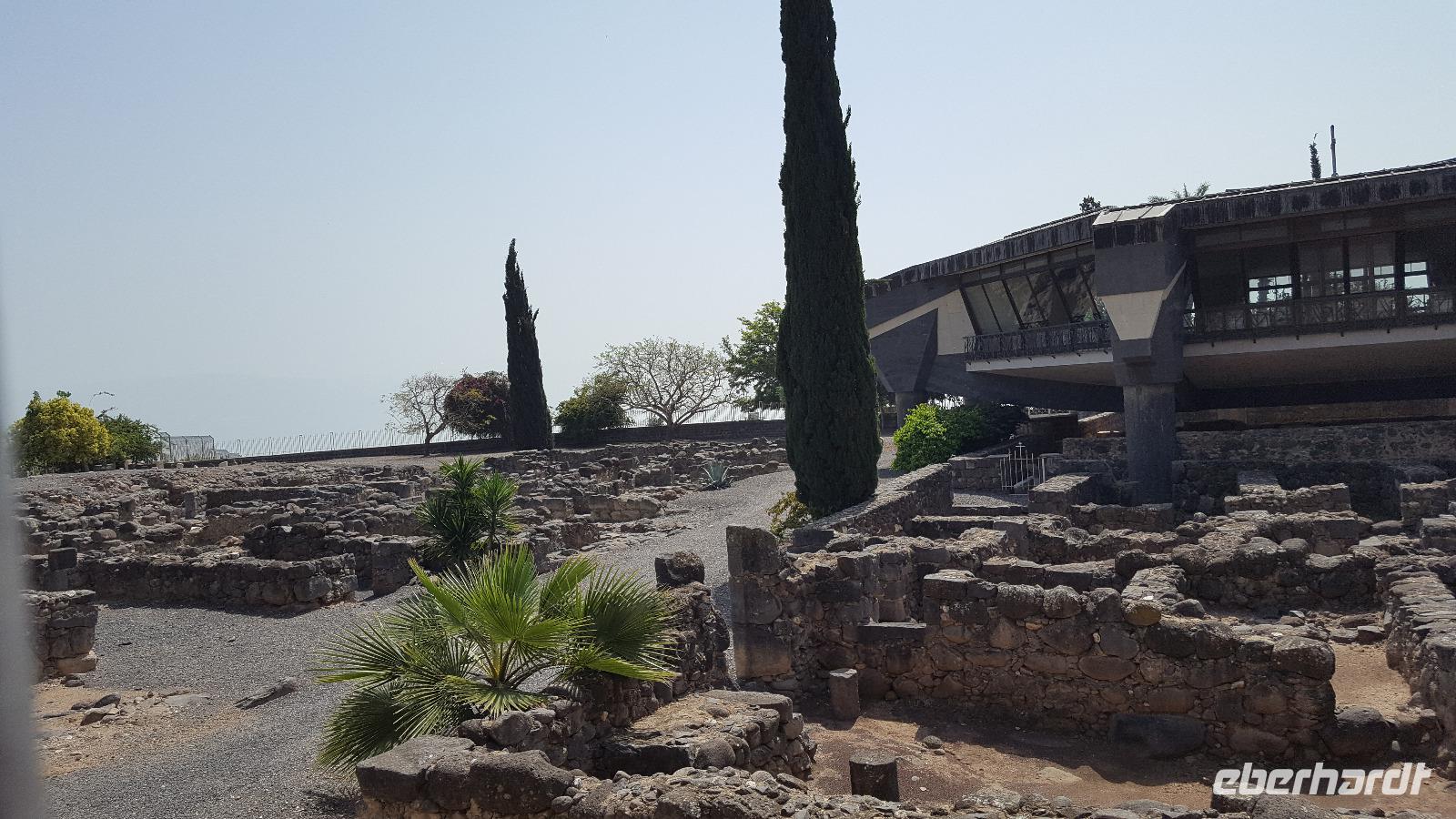 Auch heute heißt es wieder: zeitig los, 8 Uhr geht es los, an Mango- und Bananenfeldern, Dattelpalmen und Olivenhainen vorbei zum Berg der Seligpreisungen. Wir lauschen den Seligpreisungen der Bergpredigt und besuchen die Kirche der Seligpreisungen. Diese wurde 1937 aus schwarzem Basalt und weißem Kalkstein fertiggestellt und ist von Antonio Barluzzi, einem Mönch und Architekten, entworfen worden. Er hat einen achteckigen Grundriss gewählt- für die 8 Seligpreisungen. Der üppige Garten wird vom angegliederten Kloster betreut. Immer wieder trifft man auf Mosaike und Gestaltungen, die an die biblische Geschichte erinnern, die Speisung der 5000 mit 5 Broten und 2 Fischen zum Beispiel. Dem widmet sich auch die Deutsche Brotvermehrungskirche vom deutschen Verein vom heiligen Lande, die wir im Anschluss besuchen. Dann wartet ein echtes Highlight auf uns: eine Bootsfahrt auf dem See Genezareth. Mit dem sogenannten Jesus-Boot fahren wir hinaus auf den See, der mit mehr als 200 Metern unter dem Meeresspiegel der tiefstgelegene Süßwassersee der Welt ist. Er wird auch Harfensee genannt, weil seine Form an eine Harfe erinnert. Jeder Gast erhält am Ende der Reise ein Zertifikat für diesen Ausflug mit dem Jesus-Boot und Gabi singt mit uns eines seiner Lieblingslieder: „Hevenu Schalom Alejchem"- Frieden für die ganze Welt. In Tabgha besuchen wir dann die Primatskapelle, auch Mensa Christi (Tisch Christi) genannt. Nicht nur die üppig geschnitzte Eingangstür beeindruckt uns. Es ist wieder Zeit für eine innere Einkehr im Garten und dann geht es weiter nach Kapernaum- auch Kafarnaum genannt. Die Stadt Jesu wird sie genannt und die Ausgrabungen zeugen vom damaligen Leben. Unter der Kirche, die 2007 erbaut wurde und von Gabi liebevoll „Ufo" tituliert wird, befindet sich das Haus von Petrus. Ein Glasboden läßt den Blick darauf frei. Beim Spaziergang findet man auch Überreste einer antiken Synagoge. Zahlreiche jüdische Symbole vom Davidstern bis zur Menora sind hier eingearbeitet. Im St.-Peter-Restaurant schließlich lassen wir uns den St.-Peter-Fisch schmecken. Wahlweise im Ganzen oder als Filet kommt dieser Tilapia, ein Buntbarsch, auf den Teller. Er soll nur hier im See Genezareth vorkommen. Angesichts der vielen Gäste hier machen wir uns schon ein wenig Sorgen um den Bestand ;-)) Seinen Namen verdankt der Fisch einer Bibelgeschichte: Um die Tempelsteuer zahlen zu können sagte Jesus zu Petrus, er solle seine Angel hier auswerfen. Tatsächlich hatte der Fisch dann ein Vier-Drachmen-Stück im Maul- genau den Betrag, den beide für die Tempelsteuer benötigten. So gestärkt fahren wir hinauf Richtung Golan-Höhen. Banyas ist unser Ziel- ein Quellfluss des Jordan. Israel hat dieses Gebiet im sogenannten Sechs-Tage-Krieg 1967 erobert, das ist bis heute nicht unumstritten. Wir sind trotzdem tief beeindruckt von der Schönheit dieses Gebietes. Kein kleines Rinnsal sondern eine mächtige Quelle entspringt hier am Fuße der Felswand. Ein obligatorisches Gruppenfoto entsteht und dann fahren wir wieder zurück nach Süden. Ein letzter Stopp für heute führt uns nach Qazrin oder auch Katzrin. Diese Stadt wurde erst 1977 gegründet und ist der israelische Verwaltungssitz des Golanbezirkes. Unser Ziel aber ist das Besucher-Zentrum der Golan Olive Oil Mill, einer Oliven- Ölmühle, die weit mehr bietet. Sie hat ein Verfahren entwickelt, wie der anfallende und umweltschädliche Treber bei der Ölgewinnung umgewandelt und für Kosmetik verwendet werden kann. Wir folgen der interessanten Führung und probieren alles gleich selber aus. Neben der ansässigen Weinkellerei entdecken wir auch eine Brauerei, die können wir heute zwar nicht mehr besichtigen, aber der Showroom ist noch offen und wir bekommen Infos zu den regionalen Bieren, ihrer Brauart und natürlich auch einige Exemplare zu kaufen. Dann können wir auf der Rückfahrt zum Kibbutz entspannen, Das gemeinsame Abendessen ist lecker und wie immer üppig und dann kämpft jeder wie gehabt mit den Einsätzen der Geschirrspülmaschine...