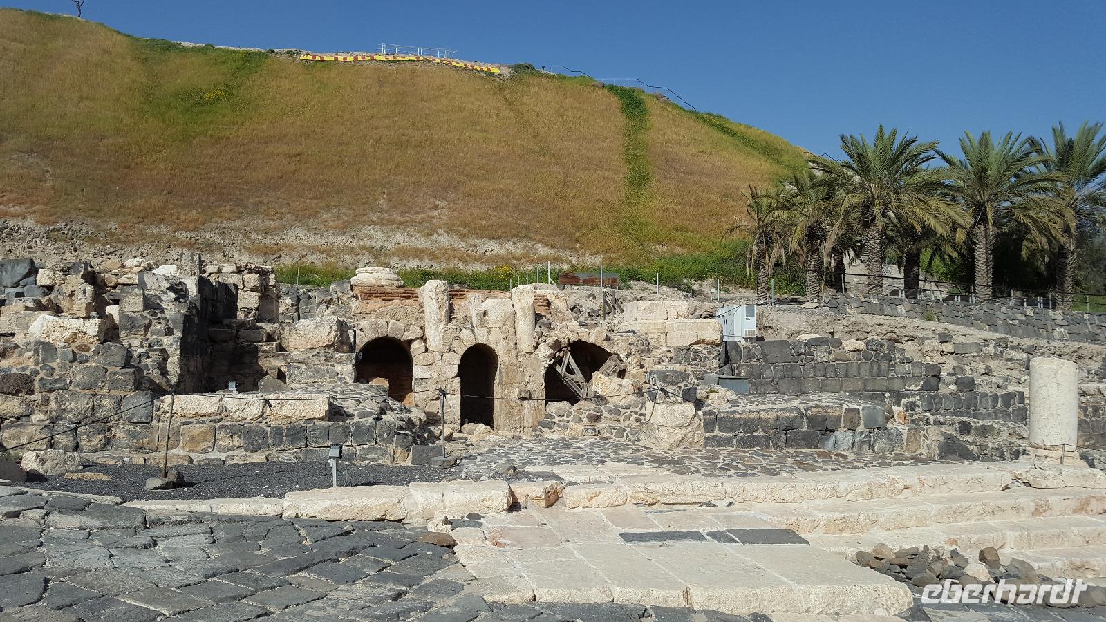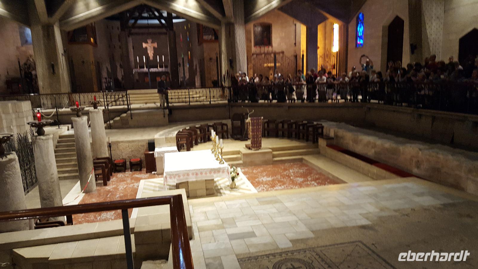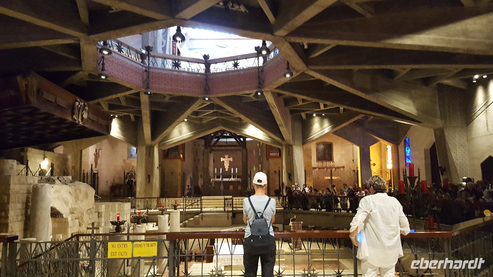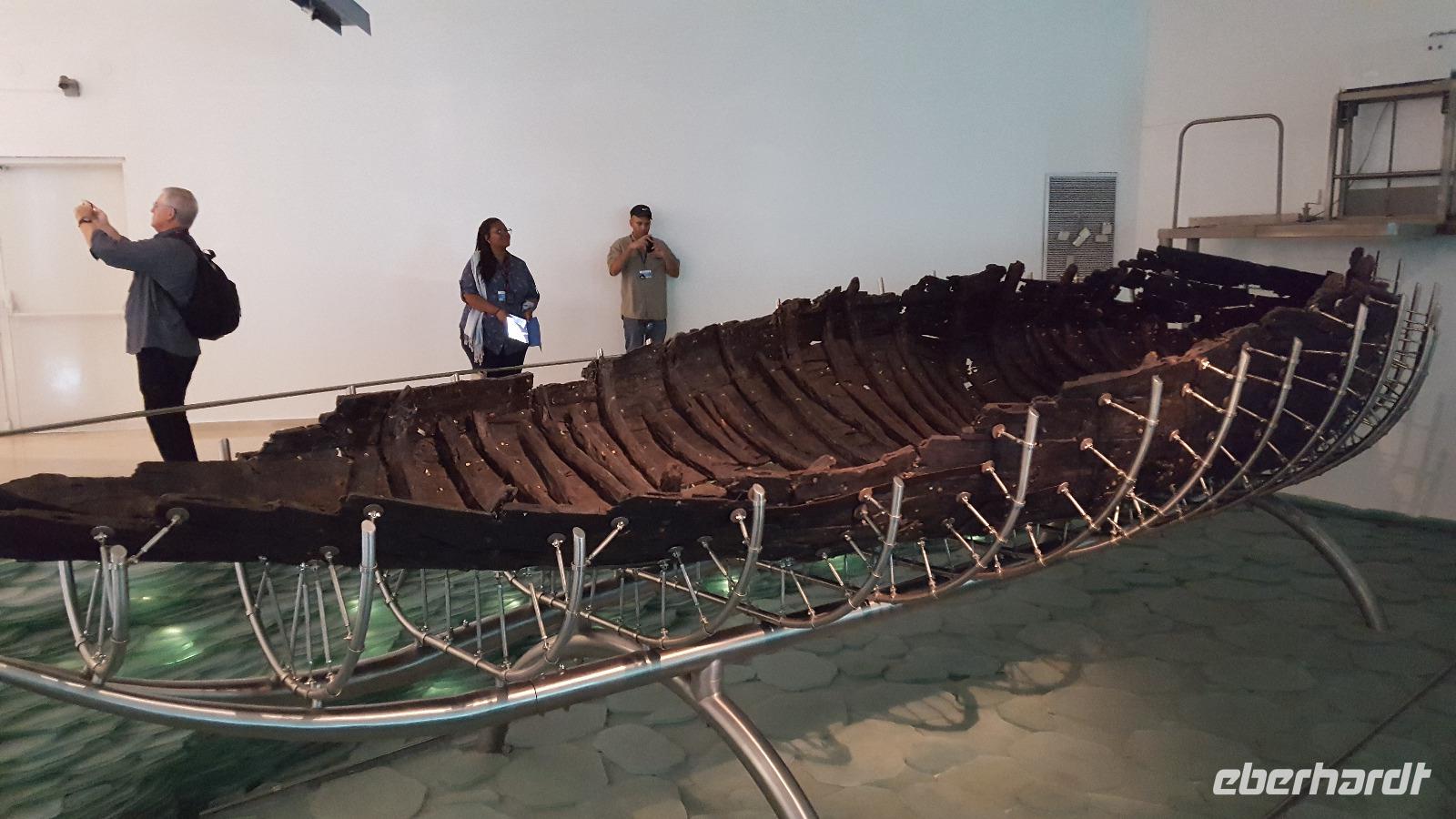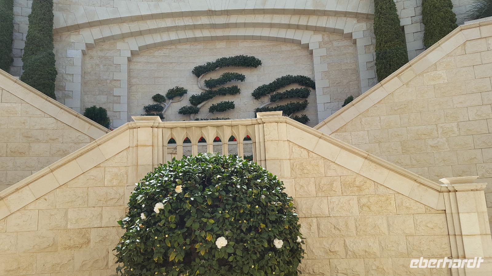 Auch heute heißt es wieder: zeitig los, 8 Uhr geht es los, an Mango- und Bananenfeldern, Dattelpalmen und Olivenhainen vorbei zum Berg der Seligpreisungen. Wir lauschen den Seligpreisungen der Bergpredigt und besuchen die Kirche der Seligpreisungen. Diese wurde 1937 aus schwarzem Basalt und weißem Kalkstein fertiggestellt und ist von Antonio Barluzzi, einem Mönch und Architekten, entworfen worden. Er hat einen achteckigen Grundriss gewählt- für die 8 Seligpreisungen. Der üppige Garten wird vom angegliederten Kloster betreut. Immer wieder trifft man auf Mosaike und Gestaltungen, die an die biblische Geschichte erinnern, die Speisung der 5000 mit 5 Broten und 2 Fischen zum Beispiel. Dem widmet sich auch die Deutsche Brotvermehrungskirche vom deutschen Verein vom heiligen Lande, die wir im Anschluss besuchen. Dann wartet ein echtes Highlight auf uns: eine Bootsfahrt auf dem See Genezareth. Mit dem sogenannten Jesus-Boot fahren wir hinaus auf den See, der mit mehr als 200 Metern unter dem Meeresspiegel der tiefstgelegene Süßwassersee der Welt ist. Er wird auch Harfensee genannt, weil seine Form an eine Harfe erinnert. Jeder Gast erhält am Ende der Reise ein Zertifikat für diesen Ausflug mit dem Jesus-Boot und Gabi singt mit uns eines seiner Lieblingslieder: „Hevenu Schalom Alejchem"- Frieden für die ganze Welt. In Tabgha besuchen wir dann die Primatskapelle, auch Mensa Christi (Tisch Christi) genannt. Nicht nur die üppig geschnitzte Eingangstür beeindruckt uns. Es ist wieder Zeit für eine innere Einkehr im Garten und dann geht es weiter nach Kapernaum- auch Kafarnaum genannt. Die Stadt Jesu wird sie genannt und die Ausgrabungen zeugen vom damaligen Leben. Unter der Kirche, die 2007 erbaut wurde und von Gabi liebevoll „Ufo" tituliert wird, befindet sich das Haus von Petrus. Ein Glasboden läßt den Blick darauf frei. Beim Spaziergang findet man auch Überreste einer antiken Synagoge. Zahlreiche jüdische Symbole vom Davidstern bis zur Menora sind hier eingearbeitet. Im St.-Peter-Restaurant schließlich lassen wir uns den St.-Peter-Fisch schmecken. Wahlweise im Ganzen oder als Filet kommt dieser Tilapia, ein Buntbarsch, auf den Teller. Er soll nur hier im See Genezareth vorkommen. Angesichts der vielen Gäste hier machen wir uns schon ein wenig Sorgen um den Bestand ;-)) Seinen Namen verdankt der Fisch einer Bibelgeschichte: Um die Tempelsteuer zahlen zu können sagte Jesus zu Petrus, er solle seine Angel hier auswerfen. Tatsächlich hatte der Fisch dann ein Vier-Drachmen-Stück im Maul- genau den Betrag, den beide für die Tempelsteuer benötigten. So gestärkt fahren wir hinauf Richtung Golan-Höhen. Banyas ist unser Ziel- ein Quellfluss des Jordan. Israel hat dieses Gebiet im sogenannten Sechs-Tage-Krieg 1967 erobert, das ist bis heute nicht unumstritten. Wir sind trotzdem tief beeindruckt von der Schönheit dieses Gebietes. Kein kleines Rinnsal sondern eine mächtige Quelle entspringt hier am Fuße der Felswand. Ein obligatorisches Gruppenfoto entsteht und dann fahren wir wieder zurück nach Süden. Ein letzter Stopp für heute führt uns nach Qazrin oder auch Katzrin. Diese Stadt wurde erst 1977 gegründet und ist der israelische Verwaltungssitz des Golanbezirkes. Unser Ziel aber ist das Besucher-Zentrum der Golan Olive Oil Mill, einer Oliven- Ölmühle, die weit mehr bietet. Sie hat ein Verfahren entwickelt, wie der anfallende und umweltschädliche Treber bei der Ölgewinnung umgewandelt und für Kosmetik verwendet werden kann. Wir folgen der interessanten Führung und probieren alles gleich selber aus. Neben der ansässigen Weinkellerei entdecken wir auch eine Brauerei, die können wir heute zwar nicht mehr besichtigen, aber der Showroom ist noch offen und wir bekommen Infos zu den regionalen Bieren, ihrer Brauart und natürlich auch einige Exemplare zu kaufen. Dann können wir auf der Rückfahrt zum Kibbutz entspannen, Das gemeinsame Abendessen ist lecker und wie immer üppig und dann kämpft jeder wie gehabt mit den Einsätzen der Geschirrspülmaschine...