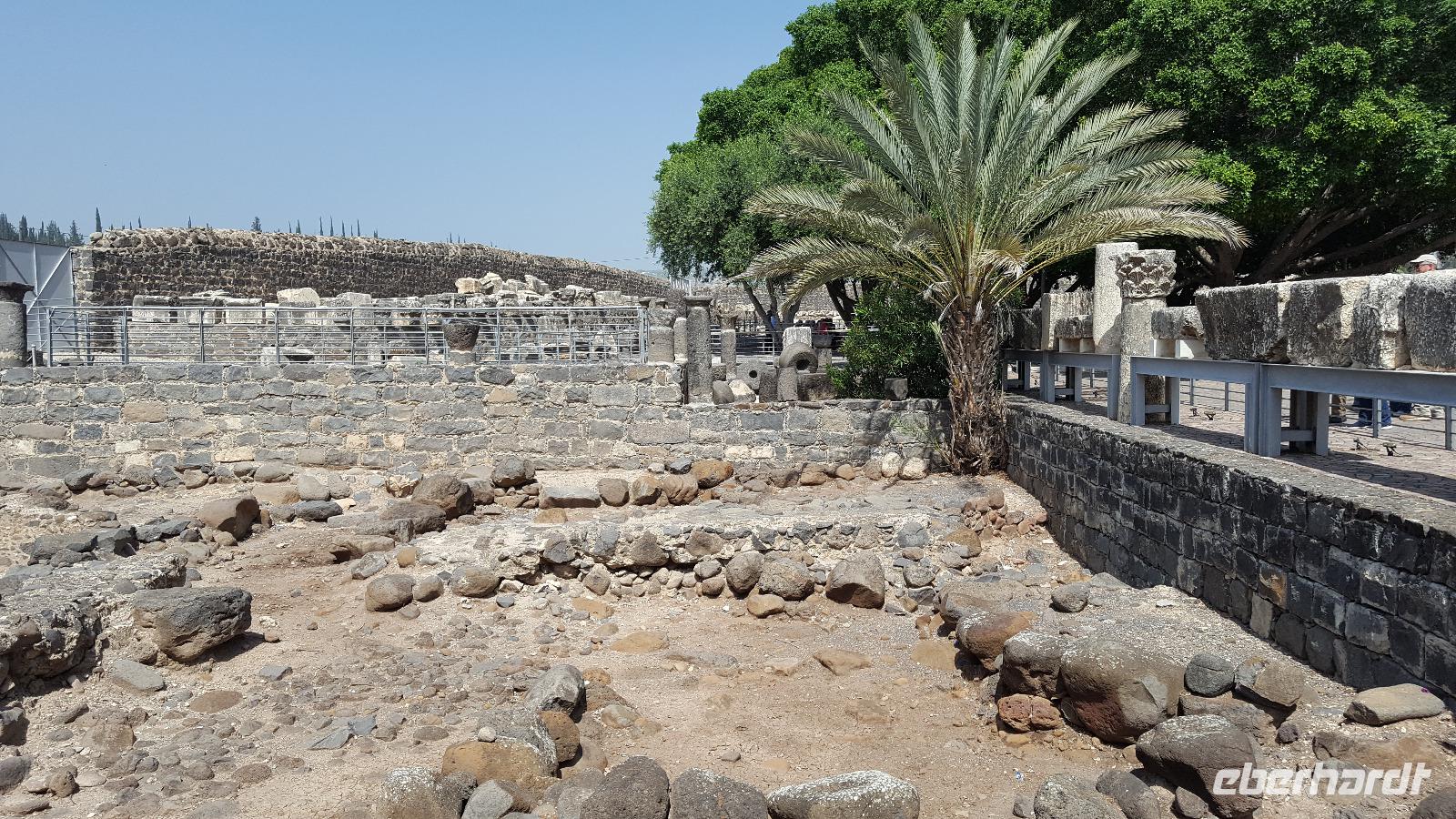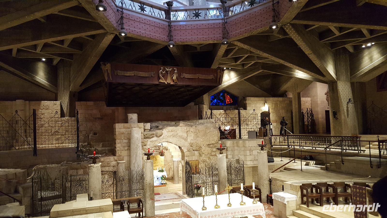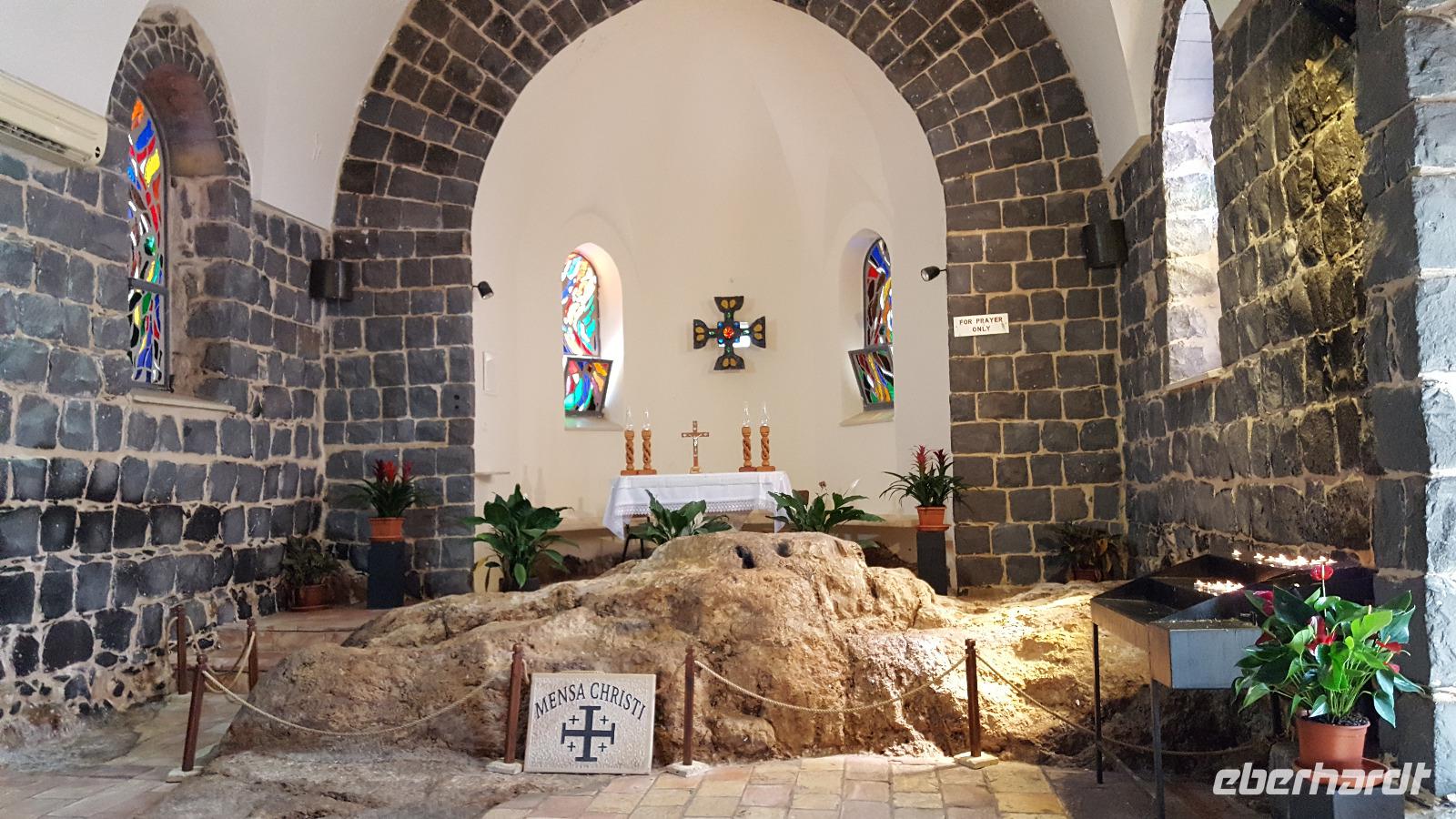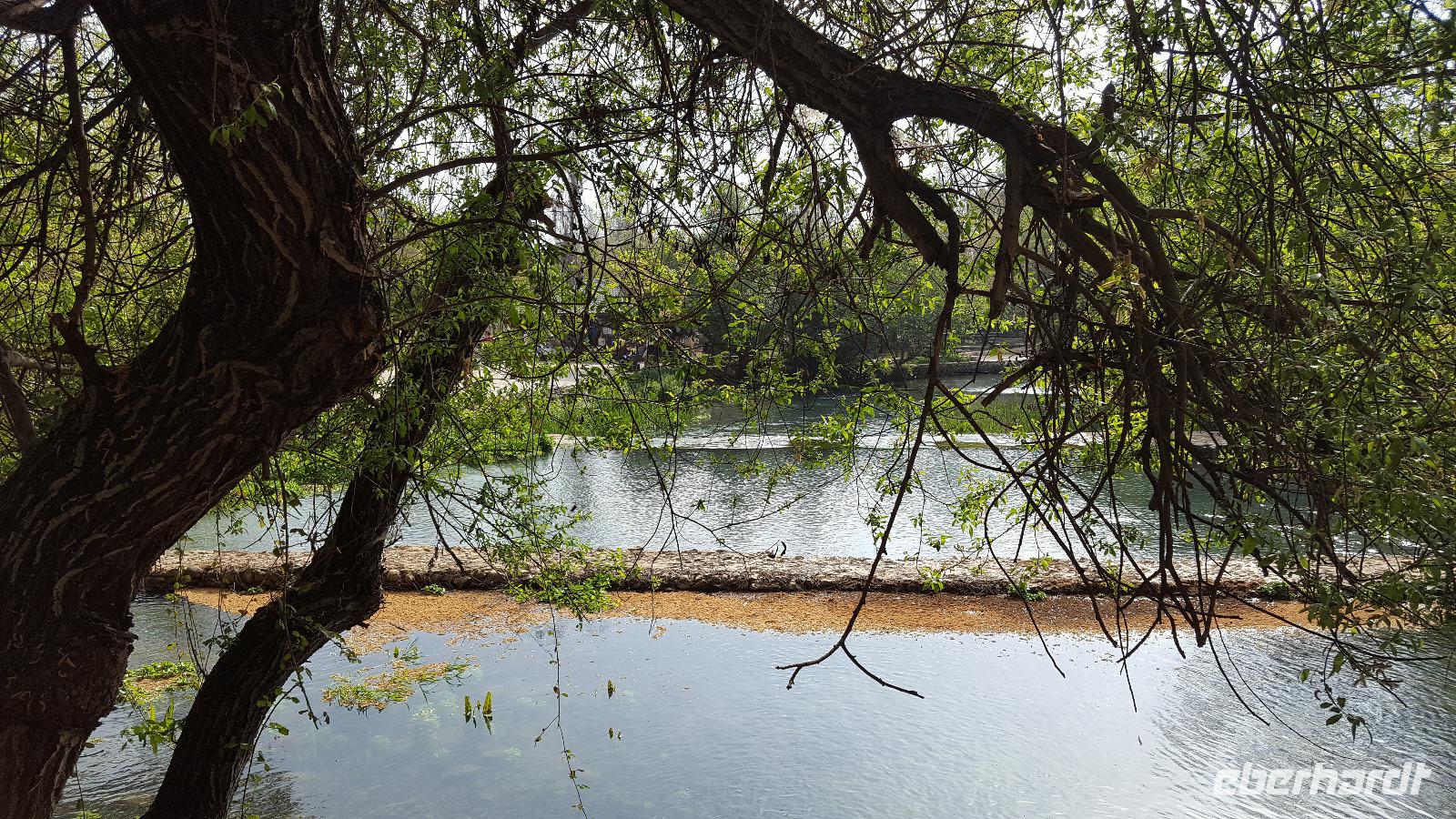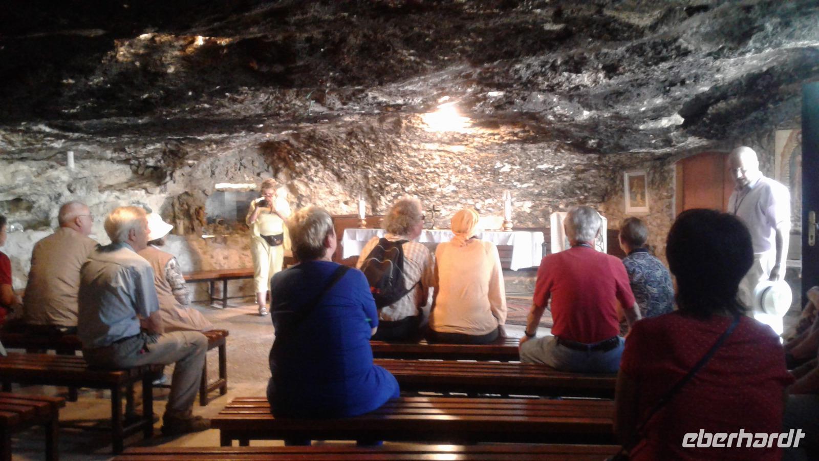 Auch heute heißt es wieder: zeitig los, 8 Uhr geht es los, an Mango- und Bananenfeldern, Dattelpalmen und Olivenhainen vorbei zum Berg der Seligpreisungen. Wir lauschen den Seligpreisungen der Bergpredigt und besuchen die Kirche der Seligpreisungen. Diese wurde 1937 aus schwarzem Basalt und weißem Kalkstein fertiggestellt und ist von Antonio Barluzzi, einem Mönch und Architekten, entworfen worden. Er hat einen achteckigen Grundriss gewählt- für die 8 Seligpreisungen. Der üppige Garten wird vom angegliederten Kloster betreut. Immer wieder trifft man auf Mosaike und Gestaltungen, die an die biblische Geschichte erinnern, die Speisung der 5000 mit 5 Broten und 2 Fischen zum Beispiel. Dem widmet sich auch die Deutsche Brotvermehrungskirche vom deutschen Verein vom heiligen Lande, die wir im Anschluss besuchen. Dann wartet ein echtes Highlight auf uns: eine Bootsfahrt auf dem See Genezareth. Mit dem sogenannten Jesus-Boot fahren wir hinaus auf den See, der mit mehr als 200 Metern unter dem Meeresspiegel der tiefstgelegene Süßwassersee der Welt ist. Er wird auch Harfensee genannt, weil seine Form an eine Harfe erinnert. Jeder Gast erhält am Ende der Reise ein Zertifikat für diesen Ausflug mit dem Jesus-Boot und Gabi singt mit uns eines seiner Lieblingslieder: „Hevenu Schalom Alejchem"- Frieden für die ganze Welt. In Tabgha besuchen wir dann die Primatskapelle, auch Mensa Christi (Tisch Christi) genannt. Nicht nur die üppig geschnitzte Eingangstür beeindruckt uns. Es ist wieder Zeit für eine innere Einkehr im Garten und dann geht es weiter nach Kapernaum- auch Kafarnaum genannt. Die Stadt Jesu wird sie genannt und die Ausgrabungen zeugen vom damaligen Leben. Unter der Kirche, die 2007 erbaut wurde und von Gabi liebevoll „Ufo" tituliert wird, befindet sich das Haus von Petrus. Ein Glasboden läßt den Blick darauf frei. Beim Spaziergang findet man auch Überreste einer antiken Synagoge. Zahlreiche jüdische Symbole vom Davidstern bis zur Menora sind hier eingearbeitet. Im St.-Peter-Restaurant schließlich lassen wir uns den St.-Peter-Fisch schmecken. Wahlweise im Ganzen oder als Filet kommt dieser Tilapia, ein Buntbarsch, auf den Teller. Er soll nur hier im See Genezareth vorkommen. Angesichts der vielen Gäste hier machen wir uns schon ein wenig Sorgen um den Bestand ;-)) Seinen Namen verdankt der Fisch einer Bibelgeschichte: Um die Tempelsteuer zahlen zu können sagte Jesus zu Petrus, er solle seine Angel hier auswerfen. Tatsächlich hatte der Fisch dann ein Vier-Drachmen-Stück im Maul- genau den Betrag, den beide für die Tempelsteuer benötigten. So gestärkt fahren wir hinauf Richtung Golan-Höhen. Banyas ist unser Ziel- ein Quellfluss des Jordan. Israel hat dieses Gebiet im sogenannten Sechs-Tage-Krieg 1967 erobert, das ist bis heute nicht unumstritten. Wir sind trotzdem tief beeindruckt von der Schönheit dieses Gebietes. Kein kleines Rinnsal sondern eine mächtige Quelle entspringt hier am Fuße der Felswand. Ein obligatorisches Gruppenfoto entsteht und dann fahren wir wieder zurück nach Süden. Ein letzter Stopp für heute führt uns nach Qazrin oder auch Katzrin. Diese Stadt wurde erst 1977 gegründet und ist der israelische Verwaltungssitz des Golanbezirkes. Unser Ziel aber ist das Besucher-Zentrum der Golan Olive Oil Mill, einer Oliven- Ölmühle, die weit mehr bietet. Sie hat ein Verfahren entwickelt, wie der anfallende und umweltschädliche Treber bei der Ölgewinnung umgewandelt und für Kosmetik verwendet werden kann. Wir folgen der interessanten Führung und probieren alles gleich selber aus. Neben der ansässigen Weinkellerei entdecken wir auch eine Brauerei, die können wir heute zwar nicht mehr besichtigen, aber der Showroom ist noch offen und wir bekommen Infos zu den regionalen Bieren, ihrer Brauart und natürlich auch einige Exemplare zu kaufen. Dann können wir auf der Rückfahrt zum Kibbutz entspannen, Das gemeinsame Abendessen ist lecker und wie immer üppig und dann kämpft jeder wie gehabt mit den Einsätzen der Geschirrspülmaschine...