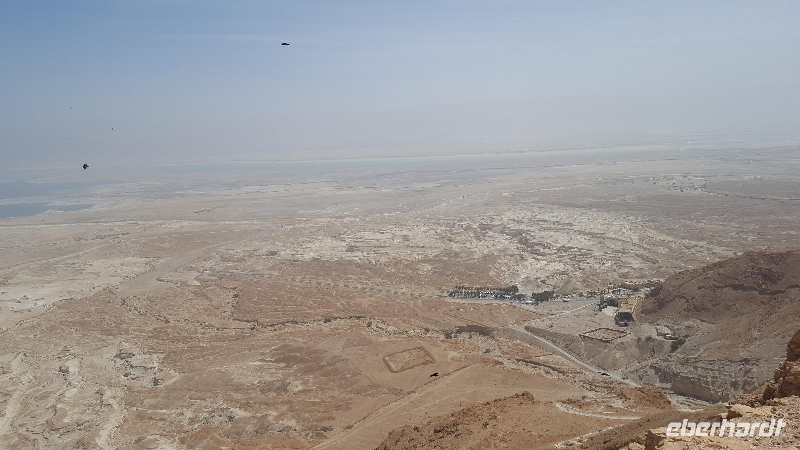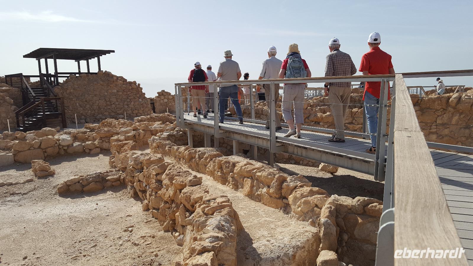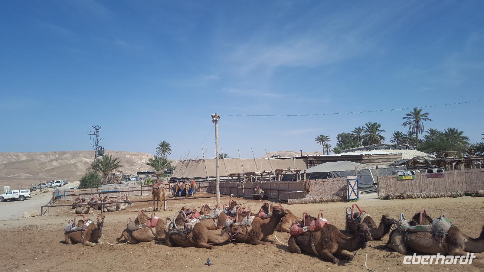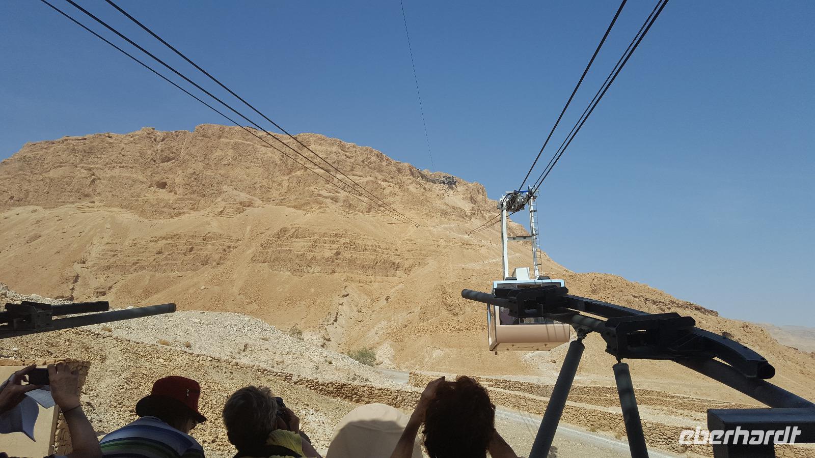 Heute fahren wir gegen 8 Uhr los- doch bereits jetzt zeigt das Thermometer beachtliche 26 ° C. Unser erstes Ziel Qumran liegt nur 10 Minuten entfernt. Im Besucherzentrum erläutert Gabi die Geschichte des Ortes, seiner Siedlung, der Höhlen und die Funde der Schriftrollen im Jahre 1947. Ein Film veranschaulicht das damalige Leben eindrucksvoll. Dann können wir die Ausgrabungen ansehen, die Zisterne, die Bäder- unheimlich wichtig damals für die rituellen Reinigungen, die Gemeinschaftsräume und auch die Bereiche, in denen Gärten bzw. Felder für den Anbau ihrer Lebensmittel vermutet werden. Natürlich können wir auch die Höhlen sehen, sie sind nummeriert und so heißt es heute, dass die Schriftrollen in Höhle Nr. 4 gefunden wurden- von einem Hirtenjungen. Wir freuen uns auf den Schatten unterm Sonnensegel, lauschen Gabis Erläuterungen und genießen den freien Blick über das Meer und die Ebenen. Dann geht unsere Fahrt weiter, immer am toten Meer entlang. Völlig unwirklich tauchen immer wieder grüne Oasen in der unwirtlichen Wüstenlandschaft auf, Gabi erzählt, mit welchem Aufwand es verbunden ist, hier das Salz aus der Erde zu waschen, um es fruchtbar zu machen und die Kulturen zu bewässern. Dann erreichen wir Massada. Hoch über dem Meer thront diese Festung, die seit 2001 auch zum Weltkulturerbe zählt. König Herodes nutzte die exponierte Lage und ließ hier seine Festung und seinen Palast erbauen. Im Besucherzentrum konnten wir einen Blick auf das Modell werfen, bevor wir mit der Seilbahn nach oben fuhren. Man kann auch den sogenannten Schlangenpfad nach oben laufen- aber bei mehr als 35 °C wollte sich dies niemand antun. Die Größe der Festung überraschte, ebenso dass schon die Räume der Kommandanten der Wache mit Fresken geschmückt waren. Wir konnten hinunter auf den Palast sehen, der in 3 Etagen in den Felsen gehauen war und man sah auch die Lager der römischen Belagerer und den Wall, den sie zur Belagerung der Festung ringsherum gebaut hatten. Bäder, Zisternen und Vorratsräume zeugten davon, dass die Menschen hier oben gut versorgt waren und keine Not litten. Sogar ein Schreiber sitzt gegenwärtig in der alten Schreibstube und kopiert Schriften bis ins kleinste Detail originalgetreu. Dann sahen wir sie: die römische Rampe. Die römischen Belagerer hatten eine Rampe den Felsen hinauf gebaut und waren im Begriff, die Mauern der Festung einzureißen. Derart ausweglos entschlossen sich die Juden zum Selbstmord. Am nächsten Tag fanden die Römer nur leblose Körper und verbrannte Vorräte. Ein beeindruckender Besuch! Eigentlich wollten wir die römische Rampe hinablaufen, aber wir entschlossen uns, doch die Seilbahn zu nehmen. Es war unerträglich heiß. Dann geht unsere Fahrt weiter Richtung Arad, immer am toten Meer entlang. Als wir Tamar erreichen sehen wir die ersten Beduinen mit ihren Herden. In einem Beduinendorf