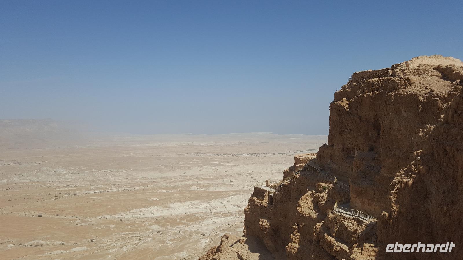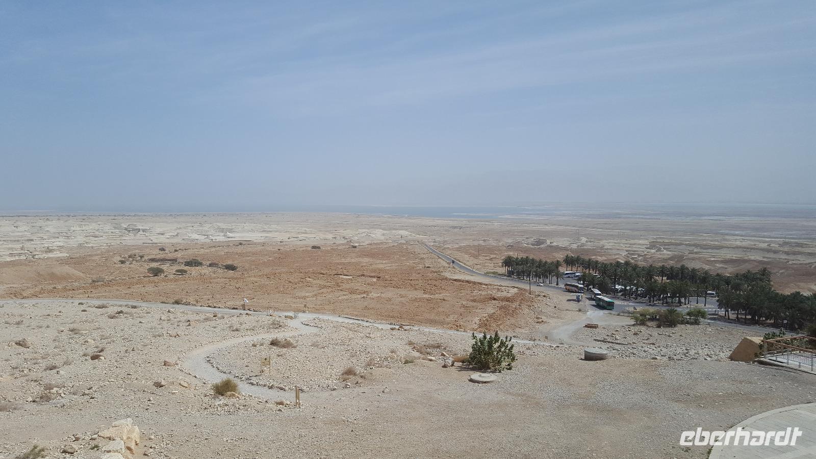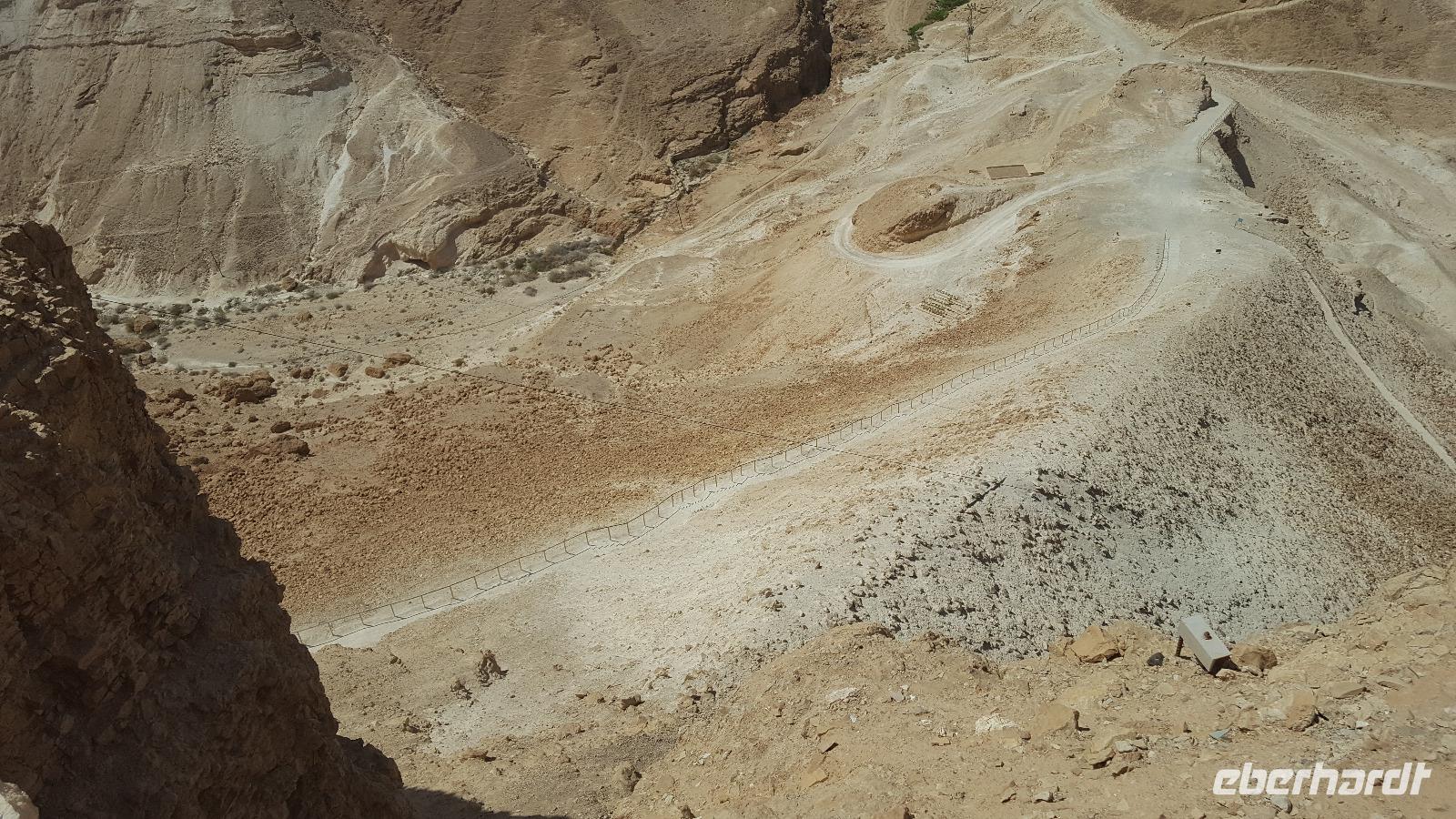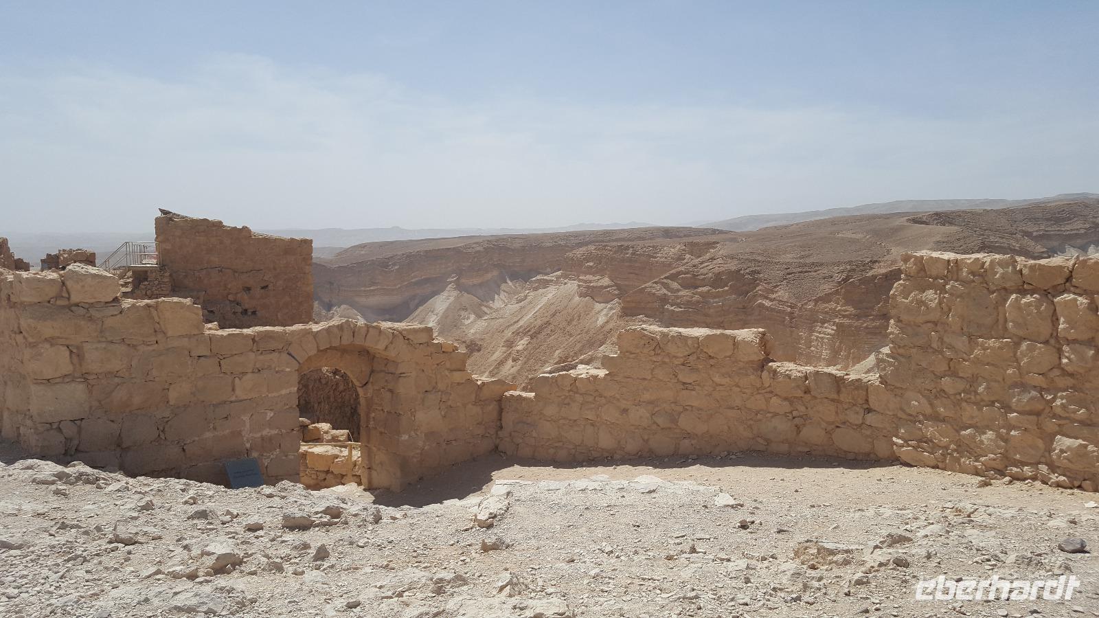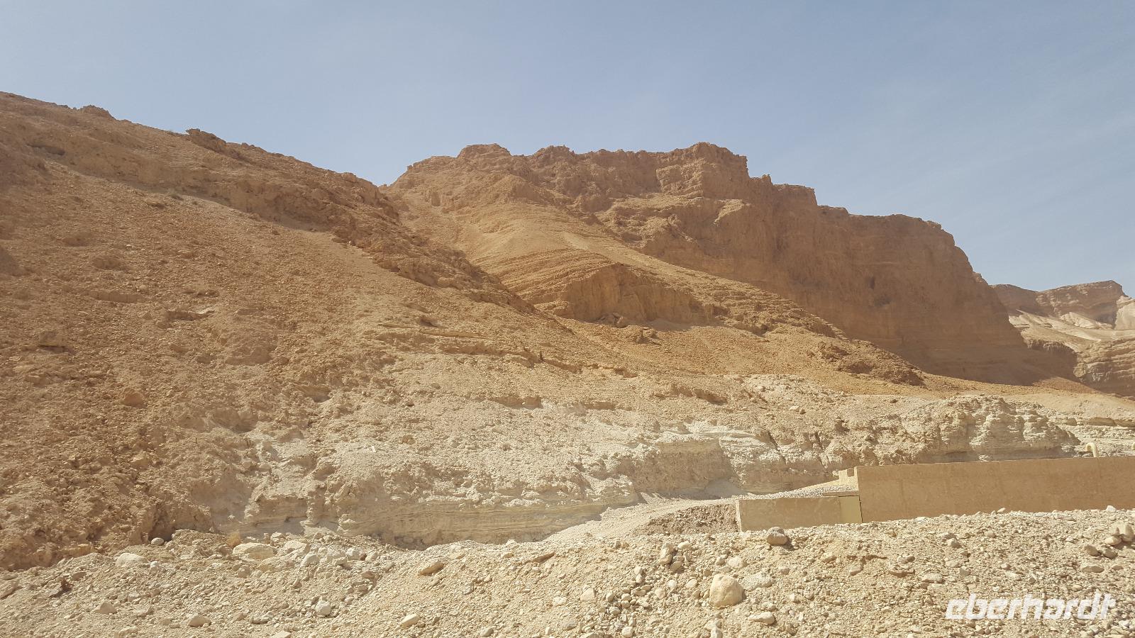 Heute fahren wir gegen 8 Uhr los- doch bereits jetzt zeigt das Thermometer beachtliche 26 ° C. Unser erstes Ziel Qumran liegt nur 10 Minuten entfernt. Im Besucherzentrum erläutert Gabi die Geschichte des Ortes, seiner Siedlung, der Höhlen und die Funde der Schriftrollen im Jahre 1947. Ein Film veranschaulicht das damalige Leben eindrucksvoll. Dann können wir die Ausgrabungen ansehen, die Zisterne, die Bäder- unheimlich wichtig damals für die rituellen Reinigungen, die Gemeinschaftsräume und auch die Bereiche, in denen Gärten bzw. Felder für den Anbau ihrer Lebensmittel vermutet werden. Natürlich können wir auch die Höhlen sehen, sie sind nummeriert und so heißt es heute, dass die Schriftrollen in Höhle Nr. 4 gefunden wurden- von einem Hirtenjungen. Wir freuen uns auf den Schatten unterm Sonnensegel, lauschen Gabis Erläuterungen und genießen den freien Blick über das Meer und die Ebenen. Dann geht unsere Fahrt weiter, immer am toten Meer entlang. Völlig unwirklich tauchen immer wieder grüne Oasen in der unwirtlichen Wüstenlandschaft auf, Gabi erzählt, mit welchem Aufwand es verbunden ist, hier das Salz aus der Erde zu waschen, um es fruchtbar zu machen und die Kulturen zu bewässern. Dann erreichen wir Massada. Hoch über dem Meer thront diese Festung, die seit 2001 auch zum Weltkulturerbe zählt. König Herodes nutzte die exponierte Lage und ließ hier seine Festung und seinen Palast erbauen. Im Besucherzentrum konnten wir einen Blick auf das Modell werfen, bevor wir mit der Seilbahn nach oben fuhren. Man kann auch den sogenannten Schlangenpfad nach oben laufen- aber bei mehr als 35 °C wollte sich dies niemand antun. Die Größe der Festung überraschte, ebenso dass schon die Räume der Kommandanten der Wache mit Fresken geschmückt waren. Wir konnten hinunter auf den Palast sehen, der in 3 Etagen in den Felsen gehauen war und man sah auch die Lager der römischen Belagerer und den Wall, den sie zur Belagerung der Festung ringsherum gebaut hatten. Bäder, Zisternen und Vorratsräume zeugten davon, dass die Menschen hier oben gut versorgt waren und keine Not litten. Sogar ein Schreiber sitzt gegenwärtig in der alten Schreibstube und kopiert Schriften bis ins kleinste Detail originalgetreu. Dann sahen wir sie: die römische Rampe. Die römischen Belagerer hatten eine Rampe den Felsen hinauf gebaut und waren im Begriff, die Mauern der Festung einzureißen. Derart ausweglos entschlossen sich die Juden zum Selbstmord. Am nächsten Tag fanden die Römer nur leblose Körper und verbrannte Vorräte. Ein beeindruckender Besuch! Eigentlich wollten wir die römische Rampe hinablaufen, aber wir entschlossen uns, doch die Seilbahn zu nehmen. Es war unerträglich heiß. Dann geht unsere Fahrt weiter Richtung Arad, immer am toten Meer entlang. Als wir Tamar erreichen sehen wir die ersten Beduinen mit ihren Herden. In einem Beduinendorf
