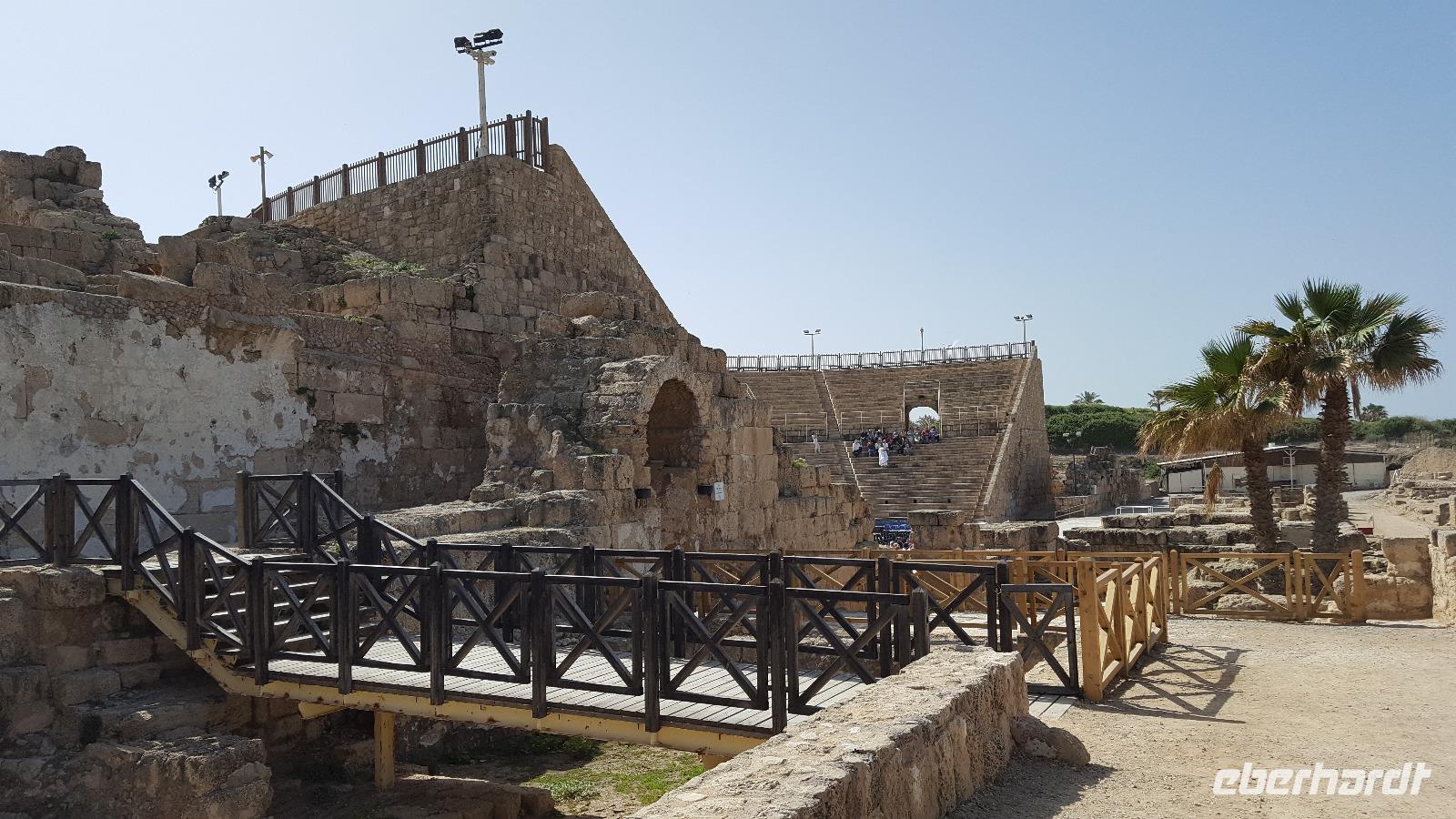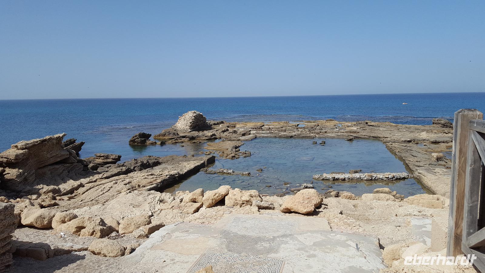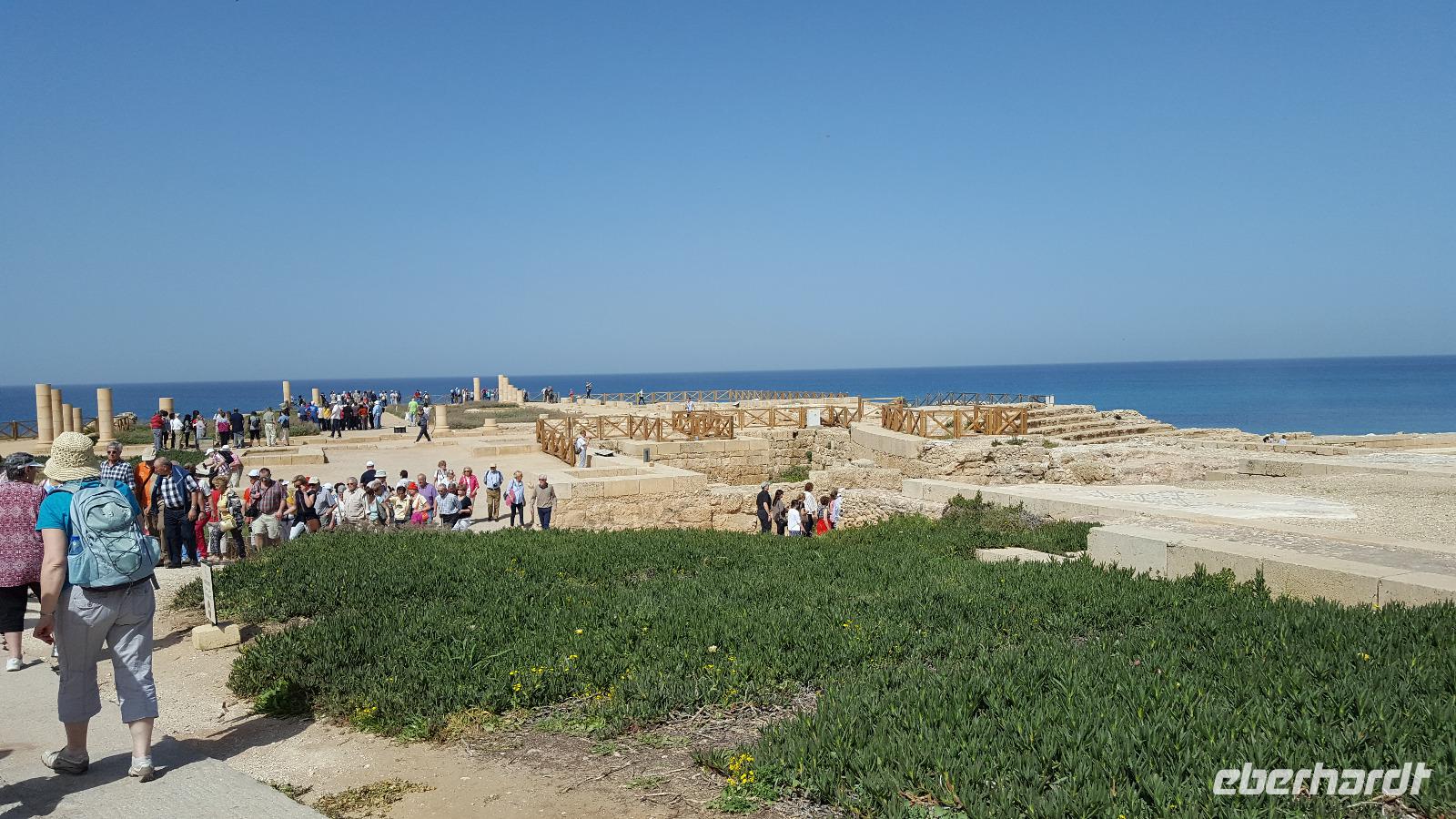 Ein langer Tag liegt vor uns und so heißt es bereits 6 Uhr aufstehen und 6:30 Uhr Frühstück. Das Buffett war mehr als reichlich und einige trauten sich auch an Schakschuka, pochierten Eiern auf einer Zwiebel-Tomaten-Soße. Um 7:45 Uhr hieß es dann Koffer einladen und Abfahrt. Wir verabschieden uns von Tel Aviv, mit seinen fast 600.000 Einwohnern die zweitgrößte Stadt Israels, mit einer kleinen Stadtrundfahrt, sehen die sogenannte weiße Stadt, die an den Bauhausstil erinnert und heute Weltkulturerbe ist. Den Rothschild Boulevard entlang und am Ytzak Rabin Platz vorbei brechen wir auf Richtung Cäsarea. Diese Stadt wurde bereits zu römischen Zeiten gegründet und erhielt ihren Namen zu Ehren der römischen Könige. Sie geht auf Herodes zurück, der hier ein prächtiges Theater, ein Hippodrom, große Bäderanlagen, Geschäfte und auch einen künstlichen Hafen anlegen ließ. Letzterer war mit seinen zwei Wellenbrechern einer der bedeutendsten Hafenanlagen seiner Zeit. Großartige Ausgrabungsarbeiten ließen die Zeit von damals lebendig werden. Gabi überraschte uns immer wieder mit facettenreichen Details, etwa dem Süßwasser-Schwimmbecken im Meer im Palast des Herodes. Interessant auch der Besuch der kleinen Kapelle am Ausgang, Kapitelle und Spitzbögen erinnern an den gotischen Baustil, aber lange vor seiner Ausführung in Europa. Vermutlich haben Kreuzfahrer hier diesen Baustil gelernt und mitgebracht. Unsere Fahrt geht weiter Richtung Haifa, doch bei Chadera halten wir an dem riesigen Äquadukt. Die Römer verstanden es, Wasser in ihre Städte zu bringen. Direkt am Meer gelegen nutzen wir die Zeit für einen kleinen Strandspaziergang und jede Menge toller Fotos. Gegen Mittag kommen wir in Haifa an und erleben staunend die hängenden Gärten der Bahai. Gabi erzählt uns von den Bahai und ihrer Verfolgung, nichts desto trotz gibt es auch heute noch Hunderte Freiwillige, die diese Gärten selbstlos pflegen. Was für eine Oase der Ruhe und Schönheit! Nach den Fotos von den oberen Terrassen fahren wir durch die Stadt, sehen die Gärten und den Schrein nochmals von unten und erleben Haifa: die Gärten, die Prachtstraßen, das Templerviertel...Aber unsere Erkundungsfahrt ist noch nicht zu Ende, Akko wartet auf uns. Auch Akkos Altstadt ist Weltkulturerbe und dazu gehört die sogenannte Kreuzfahrerstadt. Diese unterirdische Stadt kann man heute besichtigen, mächtige Säulen halten die Gewölbe und Licht und Filmeinspielungen lassen das damalige Leben lebendig werden. Natürlich gehört auch ein Spaziergang durch die Altstadt mit ihren Befestigungsanlagen, den Festungsbauten und dem Hafen zu unserem Programm. Wir passieren die Al-Seituna-Moschee, den berühmten Glockenturm und natürlich ehemalige Karawansereien. Sagenhaft, was Gabi alles dazu erzählen kann. Dann geht unsere Fahrt weiter zu unserem Kibbutz in Degania Bet. Unterwegs müssen wir noch einmal anhalten. Bei Kinneret haben wir ein phantastisches Panorama der Landschaft unter uns, die Abendsonne taucht alles in goldenes Licht und wir genießen (und fotografieren). Dann empfängt uns unser Kibbutz, wir treffen uns zum Abendessen und mit einem Gläschen Wein stoßen wir auf die nächsten Tage an.