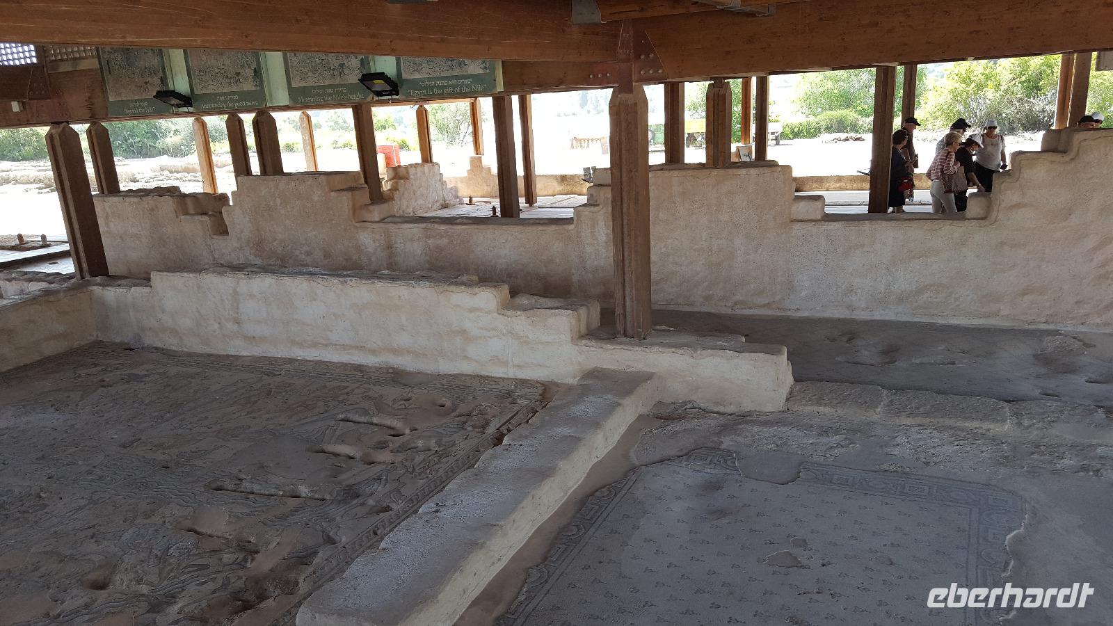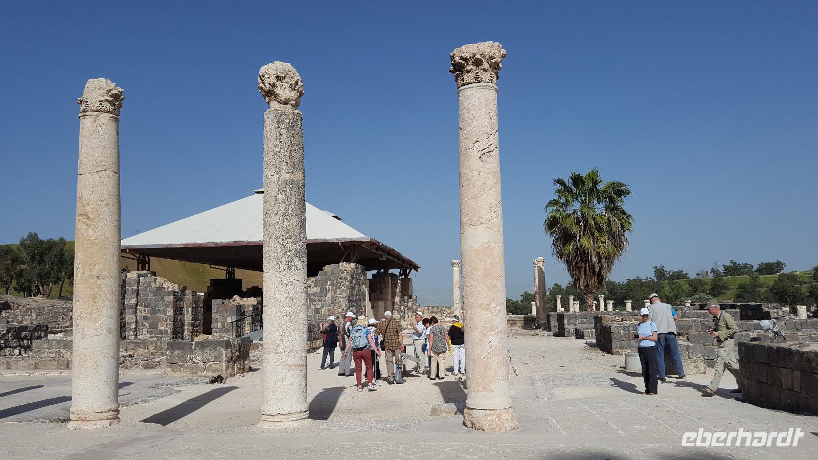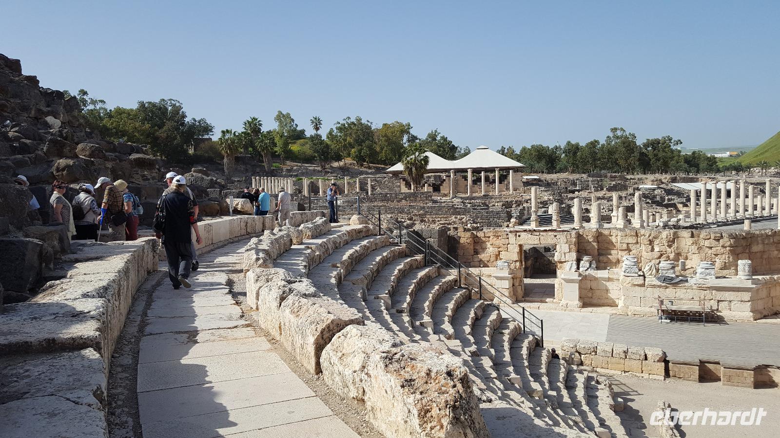 Wieder geht es heute zeitig los, um 8 Uhr sind die Koffer bereits im Bus verstaut und wir starten Richtung Zippori, auch Sepphoris genannt. Die „Zierde Galiläas" wird die Stadt genannt und die Ausgrabungen zeugen noch heute davon. Die Stadt musste komplette Zerstörung und Wiederaufbau in römischen Zeiten erleiden. Zu den berühmtesten Mosaiken zählen die „Mona Lisa von Galiläa", aber auch die Mosaiken im Haus des Nilfestes. Wir sehen die Zisternen, die Dyonysosvilla, das Theater, aber auch den Wachturmes aus Kreuzfahrerzeiten sehen wir, es wurde alles verbaut, was die Gegend hergab und so sieht man in der Ecke des Turmes einen verbauten Sarkophag... Ein besonderer Höhepunkt war der Besuch der Synagoge mit dem prächtigen Mosaikboden. Hier sahen wir einen Film über die Geschichte. Unser nächstes Ziel heute ist Nazareth und hier natürlich die Verkündigungskirche. Wir haben ein perfektes Timing: 12 Uhr beginnt die Messe, der wir beiwohnen können. Anschließend schauen wir uns die Marien-Mosaiken aus allen Ländern der Welt an, mittlerweile sind es so viele, dass sie auch außerhalb der Kirche im Rundgang angebracht sind. Ein Bild kommt uns sehr bekannt vor, die Sixtinische Madonna- hier gestiftet von britischen Pfadfindern, daher mit dem heiligen Georg und eben auch Pfadfindern. Im Restaurant „Casanova" stehen dann wieder regionale Speisen zur Auswahl, wir stärken uns mit Falafel oder Hähnchenfleisch im Pitabrot- hmm. Lecker. Weiter geht unsere Reise zum Bet She´an Nationalpark. Hier hat man die größte Römerstadt in Israel gefunden, Ausgrabungen von gigantischen Ausmaßen lassen vermuten, dass hier einmal bis zu 50.000 Menschen lebten. Viele Gebäude sind sehr gut erhalten, man geht davon aus, dass die Stadt von einem Erdbeben um 750 verschüttet wurde und nicht wiederaufgebaut wurde. Wir sind beeindruckt vom riesigen Theater, Gabi erläutert uns die Badehäuser mit ihren beheizten Becken, Böden und Wänden. Wir könnten noch stundenlang durch die Anlagen laufen, aber die Hitze fordert ihren Tribut und wir sind froh, wieder in den kühlen Bus einsteigen zu können und zum Kibbutz zu fahren. Unterwegs dann immer wieder Zäune und Grenzanlagen und Gabi erzählt von den Auseinandersetzungen hier an der Grenze. Endlich erreichen wir das Tote Meer und im Kibbutz Kalia beziehen wir unsere Zimmer. Ein leckeres Abendessen rundet den Tag ab.