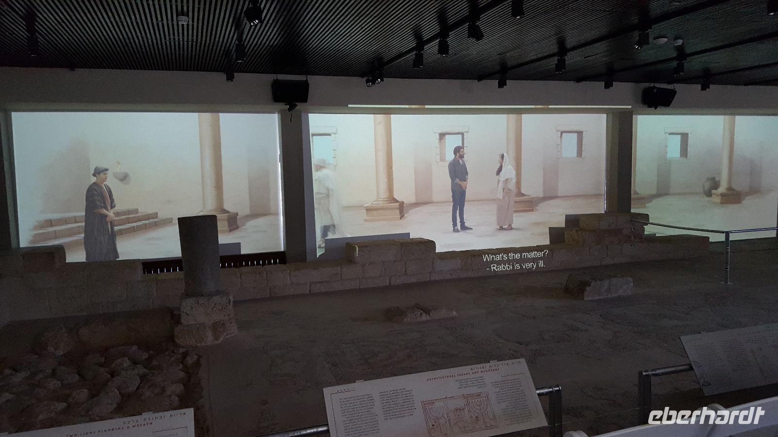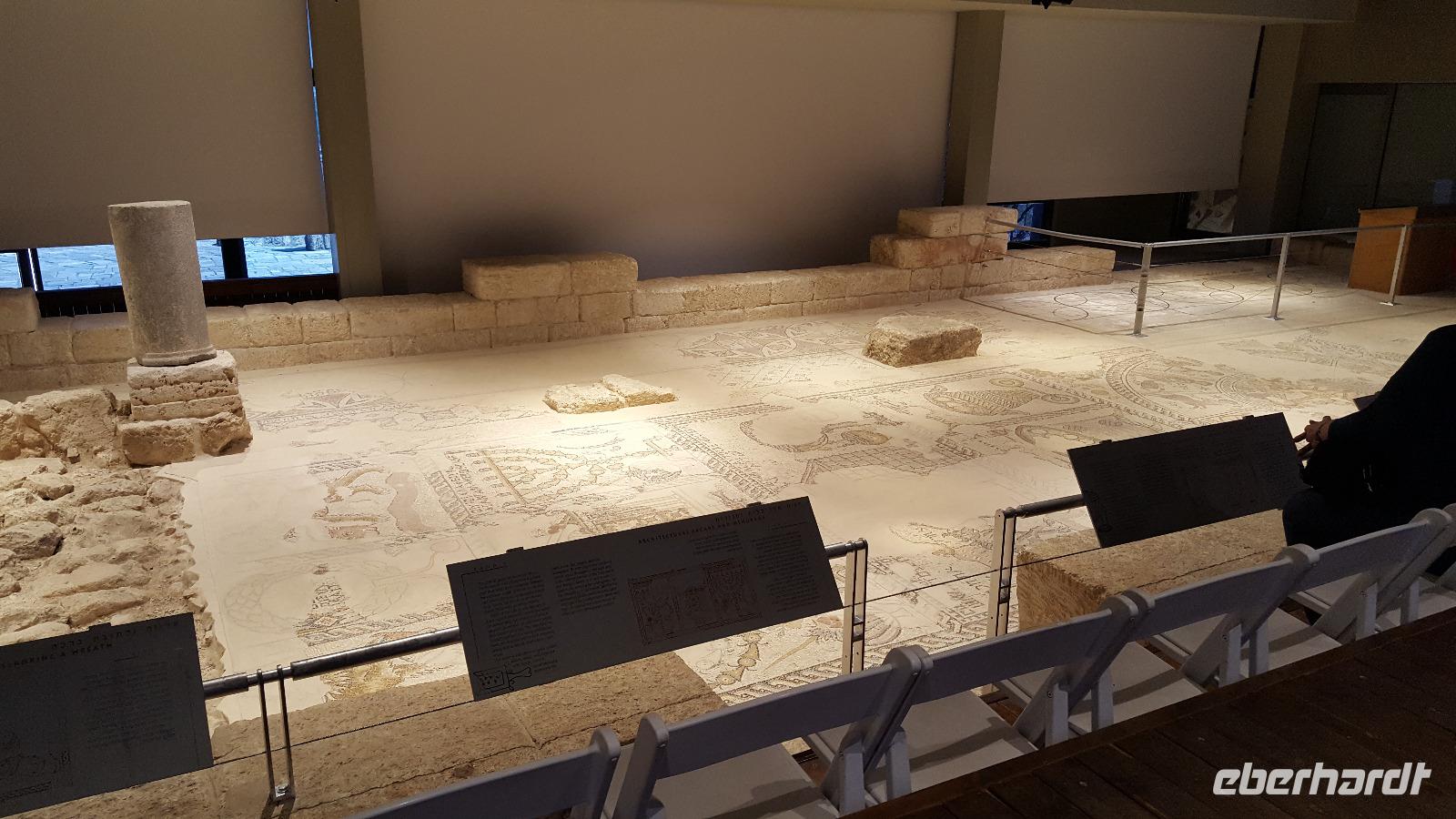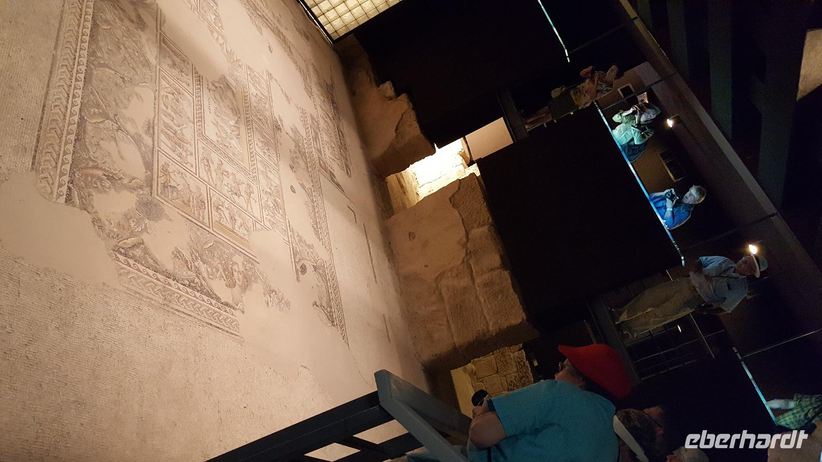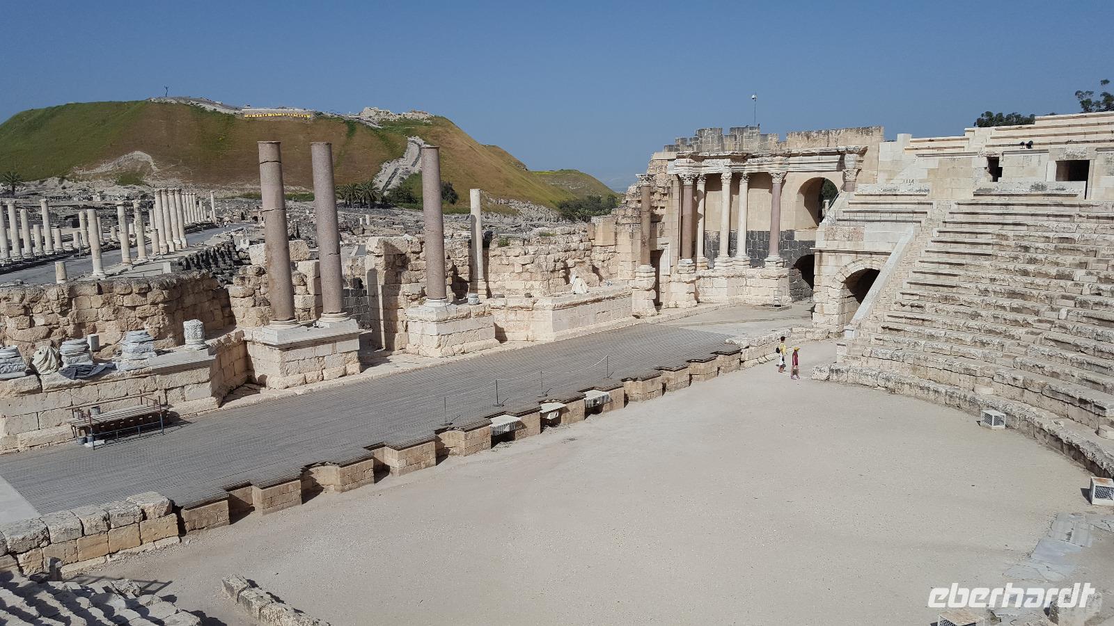 Wieder geht es heute zeitig los, um 8 Uhr sind die Koffer bereits im Bus verstaut und wir starten Richtung Zippori, auch Sepphoris genannt. Die „Zierde Galiläas" wird die Stadt genannt und die Ausgrabungen zeugen noch heute davon. Die Stadt musste komplette Zerstörung und Wiederaufbau in römischen Zeiten erleiden. Zu den berühmtesten Mosaiken zählen die „Mona Lisa von Galiläa", aber auch die Mosaiken im Haus des Nilfestes. Wir sehen die Zisternen, die Dyonysosvilla, das Theater, aber auch den Wachturmes aus Kreuzfahrerzeiten sehen wir, es wurde alles verbaut, was die Gegend hergab und so sieht man in der Ecke des Turmes einen verbauten Sarkophag... Ein besonderer Höhepunkt war der Besuch der Synagoge mit dem prächtigen Mosaikboden. Hier sahen wir einen Film über die Geschichte. Unser nächstes Ziel heute ist Nazareth und hier natürlich die Verkündigungskirche. Wir haben ein perfektes Timing: 12 Uhr beginnt die Messe, der wir beiwohnen können. Anschließend schauen wir uns die Marien-Mosaiken aus allen Ländern der Welt an, mittlerweile sind es so viele, dass sie auch außerhalb der Kirche im Rundgang angebracht sind. Ein Bild kommt uns sehr bekannt vor, die Sixtinische Madonna- hier gestiftet von britischen Pfadfindern, daher mit dem heiligen Georg und eben auch Pfadfindern. Im Restaurant „Casanova" stehen dann wieder regionale Speisen zur Auswahl, wir stärken uns mit Falafel oder Hähnchenfleisch im Pitabrot- hmm. Lecker. Weiter geht unsere Reise zum Bet She´an Nationalpark. Hier hat man die größte Römerstadt in Israel gefunden, Ausgrabungen von gigantischen Ausmaßen lassen vermuten, dass hier einmal bis zu 50.000 Menschen lebten. Viele Gebäude sind sehr gut erhalten, man geht davon aus, dass die Stadt von einem Erdbeben um 750 verschüttet wurde und nicht wiederaufgebaut wurde. Wir sind beeindruckt vom riesigen Theater, Gabi erläutert uns die Badehäuser mit ihren beheizten Becken, Böden und Wänden. Wir könnten noch stundenlang durch die Anlagen laufen, aber die Hitze fordert ihren Tribut und wir sind froh, wieder in den kühlen Bus einsteigen zu können und zum Kibbutz zu fahren. Unterwegs dann immer wieder Zäune und Grenzanlagen und Gabi erzählt von den Auseinandersetzungen hier an der Grenze. Endlich erreichen wir das Tote Meer und im Kibbutz Kalia beziehen wir unsere Zimmer. Ein leckeres Abendessen rundet den Tag ab.