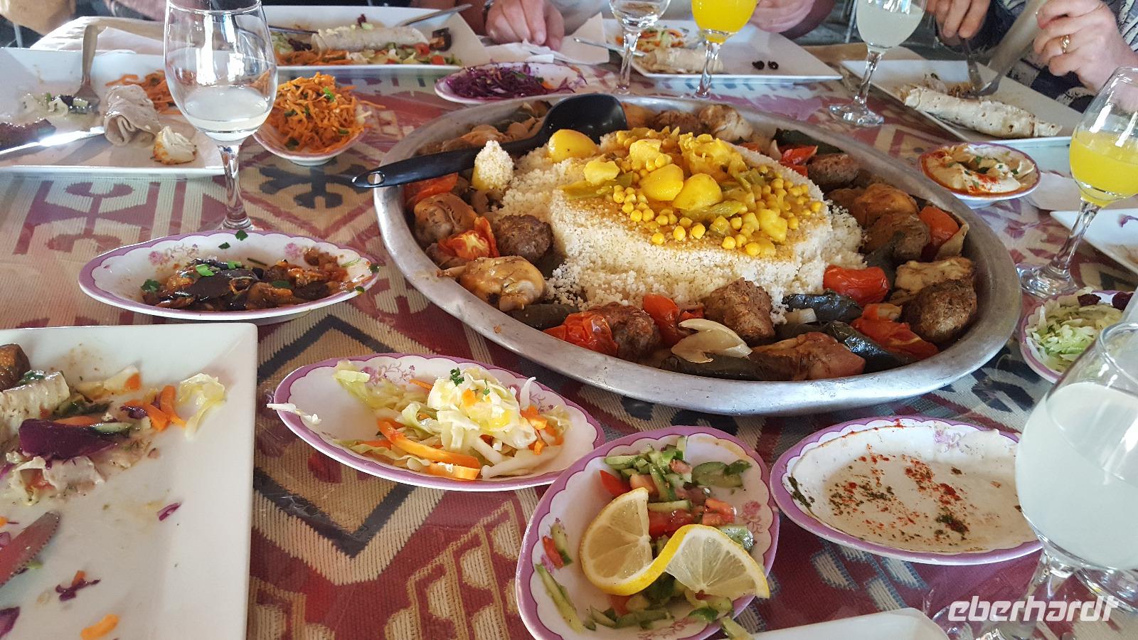 bei Kfar werden wir erwartet und ein wunderbares Mittagsmahl wird uns angeboten. Wieder vielerlei Vorspeisen, dazu Fladenbrot und dann leckere Fleischgerichte um eine riesige Portion Couscous. Natürlich durften die süßen Desserts nicht fehlen, Honig, Nüsse und Früchte- ein Genuss. Dann ließen wir uns mit den Beduinen nieder und wir erfuhren viel über die Lebensart, die Gastfreundschaft und den „Kaffee-Ruf" der Beduinen. Zum Schluss noch ein Abschiedsfoto mit den Kamelen und zurück ging die Fahrt in unser Kibbutz. Hier trafen wir uns alle am Abend, ließen die bisherige Reise Revue passieren und jeder hatte die Gelegenheit, seine Wünsche für die weitere Reise einzubringen. Eine kleine Überraschung gab es noch: In Israel beginnt die Sommerzeit bereits heute Nacht- uff, wieder eher aufstehen.