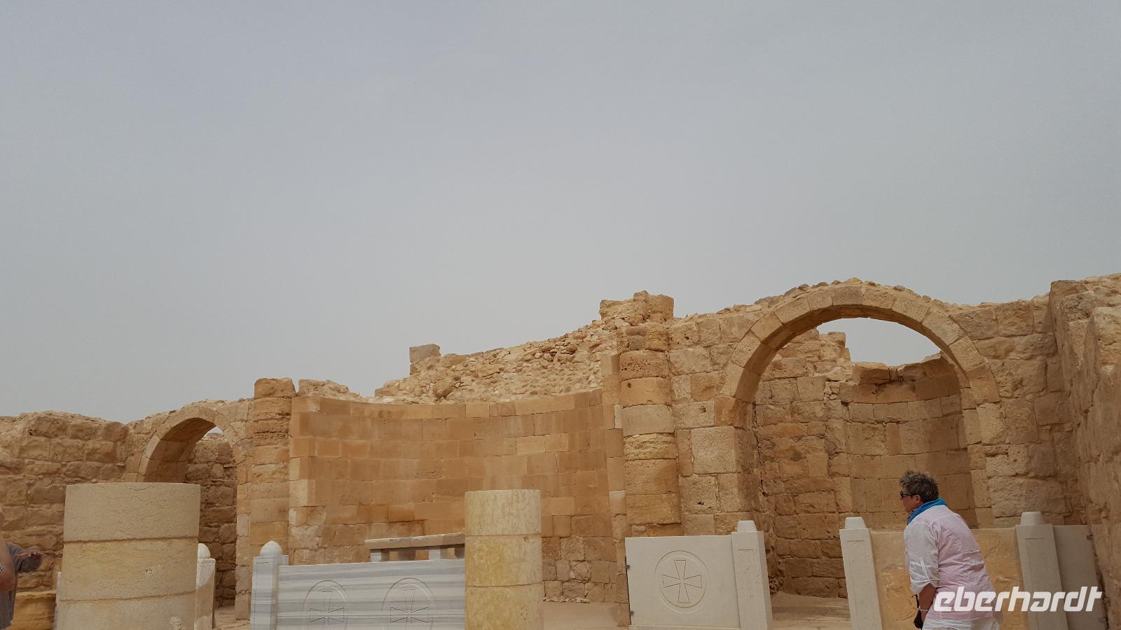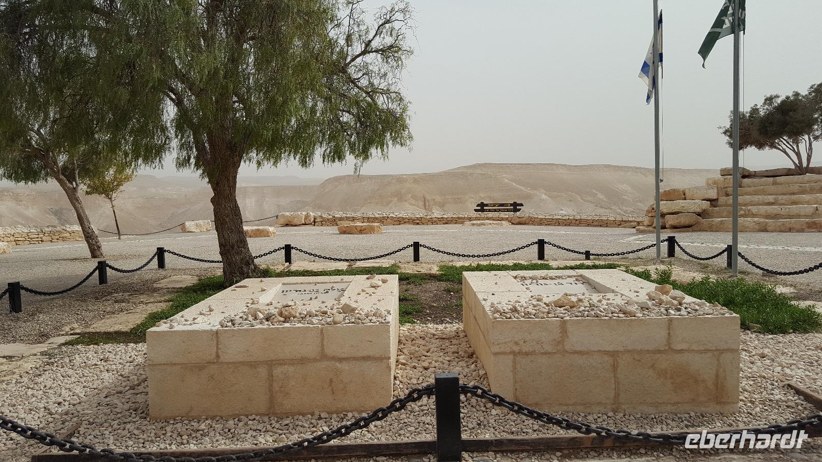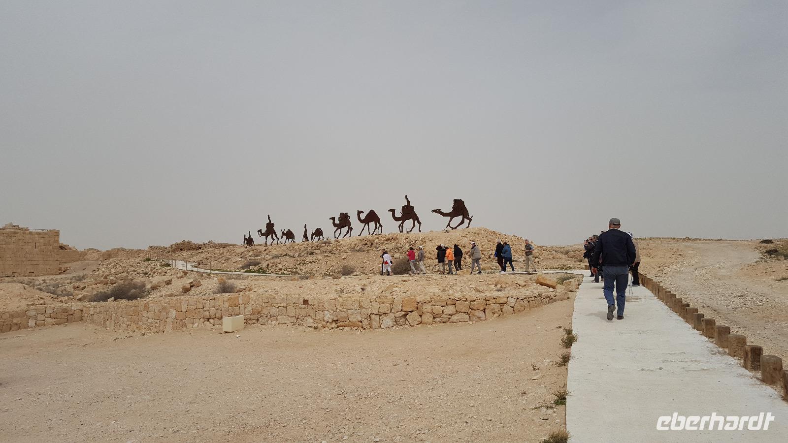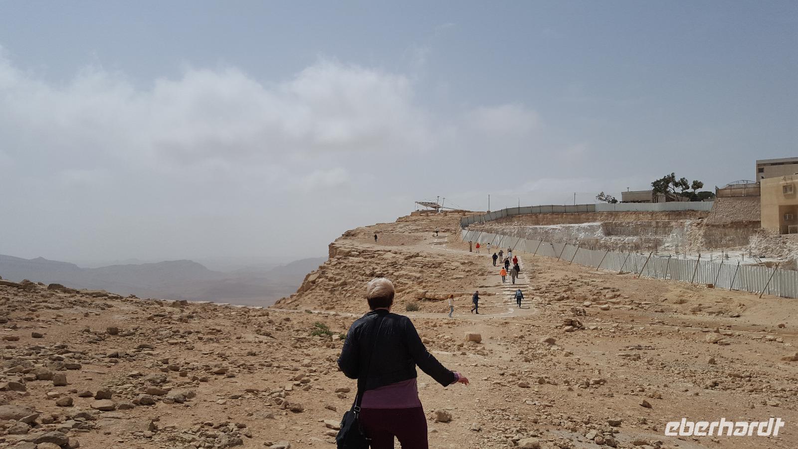 In der Nacht gab es einen Sandsturm und heute Morgen nieselt es ganz leicht. Mit 18 °C sind wir wieder im angenehmen Bereich angekommen und püntktlich 9 Uhr sind die Koffer im Bus und wir- mit einem guten Frühstück, trotz Shabbat, gestärkt- unternehmungslustig. Unterwegs genießen wir leise Klezmer Musik und individuelle Erklärungen, Gabi verzichtet heute auf das Bordmikrofon. An einem Schild „Vorsicht Kamele" machen wir natürlich einen Fotostopp. Dann erreichen wir Mitzpe Ramon und besuchen hier den Erosionskrater Maschtesch Ramon. Der Sturm der letzten Nacht war hier noch sehr aktiv und so schossen wir rasch einige Fotos und flüchteten ins Besucherzentrum. Der Eingangsbereich überraschte dann: er war dem israelischen Astronauten Ilan Ramon gewidmet. Ausstellungsstücke und ein Film erzählten von ihm. Er kam beim Absturz der Columbia ums Leben. Eine weitere Ausstellung erzählte sehr anschaulich von der Entstehung des Kraters durch Erosion, Wind und Wasser. Zum Abschluss dann ein toller Film über die Pflanzen und Tiere des Kraters. Nun war nochmals Zeit, der Wind hatte sich gelegt und wir konnten die nähere Umgebung erkunden bevor wir zum nächsten Ziel aufbrachen: nach Avdat, der berühmten Nabatäerstadt. Auch hier konnten wir im Besucherzentrum zunächst einen informativen Film zu den Nabatäern und Avdat sehen. Sie haben immerhin 65 Karawansereien an der berühmten Weihrauchstraße eingerichtet um die mehr als 2300 km lange Strecke bewältigen zu können und Weihrauch, Myrre und kostbare Gewürze von Arabien durch die Wüste Nevdev bis nach Gaza zum Mittelmeer transportieren zu können. Avdat war Station Nummer 62. Dann fahren wir hinauf auf den Bergrücken und bestaunen die umfangreichen Ausgrabungen, die Baukunst für Bögen und mehrgeschossige Häuser, die römische Villa, den Wachturm, die Zitadellen und auch die Kirchen mit ihren teilweise restaurierten Taufbecken. Weiter ging unsere Reise Richtung Sde Boker, doch unterwegs hielten wir erst einmal für eine kleine Stärkung. In Sde Boker besuchten wir das Grab von David Ben Gurion, dem Staatsgründer Israels und seiner Frau Paula. Auch eine große Gruppe Pfadfinder war zeitgleich hier. So warteten wir ab, bis wir uns und Gabis Erläuterungen wieder verstehen konnten. Gegen 16 Uhr machten wir uns dann auf den Weg nach Jerusalem, stoppten noch einmal für eine kurze Pause in Dvira und kamen am frühen Abend in unserem Hotel Shalom Rimonim an. Ein großes Buffet mit Vorspeisen, warmen Gerichten, Obst und Desserts wartete auf uns zum Abendessen. Das Stadtzentrum von Jerusalem müsse man unbedingt besuchen, wenn der Shabbat nach Sonnenuntergang zu Ende ist und die Stadt wieder erwacht- das wollten wir erleben und so bestellten wir kurzerhand für den Abend einen Bus in die Stadt und erlebten, wie nach 21 Uhr tatsächlich die Läden und Cafes wieder geöffnet wurden. Eine Gruppe junger Leute sang in der Fußgängerzone der Yehuda-Straße und der Rhythmus riss uns förmlich mit. Andere bauten ihre Musikinstrumente auf, nach 22 Uhr sollte es losgehen aber wir waren vernünftig und fuhren zurück zum Hotel, die Nacht würde ohnehin kurz genug werden.