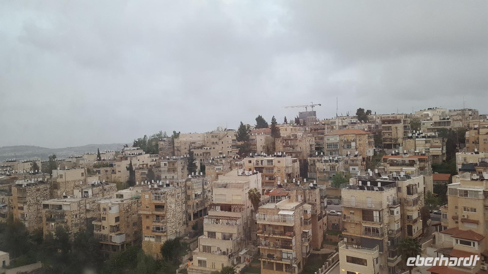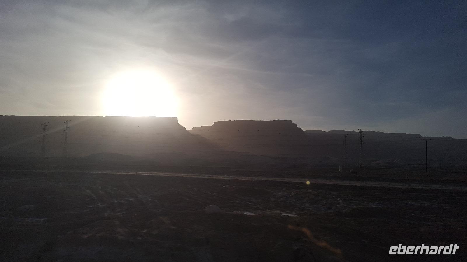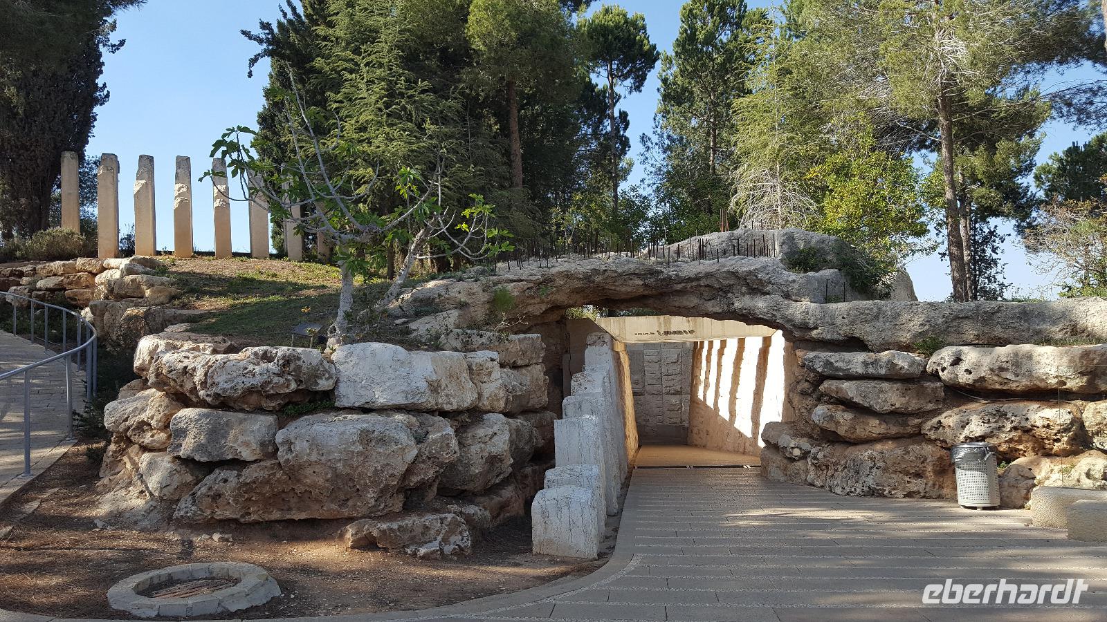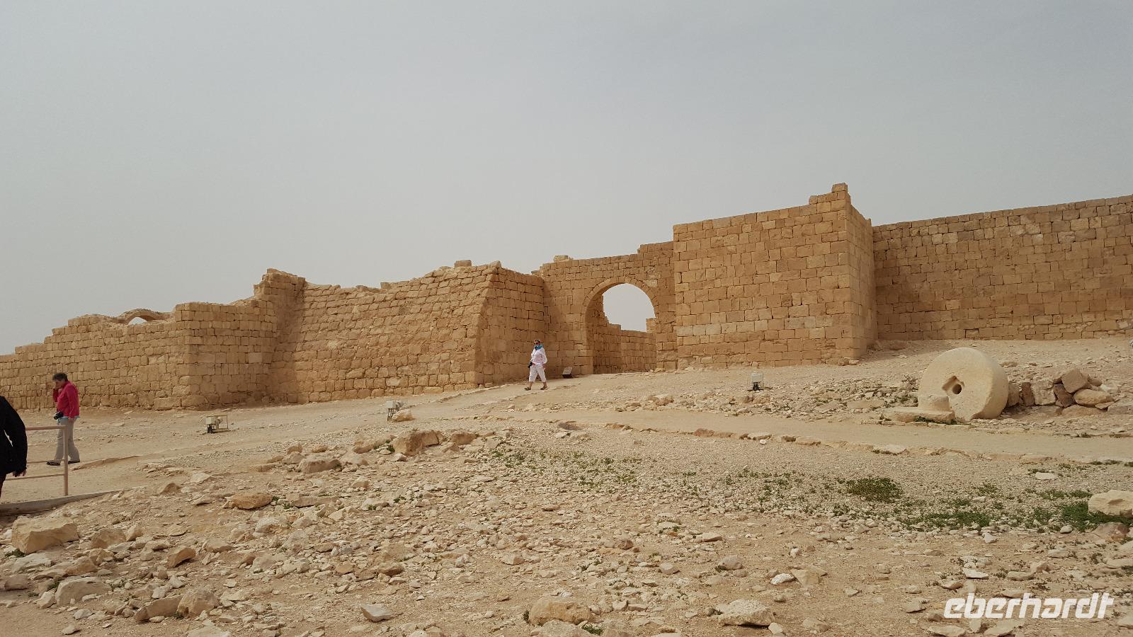 In der Nacht gab es einen Sandsturm und heute Morgen nieselt es ganz leicht. Mit 18 °C sind wir wieder im angenehmen Bereich angekommen und püntktlich 9 Uhr sind die Koffer im Bus und wir- mit einem guten Frühstück, trotz Shabbat, gestärkt- unternehmungslustig. Unterwegs genießen wir leise Klezmer Musik und individuelle Erklärungen, Gabi verzichtet heute auf das Bordmikrofon. An einem Schild „Vorsicht Kamele" machen wir natürlich einen Fotostopp. Dann erreichen wir Mitzpe Ramon und besuchen hier den Erosionskrater Maschtesch Ramon. Der Sturm der letzten Nacht war hier noch sehr aktiv und so schossen wir rasch einige Fotos und flüchteten ins Besucherzentrum. Der Eingangsbereich überraschte dann: er war dem israelischen Astronauten Ilan Ramon gewidmet. Ausstellungsstücke und ein Film erzählten von ihm. Er kam beim Absturz der Columbia ums Leben. Eine weitere Ausstellung erzählte sehr anschaulich von der Entstehung des Kraters durch Erosion, Wind und Wasser. Zum Abschluss dann ein toller Film über die Pflanzen und Tiere des Kraters. Nun war nochmals Zeit, der Wind hatte sich gelegt und wir konnten die nähere Umgebung erkunden bevor wir zum nächsten Ziel aufbrachen: nach Avdat, der berühmten Nabatäerstadt. Auch hier konnten wir im Besucherzentrum zunächst einen informativen Film zu den Nabatäern und Avdat sehen. Sie haben immerhin 65 Karawansereien an der berühmten Weihrauchstraße eingerichtet um die mehr als 2300 km lange Strecke bewältigen zu können und Weihrauch, Myrre und kostbare Gewürze von Arabien durch die Wüste Nevdev bis nach Gaza zum Mittelmeer transportieren zu können. Avdat war Station Nummer 62. Dann fahren wir hinauf auf den Bergrücken und bestaunen die umfangreichen Ausgrabungen, die Baukunst für Bögen und mehrgeschossige Häuser, die römische Villa, den Wachturm, die Zitadellen und auch die Kirchen mit ihren teilweise restaurierten Taufbecken. Weiter ging unsere Reise Richtung Sde Boker, doch unterwegs hielten wir erst einmal für eine kleine Stärkung. In Sde Boker besuchten wir das Grab von David Ben Gurion, dem Staatsgründer Israels und seiner Frau Paula. Auch eine große Gruppe Pfadfinder war zeitgleich hier. So warteten wir ab, bis wir uns und Gabis Erläuterungen wieder verstehen konnten. Gegen 16 Uhr machten wir uns dann auf den Weg nach Jerusalem, stoppten noch einmal für eine kurze Pause in Dvira und kamen am frühen Abend in unserem Hotel Shalom Rimonim an. Ein großes Buffet mit Vorspeisen, warmen Gerichten, Obst und Desserts wartete auf uns zum Abendessen. Das Stadtzentrum von Jerusalem müsse man unbedingt besuchen, wenn der Shabbat nach Sonnenuntergang zu Ende ist und die Stadt wieder erwacht- das wollten wir erleben und so bestellten wir kurzerhand für den Abend einen Bus in die Stadt und erlebten, wie nach 21 Uhr tatsächlich die Läden und Cafes wieder geöffnet wurden. Eine Gruppe junger Leute sang in der Fußgängerzone der Yehuda-Straße und der Rhythmus riss uns förmlich mit. Andere bauten ihre Musikinstrumente auf, nach 22 Uhr sollte es losgehen aber wir waren vernünftig und fuhren zurück zum Hotel, die Nacht würde ohnehin kurz genug werden.