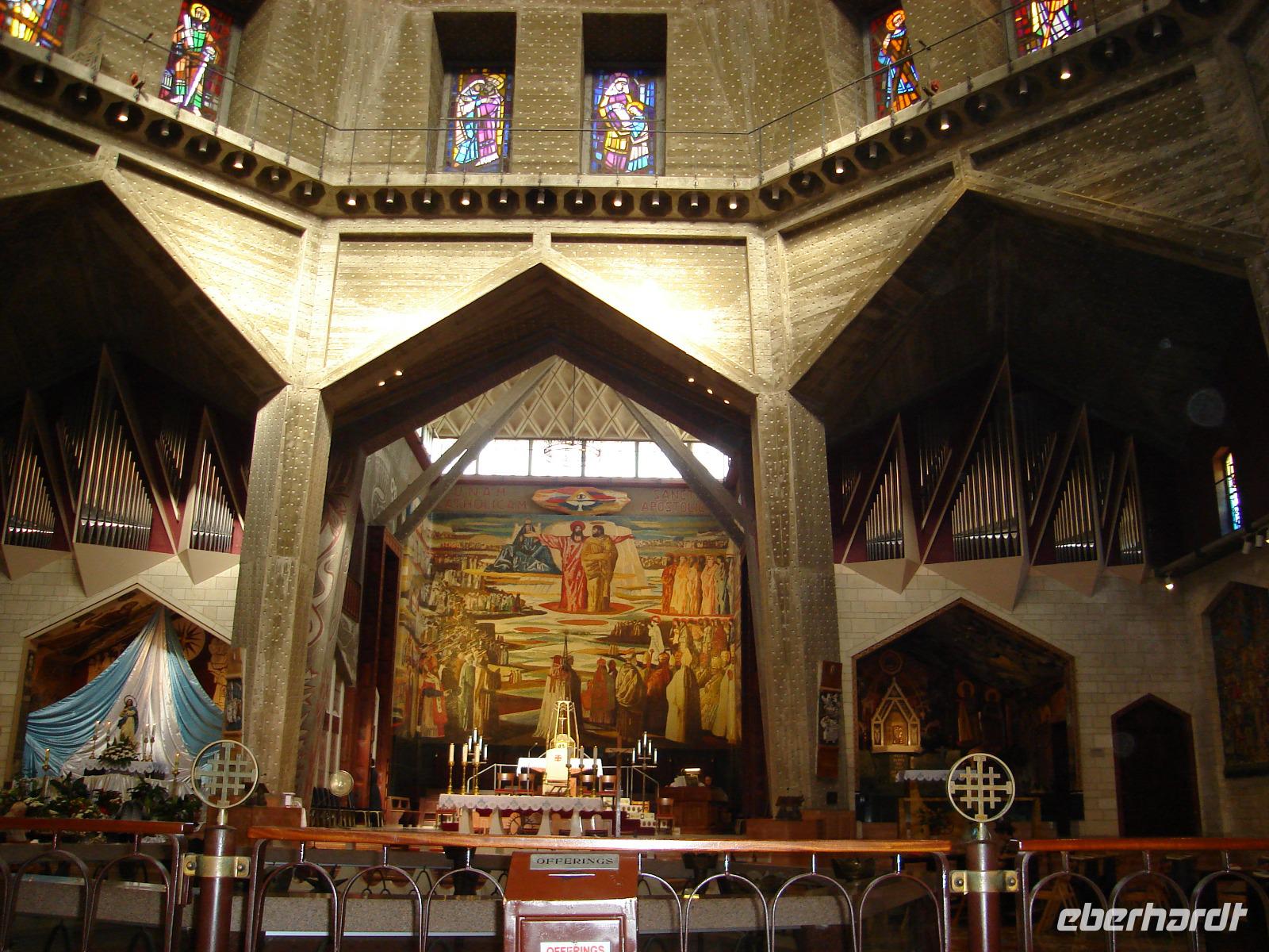 Weiter fuhren wir nach Nazareth zur Verkündigungskirche mit der Stelle, wo der Erzengel Gabriel der späteren Gottesmutter Maria erschienen war und ihr die Geburt eines Sohnes verkündet hatte. Auf einem ausführlichen Rundgang machte uns Gabbi auf zahlreiche Besonderheiten dieses Wallfahrtsortes aufmerksam. Und hier begann eine schöne Tradition: Gabbi las den jeweils dem Ort entsprechenden Text aus der Bibel vor. Diese Lesungen, die auch gleichzeitig Ruhe- und Besinnungspunkte für uns alle waren, erfolgten zu unserer großen Freude nun regelmäßig. Überhaupt war der Aufenthalt in Nazareth sehr angenehm, denn alle anderen Gruppen waren bereits abgereist. So hatten wir das Gelände eine Stunde vor der Schließung nun fast für uns allein.