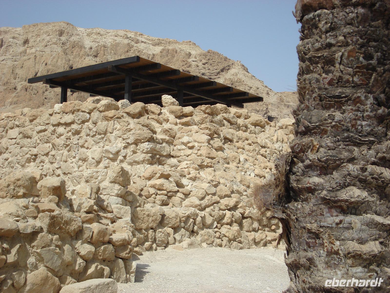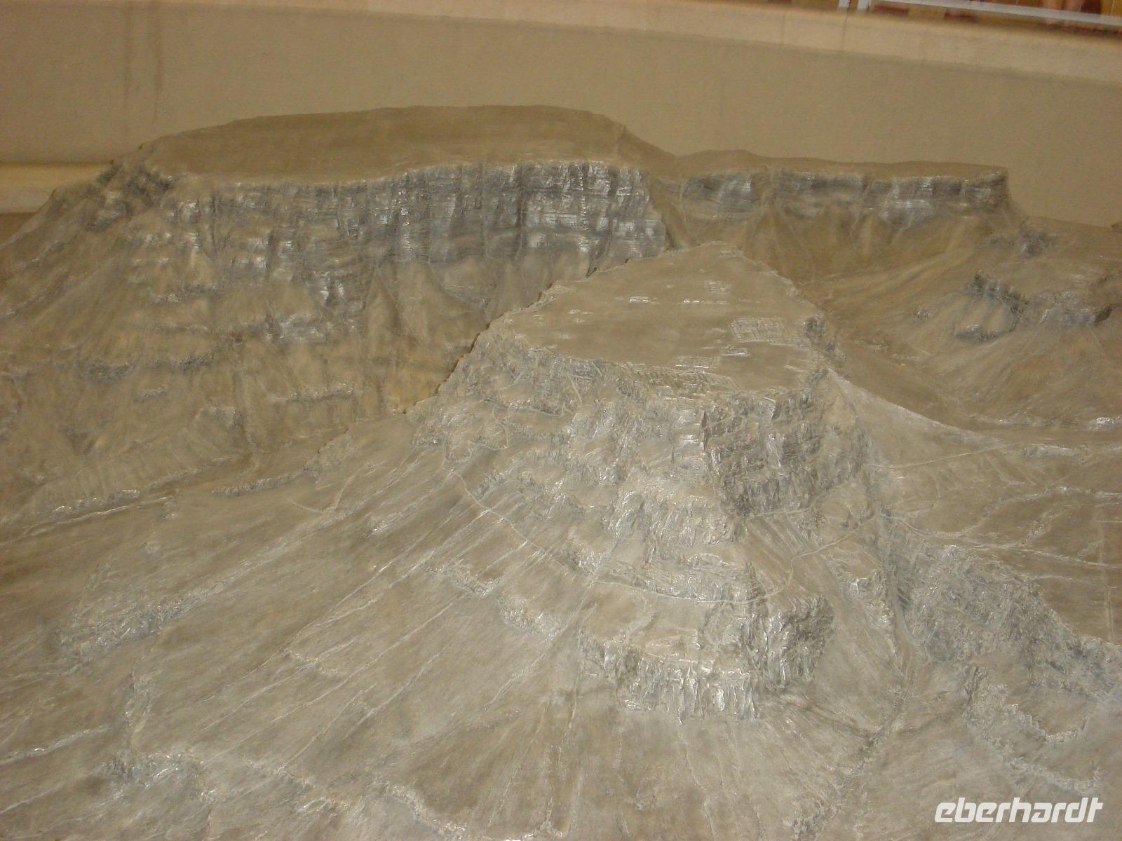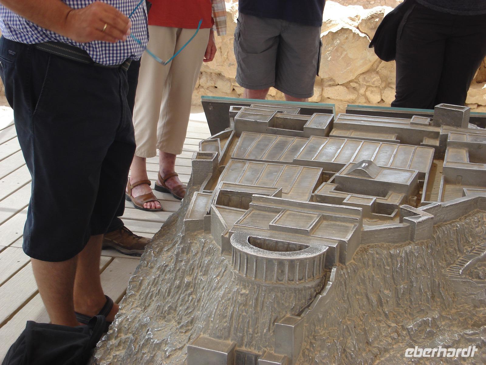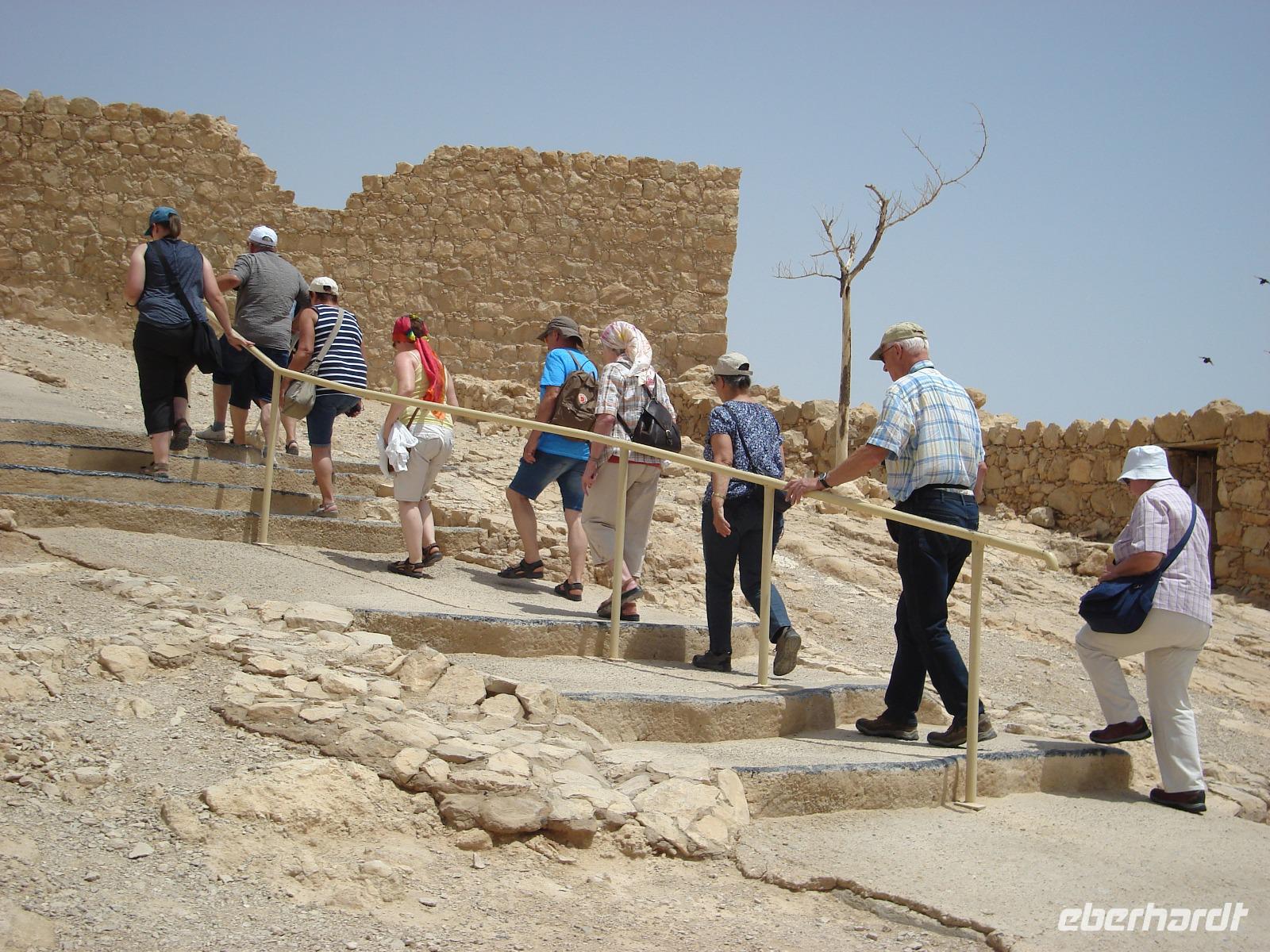 Nächster Programmpunkt und nicht minder bedeutsam: die Felsenfestung Massada, ebenfalls eine riesige Anlage, gebaut von König Herodes als Fluchtburg. Später war sie das letzte Bollwerk des jüdischen Aufstandes gegen die Römer. Wieder gab es zu Beginn der Besichtigung einen Film als Einführung, dann fuhren wir mit der Seilbahn hinauf auf das Plateau, wo wir u.a. den restaurierten Palast des Herodes sahen, die byzantinische Kirche, die Synagoge, die große Anzahl an Ritualbädern, Dampfbädern usw. und auch die große Zisterne an der südlichsten Spitze der Festung. Und natürlich wollten wir unbedingt die riesige Rampe sehen, die in die Geschichte eingegangen ist. Thema war ebenfalls der kollektive Selbstmord, der bei Josephus Flavius beschrieben ist. Man hat von hier aus eine fantastische Aussicht weit hinein ins Land. Mit der Seilbahn ging es flott wieder hinunter. Natürlich kann man auch zu Fuß gehen, aber bei der Hitze?!