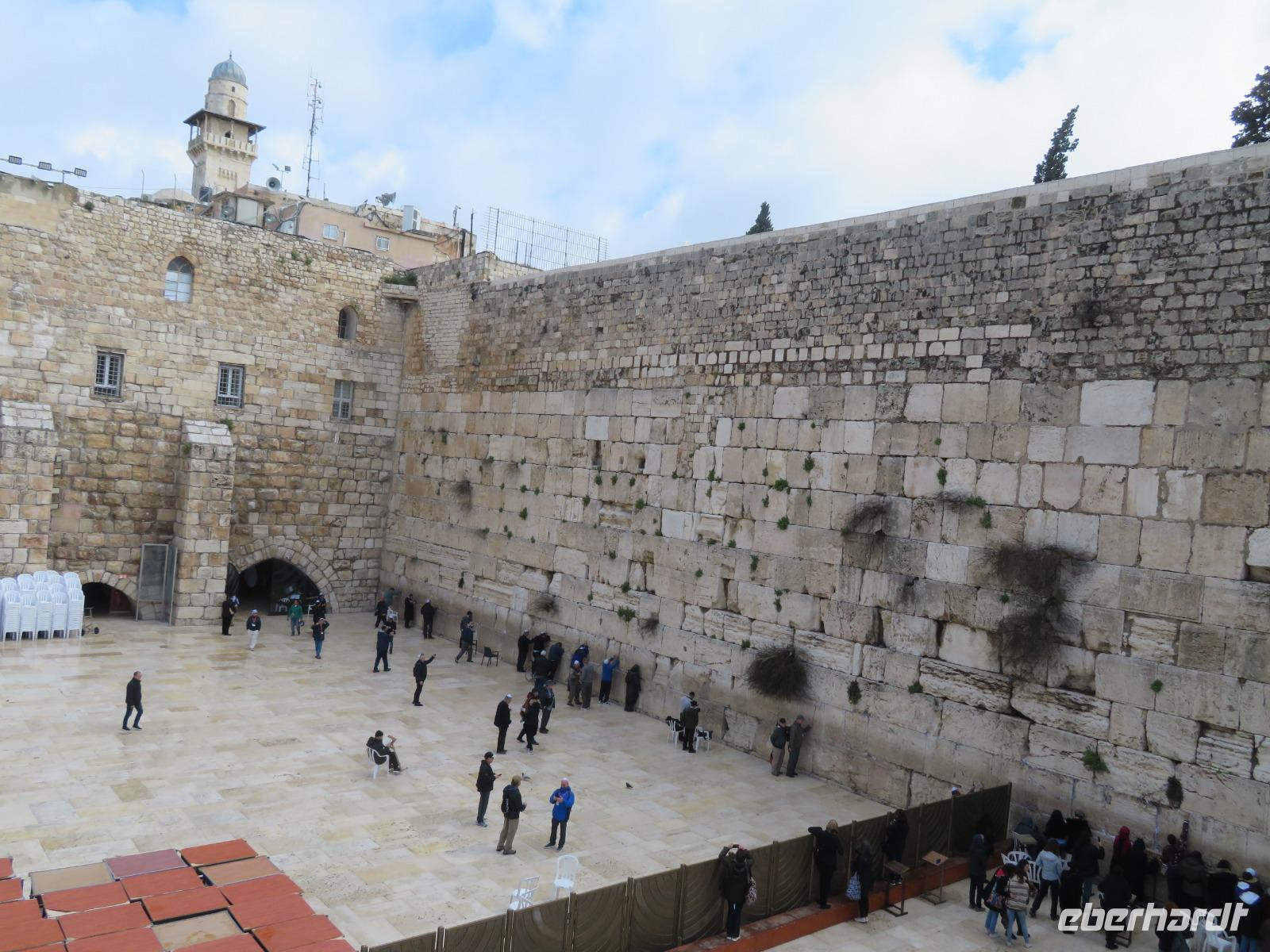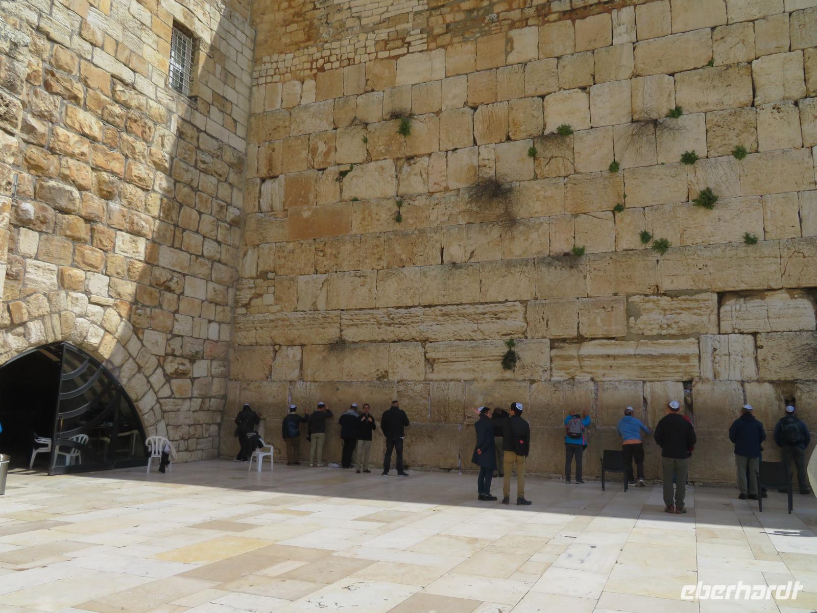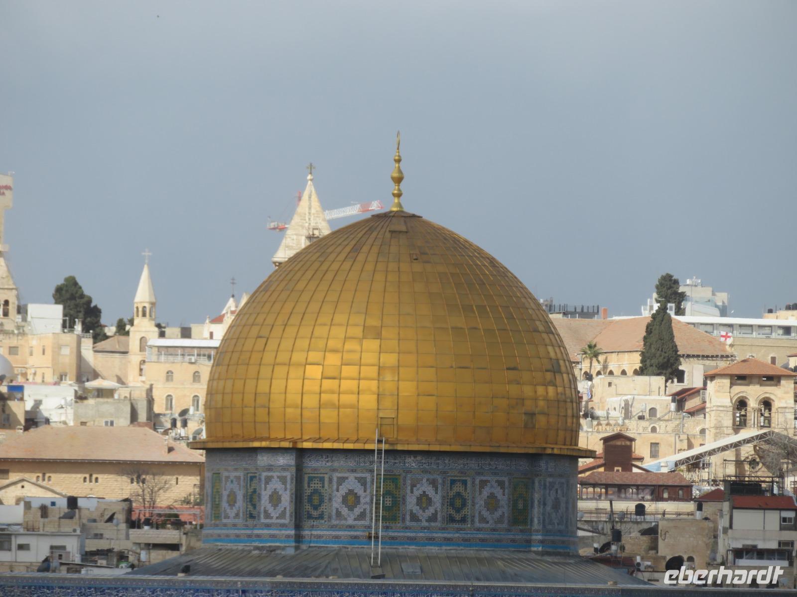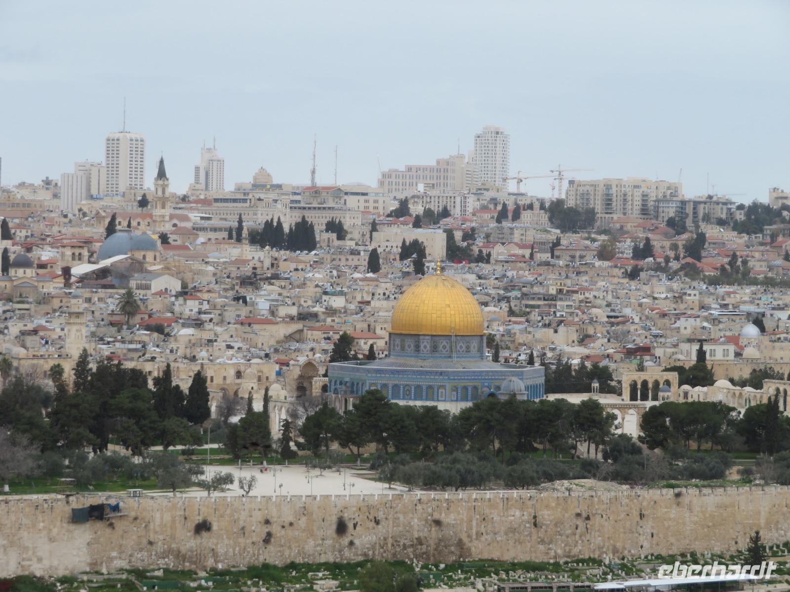 Nun haben wir endlich Jerusalem erreicht und hier stehen uns noch 3 volle Tage bevor. Der Wetterbericht für heute prophezeit uns nichts Gutes: 8 Grad Celsius und Regen. Und so kommt es dann auch. Nur noch etwas schlimmer mit heftigem Wind. Doch wir lassen uns nicht beirren und so starten wir voller freudiger Erwartungen unseren ersten Tag in Jerusalem. Wir beginnen unseren Auslug mit dem Besuch des Ölberges. Nach einem tollen Blick auf den Tempelberg kämpfen wir uns durch zahlreiche andere Touristengruppen zum Palmsonntagweg und schließlich zum Garten Gethsemane mit der Kirche der Nationen. Im Anschluss begeben wir uns zum Bus und fahren Richtung Süden ins palästinensische Autonomiegebiet nach Bethlehem. Zunächst besuchen wir ein Geschäft, in welchem man tolle Schnitzarbeiten aus Olivenholz sehen kann. Nach einer kurzen Mittagspause begeben wir uns nun auf den Weg zur Geburtskirche Jesu. Doch wir sind natürlich nicht die einzigen und somit müssen wir uns der langen Warteschlange fügen. Ronit erklärt uns während unserer Wartezeit viele Dinge und knapp 2 Stunden später war es dann so weit. Dachten wir. Kurz vor der Geburtsgrotte Jesu Christi wurde der Besuch des Patriarchen Jerusalems angekündigt und somit verzögert sich unser Besuch erneut. Die Stelle der Geburt Jesu ist durch einen Silberstern mit der Inschrift „Hic de virgine Maria Jesus Christus natus est" gekennzeichnet. Darüber liegt die Krippenkapelle, wo die Anbetung der Hirten stattfand. Nach rund 2 Stunden Wartezeit und schließlich 2 Minuten in der Geburtsgrotte, verlassen wir die Kirche bei einem heftigen Regenschauer. Somit entscheiden wir uns erst einmal für eine Kaffeepause, bevor wir im strömenden Regen zum Bus zurück laufen und zurück nach Jerusalem fahren.