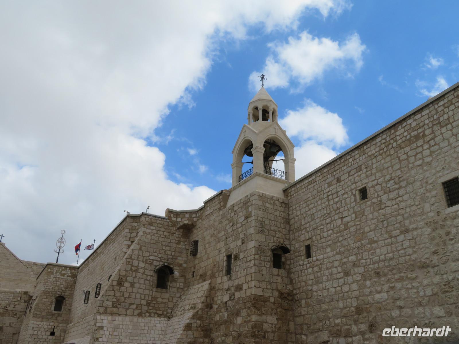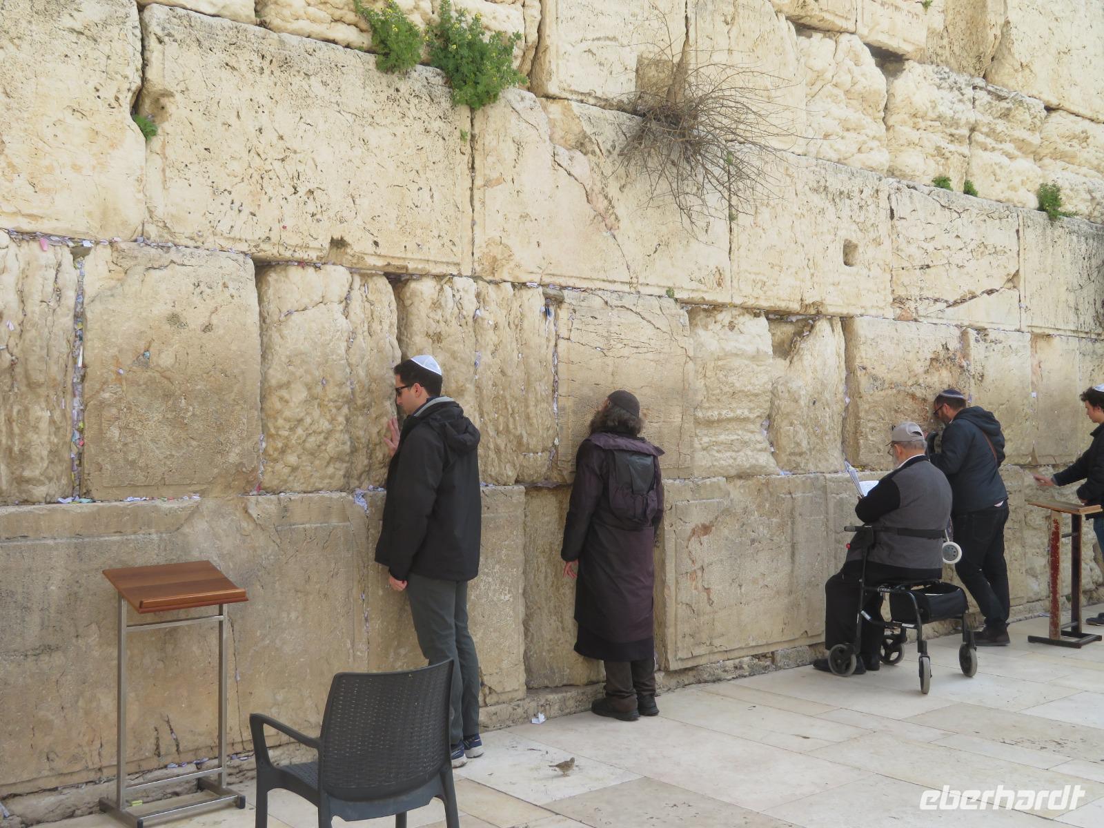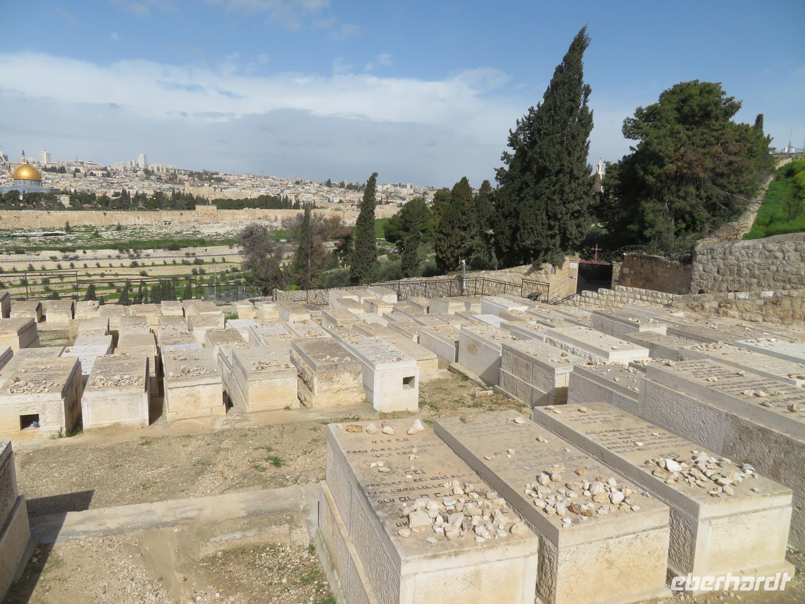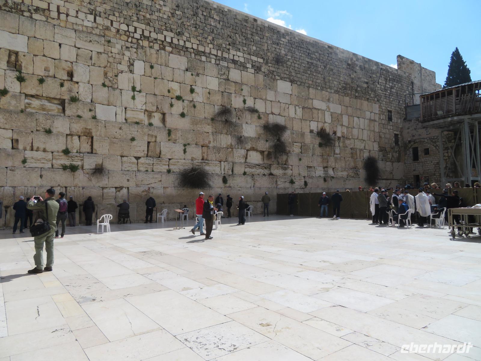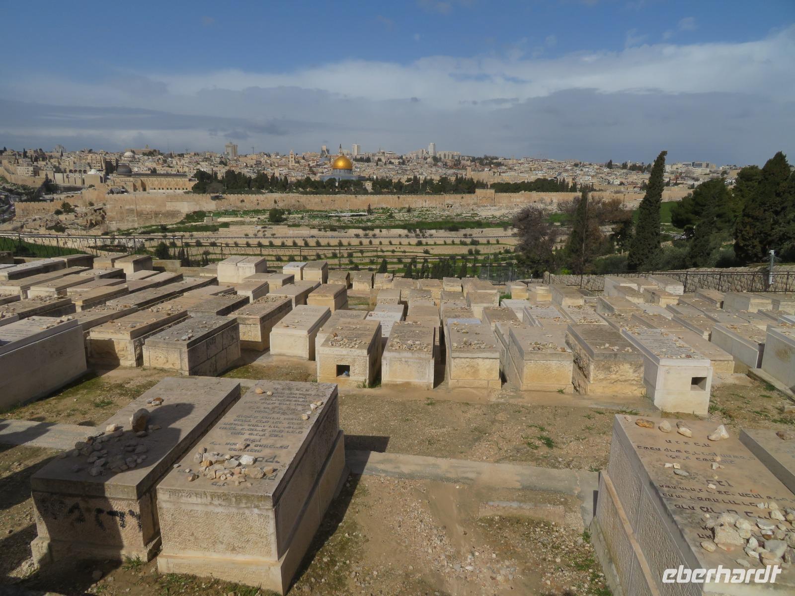 Nun haben wir endlich Jerusalem erreicht und hier stehen uns noch 3 volle Tage bevor. Der Wetterbericht für heute prophezeit uns nichts Gutes: 8 Grad Celsius und Regen. Und so kommt es dann auch. Nur noch etwas schlimmer mit heftigem Wind. Doch wir lassen uns nicht beirren und so starten wir voller freudiger Erwartungen unseren ersten Tag in Jerusalem. Wir beginnen unseren Auslug mit dem Besuch des Ölberges. Nach einem tollen Blick auf den Tempelberg kämpfen wir uns durch zahlreiche andere Touristengruppen zum Palmsonntagweg und schließlich zum Garten Gethsemane mit der Kirche der Nationen. Im Anschluss begeben wir uns zum Bus und fahren Richtung Süden ins palästinensische Autonomiegebiet nach Bethlehem. Zunächst besuchen wir ein Geschäft, in welchem man tolle Schnitzarbeiten aus Olivenholz sehen kann. Nach einer kurzen Mittagspause begeben wir uns nun auf den Weg zur Geburtskirche Jesu. Doch wir sind natürlich nicht die einzigen und somit müssen wir uns der langen Warteschlange fügen. Ronit erklärt uns während unserer Wartezeit viele Dinge und knapp 2 Stunden später war es dann so weit. Dachten wir. Kurz vor der Geburtsgrotte Jesu Christi wurde der Besuch des Patriarchen Jerusalems angekündigt und somit verzögert sich unser Besuch erneut. Die Stelle der Geburt Jesu ist durch einen Silberstern mit der Inschrift „Hic de virgine Maria Jesus Christus natus est" gekennzeichnet. Darüber liegt die Krippenkapelle, wo die Anbetung der Hirten stattfand. Nach rund 2 Stunden Wartezeit und schließlich 2 Minuten in der Geburtsgrotte, verlassen wir die Kirche bei einem heftigen Regenschauer. Somit entscheiden wir uns erst einmal für eine Kaffeepause, bevor wir im strömenden Regen zum Bus zurück laufen und zurück nach Jerusalem fahren.