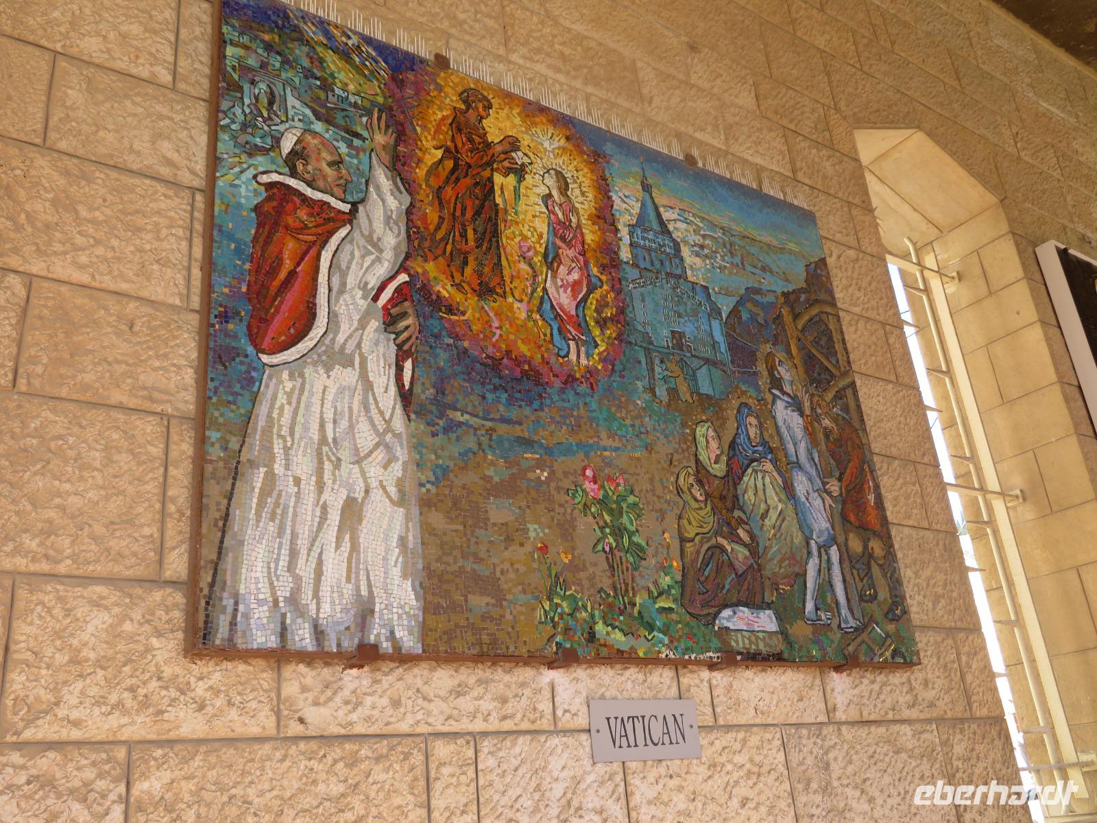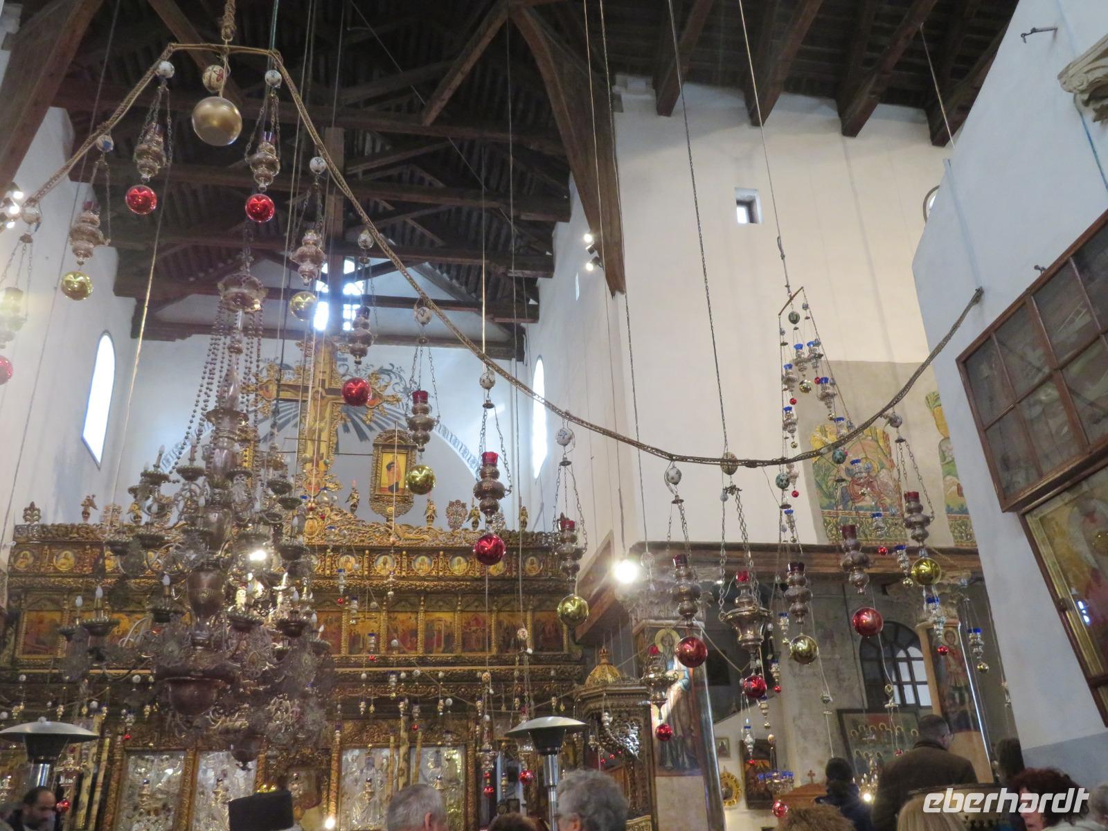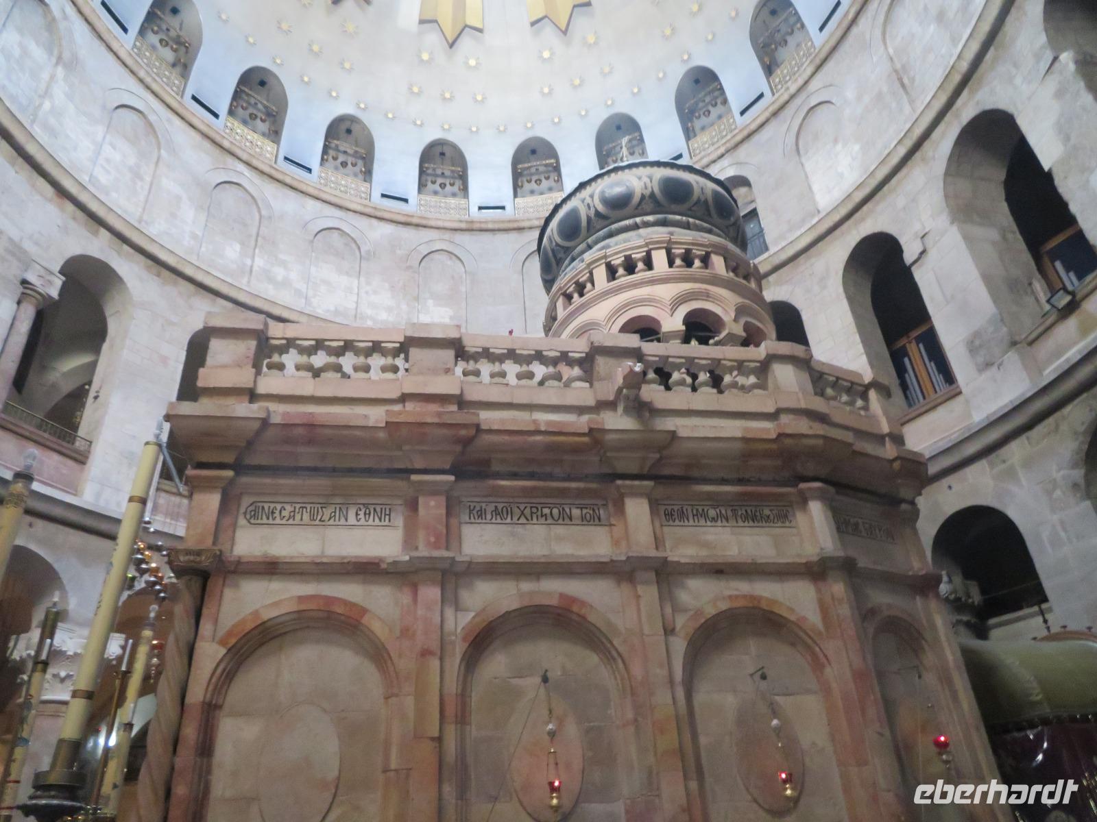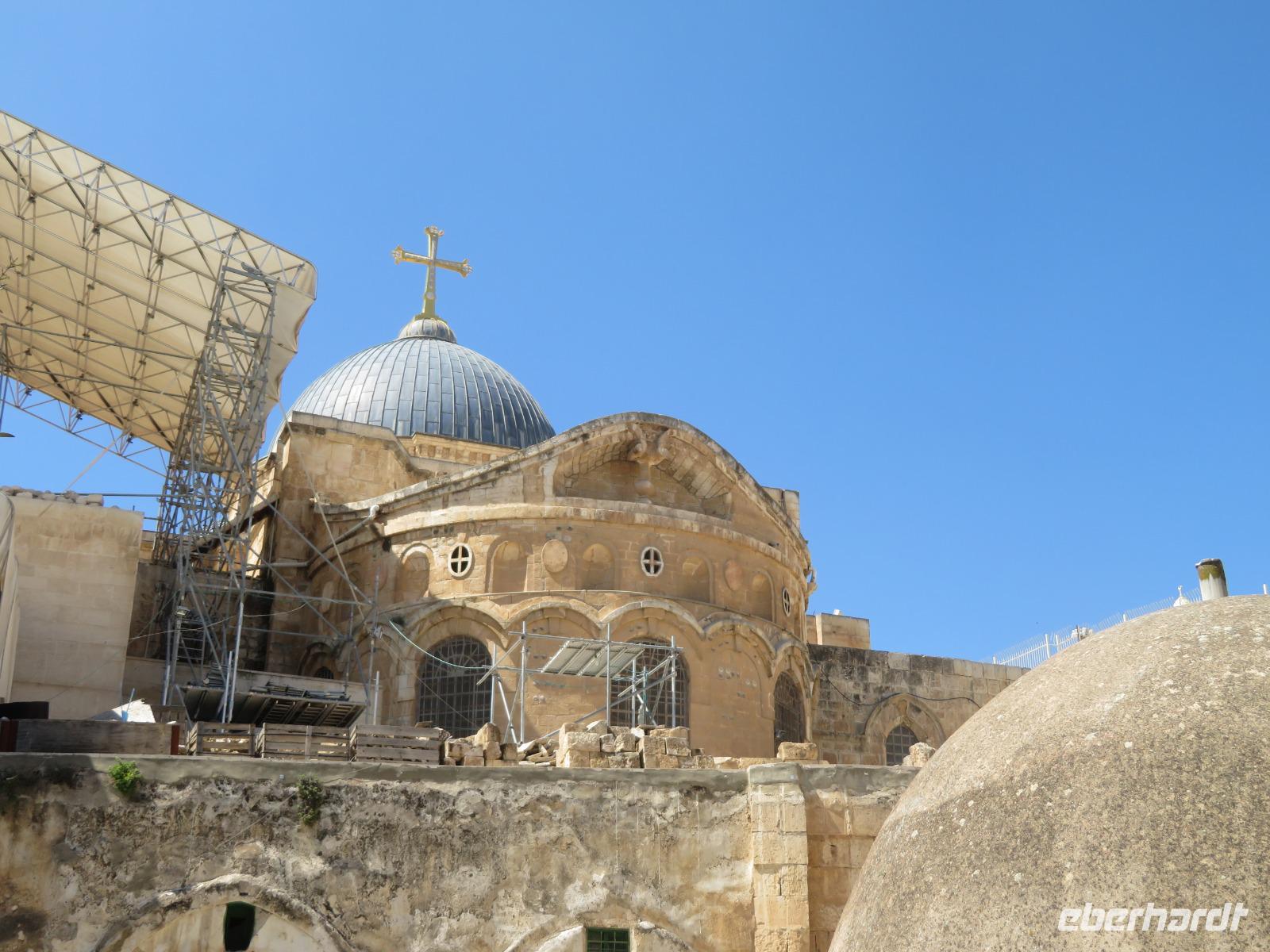 Nun haben wir endlich Jerusalem erreicht und hier stehen uns noch 3 volle Tage bevor. Der Wetterbericht für heute prophezeit uns nichts Gutes: 8 Grad Celsius und Regen. Und so kommt es dann auch. Nur noch etwas schlimmer mit heftigem Wind. Doch wir lassen uns nicht beirren und so starten wir voller freudiger Erwartungen unseren ersten Tag in Jerusalem. Wir beginnen unseren Auslug mit dem Besuch des Ölberges. Nach einem tollen Blick auf den Tempelberg kämpfen wir uns durch zahlreiche andere Touristengruppen zum Palmsonntagweg und schließlich zum Garten Gethsemane mit der Kirche der Nationen. Im Anschluss begeben wir uns zum Bus und fahren Richtung Süden ins palästinensische Autonomiegebiet nach Bethlehem. Zunächst besuchen wir ein Geschäft, in welchem man tolle Schnitzarbeiten aus Olivenholz sehen kann. Nach einer kurzen Mittagspause begeben wir uns nun auf den Weg zur Geburtskirche Jesu. Doch wir sind natürlich nicht die einzigen und somit müssen wir uns der langen Warteschlange fügen. Ronit erklärt uns während unserer Wartezeit viele Dinge und knapp 2 Stunden später war es dann so weit. Dachten wir. Kurz vor der Geburtsgrotte Jesu Christi wurde der Besuch des Patriarchen Jerusalems angekündigt und somit verzögert sich unser Besuch erneut. Die Stelle der Geburt Jesu ist durch einen Silberstern mit der Inschrift „Hic de virgine Maria Jesus Christus natus est" gekennzeichnet. Darüber liegt die Krippenkapelle, wo die Anbetung der Hirten stattfand. Nach rund 2 Stunden Wartezeit und schließlich 2 Minuten in der Geburtsgrotte, verlassen wir die Kirche bei einem heftigen Regenschauer. Somit entscheiden wir uns erst einmal für eine Kaffeepause, bevor wir im strömenden Regen zum Bus zurück laufen und zurück nach Jerusalem fahren.
