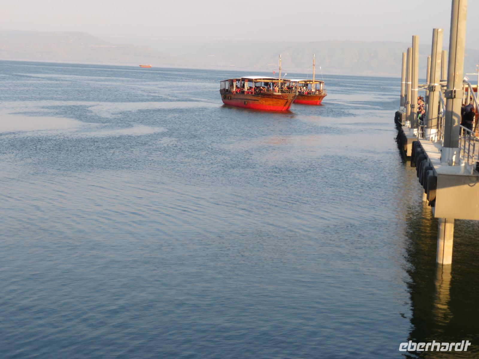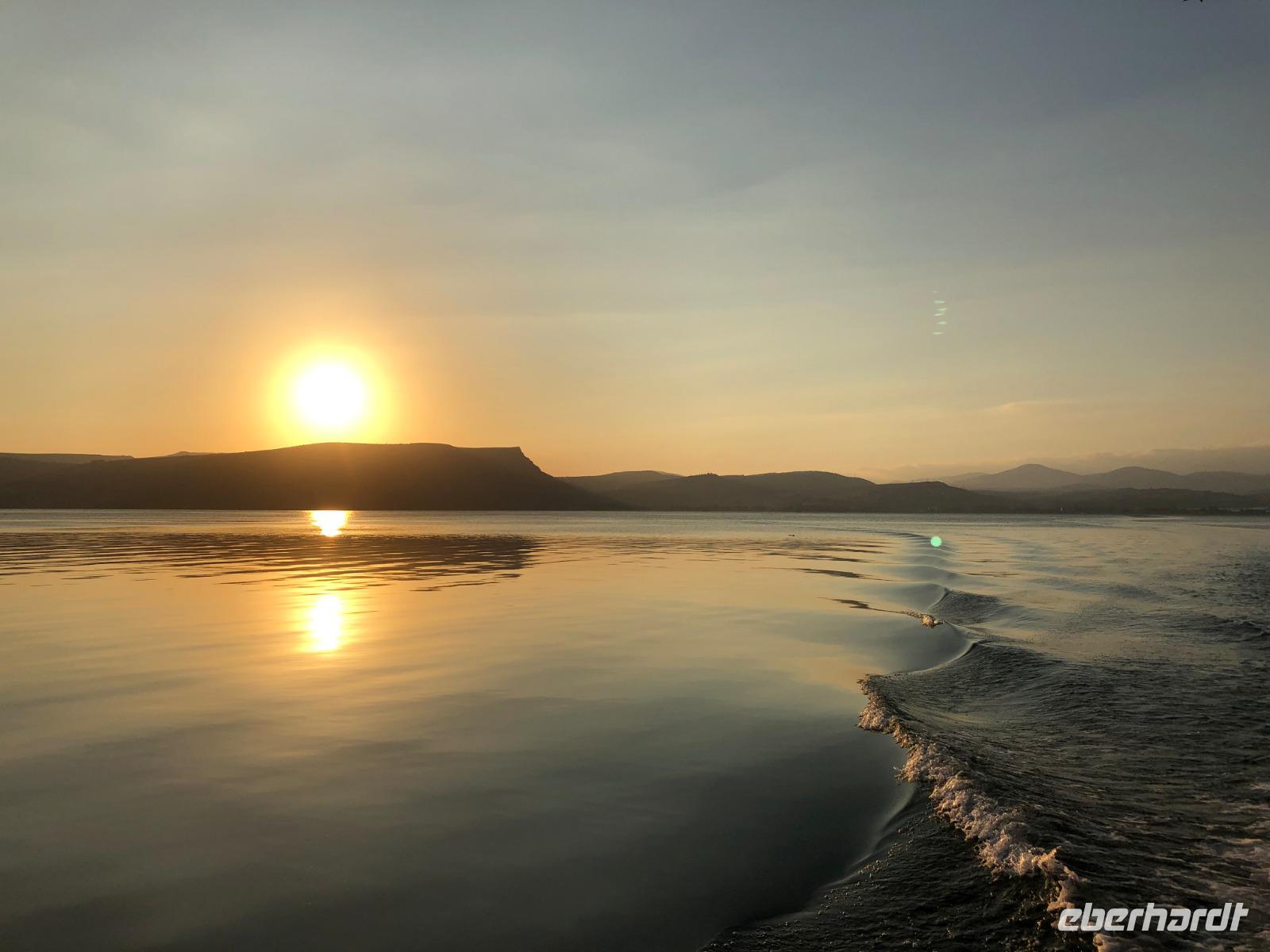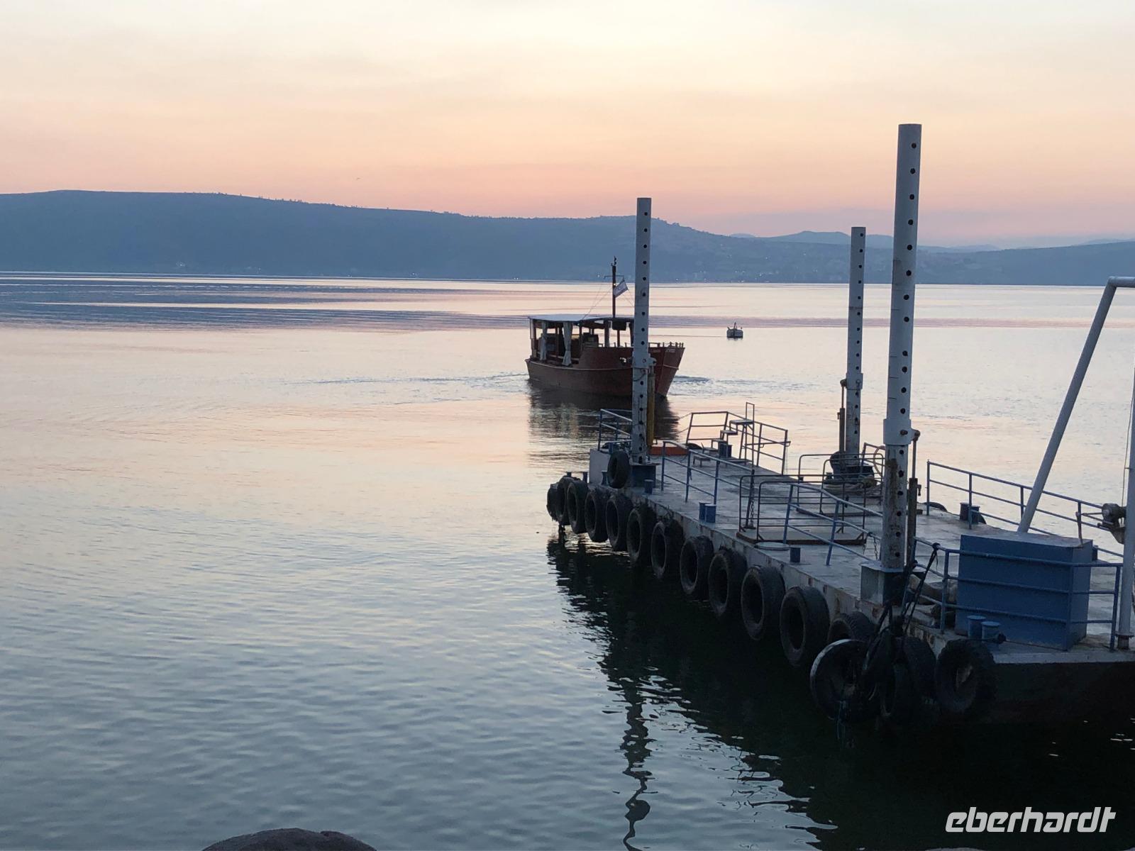 Nach dem Frühstück in unserem tollen Kibbuz wartet ein weiterer aufregender Tag auf uns. Heute stehen verschiedene biblische Stätten rund um den See Genezareth, im Hebräischen "Kinnereth", auf unserem Programm. „Selig sind die Barmherzigen, denn sie werden Barmherzigkeit erlangen." Erstes Ziel ist der Berg der Seligpreisung. Hier hielt Jesu seine Bergpredigt, nachzulesen im Matthäusevangelium der Bibel. Wir fahren weiter Richtung Norden und besuchen Banyas, eine der drei Jordanquellen und antike Herrschaftsresidenz Caesarea Philippi. Nun wird es etwas politisch, wir fahren auf den Golan, nahe der syrischen Grenze und haben bei bestem Wetter guten Blick auf das Nachbarland. Anschließend kehren wir zurück zum Kibbuz Ein Gev, wo wir zur Mittagspause den leckeren St. Peter-Fisch genießen, welchen es nur im See Genezareth zu fangen gibt. Als Vorspeise gibt es natürlich wieder reichlich Hummus, Pita und verschiedenes Gemüse. Nach der Mittagspause fahren wir wieder ein Stück Richtung Norden nach Kapernaum. Das ehemalige Fischerdorf in Galiläa ist heute Ausgrabungsort und beherbergt die römisch-katholische Petruskirche, welche über dem als Ausgrabung bekanntes Haus des Petrus steht. Anschließend fahren wir weiter ins benachbarte Tabgha und besuchen die allseits bekannte Brotvermerhrungskirche. Hier soll nach dem Evangelium von Matthäus die Brot-und Fischvermerhrung bei der Speisung der Fünftausend stattgefunden haben. Zum Abschluss des Tages genießen wir bei einer Bootsfahrt die abendliche Stimmung am See Genezareth. Ein wunderschöner Tag neigt sich dem Ende...