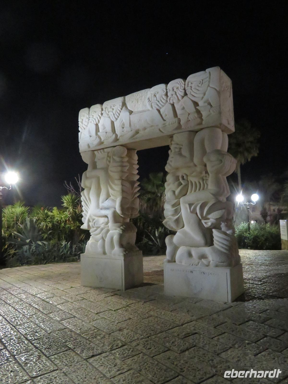 Für den Großteil der Gruppe beginnt unsere Reise in Berlin-Tegel. Nach ein wenig Chaos am Gepäckabgabeschalter und an der Sicherheitskontrolle schaffen wir es schließlich doch pünktlich zum Gate und rund 4 Stunden später landen wir sicher in Tel Aviv. Ein paar Fragen später an der Passkontrolle treffen wir auf Eva, unser örtliche Reiseleiterin für Tag 1 und Omar, unseren Busfahrer. Unser erstes Ziel ist das Grand Beach Hotel, wenige Meter von der Strandpromenade entfernt. Nach nur kurzer Zeit geht es weiter zum Abendessen nach Alt-Jaffa in ein beliebtes Lokal unter Einheimischen. Die Hektik der arabischen Kellner ist dann doch etwas amüsant, bevor wir uns es richtig schmecken lassen. Es wird aufgetischt ohne Ende: Falafel, Hummus, reichlich Gemüse, Fisch und Meeresfrüchte versüßen uns den Abend. Mehr als gut gestärkt erkunden wir gemeinsam mit Eva die Altstadt bei einem kurzen Rundgang. Schließlich kehren wir zum Hotel zurück und fallen hundemüde in unsere Betten. Ein anstrengender Tag sollte auf uns warten.