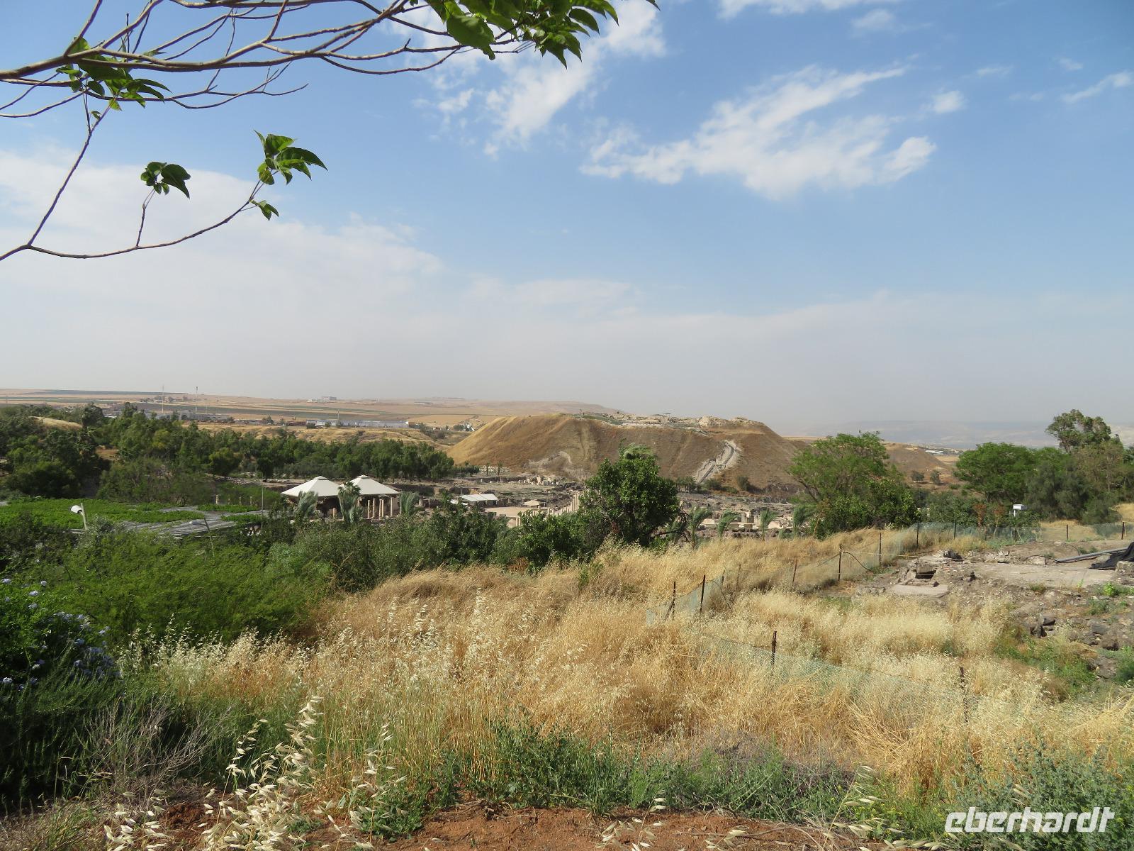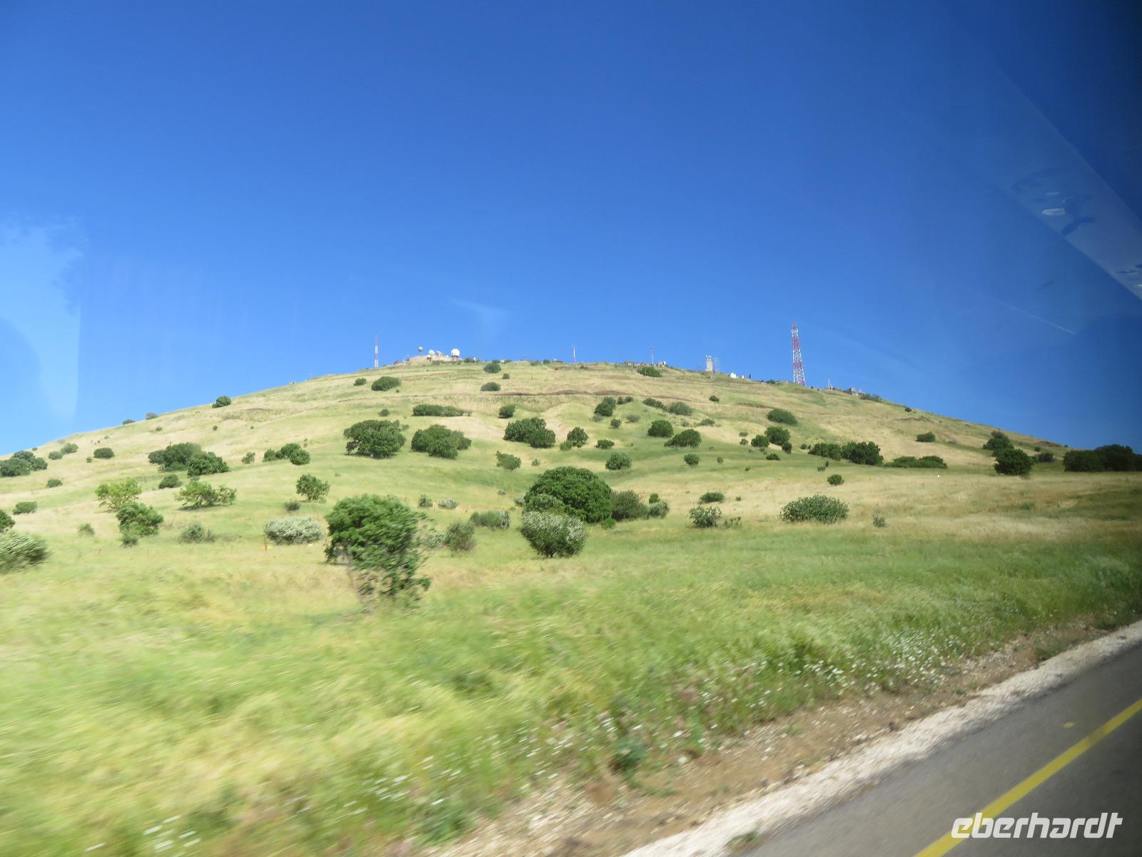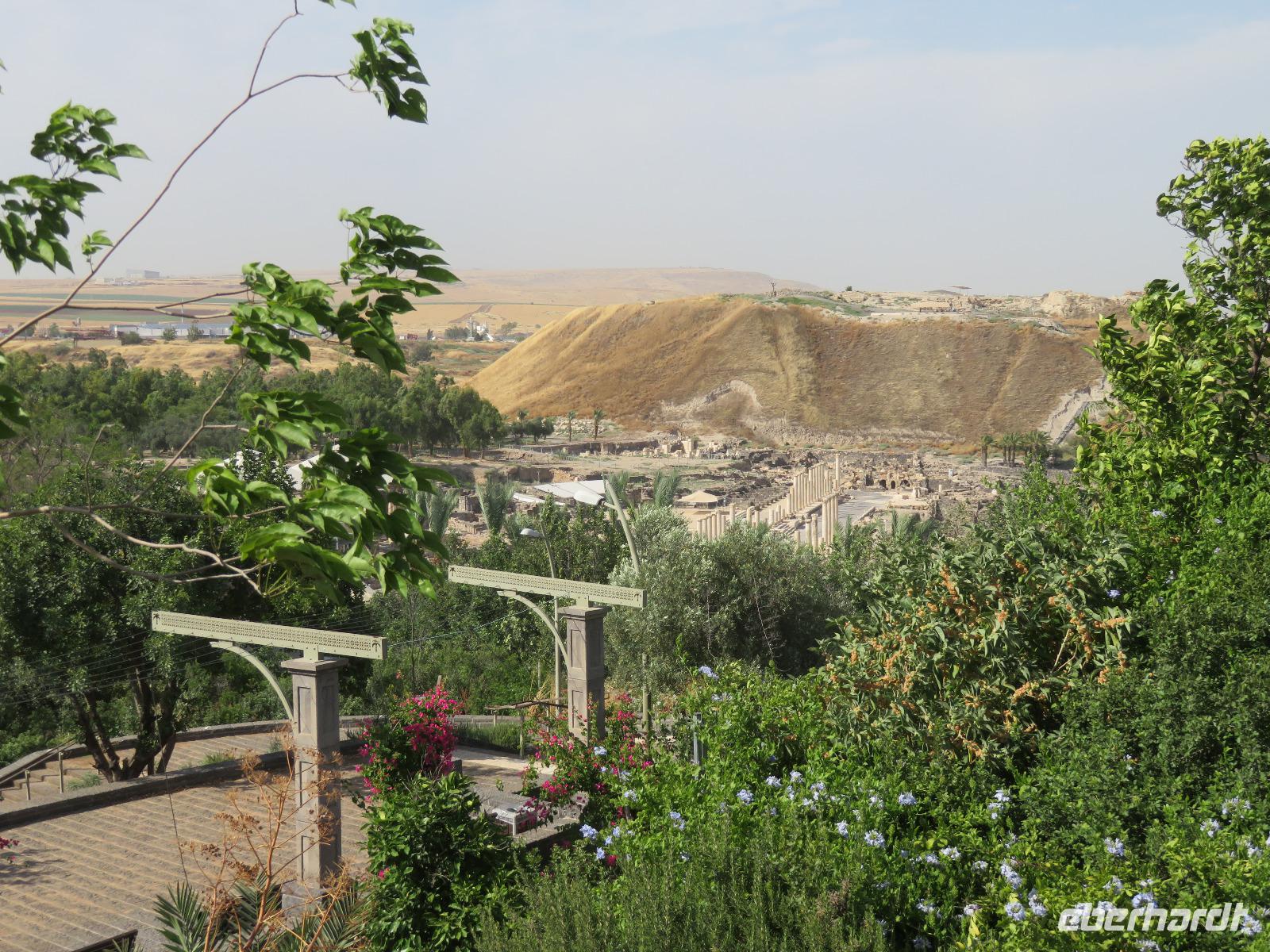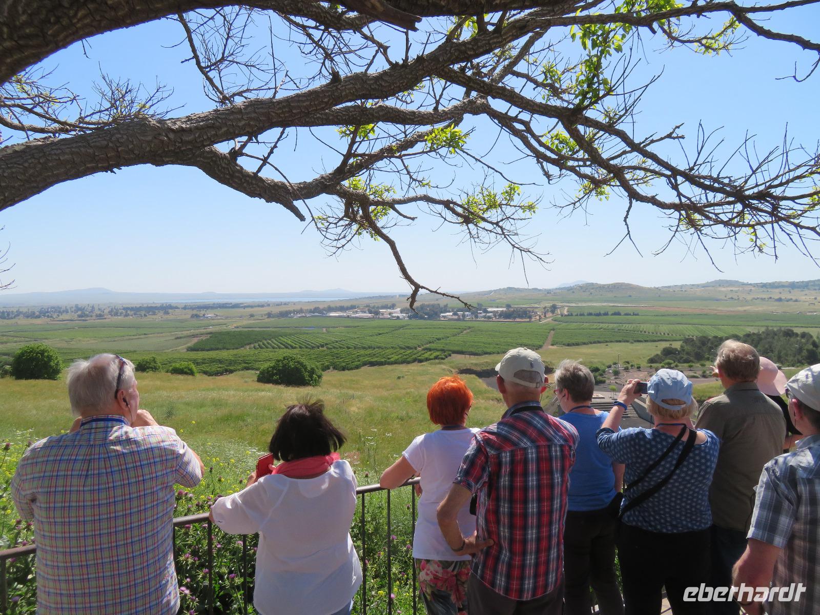 Unser heutiges Tagesprogramm führte uns von 200 Meter unter Null bis auf 1.000 Meter über Null. Wir fuhren durch grünes bergiges Land mit vielen Weinreben. Die Golanhöhen sind ebenfalls bekannt für den Anbau guter Weine. Den ersten Halt legten wir an der Grenze zu Syrien gegenüber dem Ort Quneitra ein. Ronit erklärte uns die Umstände der Situation, erwähnte den UN-stützpunkt, welcher direkt vor uns lag und wie der Golan von Israel annektiert wurde. Gespannt lauschten wir ihren Ausführungen und blickten über die Grenze hinweg. Unsere Fahrt führte uns durch mehrere kleine Drusendörfer, immer wieder könnten wir bis in die bergige Landschaft des Libanon blicken. Ronit erzählte von der beqegten Vergangenheit dieser Gegend, auch von den Angriffen 2006. Wir erreichten Banyas und besichtigten eine der üppig bewachsenen Quellen des Jordan-Flusses. Die blühenden Granatapfelbäume und das rauschende Wasser hielten uns im Bann. Ein weiterer Besichtigungspunkt erwartete uns in Tabgha. Hier besichtigten wir die berühmte Brotvermehrungskirche in der nach dem Matthäusevangelium die wundersame Brot- und Fischvermehrung bei der Speisung der Fünftausend stattfand. Da wir alle einen kleinen Hunger verspürten, kehrten wir im Anschluss Kinnereth ein um den berühmten St. Peter-Fisch zu essen. Wir reisten weiter nach Capernaum und besichtigten die Ruinen der Synagogen, in denen bereits zur Zeit Jesu gelehrt wurde. Eine kleine Eule bekam dabei ebenfalls unsere Aufmerksamkeit. Wir folgten weiter den biblischen Spuren immer entlang des Ufers des Sees Genezareth und fuhren hinauf zum Berg der Seligpreisung, wo Jesus seine berühmte Bergpredigt hielt. Schnell suchten wir uns ein schattiges Plätzchen und laßen diese bedeutungsvollen Verse aus der Bibel. Die anschließende Zeit besuchten wir die Kirche der Seligpreisungen, welche 1937 aus schwarzem Basalt und weißem Kalkgestein erbaut wurde. Abkühlung versprach eine Bootsfahrt auf dem See Genezareth. Entspannt ließen wir an Bord die Seele baumeln und tanzten am Ende sogar. Den ereignisreichen Tag ließen wir am Abend am Ufer des Sees in geselliger Runde ausklingen.