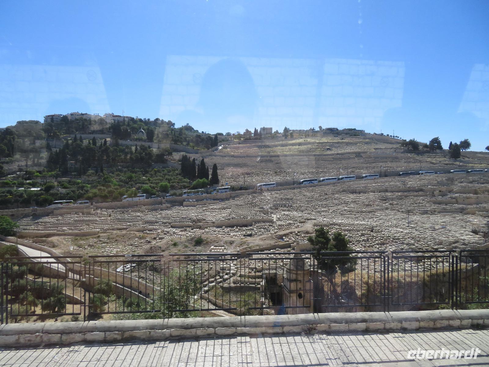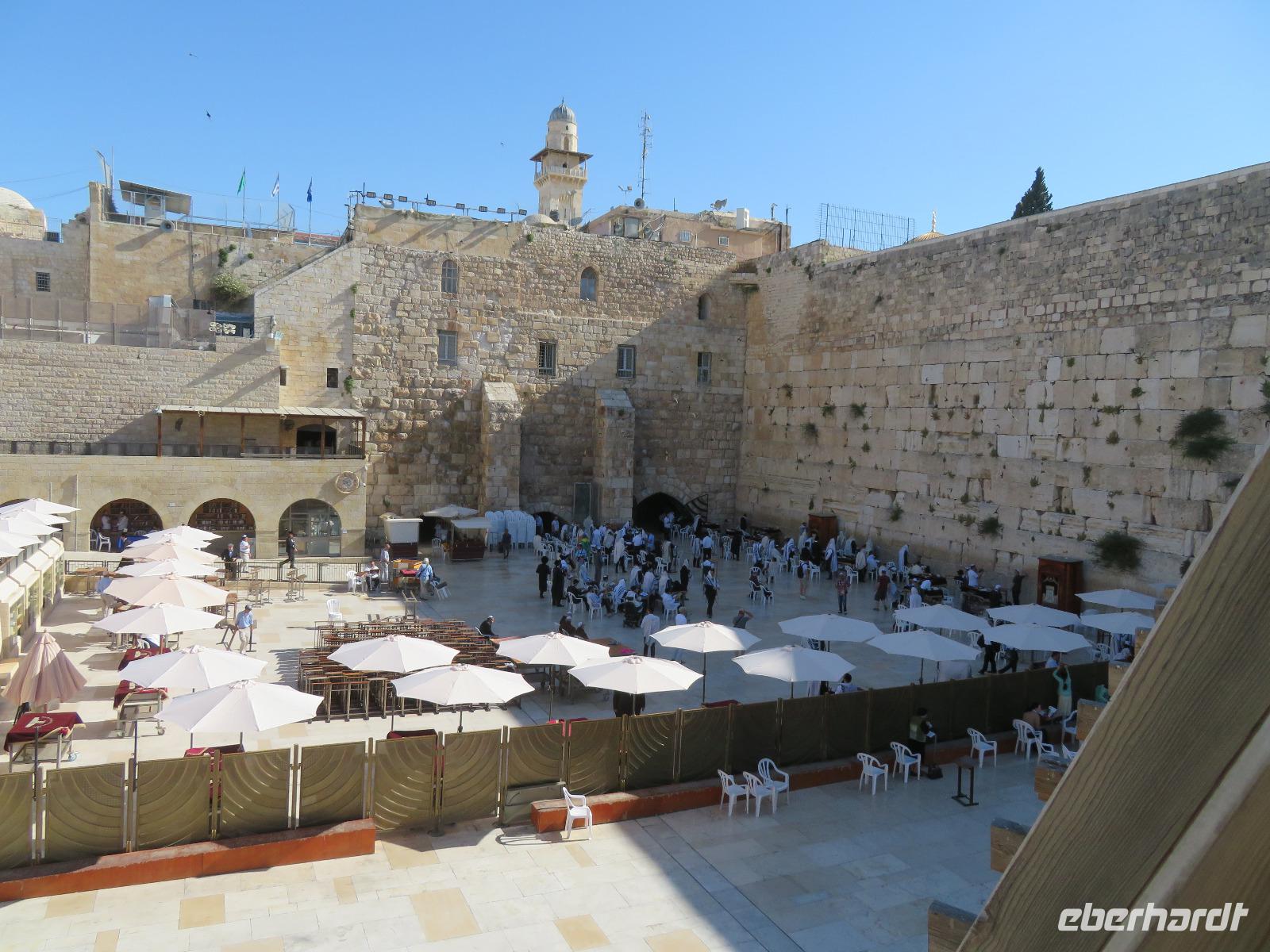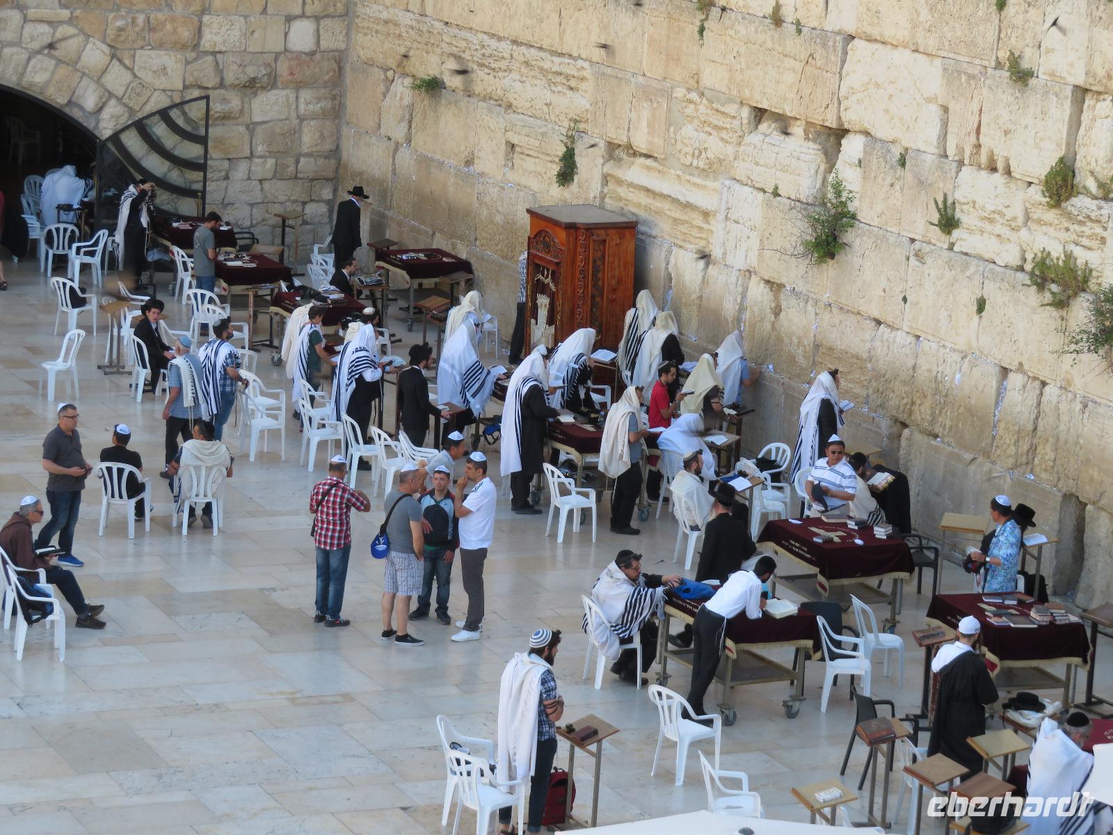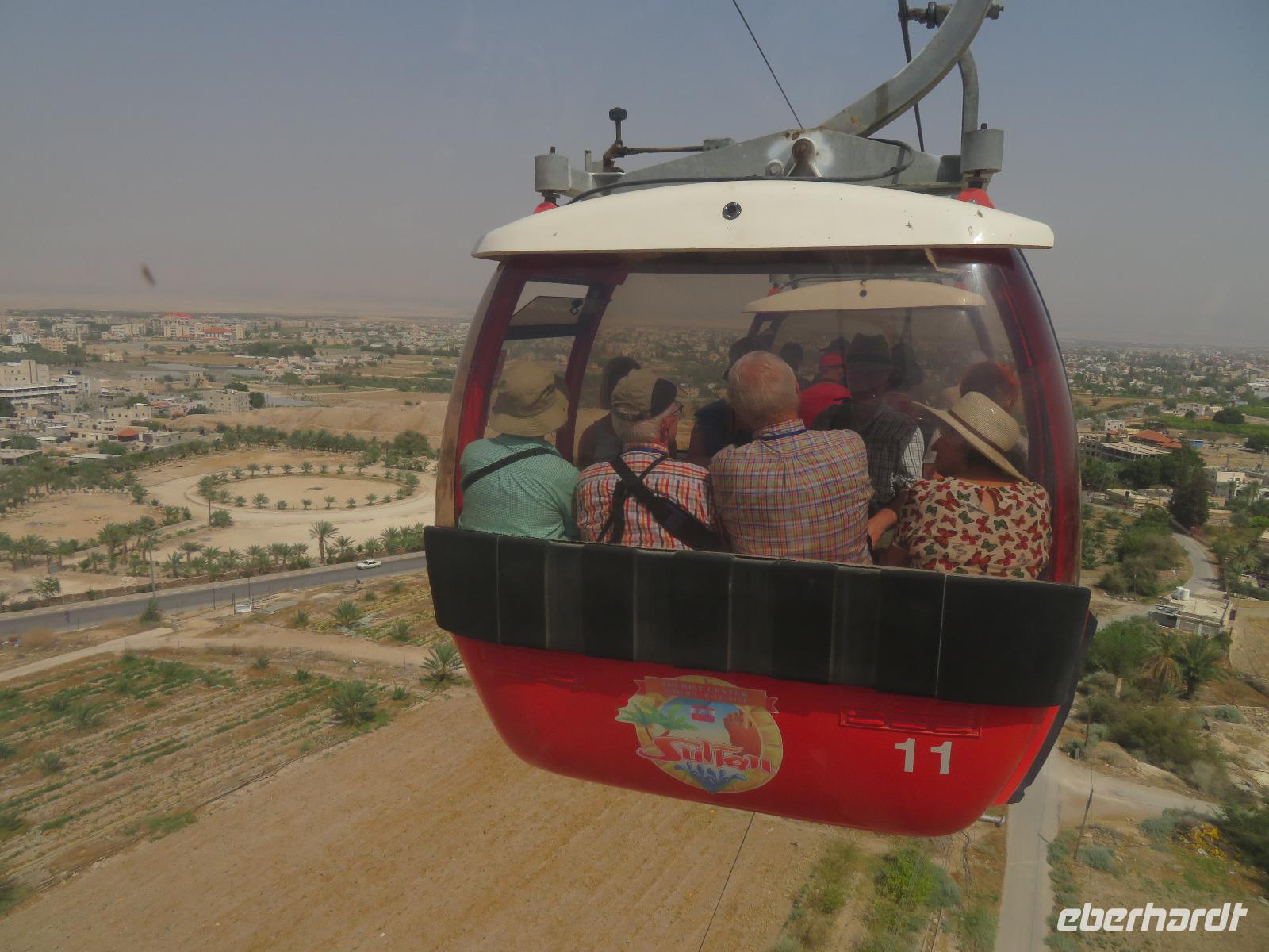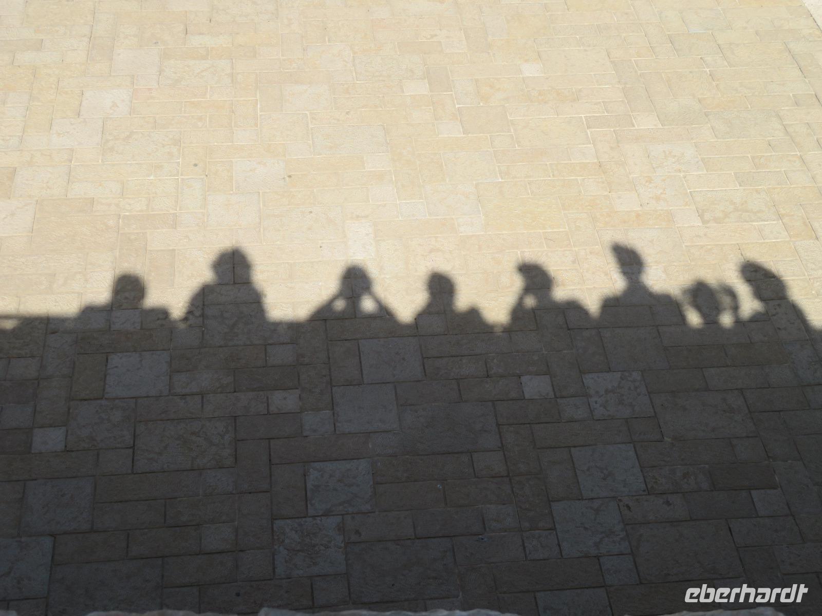 Wir wussten um die heilende Wirkung des Toten Meeres, so dass wir erfreut waren über den Halt in einer bekannten Kosmetikfabrik. Interessiert stöberten wir im reichhaltigen Angebot und nahmen für die Lieben zu Hause ein paar Mitbringsel mit. Anschließend setzten wir die Fahrt zu den Höhlen von Qumran fort, in denen zufällig 1947 ein Beduinenjunge die mittlerweile weltberühmten und jahrtausende alten Schriftrollen von Jesaja in mehreren Tonkrügen gefunden hatte. Die originalen Schriftrollen werden heute im Schrein des Buches im Israel-Museum in Jerusalem aufbewahrt. Die Ausgrabungsstätte, der uns gezeigte Film und die bildhaften Erklärungen von Ronit ließen uns gut erahnen, wie das Leben der Urchristen verlief und wie zufällig der Fund der Rollen war. Bevor wir nun die wahrscheinlich älteste Stadt der Welt besuchten, mussten wir uns leider von unserem lieb gewonnenen Busfahrer Ami verabschieden. Wir begrüßten seinen eingesprungenen Ersatzmann Josef und setzten die Fahrt in das Palästinensische Autonomiegebiet nach Jericho fort. Dort angekommen, stärkten wir uns mit typischen Speisen oder einem willkommenem kühlen Bier. Immerhin waren wieder enorm hohe Temperaturen von 42 °C auf dem Thermometer abzulesen. Erfrischt und munter bewanderten wir zusammen die Siedlungs-Ausgrabungen von Tell es-Sultan und sahen den Turm von Jericho, der älteste Steinturm der Welt, umgeben von alten runden Lehmziegelbauten. Ronit erklärte uns ebenfalls die biblische Geschichte zur Jericho-Trompete, nach deren Überlieferung der bloße Klang von Trompeten die gewaltigen Stadtmauern zum Einsturz gebracht haben sollen. Leider sollte das erstes Kind dessen sterben, der sie wieder aufbaut. Da wir nur Reste von Stadtmauern sahen, ließ der Wahrheitsgehalt Raum für viele Spekulationen. :-) Unser folgender Besichtigungspunkt war der Berg der Versuchung. Hier hat Jesus 40 Tage gefastet und während dieser Zeit den Veruchungen des Teufels widerstanden. Wir setzten uns in drei kleine abenteuerliche Gondeln und fuhren zum Berg hinauf. Das war dennoch noch nicht das finale Ziel. Vor uns lag ein steiler Weg zum Kloster hinauf, welches wie ein Wespennest am Fels zu kleben schien. Glücklich, oben angekommen zu sein, bestaunten wir das Kloster, die Höhle und die ehemalige Grotte, in der Jesus seine Fasten- und Gebetszeit verbracht haben soll. Eine andere Reisegruppe traf ebenfalls in der Kapelle ein und begann wunderschön zu singen. Gespannt hielten wir einen kurzen Moment still und lauschten gebannt. Der Abstieg wurde von einem wundervollem weitem Blick über die Palmenstadt belohnt. Nun fuhren auch wir singend mit der Seilbahn wieder hinab und stiegen gut gelaunt in unseren Bus. Auf dem Rückweg durch die judäische Wüste hielten wir im bekannten Kibbutz Ein Gedi und erhielten eine Führung im prächtigen Botanischen Garten, welcher über 900 verschiedene Pflanzen- und Baumarten beherbergt. Wieder im Hotel angekommen, entspannte jeder nach Lust und Laune bis zum Abendessen. Dieses war für uns Touristen sehr besonders, denn es war der Beginn des Sabbat. Der jüdische Ruhetag beginnt am Freitagabend mit dem Sabbatsegen, auch Kiddusch genannt sowie gutem Essen. Diesen Segensspruch über einem Glas Wein konnten wir bei vielen Hotelgästen neugierig beobachten. Gemeinsam ließen wir diesen anstrengenden Tag ausklingen.