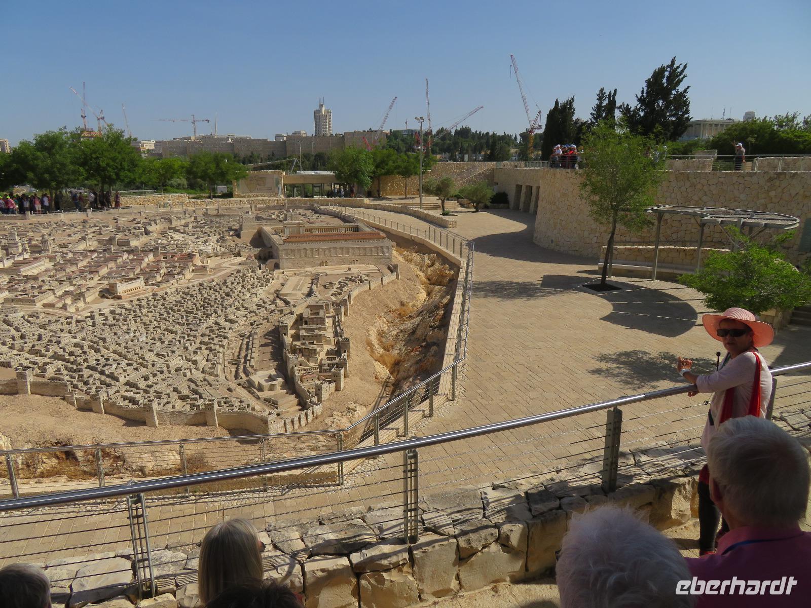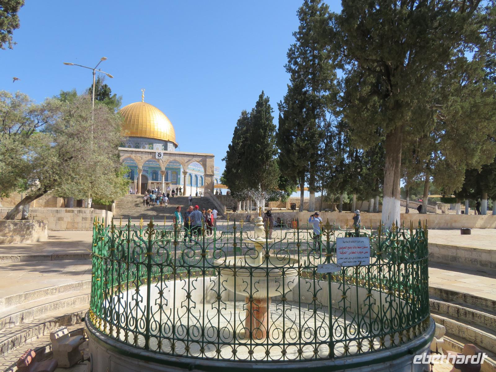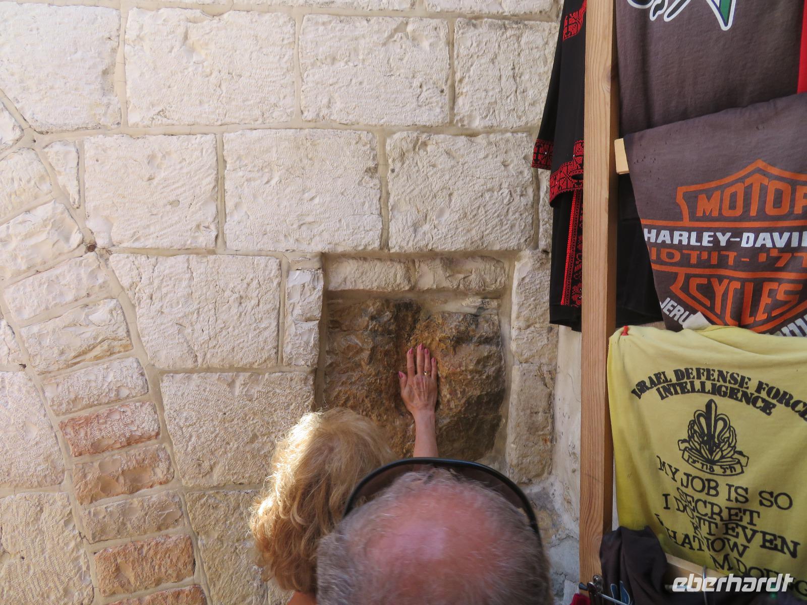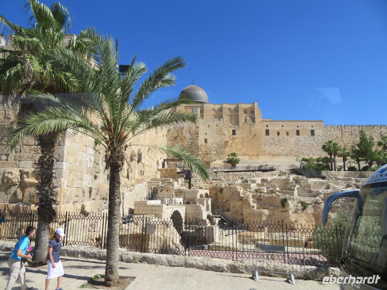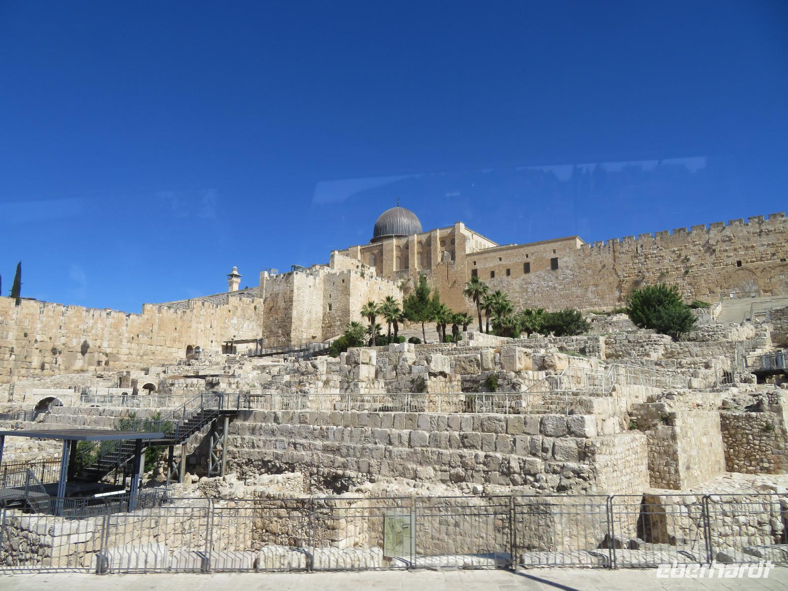 Wir wussten um die heilende Wirkung des Toten Meeres, so dass wir erfreut waren über den Halt in einer bekannten Kosmetikfabrik. Interessiert stöberten wir im reichhaltigen Angebot und nahmen für die Lieben zu Hause ein paar Mitbringsel mit. Anschließend setzten wir die Fahrt zu den Höhlen von Qumran fort, in denen zufällig 1947 ein Beduinenjunge die mittlerweile weltberühmten und jahrtausende alten Schriftrollen von Jesaja in mehreren Tonkrügen gefunden hatte. Die originalen Schriftrollen werden heute im Schrein des Buches im Israel-Museum in Jerusalem aufbewahrt. Die Ausgrabungsstätte, der uns gezeigte Film und die bildhaften Erklärungen von Ronit ließen uns gut erahnen, wie das Leben der Urchristen verlief und wie zufällig der Fund der Rollen war. Bevor wir nun die wahrscheinlich älteste Stadt der Welt besuchten, mussten wir uns leider von unserem lieb gewonnenen Busfahrer Ami verabschieden. Wir begrüßten seinen eingesprungenen Ersatzmann Josef und setzten die Fahrt in das Palästinensische Autonomiegebiet nach Jericho fort. Dort angekommen, stärkten wir uns mit typischen Speisen oder einem willkommenem kühlen Bier. Immerhin waren wieder enorm hohe Temperaturen von 42 °C auf dem Thermometer abzulesen. Erfrischt und munter bewanderten wir zusammen die Siedlungs-Ausgrabungen von Tell es-Sultan und sahen den Turm von Jericho, der älteste Steinturm der Welt, umgeben von alten runden Lehmziegelbauten. Ronit erklärte uns ebenfalls die biblische Geschichte zur Jericho-Trompete, nach deren Überlieferung der bloße Klang von Trompeten die gewaltigen Stadtmauern zum Einsturz gebracht haben sollen. Leider sollte das erstes Kind dessen sterben, der sie wieder aufbaut. Da wir nur Reste von Stadtmauern sahen, ließ der Wahrheitsgehalt Raum für viele Spekulationen. :-) Unser folgender Besichtigungspunkt war der Berg der Versuchung. Hier hat Jesus 40 Tage gefastet und während dieser Zeit den Veruchungen des Teufels widerstanden. Wir setzten uns in drei kleine abenteuerliche Gondeln und fuhren zum Berg hinauf. Das war dennoch noch nicht das finale Ziel. Vor uns lag ein steiler Weg zum Kloster hinauf, welches wie ein Wespennest am Fels zu kleben schien. Glücklich, oben angekommen zu sein, bestaunten wir das Kloster, die Höhle und die ehemalige Grotte, in der Jesus seine Fasten- und Gebetszeit verbracht haben soll. Eine andere Reisegruppe traf ebenfalls in der Kapelle ein und begann wunderschön zu singen. Gespannt hielten wir einen kurzen Moment still und lauschten gebannt. Der Abstieg wurde von einem wundervollem weitem Blick über die Palmenstadt belohnt. Nun fuhren auch wir singend mit der Seilbahn wieder hinab und stiegen gut gelaunt in unseren Bus. Auf dem Rückweg durch die judäische Wüste hielten wir im bekannten Kibbutz Ein Gedi und erhielten eine Führung im prächtigen Botanischen Garten, welcher über 900 verschiedene Pflanzen- und Baumarten beherbergt. Wieder im Hotel angekommen, entspannte jeder nach Lust und Laune bis zum Abendessen. Dieses war für uns Touristen sehr besonders, denn es war der Beginn des Sabbat. Der jüdische Ruhetag beginnt am Freitagabend mit dem Sabbatsegen, auch Kiddusch genannt sowie gutem Essen. Diesen Segensspruch über einem Glas Wein konnten wir bei vielen Hotelgästen neugierig beobachten. Gemeinsam ließen wir diesen anstrengenden Tag ausklingen.