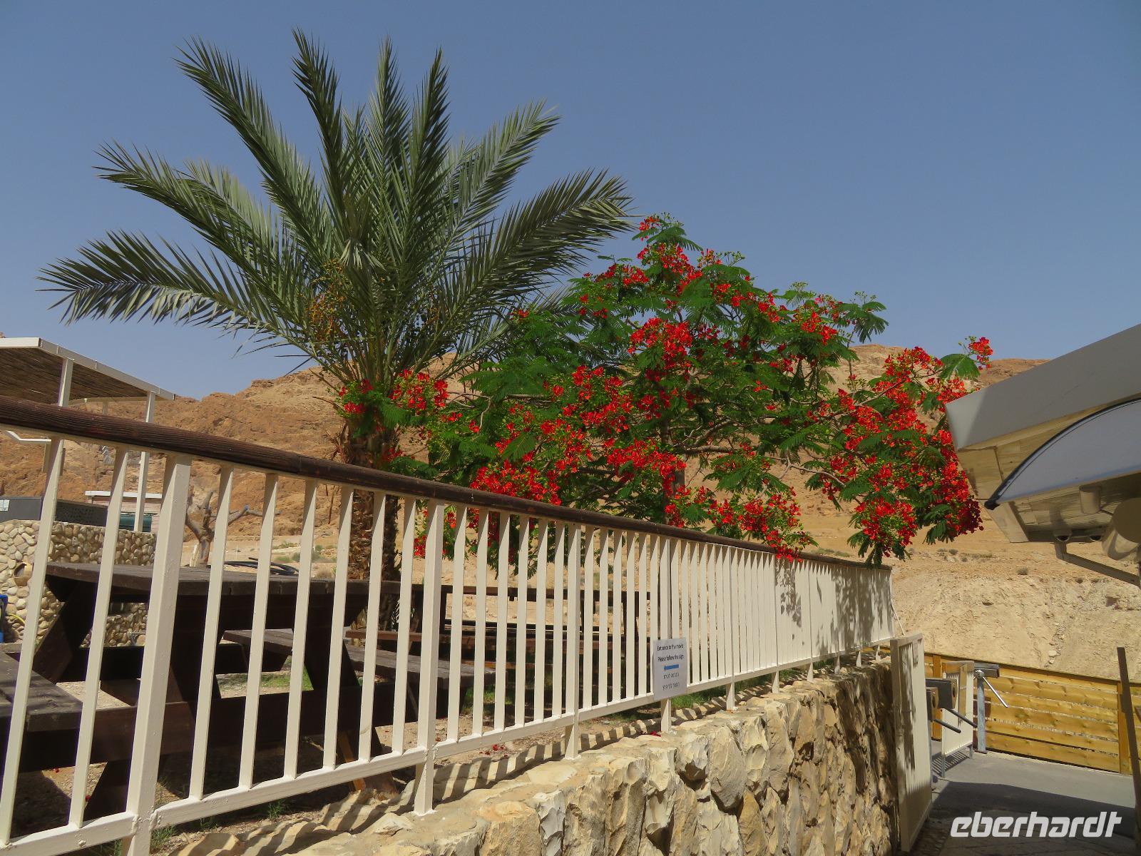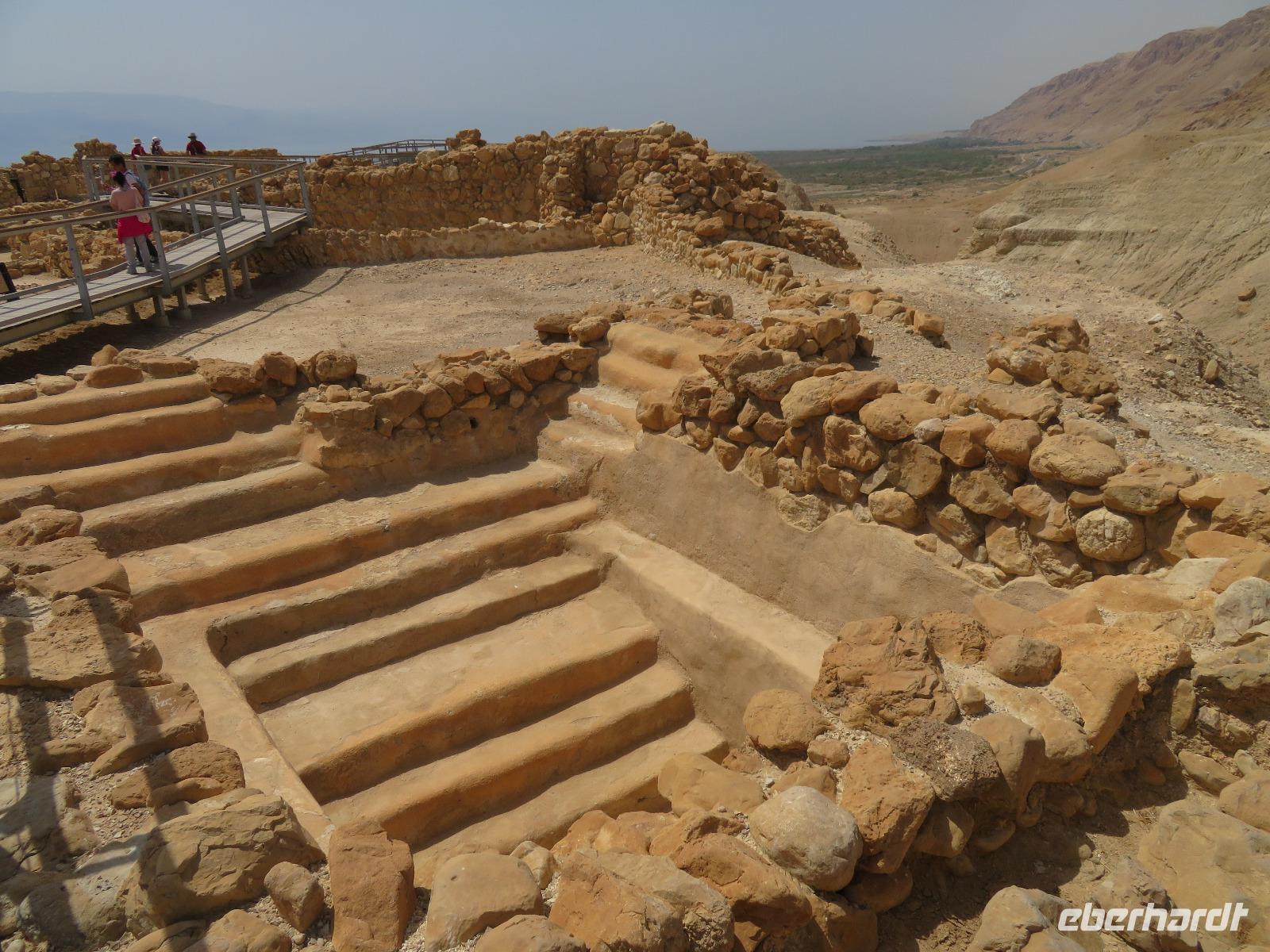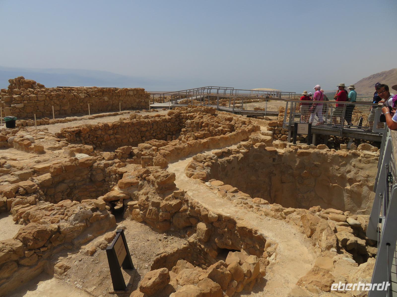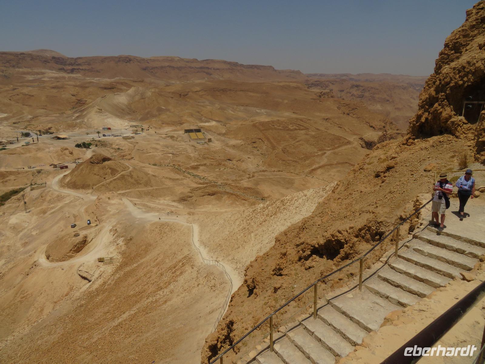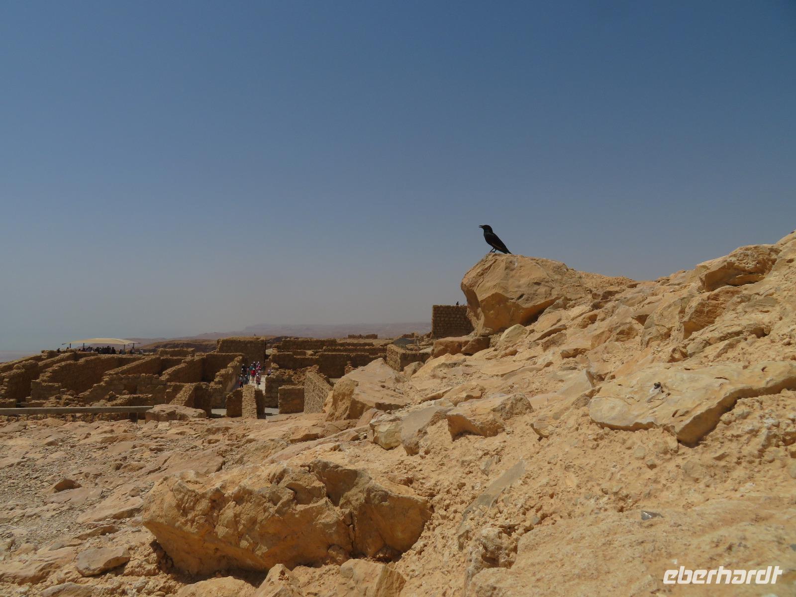 Der erste Morgen am Toten Meer. Langsam kam die Sonne hinter den gegenüber liegenden Bergen Jordaniens zum Vorschein. Der Tag versprach wieder sehr warm zu werden. Gestärkt vom reichhaltigen Frühstück fuhren wir zur imposanten Felsenfestung von Massada. Per Seilbahn erreichten wir den gigantischen Festungsbau auf einem Felsplateau, welchen Herodes als Schutz vor seinen jüdischen Feinden und Kleopatra erbauen ließ. Er selbst weilte aber nur ein einziges mal an diesem Ort. Nicht nur die einzigartige Aussicht auf die umliegende Wüste und das Tote Meer, auch die bewegte Geschichte verzweifelt kämpfender Juden beeindruckte uns. Im Jahr 70 n. Chr. eroberten die Römer Jerusalem und begannen mit der Belagerung Massadas, da sich dort jüdische Rebellen verschanzten. Diese Belagerungsplätze und Erdwälle konnten wir noch immer vom Plateau aus erkennen. Um nicht in die Hände der römischen Feinde zu gelangen, verübte ein Rest von ca. 1.000 Eingeschlossenen kollektiven Selbstmord. Mit diesen und weiteren Ausführungen leitete uns Ronit über das Plateau durch den ehemaligen Palast, Empfangsräumen mit wunderschönen Mosaikböden, Badeanlagen und erklärte uns das ausgeklügelte Zisternen-System. Die Sonne stand hoch am Himmel und zeigte uns mit aller Kraft, was sie kann. So waren wir doch etwas froh, als wir den Abstieg über die Römerrampe zum klimatisierten Bus antraten. Ami wartete bereits auf uns, so dass wir gleich zu einem Beduinendorf fahren konnten. Dort erwartete uns eine sehr nette Beduinenfrau, welche uns mit vielen Ausführungen zum traditionellen Leben in der Wüste bei Kaffee und Tee unterhielt. Nachdem wir wieder typisch israelisch zu Mittag aßen, traten wir den Rückweg zum Hotel an. Nun konnten wir endlich das vielen bekannte, aber noch nicht selbst probierte Schweben im Wasser ausprobieren. Begeistert ließen wir uns im warmen Wasser treiben. Der Ein oder Andere versuchte auch "richtig" zu schwimmen, was allerdings in tauchen endete. Dies ist aber bei einem Salzgehalt von 30% nicht zu empfehlen. Unversehrt trafen wir uns alle beim Abendessen im Hotel und ließen den ereignisreichen Tag gemeinsam ausklingen.