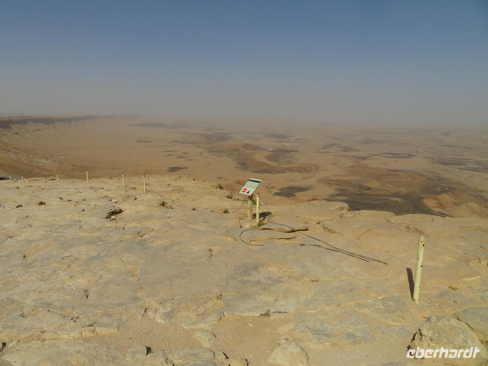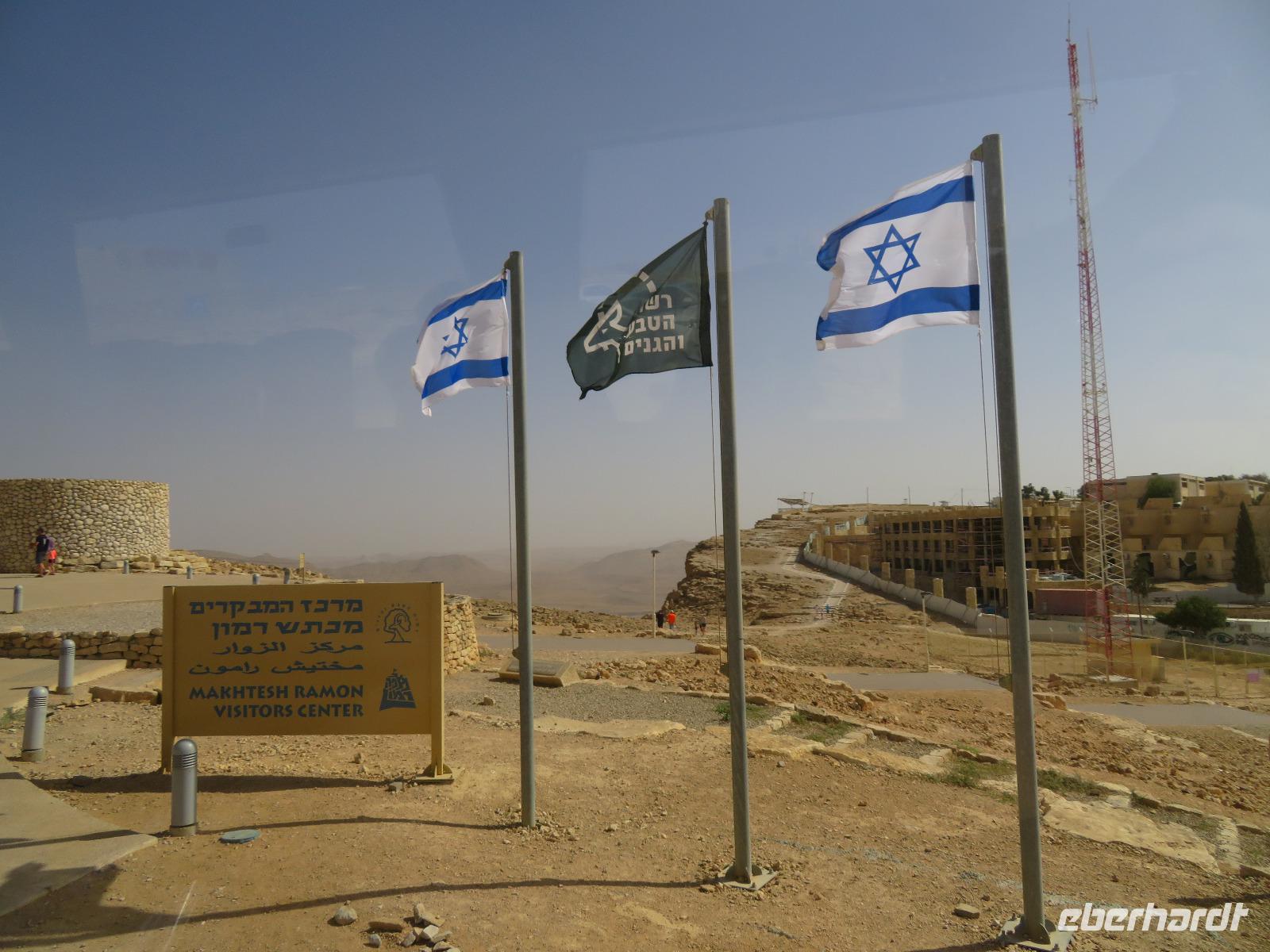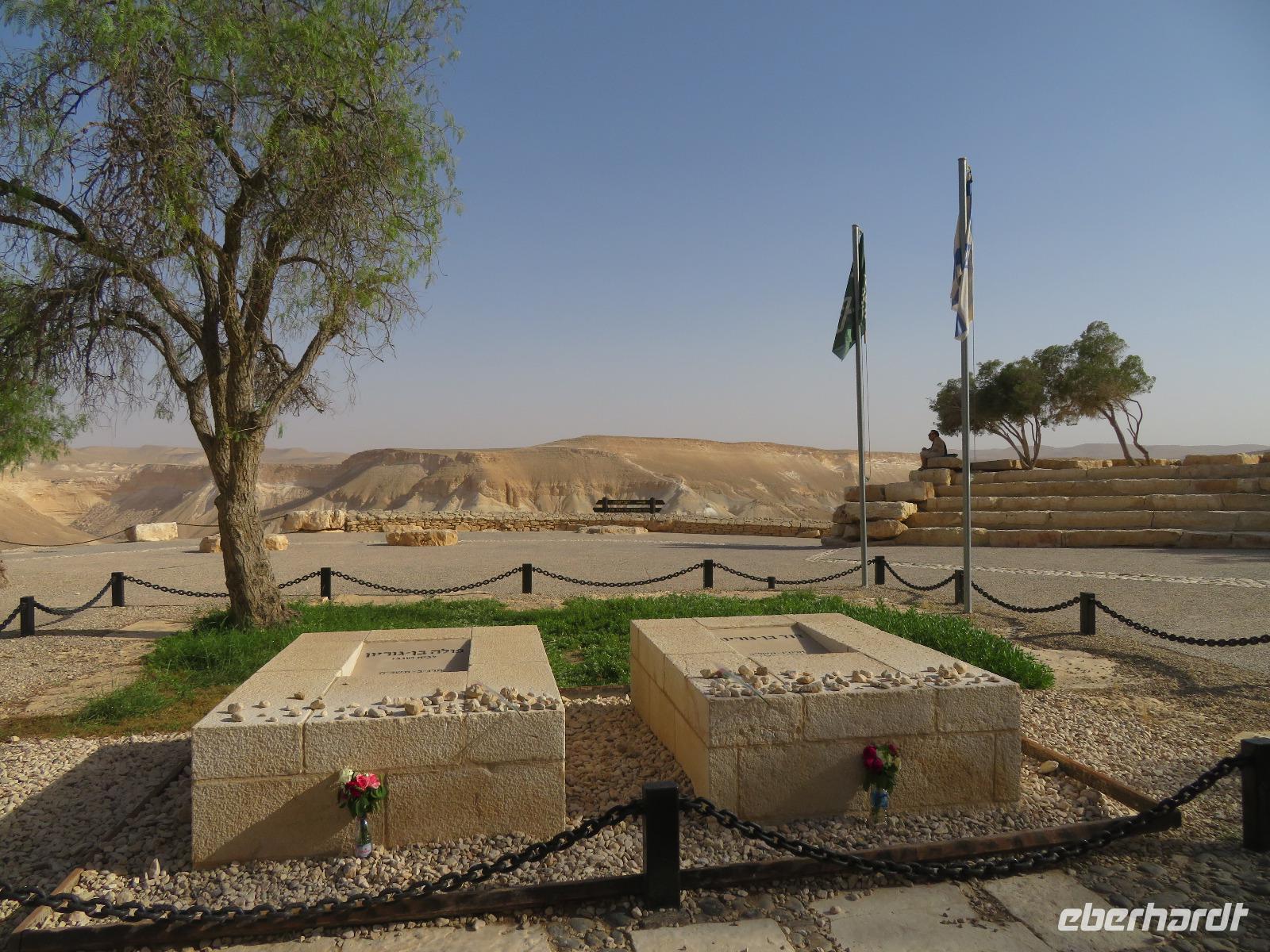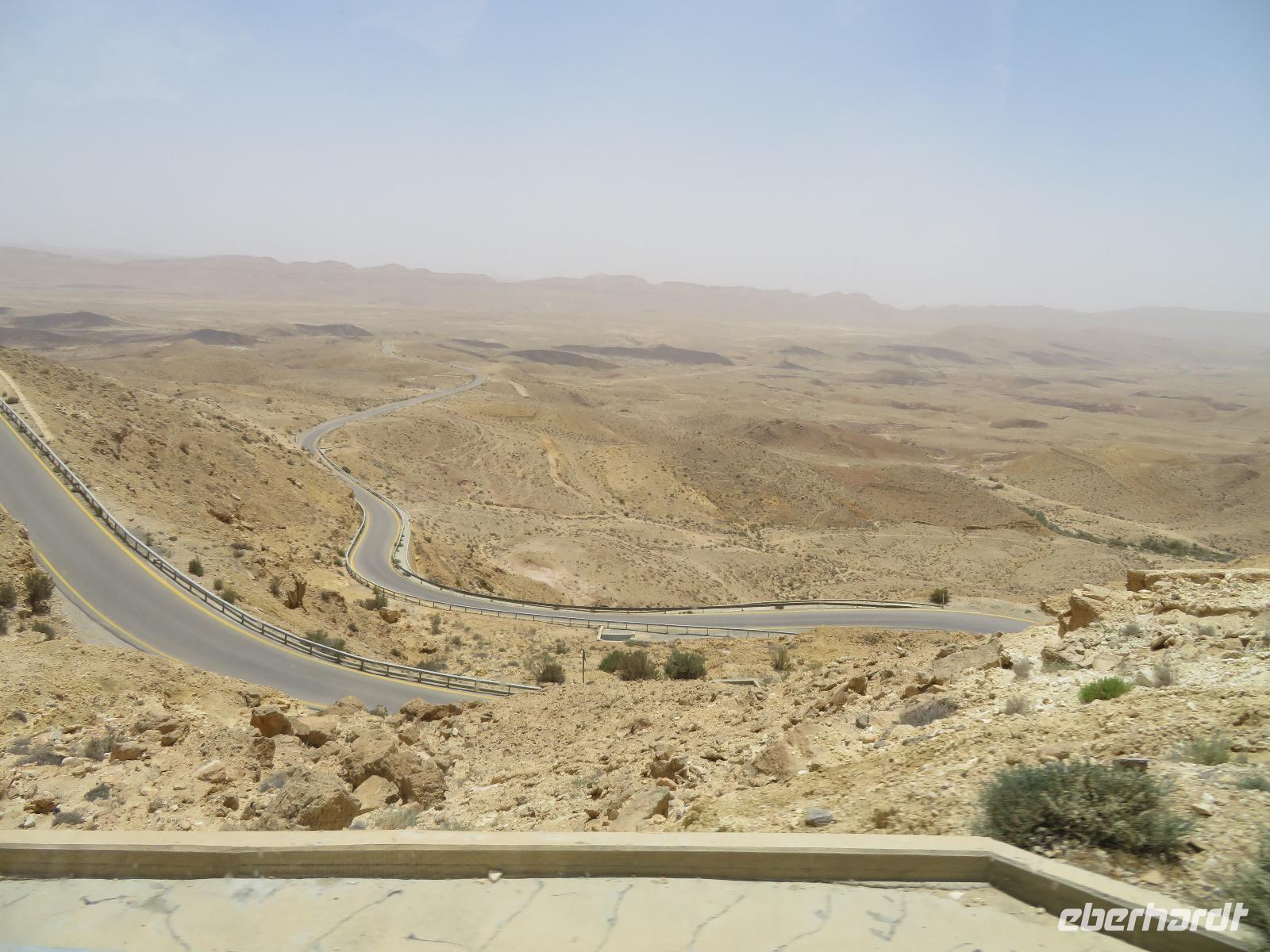 Nach diesem tollen Start in den Tag und einem guten Frühstück verabschiedeten wir uns vom bekanntesten Salzsee der Welt und fuhren Richtung Süden in die karge Negev-Wüste. Die pflanzenlose Felsenwüste bedeckt 60 % von Israel sollte uns heute den ganzen Tag begleiten. Wir hielten zunächst am kleinen Krater und blickten in eine schier endlose gelb-orange Wüstenlandschaft. Auf unserer Weiterfahrt entdeckten wir ein merkwürdiges weißes Flugobjekt am Himmel. Wie sich später herausstellte, handelte es sich um einen Überwachungsballon eines israelischen Kernforschungszentrums. Unsere Wüstenpanoramafahrt führte uns weiter durch die faszinierende farbenfrohe Landschaft zum großen Krater. Wir stoppten und entdeckten eine Farbenpracht in den Gesteinen, die wir in einer solchen Art und Weise nicht erwartet hätten. Neugierig liefen wir zu den farbigen Stellen und sammelten Sand in Gelb-, Orange- und Violett-Tönen als Souvenir ein. Der Fotostsopp hieß Kholot Tsivoniyim und begeisterte uns alle. Für unsere Mittagspause hielten wir im Besucherzentrum und stärkten uns für den weiteren Tag. Fast Food auf israelische Art war auch etwas neues für uns. Anschließend besuchten wir die sehr gut erhaltenen Ruinen der alten Nabatäerstadt Avdat, welche ihren Ursprung im 4. Jahrhundert v. Chr. hatte und große Bedeutung erlangte, da sie Treffpunkt zweier Handelsstraßen war. Die Aussicht vom Plateau war wirklich beeindruckend. Noch beeindruckender sollte aber der Ausblick unserer nächsten Station werden. Wir erreichten Mitzpe Ramon und vor uns eröffnete sich der riesige Krater des weltweit größten Erosionskraters Makhtesh Ramon. Er ist unglaubliche 40 Kilometer lang und bis zu 10 Kilometern breit. Wir standen am Kraterrand, nur ein paar Schritte trennten uns von der gefährlichen Tiefe, und schauten erneut in eine überwältigende Landschaft. Am Tag zuvor bekamen Ronit und Franzi wundervoll duftende Rosen geschenkt und die sollten nun einen neuen Platz erhalten. Wir verließen Mitzpe Ramon, sahen im letzten Moment sogar noch ein paar Steinböcke und fuhren zum Moausoleum von David Ben Gurion, Staatsgründer Israels, und seiner Frau im Kibbutz Sede Boker. Im Halbkreis versammelt, lauschten wir Ronits Erzählungen über das Leben und Wirken des einstigen Politikers und genossen dabei erneut einen unvergleichen Blick auf die angrenzenden Berge der Negev-Wüste. Anschließend verließen wir den Süden Israels und bevor wir die Heilige Stadt erreichten, machten wir einen kurzen Sabbat-bedingten Abstecher ans Mittelmeer in die Hafenstadt Aschdod. Erneut sahen wir die Sonne am Horizont im Meer verschwinden. Spät am Abend erreichten wir unseren Kibbutz in Jerusalem und fielen erschöpft vom langen Tag aber mit vielen neuen Eindrücken in unsere Betten.