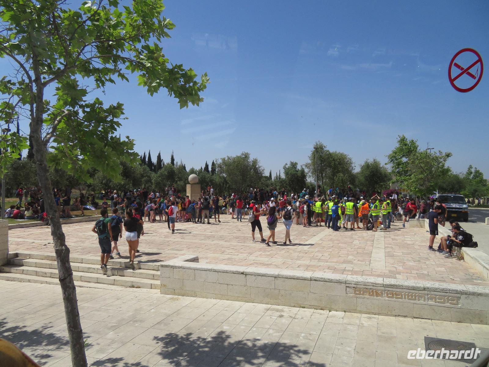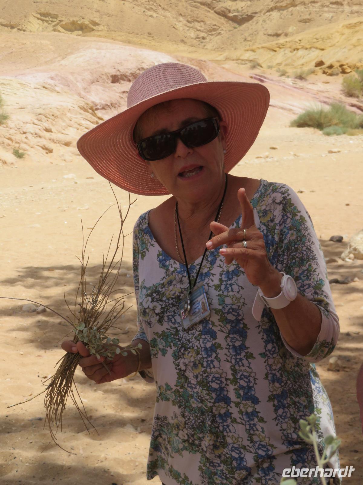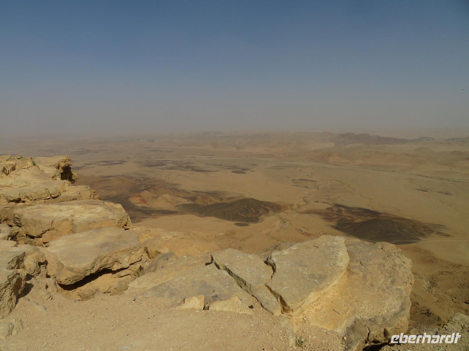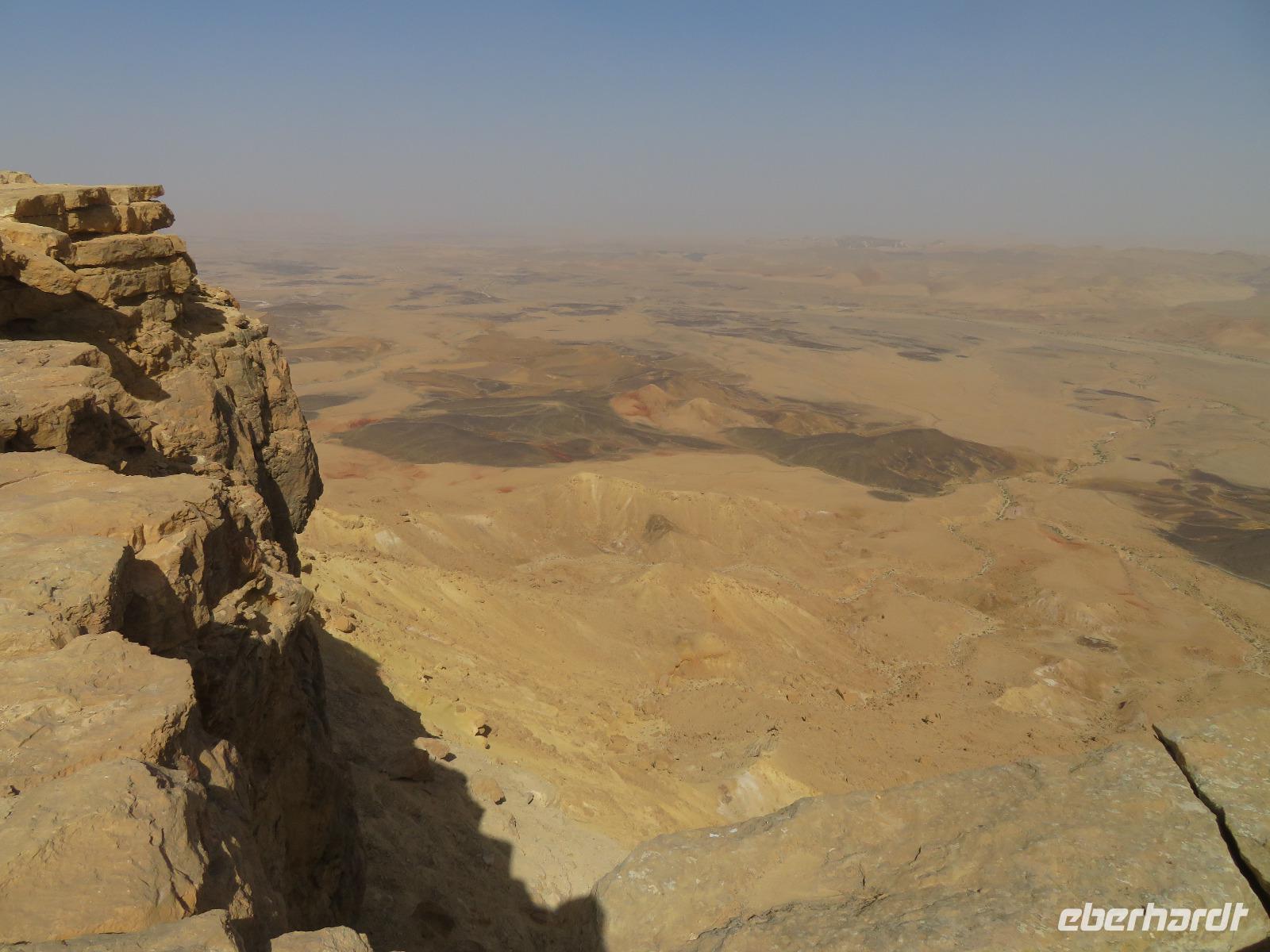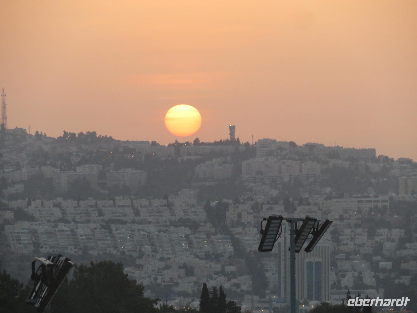 Nach diesem tollen Start in den Tag und einem guten Frühstück verabschiedeten wir uns vom bekanntesten Salzsee der Welt und fuhren Richtung Süden in die karge Negev-Wüste. Die pflanzenlose Felsenwüste bedeckt 60 % von Israel sollte uns heute den ganzen Tag begleiten. Wir hielten zunächst am kleinen Krater und blickten in eine schier endlose gelb-orange Wüstenlandschaft. Auf unserer Weiterfahrt entdeckten wir ein merkwürdiges weißes Flugobjekt am Himmel. Wie sich später herausstellte, handelte es sich um einen Überwachungsballon eines israelischen Kernforschungszentrums. Unsere Wüstenpanoramafahrt führte uns weiter durch die faszinierende farbenfrohe Landschaft zum großen Krater. Wir stoppten und entdeckten eine Farbenpracht in den Gesteinen, die wir in einer solchen Art und Weise nicht erwartet hätten. Neugierig liefen wir zu den farbigen Stellen und sammelten Sand in Gelb-, Orange- und Violett-Tönen als Souvenir ein. Der Fotostsopp hieß Kholot Tsivoniyim und begeisterte uns alle. Für unsere Mittagspause hielten wir im Besucherzentrum und stärkten uns für den weiteren Tag. Fast Food auf israelische Art war auch etwas neues für uns. Anschließend besuchten wir die sehr gut erhaltenen Ruinen der alten Nabatäerstadt Avdat, welche ihren Ursprung im 4. Jahrhundert v. Chr. hatte und große Bedeutung erlangte, da sie Treffpunkt zweier Handelsstraßen war. Die Aussicht vom Plateau war wirklich beeindruckend. Noch beeindruckender sollte aber der Ausblick unserer nächsten Station werden. Wir erreichten Mitzpe Ramon und vor uns eröffnete sich der riesige Krater des weltweit größten Erosionskraters Makhtesh Ramon. Er ist unglaubliche 40 Kilometer lang und bis zu 10 Kilometern breit. Wir standen am Kraterrand, nur ein paar Schritte trennten uns von der gefährlichen Tiefe, und schauten erneut in eine überwältigende Landschaft. Am Tag zuvor bekamen Ronit und Franzi wundervoll duftende Rosen geschenkt und die sollten nun einen neuen Platz erhalten. Wir verließen Mitzpe Ramon, sahen im letzten Moment sogar noch ein paar Steinböcke und fuhren zum Moausoleum von David Ben Gurion, Staatsgründer Israels, und seiner Frau im Kibbutz Sede Boker. Im Halbkreis versammelt, lauschten wir Ronits Erzählungen über das Leben und Wirken des einstigen Politikers und genossen dabei erneut einen unvergleichen Blick auf die angrenzenden Berge der Negev-Wüste. Anschließend verließen wir den Süden Israels und bevor wir die Heilige Stadt erreichten, machten wir einen kurzen Sabbat-bedingten Abstecher ans Mittelmeer in die Hafenstadt Aschdod. Erneut sahen wir die Sonne am Horizont im Meer verschwinden. Spät am Abend erreichten wir unseren Kibbutz in Jerusalem und fielen erschöpft vom langen Tag aber mit vielen neuen Eindrücken in unsere Betten.