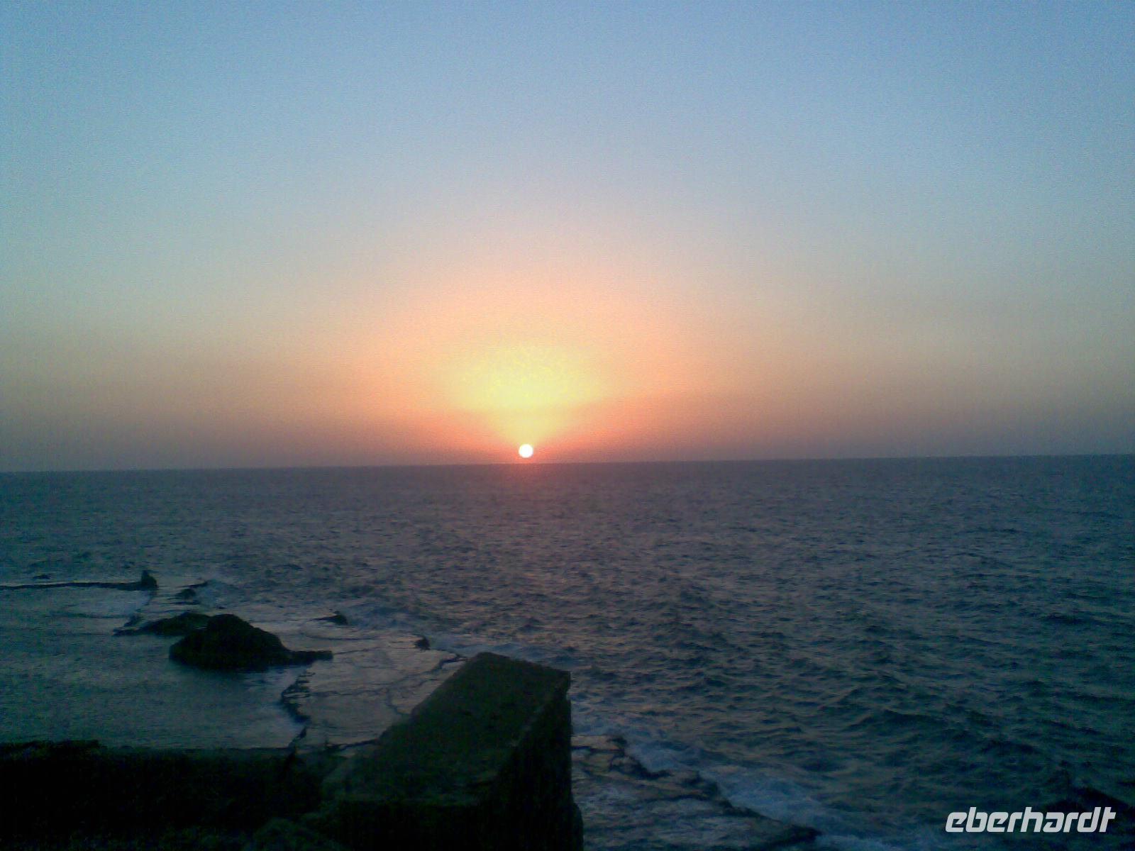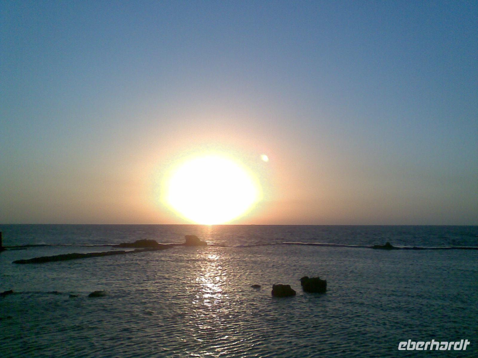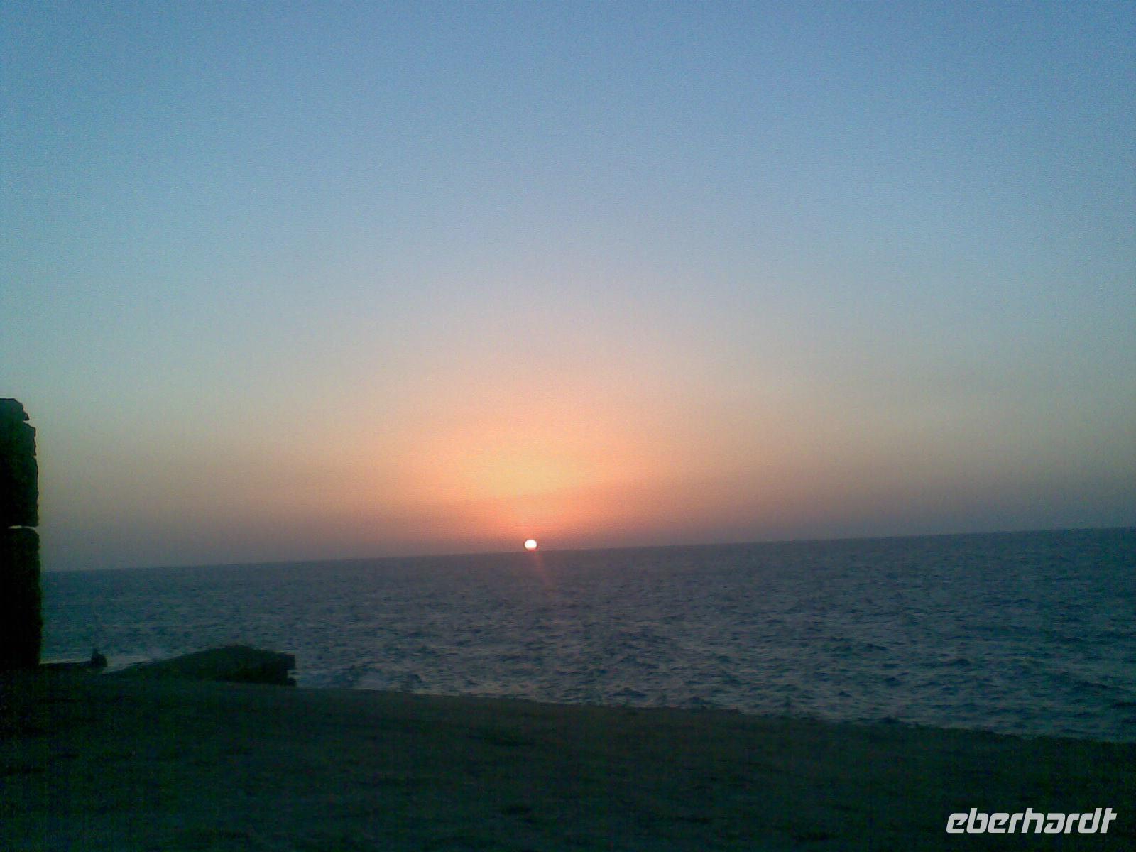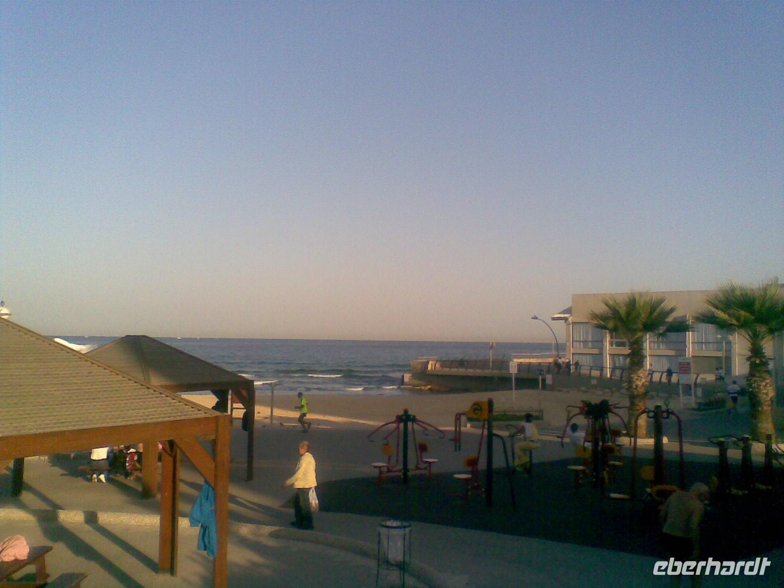 Unser Hotel lag übrigens nur wenige Gehminuten vom Strand entfernt. Das erste Abendessen in Israel genossen wir dann in einem typisch koscheren Restaurant. Das hebräische Wort “koscher” bezeichnet Gerichte, die in Übereinstimmung mit jüdischen Religionsgesetzen zubereitet sind. Dazu gehört beispielsweise, dass Milch und Milchprodukte nicht zusammen mit Fleischgerichten serviert werden. Es gab für uns unter anderem Falafel, das sind frittierte Kichererbsenbällchen mit Salat und Pita-Brot. Ilan zeigte uns nach dem Abendessen noch Yafo - vom Hafen aus erscheint die Kulisse von Yafo wie eine Märchenstadt aus Tausendundeiner Nacht: übereinander gebaute und geggeneinander versetzte Mauern, Türme, Dachkonstruktionen und Erker bilden einen Stadtteil mit malerischen Gassen. Japhet, Noahs jüngster Sohn, gab der Stadt ihren Namen. Zur Zeit der Kreuzfahrer wurde sie zur Festung ausgebaut und "Joppa" genannt. Nachdem Napoleon sie 1799 vollständig zerstört hatte, bauten die Türken sie wieder auf. Nach diesem kurzen Abstecher ging es zurück zum Hotel, denn die meisten von uns waren nun doch etwas müde - wir waren ja nun auch schon den ganzen Tag unterwegs!