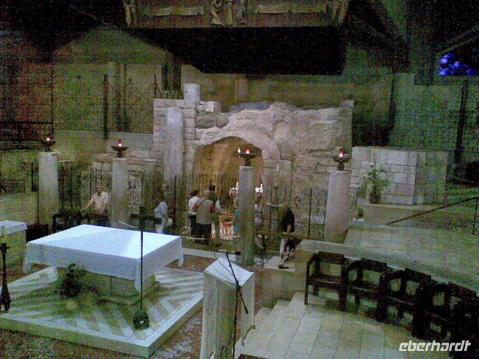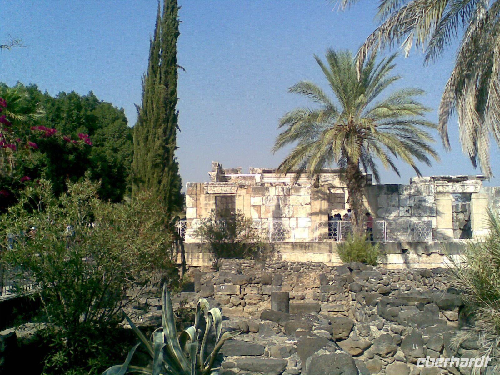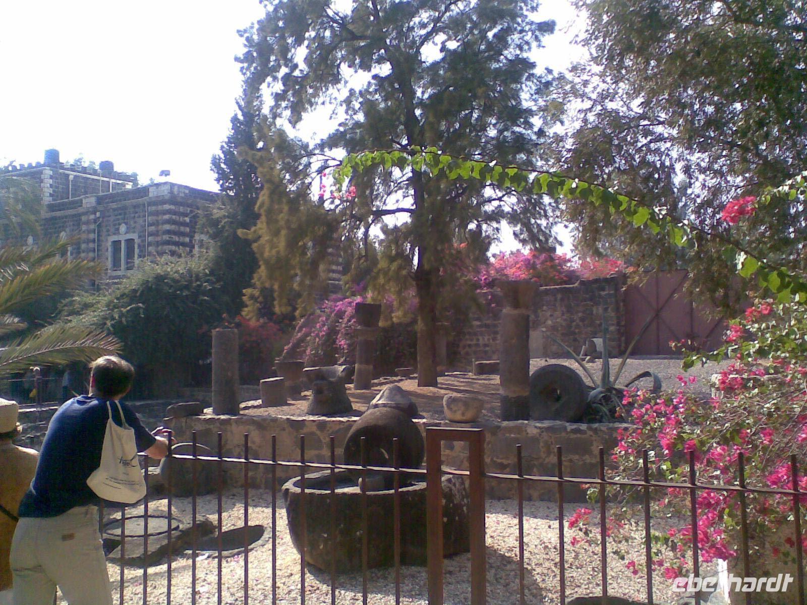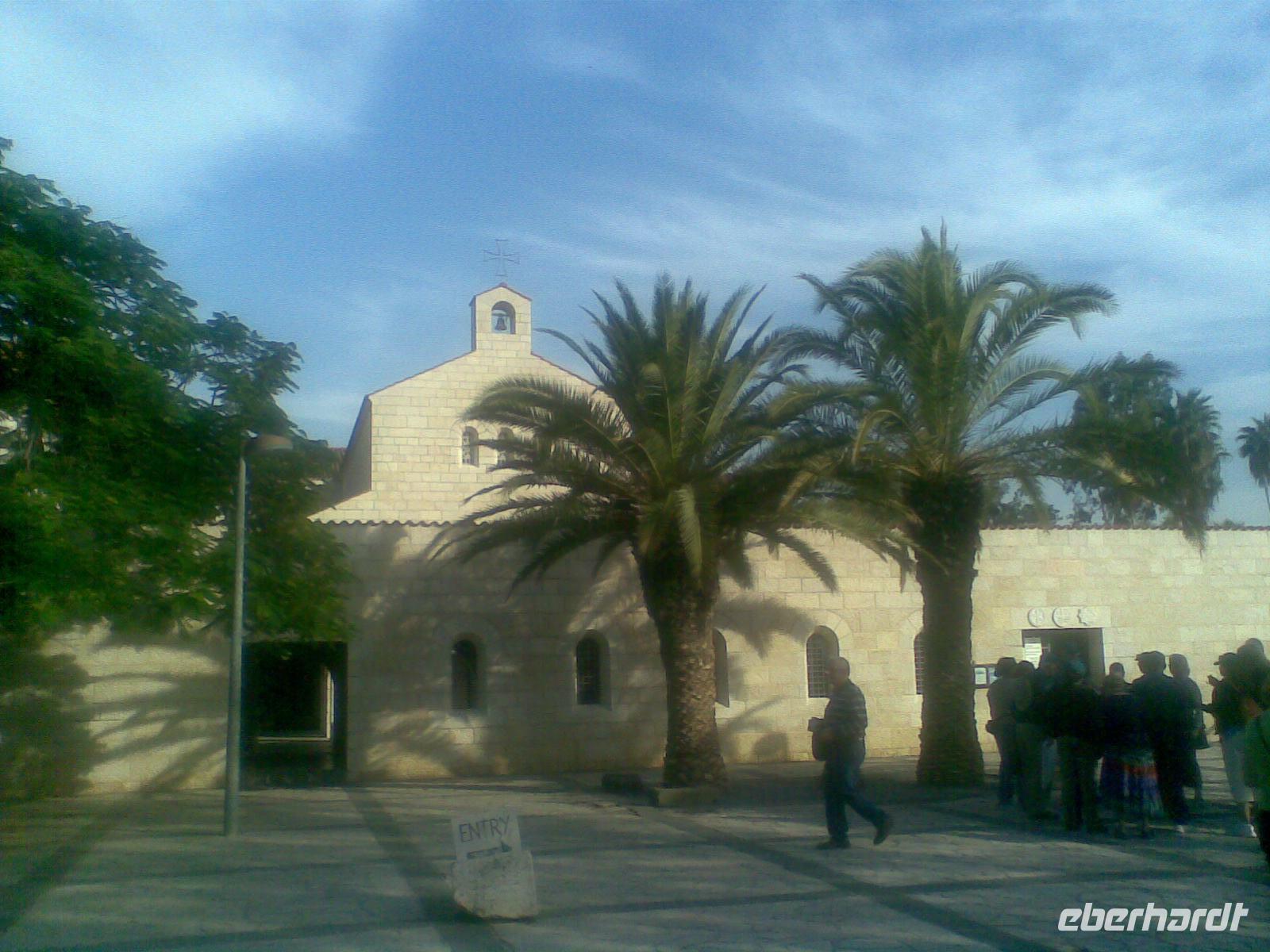 Die Fahrt führte uns nach Kapernaum, der Überlieferung nach einer der Orte, in denen Jesus während seiner Zeit als Wanderprediger vorübergehend lebte. Das Ausgrabungsgelände mit der teilweise rekonstruierten Synagoge ist heute eine viel besuchte Pilgerstätte. Unweit von Kapernaum erreichten wir danach Tabgha, den “Ort der sieben Quellen”. Er bezeichnet die wasserreiche Stelle, an der die wundersame Brotvermehrung durch Jesus stattgefunden hat.