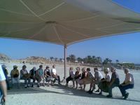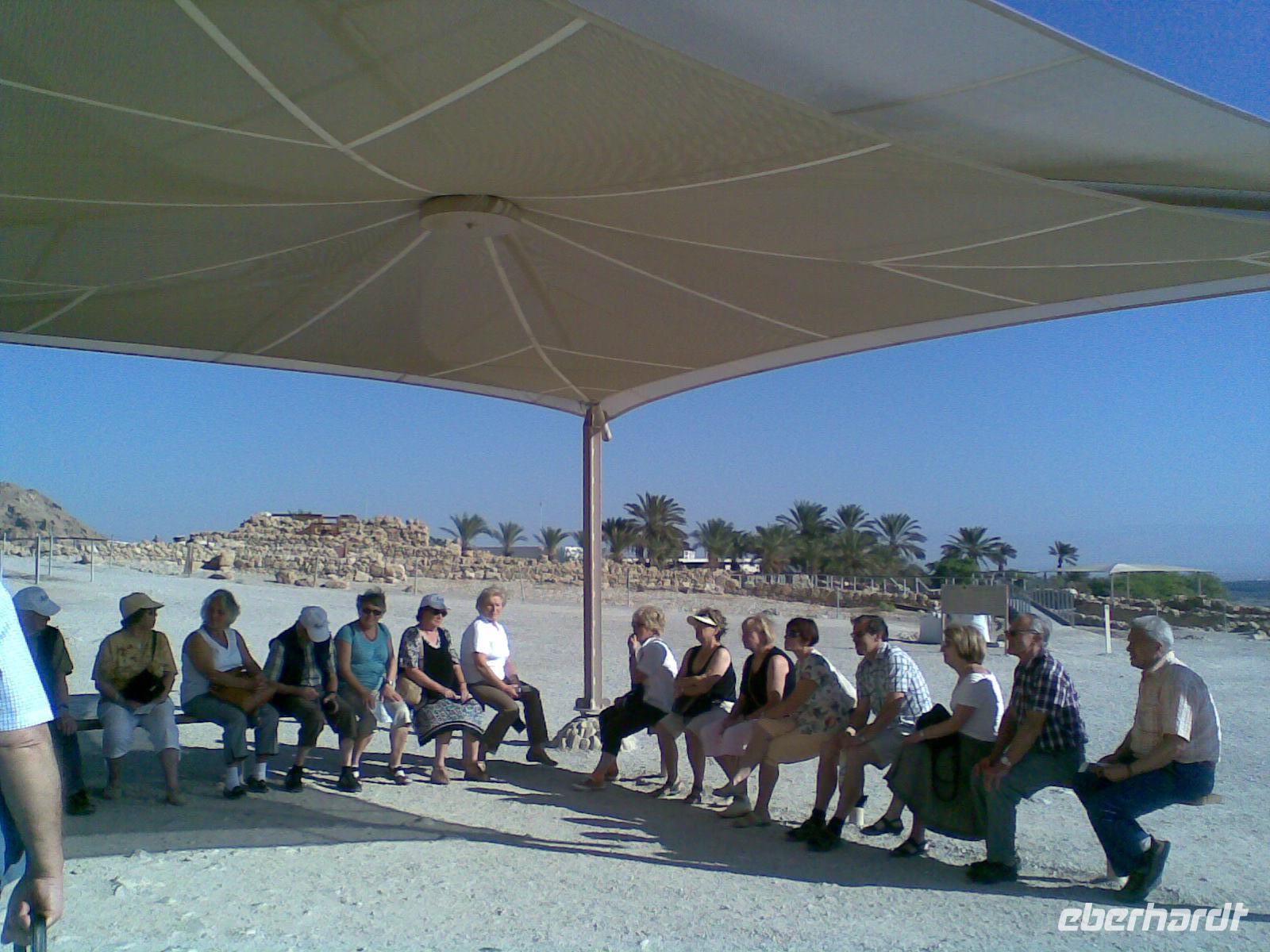 Der architektonische Komplex von Massada war von dem judäaschen König Herodes zu einem Burgpalast bzw. einer Festung im frührömischen Stil des Nahen Ostens ausgebaut worden. Die römischen Feldlager und Befestigungsanlagen am Fuße des Berges von Massada und eine gewaltige künstliche Belagerungsrampe stellen das vollständige römische Belagerungssystem dar, das sich bis in die Gegenwart hinein erhalten hat. Die tragischen Ereignisse der letzten Tage der jüdischen Freiheitskämpfer, die sich auf dem Bergplateau von Massada verschanzt hatten, machen die Festung zu einem Symbol jüdischer Kulturidentität und zu einem Symbol für den ständigen Kampf von Menschen gegen Unterdrückung und Freiheit und genau das wurde uns hier vermittelt. Wir wanderten dann über die sog. "Römische Rampe" zurück zum Bus. Aufgrund der Hitze und wenig Schatten waren jetzt einige von uns ziemlich müde und so wurde es eigentlich Zeit für eine Stärkung. Wir besuchten ein Beduinencamp zwischen Massada und Arad. Die etwa 120.000 israelischen Beduinen sind traditionell Nomaden, leben heute allerdings im Umbruch von der alten Stammesgesellschaft zur Sesshaftigkeit. Wir erfuhren einiges über die Traditionen der Beduinen und sollten dort eigentlich auch ein tolles Mittagessen mit herrlichen Köstlichkeiten erhalten... Leider gab es hier eine kleine Panne, denn im Camp wußte niemand etwas von unserem Mittagessen! Naja, Improvisation ist alles und so fuhren wir einfach mal weiter zum 4-Sterne-Hotel "Lot" am Toten Meer. Dort erwartete man uns - es gab ein traumhaftes Buffet mit allen Köstlichkeiten was das Herz begehrt! Lustig war allerdings, dass wir direkt vom Beduinencamp mitsamt unseren dreckigen bzw. sandigen Schuhen in dieses 4-Sterne-Hotel "hineinspaziert" sind! Wir nahmen es gelassen und genossen im Anschluß an unser spätes Mittagessen den hoteleigenen Strand - manch einer von uns nutzte sogar heute schonmal die Gelegenheit, ein kleines Fußbad im Toten Meer zu nehmen! Zurück im Kibbutz "Kalia" ließen wir den Abend gesellig bei einem Gläschen Wein ausklingen, es war herrlich mild und wir konnten mitten im November draußen sitzen! Das genossen wir natürlich in vollen Zügen...!