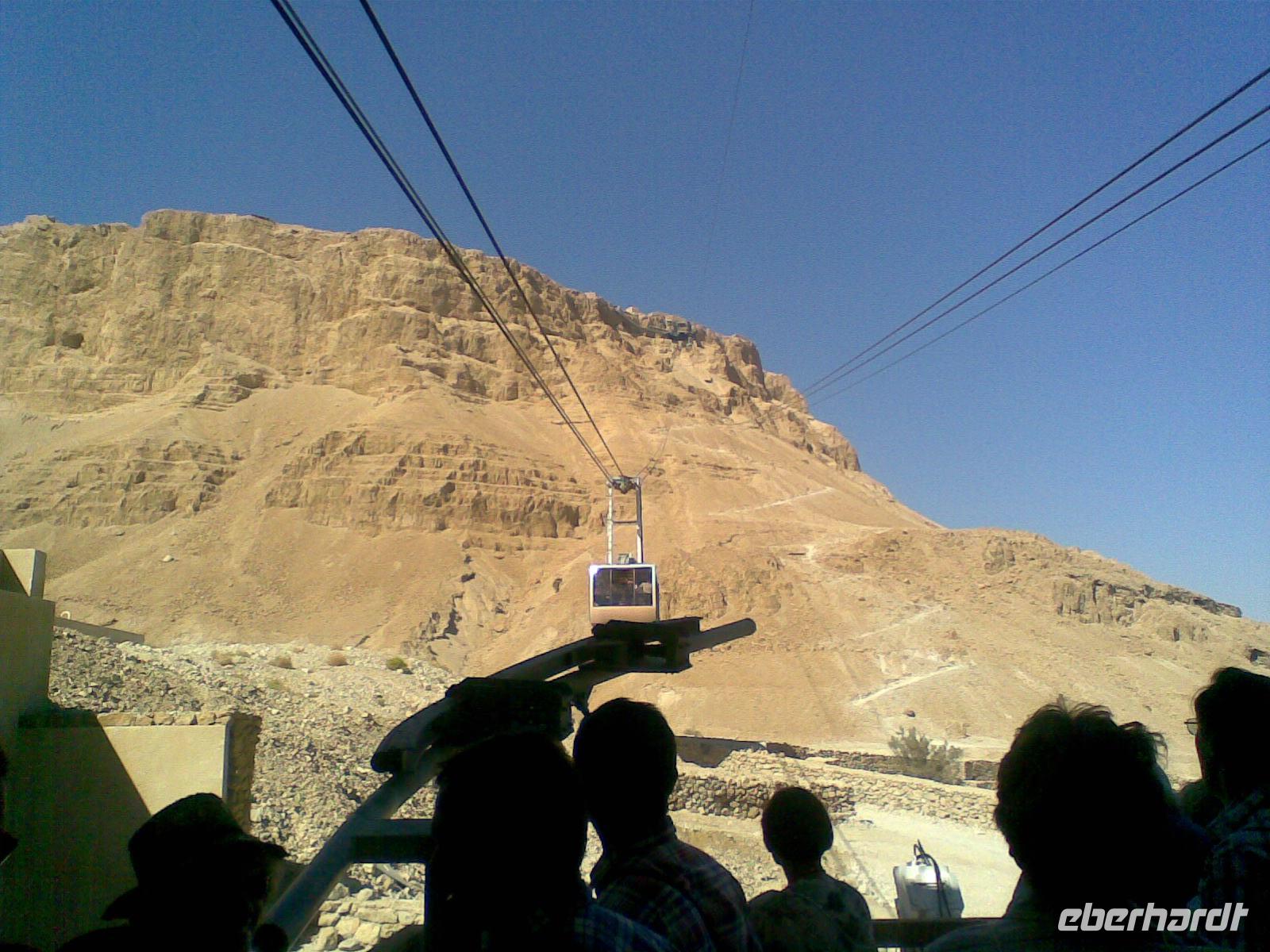 Massada war unser nächstes Ziel, es wurde im Jahre 2001 von der UNESCO in die Reihe der Stätten des Weltkulturerbes aufgenommen. Der Berg von Massada ist ein gewaltiger Felsblock, der sich isoliert von den umliegenden Felswänden auf einer Höhe von 450 Metern über dem Spiegel des Toten Meeres erhebt. Mit einer modernen Seilbahn ging es für uns hinauf zum Berggipfel, dieser wird von einem großen Plateau gebildet.