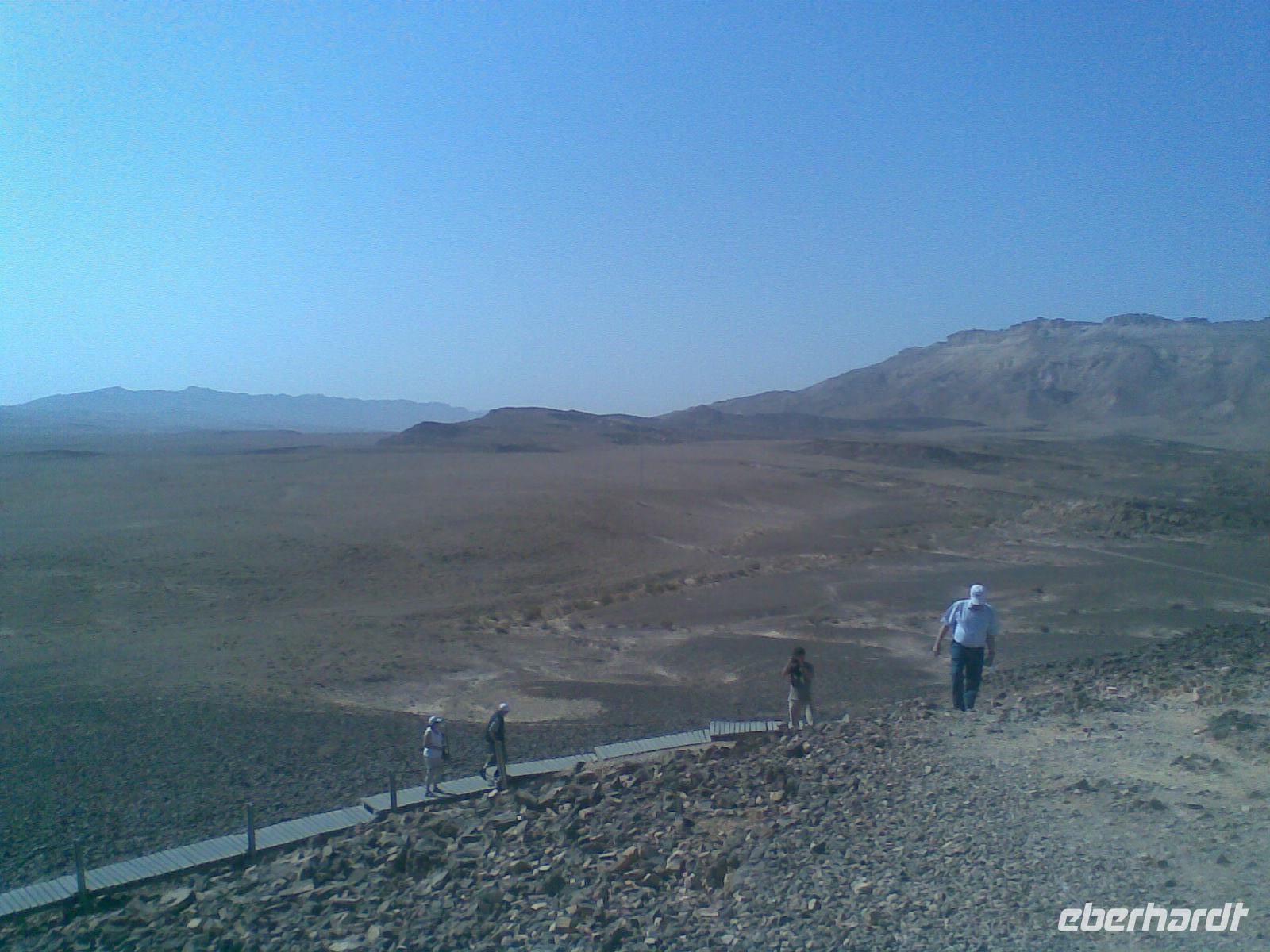 Eine lange Busfahrt lag nun immer noch vor uns, denn heute ging es durch die Negev Halbwüste zum südlichsten Punkt unserer Reise durch Israel nach Mitzpe Ramon. Die Negev Halbwüste nimmt flächenmäßig nahezu die Hälfte Israels ein. Schon vor mehr als 3.000 Jahren siedelten Menschen in dieser Wüste, wie Ausgrabungen belegen. Hier, in Mitzpe Ramon, fühlten wir uns an Mondlandschaften erinnert. Es handelt sich hier um den weltgrößten Erdeinbruch. Wir waren begeistert vom Panoramablick auf den Krater, den man von der Aussichtsterrasse des Besucherzentrums genießen konnte! Nun ging es schon wieder Richtung Norden, denn heute sollte bereits Jerusalem unser Ziel sein. Unterwegs legten wir noch an der Grabstätte von David Ben Gurion einen Halt ein. Als erster Ministerpräsident einer vorläufigen Regierung rief er 1948 den unabhängigen Staat Israel aus. In den folgenden Jahren seiner Regierungszeit gelang es ihm, die Existenz Israels gegenüber den arabischen Nachbarstaaten durchzusetzen. Er trat später in den Kibbuz Sede Boqer ein, wo er auch begraben ist. David Ben Gurion wird noch heute von den Israelis verehrt und gilt als ein Nationalheld. Heute organisierte unser Buschauffeur Yossi ein Picknick mit lauter Leckereien - einfach toll!