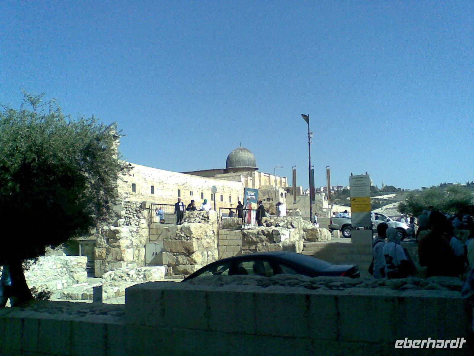 Am Vormittag ging es in die Altstadt von Jerusalem, wir spazierten zum Tempelberg mit dem berühmten Felsendom. Es ist den Nicht-Muslimen nicht gestattet, den Felsendom von innen zu besichtigen - so mussten wir leider draußen bleiben. Anschließend führte uns der Weg zur Klagemauer, der heiligsten Stätte der Juden. Wer wollte, konnte hier einen Zettel mit Fürbitten schreiben und diesen in die großen Kalksteinquader der Klagemauer stecken.