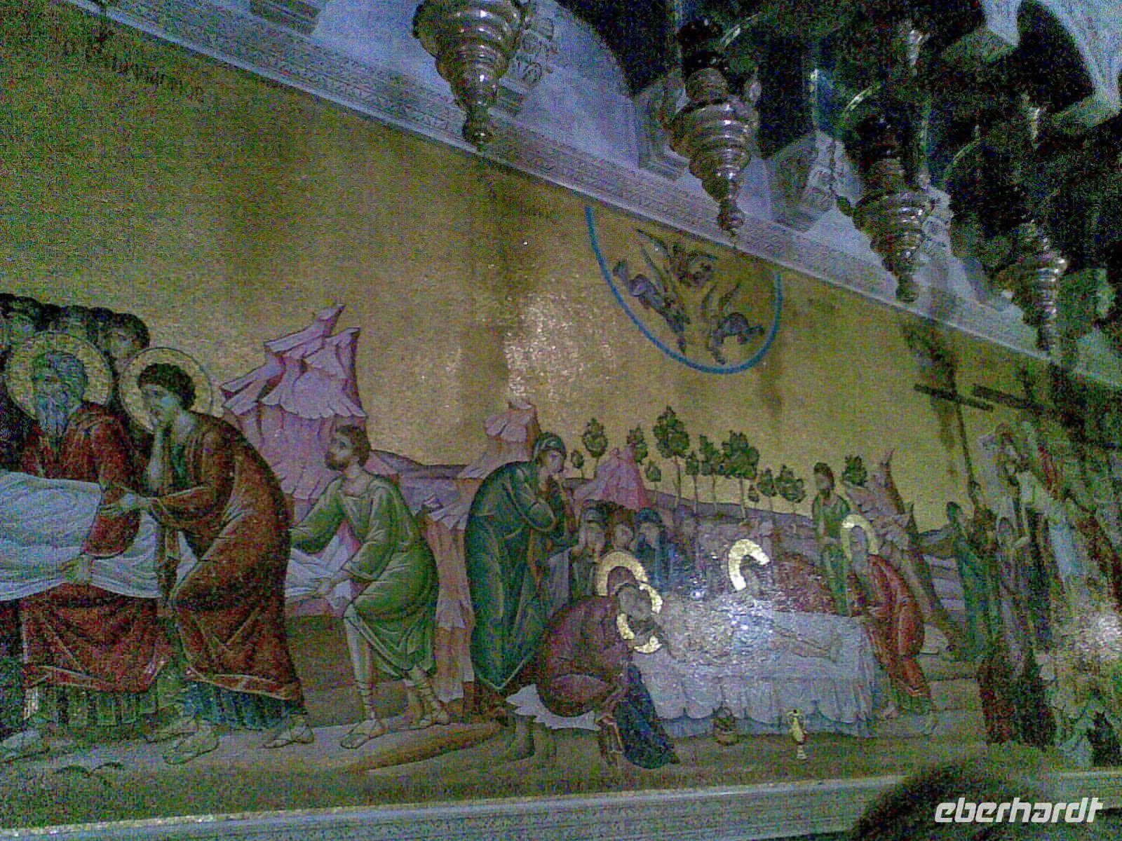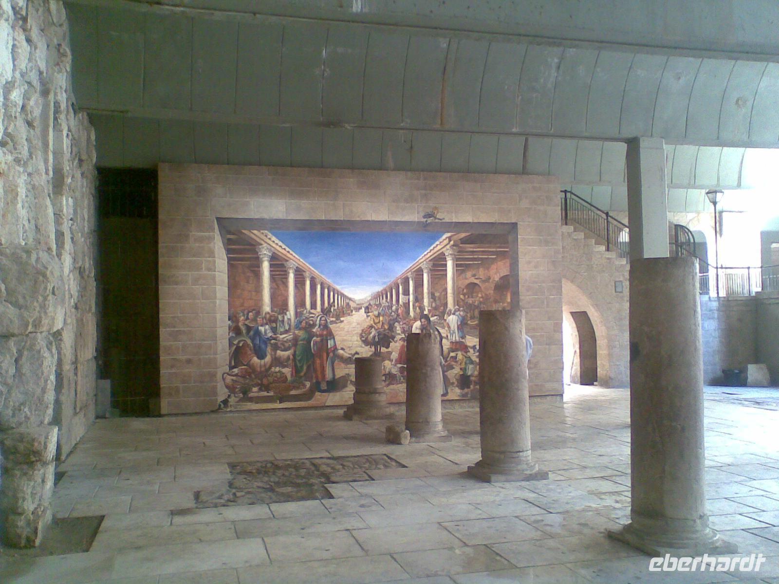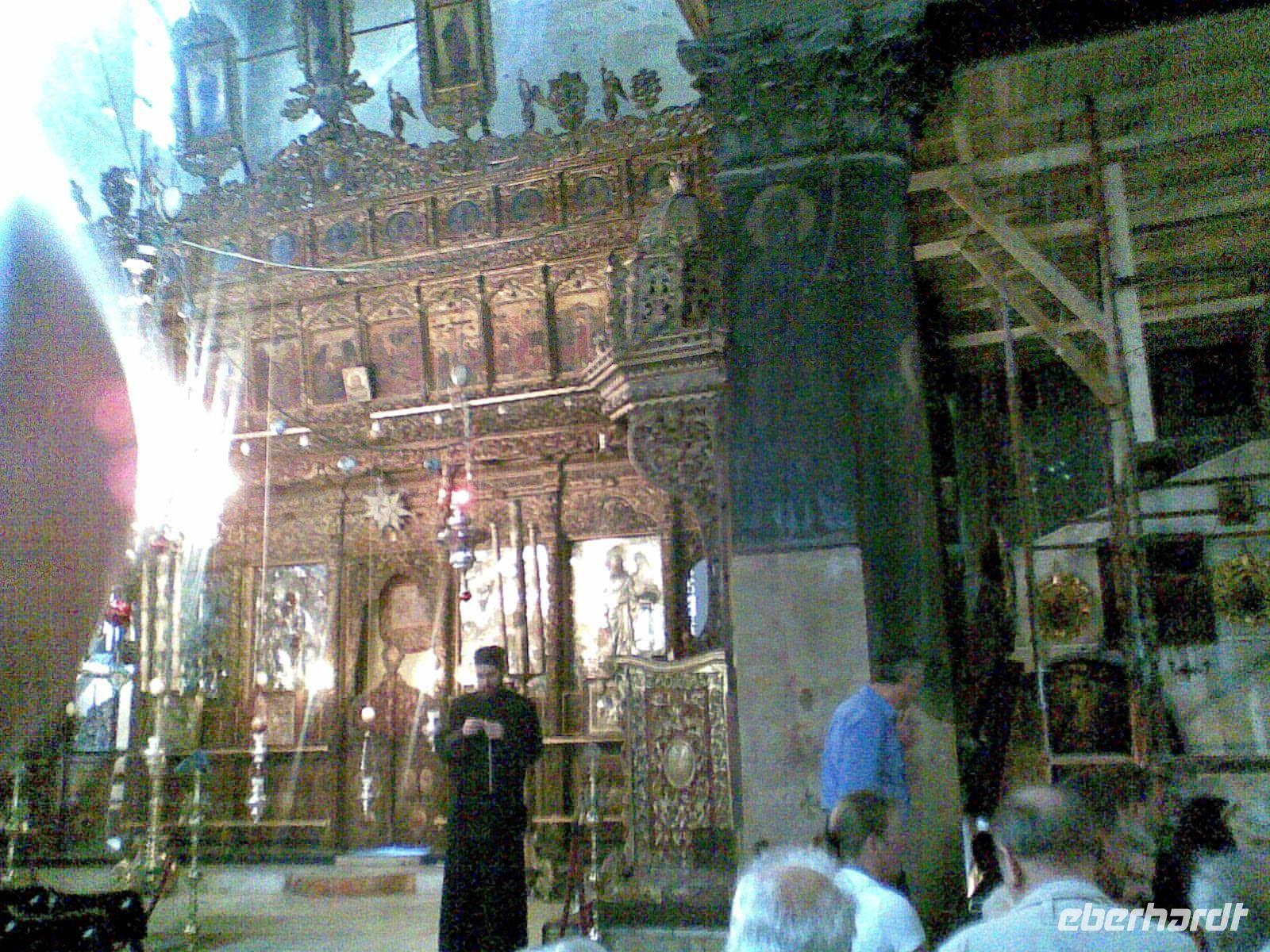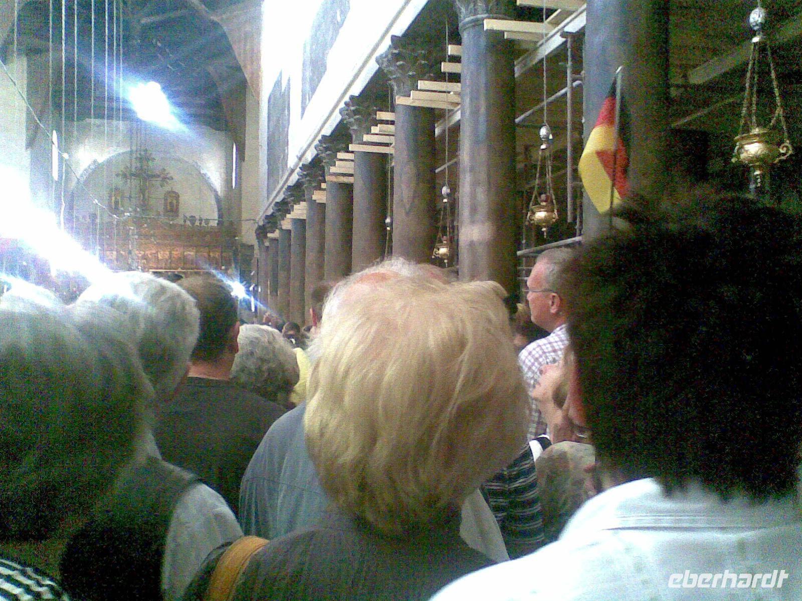 Hier in Bethlehem war für uns der Besuch der berühmten Geburtskirche geplant und so betraten wir am Vormittag diese Kirche, in der Jesus, zumindest der Überlieferung nach, geboren wurde. Leider mussten wir sehr lange warten, um zum Geburtsaltar vorzudringen. Mit Wartezeiten hatten wir zwar gerechnet, aber einige drängelten dort recht unverschämt. Nach reichlich einer Stunde erreichten wir den Altar, dort markiert dann ein silberner Stern die Stelle der Geburt Jesu. Gegen Mittag ging es wieder durch die Mauer nach Jerusalem, wo uns Yossi und Ilan bereits erwarteten.