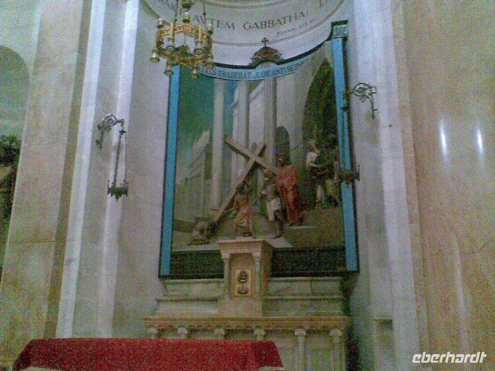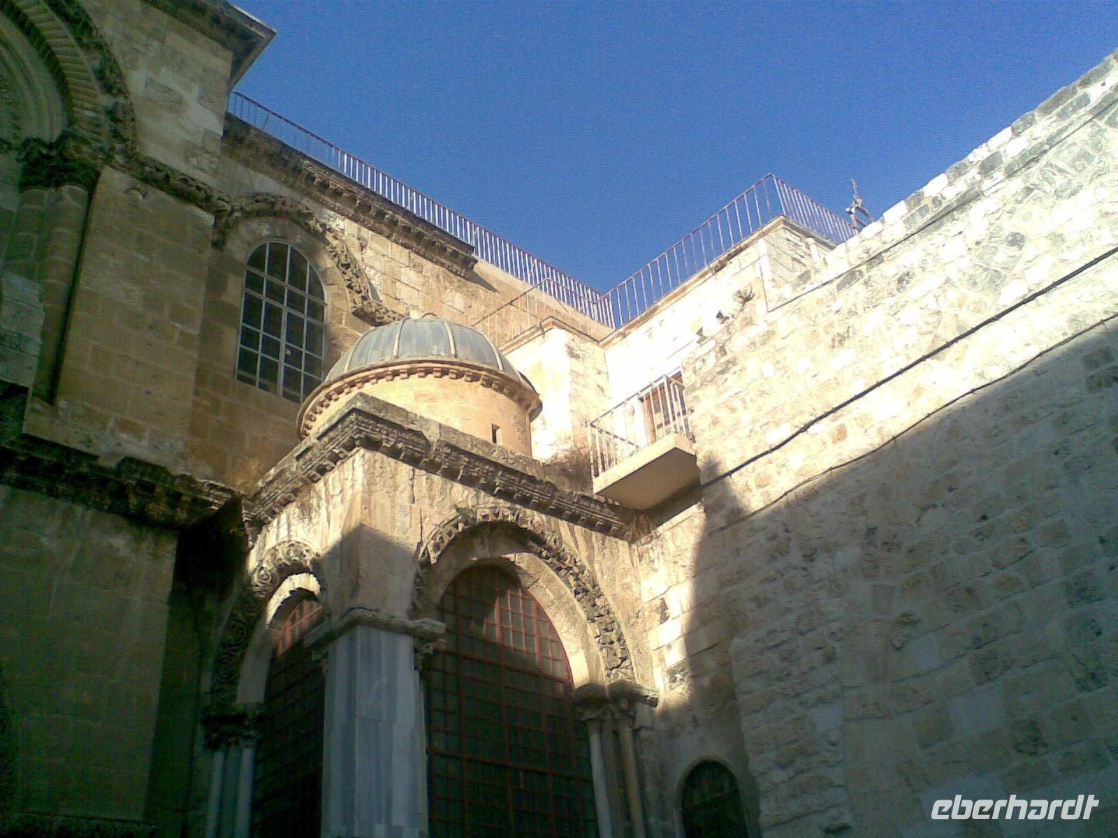 Durch das Löwentor traten wir ein und folgten dann der sogenannten “Via Dolorosa”. Die “Straße der Schmerzen” stellt auf vierzehn Kreuzwegstationen die Strecke dar, die Jesus gemäß der Überlieferung von seiner Verurteilung zum Tod am Kreuz bis zur Hinrichtungsstätte gehen musste. Unterwegs machten wir einen Zwischenstopp auf der Dachterrasse des Österreichischen Hospizes, um einen grandiosen Blick über die Dächer der Altstadt und den Felsendom zu haben - ein echter Geheimtipp und unbedingt zu empfehlen, man steht hier einfach mittendrin…! Den Abschschluß der Via Dolorosa bildet die Grabeskirche. An den Ort, an dem sich nach christlichem Glauben das Schicksal Jesu erfüllt hat - sein Opfertod am Kreuz, seine Grablegung und schließlich die Auferstehung -, strömen seit 2.000 Jahren Christen aus aller Welt. Auf Wunsch seiner Mutter Helena ließ Kaiser Konstantin 326 über dem Berg Golgotha jene Kirche errichten, die ihre heutige Form erst Mitte des 12. Jh.´s durch die Kreuzfahrer erhielt. In mehreren Stockwerken in- und übereinander verschachtelt beherbergt sie mehr als 30 Kapellen. Sechs christliche Konfessionen - Katholiken, Griechisch-Orthodoxe, Armenier, Syrische Jakobiner, Äthiopier und Kopten - teilen sich die Kirche und die Kollekten. Weil sie sich um ihre Anteile innerhalb der Kirche aber ständig stritten, übergab Sultan Saladin die Schlüsselgewalt über die Grabeskirche schließlich an eine moslemische Familie, deren Nachkommen sie heute noch ausüben.
