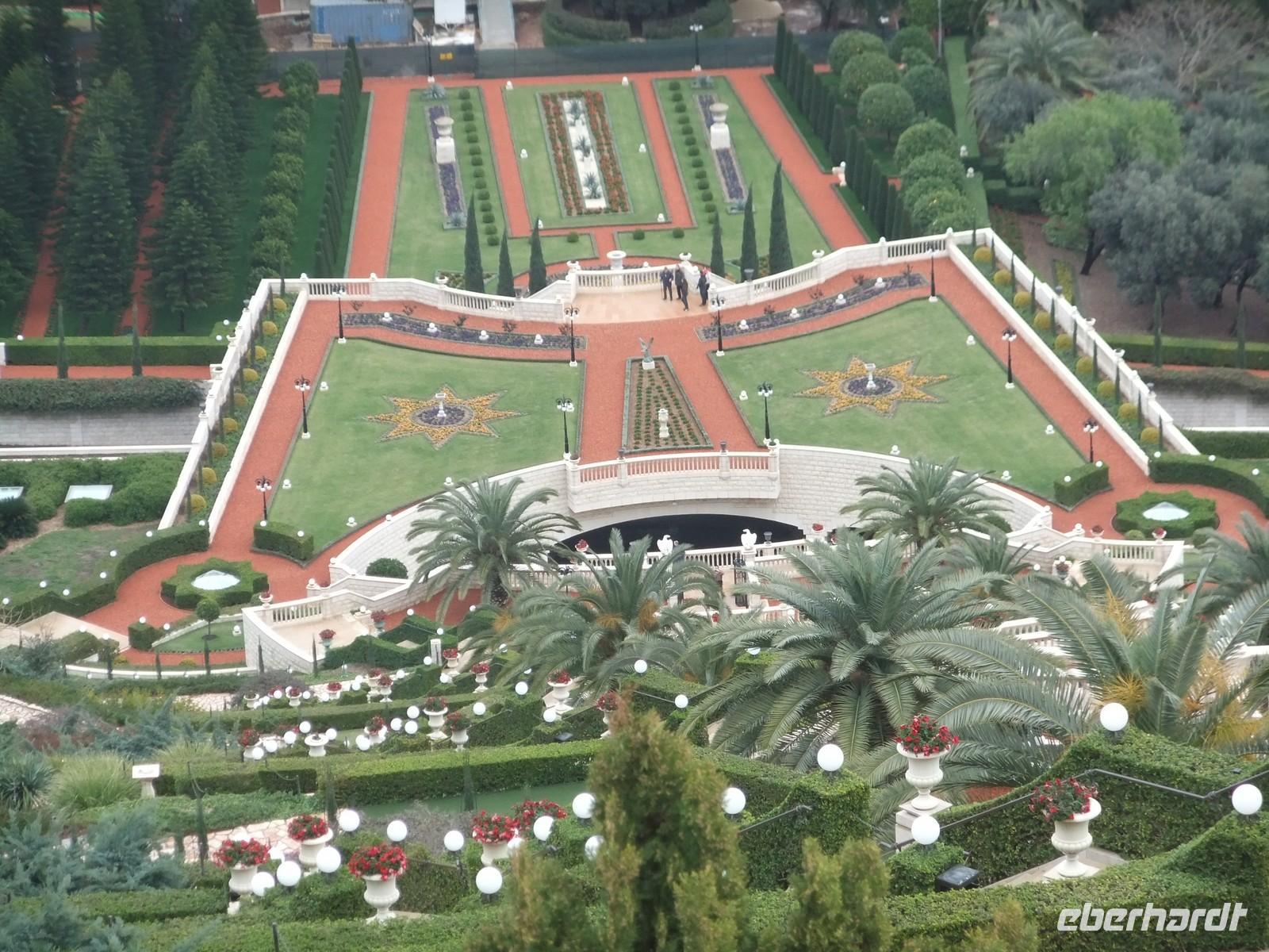 Haifa. Von einer Promenade aus genießen wir den Blick auf die wunderbaren Persischen Gärten mit dem Grabmal des Propheten der Bahai-Religion, einer relativ jungen Glaubensgemeinschaft. Wir schauen auf den betriebsamen Hafen, er ist der Hafen vieler Einwanderer und die roten Dächer Häuser der deutschen Kolonie. Ordensleute aus Deutschland gehörten schon im 19.Jhdt. zu den Pionieren in Israel.