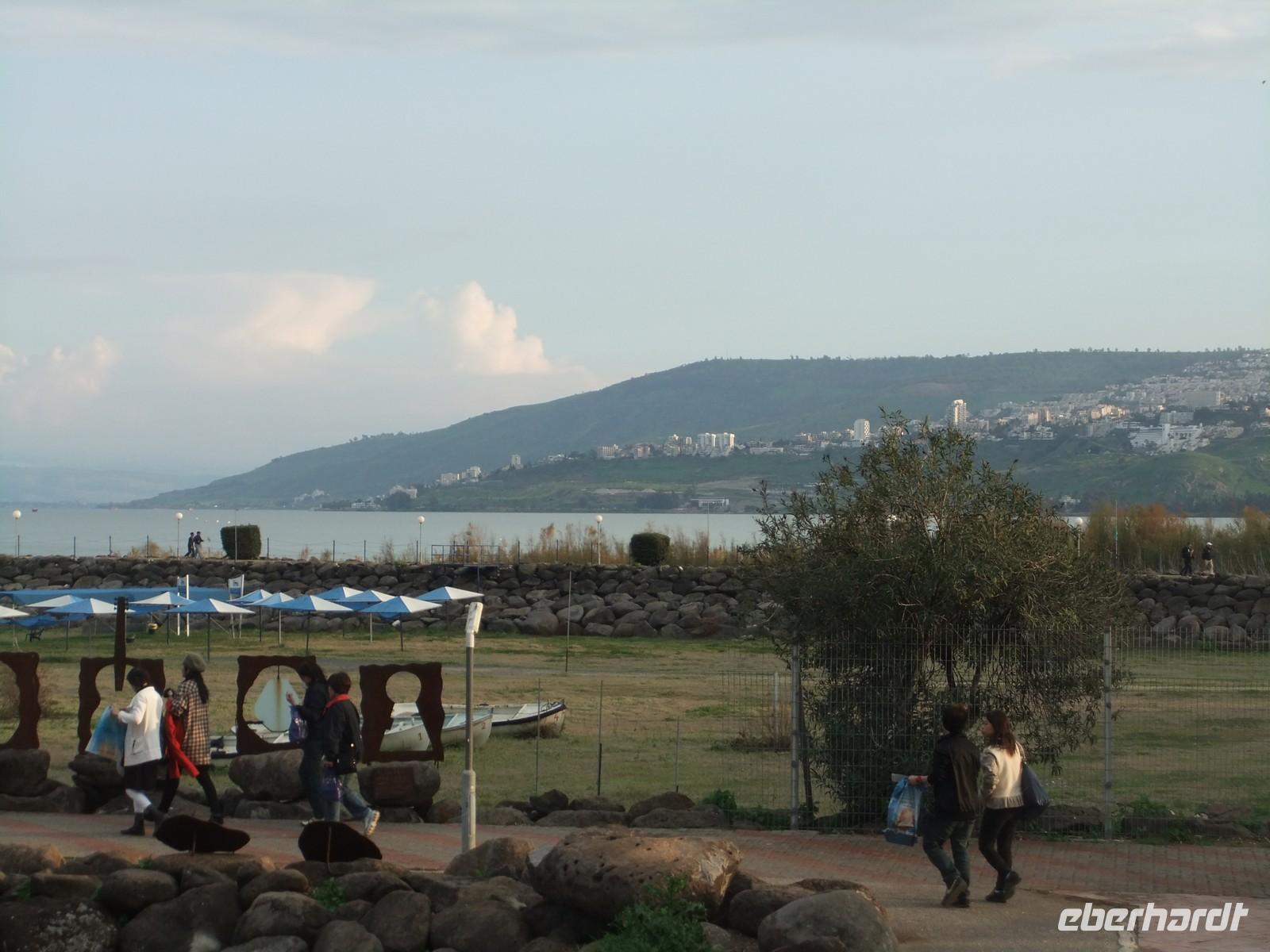 Mit dem Nachbau eines solchen historischen Bootes fahren wir auf dem See Genezareth, sehen noch einmal die Wirkungsorte Kapernaum, den Berg der Seligpreisungen, die Brotvermehrungskirche in Taghba, Migdal, vielleicht der Ort der Maria Magdalena, das Taubental, auch das bekannte Tiberias. Vielleicht stammt der Petersfisch, den wir mittags gegessen hatten, von dieser Stelle des Sees. Ganz nebenbei, wir sind 210 m unter dem