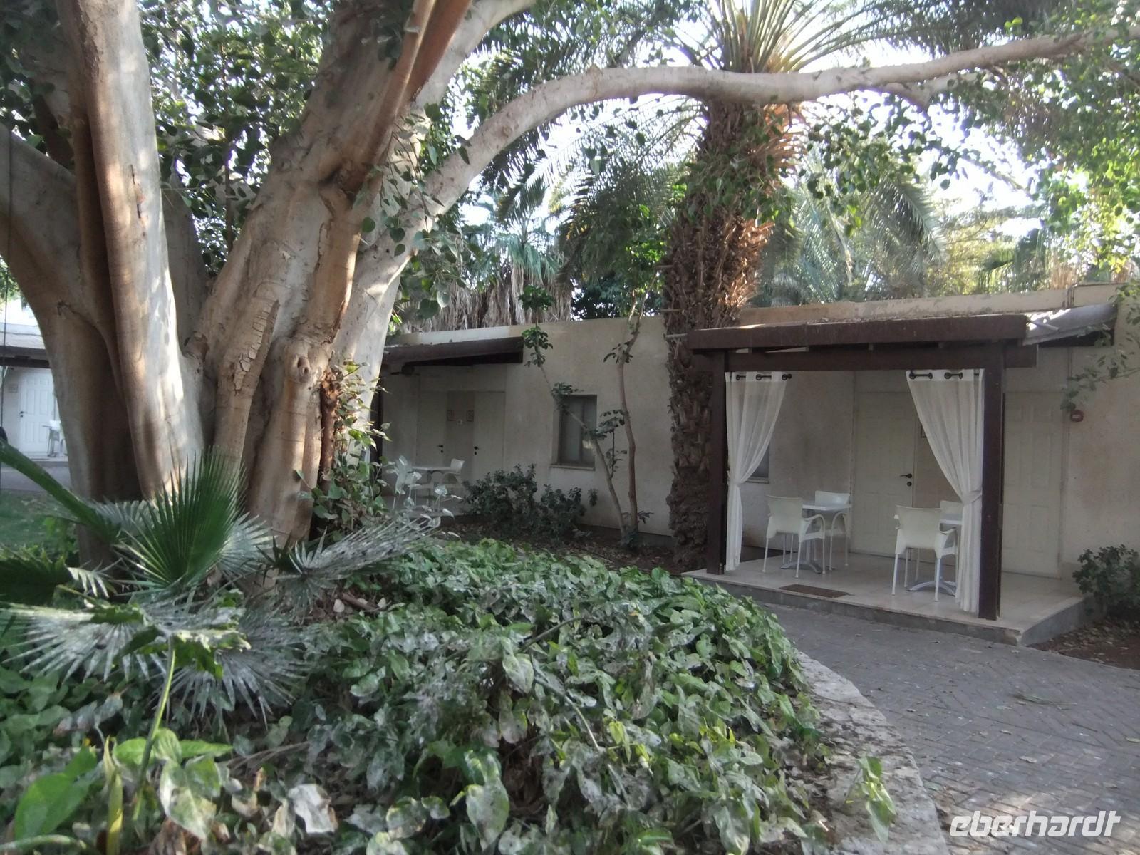 Am späten Nachmittag erreichen wir einen Kibbuz in der Wüstenlandschaft am Toten Meer, eine grüne Oase mit üppiger Vegetation. Wir wohnen in kleinen Häuschen mit einer kleinen